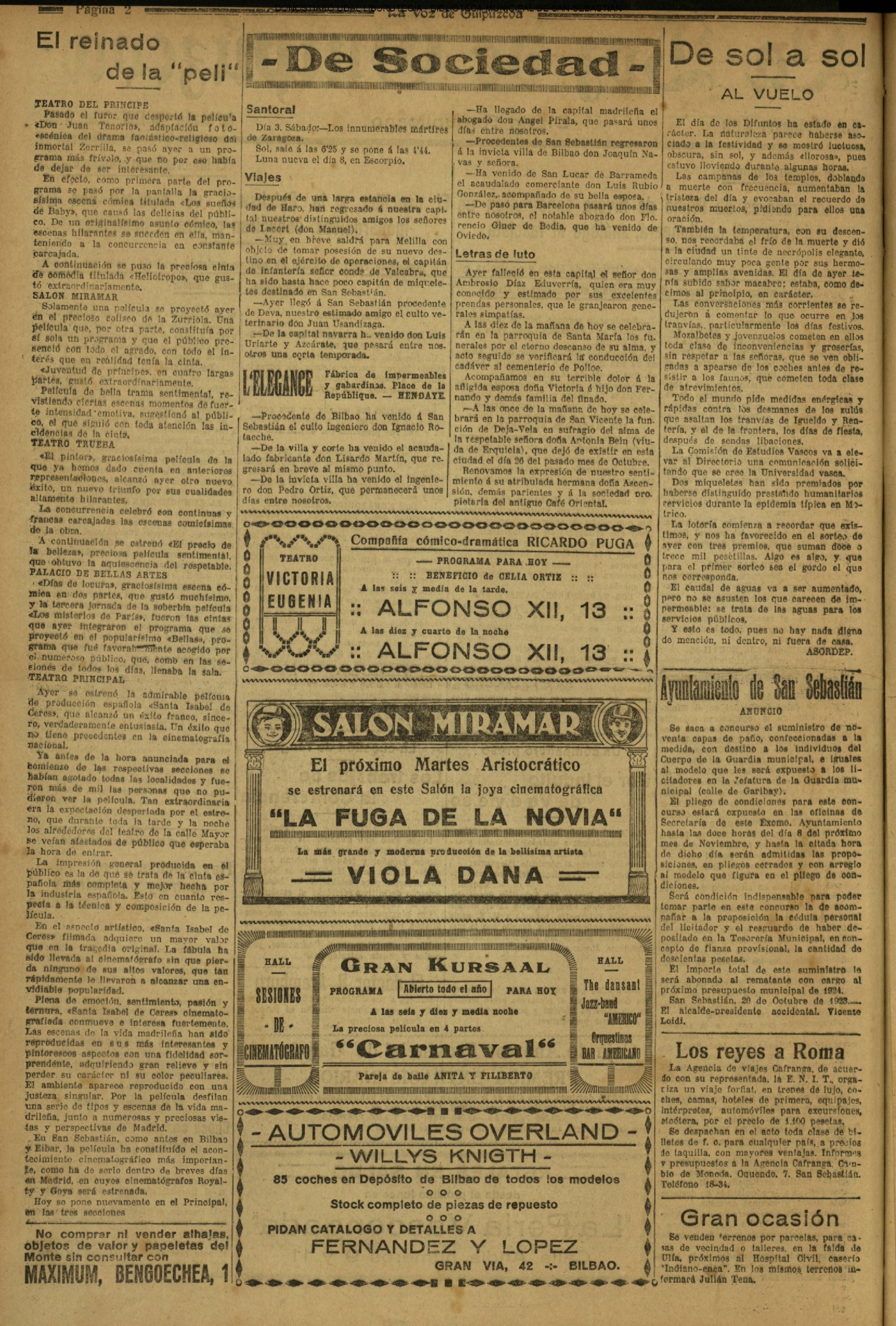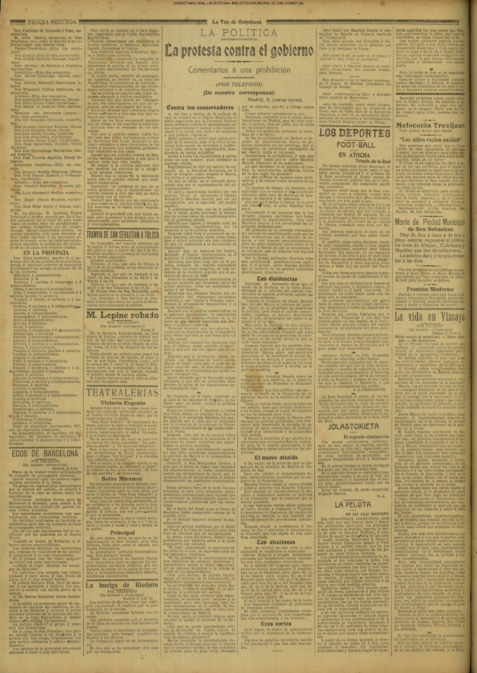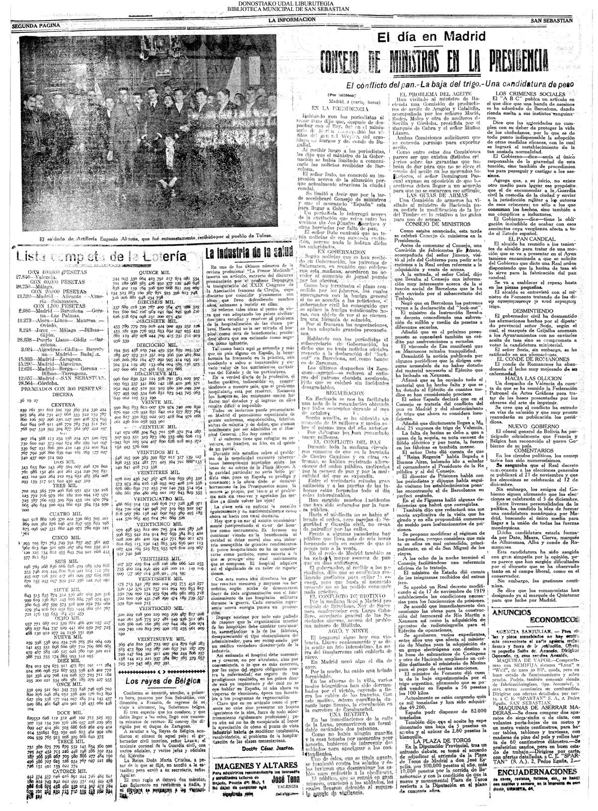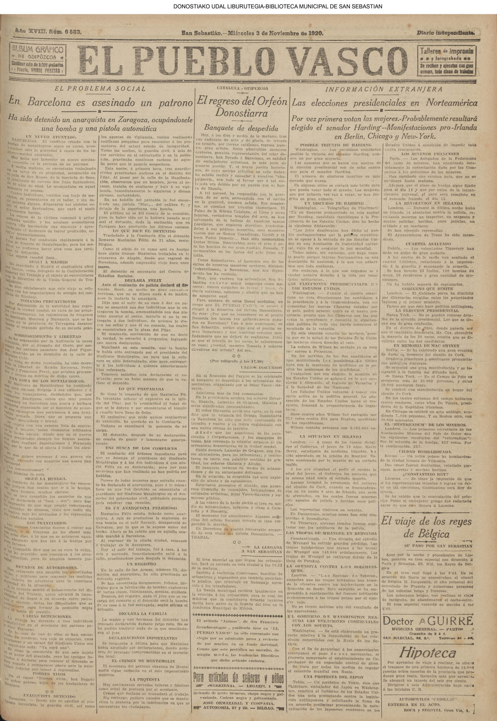 | 02 - noviembre ![]() . | (1939) - COMISIÓN MUNICIPAL PERMANENTE # Celebró sesión la Comisión Municipal Permanente, bajo la presidencia del alcalde señor Pauaga...... # SESIÓN DE LA GESTORA PROVINCIAL # Bajo la presidencia del señor Querejeta celebró sesión ordinaria la Gestora Provincial. (EL DIARIO VASCO)(LA VOZ DE ESPAÑA)(UNIDAD) (1941) REAL SOCIEDAD (2-0) BARCELONA (1942) (1945) Recibe sepultura en Polloe el cadáver del insigne pintor Zuloaga. (1947) REAL MADRID (3.0) REAL SOCIEDAD (1952) Domingo. Una grave avería, originada por el vendaval, incomunica a nuestra Ciudad por telégrafo con el resto de España, durante cuatro horas, por la tarde. Y al subir a un poste para repararla, en la Estación del Norte, una fuerte sacudida eléctrica despide al obrero celador de segunda del Cuerpo de Telégratos Manuel Sánchez Conde, cayendo de cabeza y matándose. Salva la vida, descendiendo a tiempo del poste, su compañero Eladio Freigido Várela. (1957). Cogida por el ascensor, perece esta tarde Petra Iturrarán Langarica, de 48 años, soltera, criada de los señores de Laca (Oquendo, 12). (1958) SEVILLA (0-1) REAL SOCIEDAD (1962) (1969) DEPORTIVO DE LA CORUÑA (0-2) REAL SOCIEDAD (1972) PLENO MUNICIPAL EXTRAORDINARIO (LA VOZ DE ESPAÑA) |