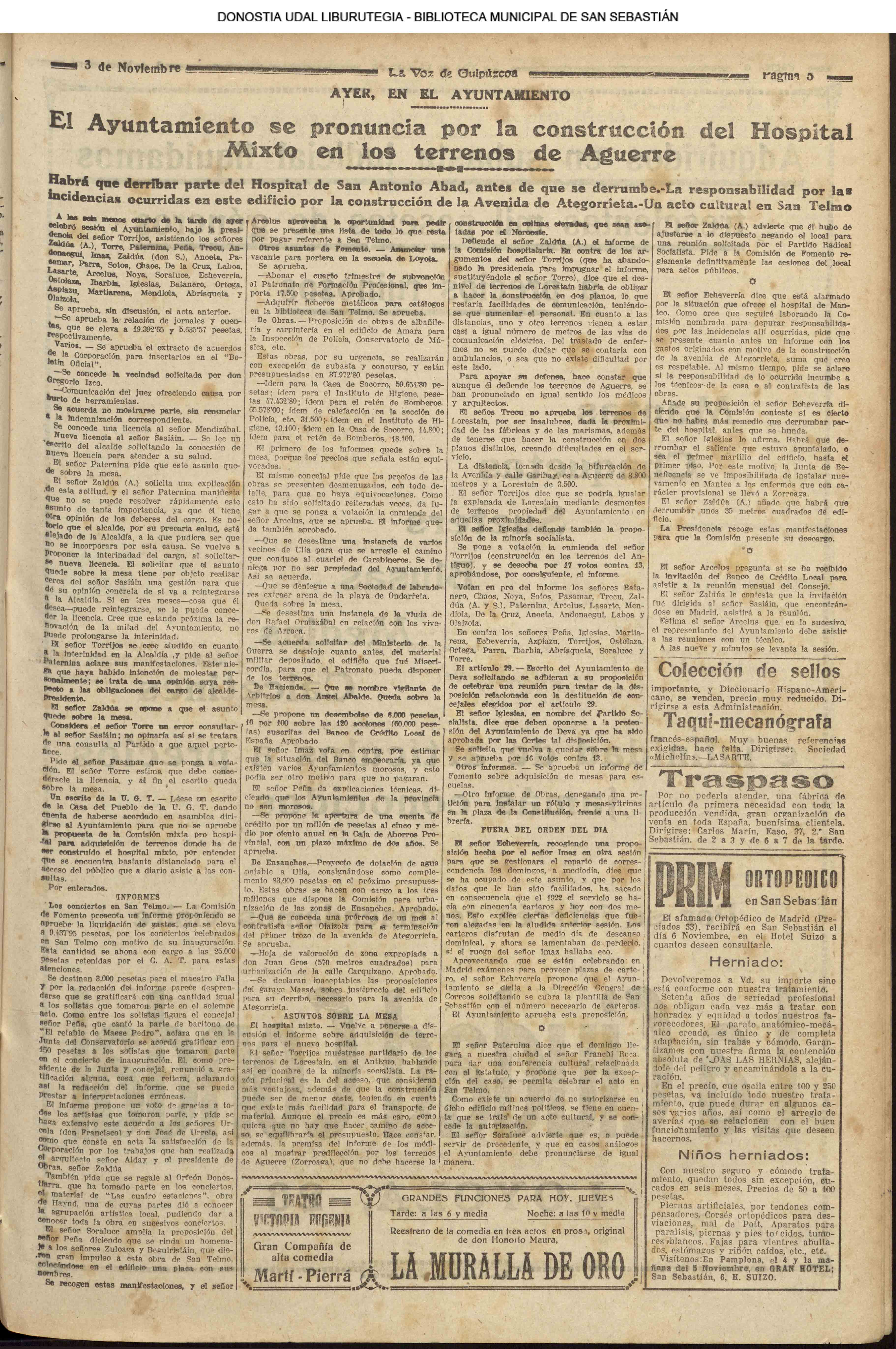 (MARTES) (*).- Herido muy grave por atropello en Miraconcha. (EL DIARIO VASCO. 03/11. p.48) PRENSA DEL DÍA: .- DV.02/11 : TEMAS MUNICIPALES: A pesar de su turbiedad, el agua de Donostia la mejor del entorno. Actualmente se está ejecutando la nueva conducción de agua desde el Añarbe, pero no se dispone de planta depuradora. (pág.11)