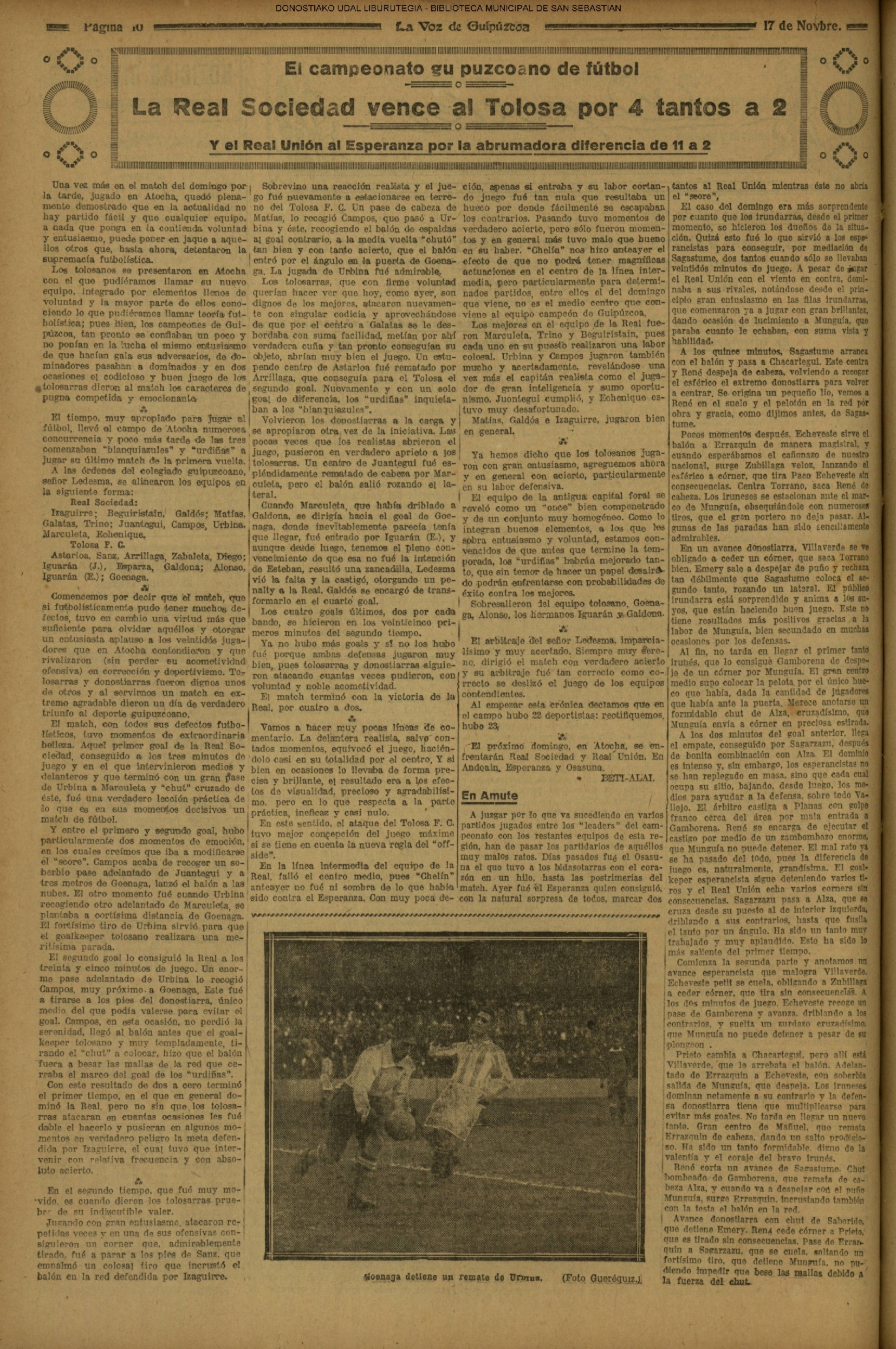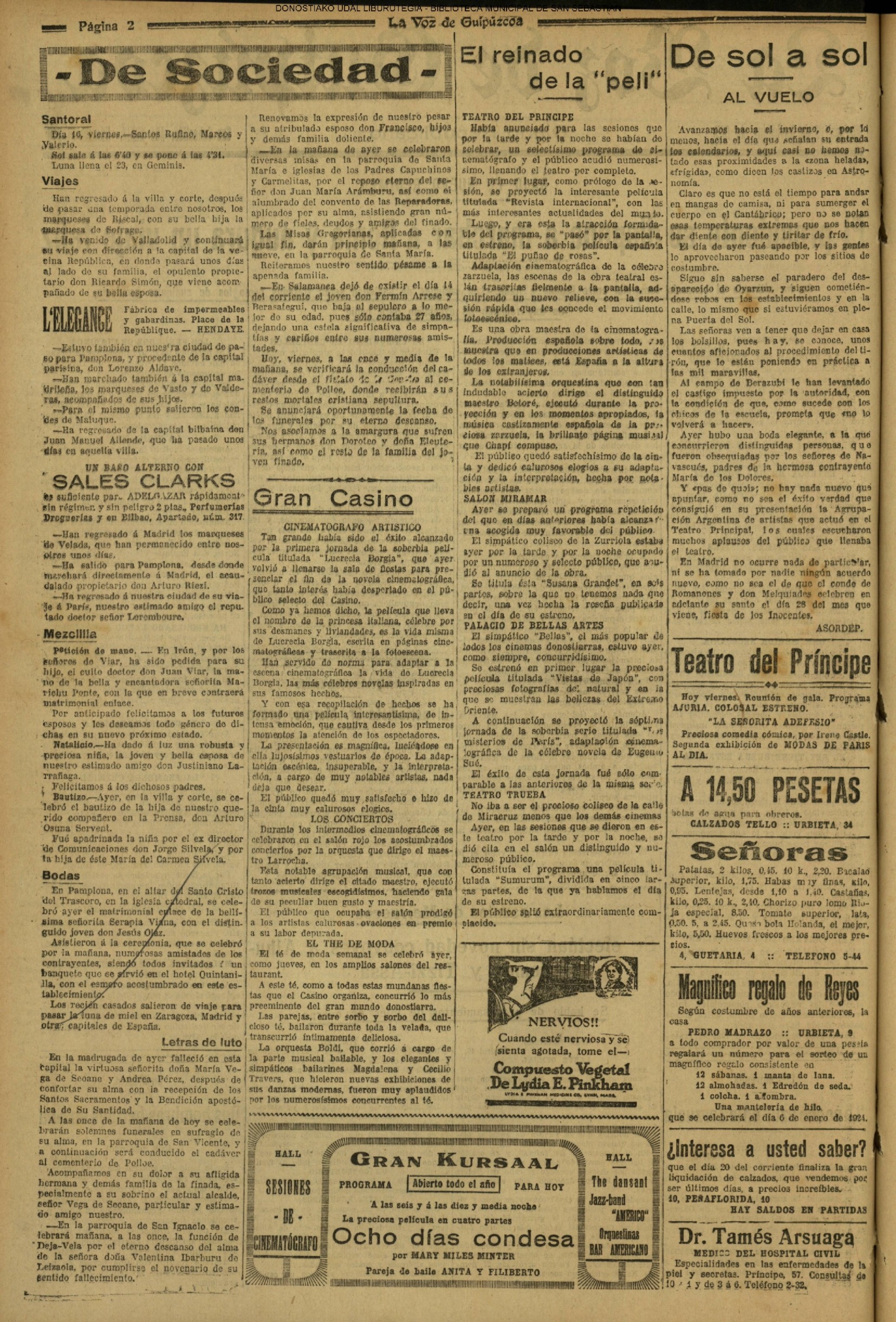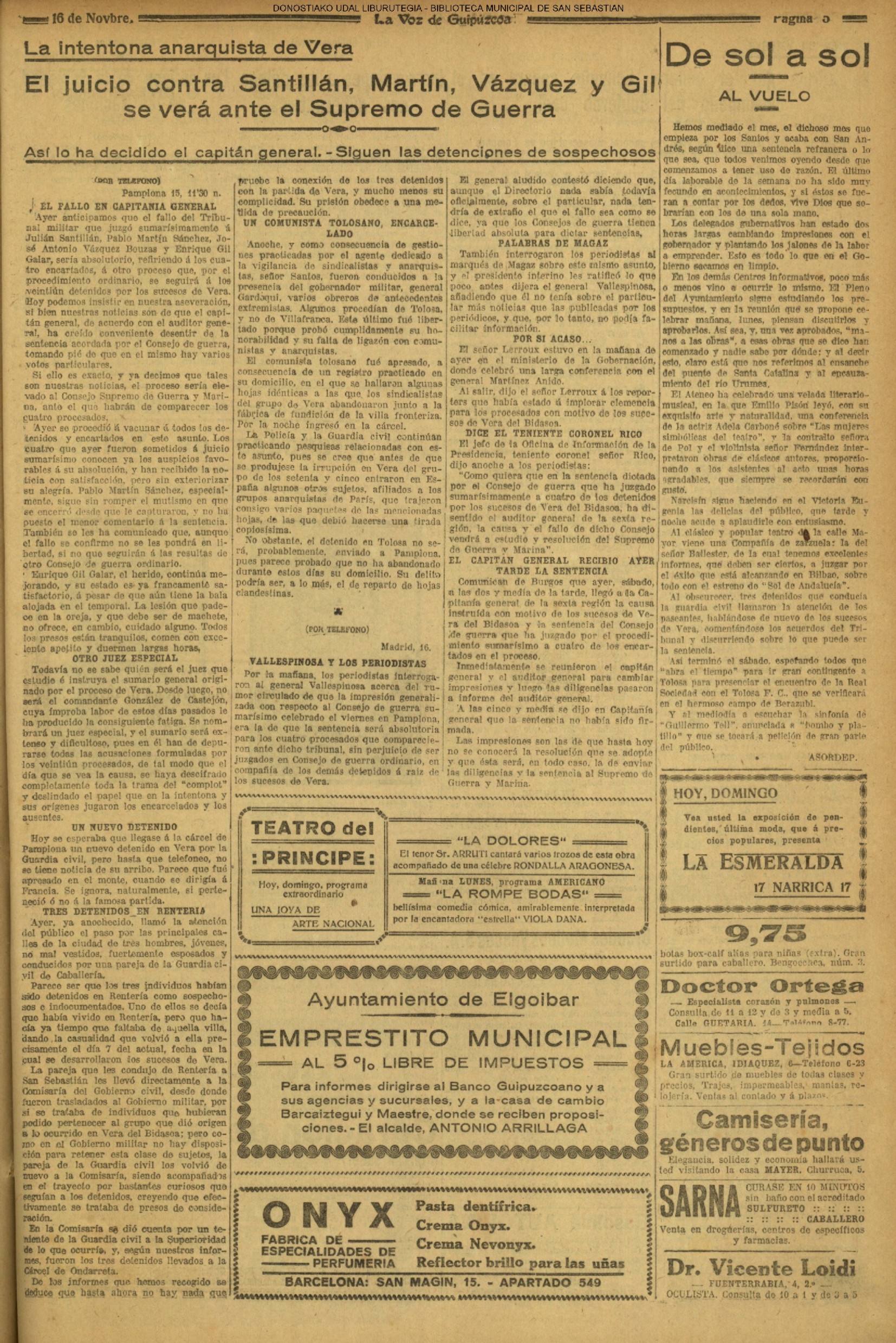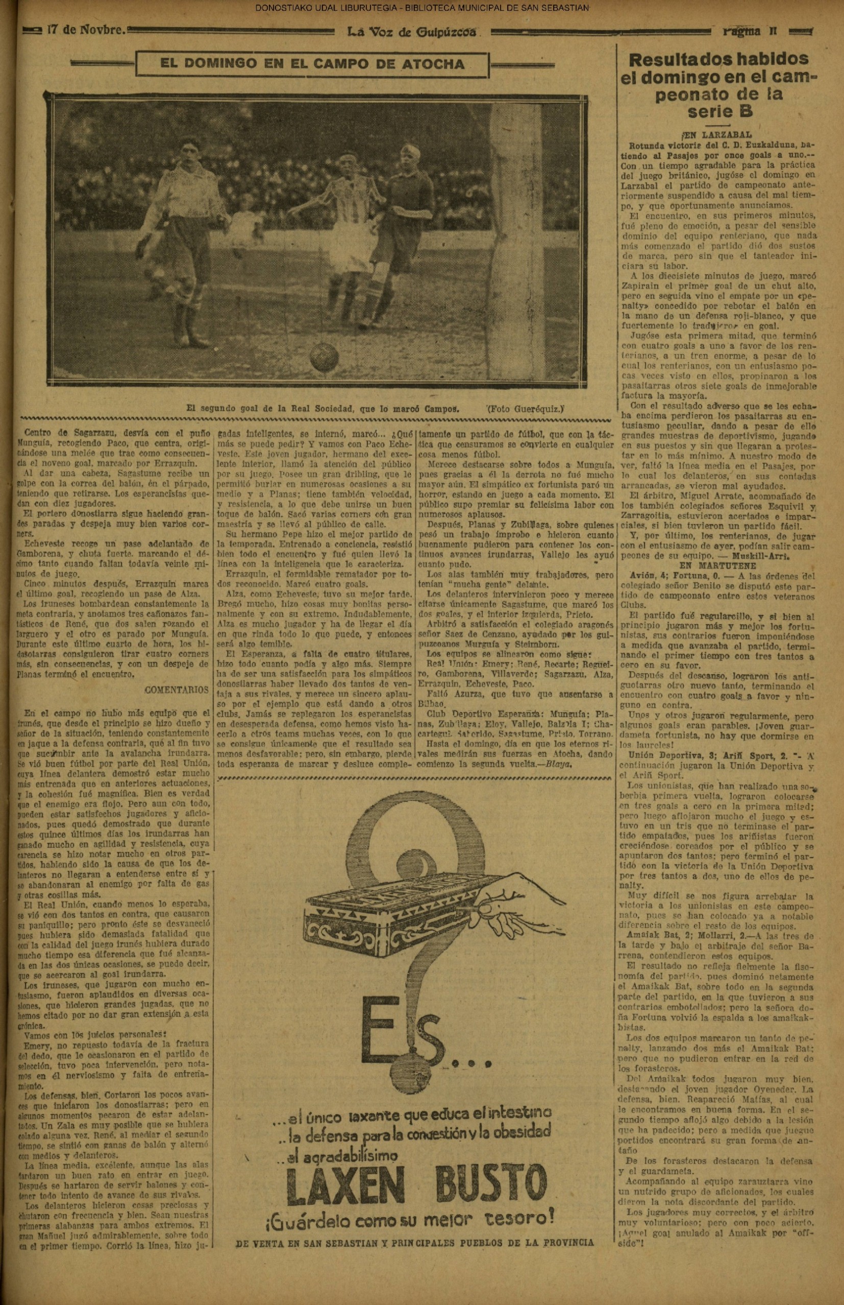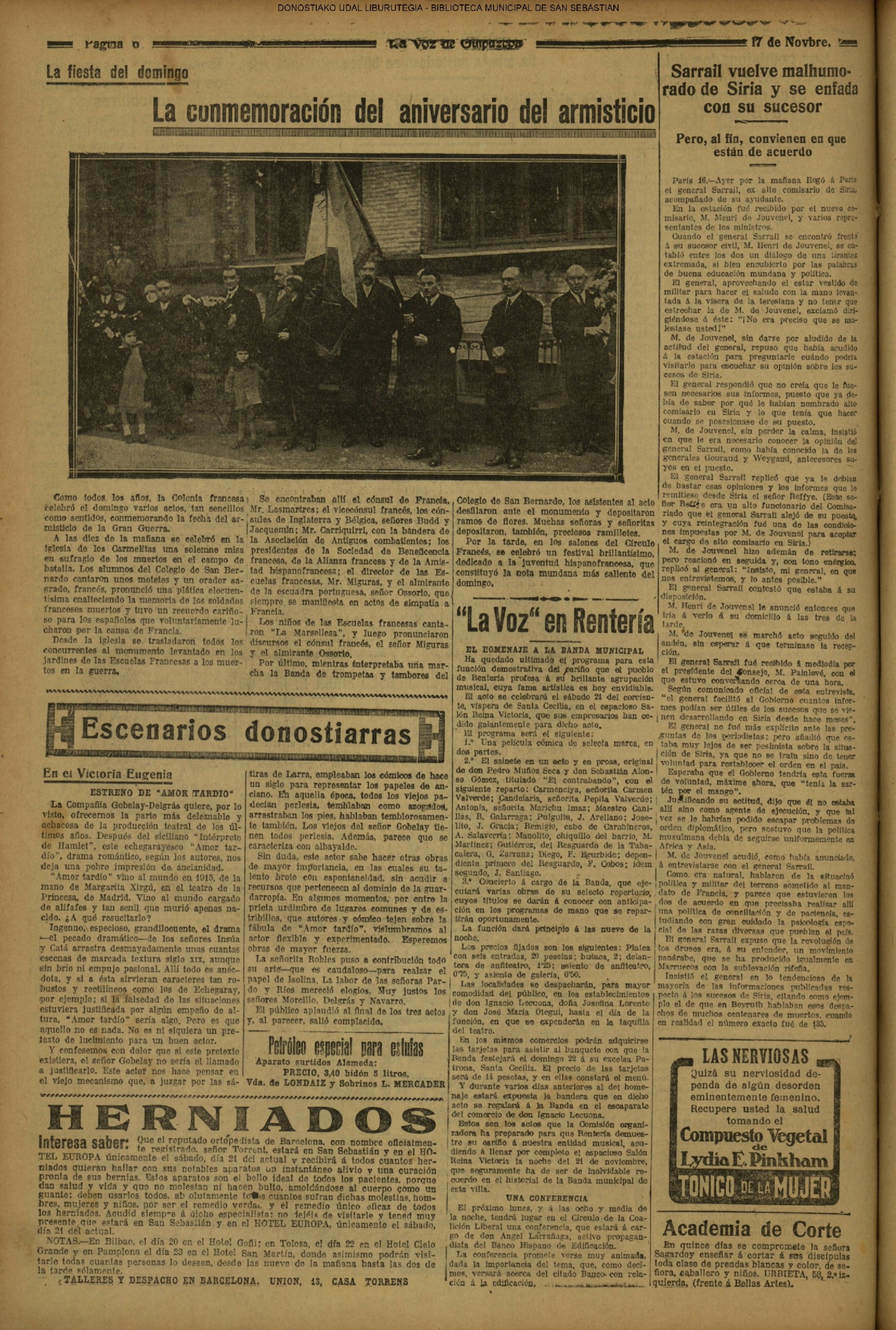 15 - noviembre![]() . | (1939) GUERRA CIVIL (EL DIARIO VASCO)(LA VOZ DE ESPAÑA)(UNIDAD) (1943).- Fallece D. León Herrero Medina.(1945) A mediodía tiene lugar la inauguración oficial de la sucursal de la Caja de Ahorros Provincial en Víctor Pradera, 71.(Easo,71) @ - REAL SOCIEDAD - D. Felipe Arteche, presidente del Gremio de hoteleros, es elegido presidente de la Real Sociedad. (*).- Inauguración del Consejo Provincial de la Sección Femenina (LVE) (*).- Otra vez el "gordo" a San Sebastián (LVE) (1949) Con 62 años, fallece D. Julio Gutiérrez Ozcáriz, procurador de les Tribunales. (1950) Pierino Gamba dirige por primera vez en San Sebastián; haciéndolo, en función de tarde, en el teatro Príncipe, a la Orquesta Filarmónica de Madrid. (1955) (1957).—Cesa hoy, jubilado por la edad, el comisario-jefe de la policia gubernativa local, don Eugenio Palomo. (1960) - TRAGEDIA - SIETE MUCHACHOS DE ZUMAYA ARREBATADOS POR UNA OLA .- Seis de ellos perecieron ahogados, salvándose sólo uno con la expuesta ayuda del deportista Rudy Holke (LA VOZ DE ESPAÑA) (1961) Corresponden a San Sebastián las 6 series del "Gordo " en el Sorteo de la Lotería Nacional celebrada en Madrid en el día de hoy y que fueron vendidas en su totalidad en la Administración número 9, sita en la calle de Embeltrán, regentada por doña Emilia Lera. (LA VOZ DE ESPAÑA) (1974) SESIÓN DE LA DIPUTACIÓN # Pleno Extraordinario de la Diputación para la aprobación de varios expedientes (UNI) |
