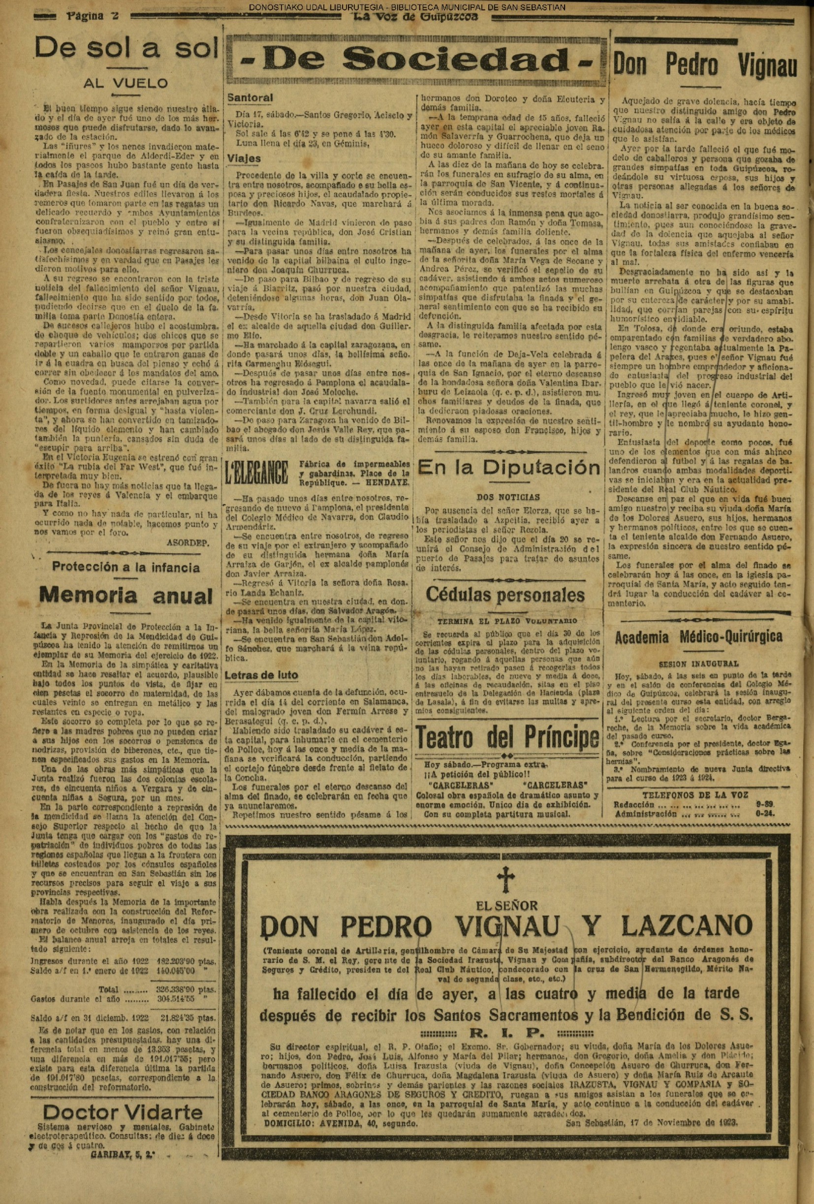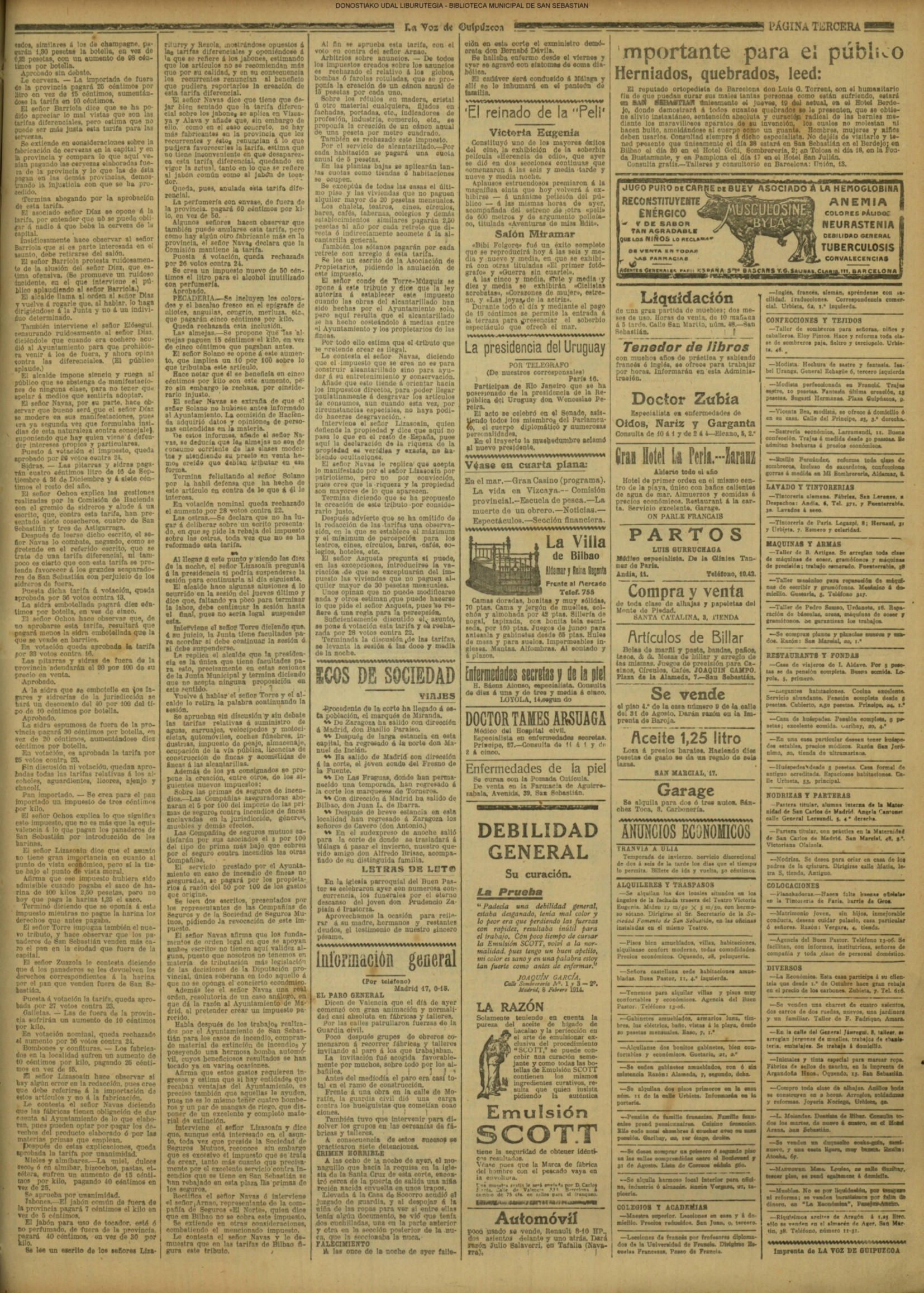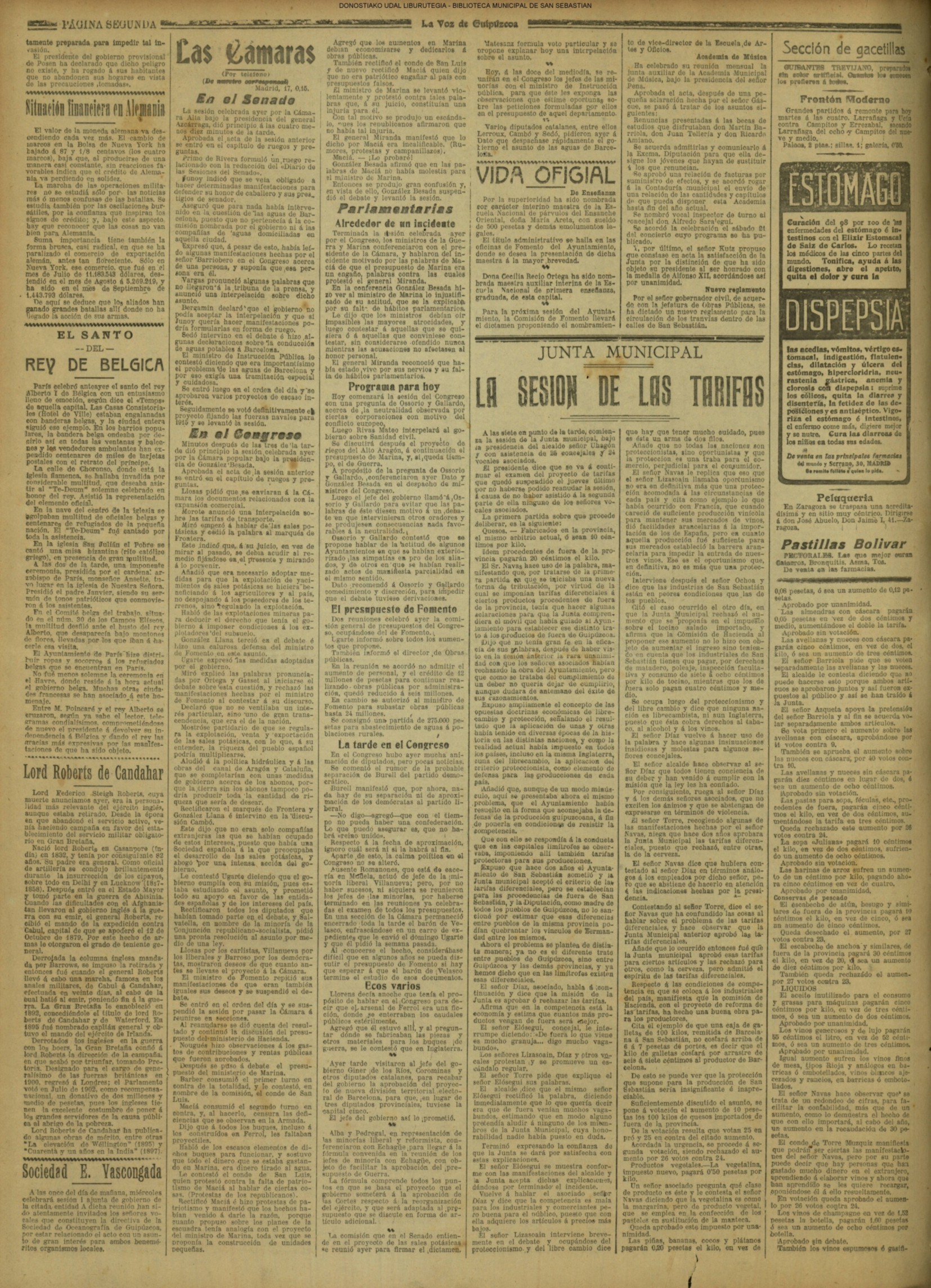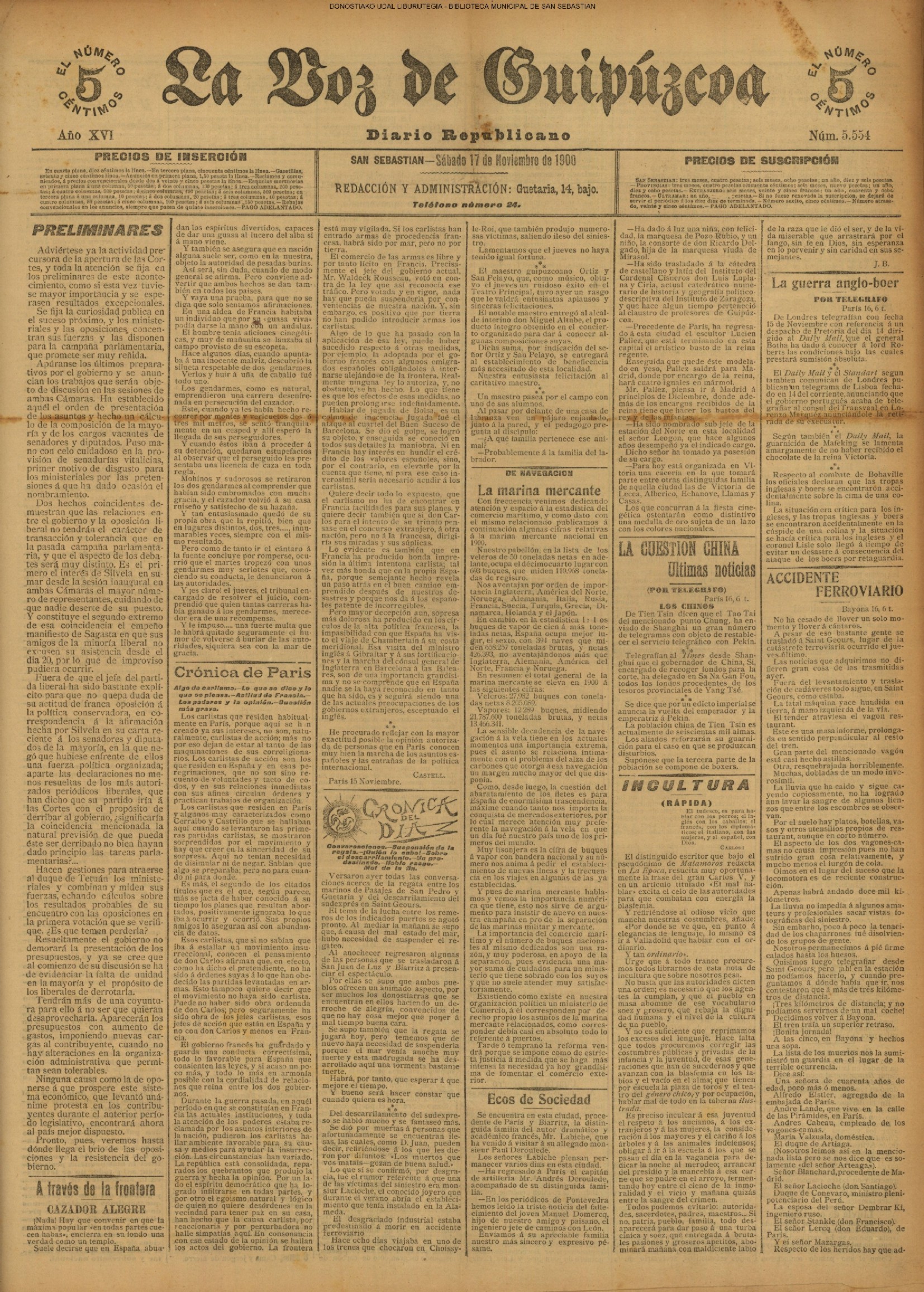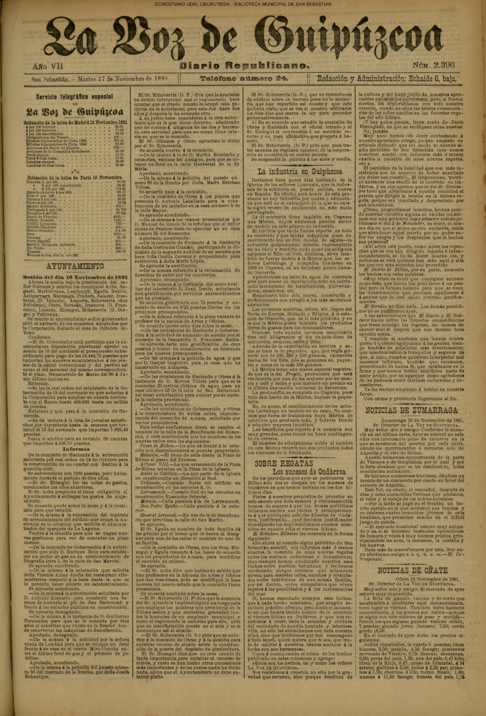 (1885) DIPUTACIÓN PROVINCIL DE GUIPUZCOA - SESIÓN ORDINARIA (La Voz de Guipuzcoa) (1891). PLENO MUNICIPAL- Abrese la sesión bajo la presidencia del señor Güemes y asisten los concejales Acha, Sagasti, Marticorena, Lerchundi, Egaña, Rezola, Astigarraga, Macazaga, Pradera, Salazar, Irastorza, (D. Ignacio), Asqueta, Echeverría (don Feliciano), Otero, Nerecan, Irastorza (D. Francisco), Lasarte, Elósegui, Echevarria (D. Diego) y Petrirena. .- (....) Para evitar confusiones dicen se cambie el nombre de la calle de la Beneficencia del Ensanche, y cree conveniente que los nombres de las nuevas calles sean los siguientes: .......... (La Voz de Guipuzcoa) El maestro Gorriti termina el Miserere que había de cantarse en la iglesia de San Vicente en la Semana Santa, y que se hizo célebre. (1893) TAL DÍA COMO HOY (1894) TAL DÍA COMO HOY (1895) EN LA ESQUINA DEL BOULEVARD (1896) EN LA ESQUINA DEL BOULEVARD (1897) EN LA ESQUINA DEL BOULEVARD (1898) EN LA ESQUINA DEL BOULEVARD (1899) EN LA ESQUINA DEL BOULEVARD (1900) CRÓNICA DEL DÍA |