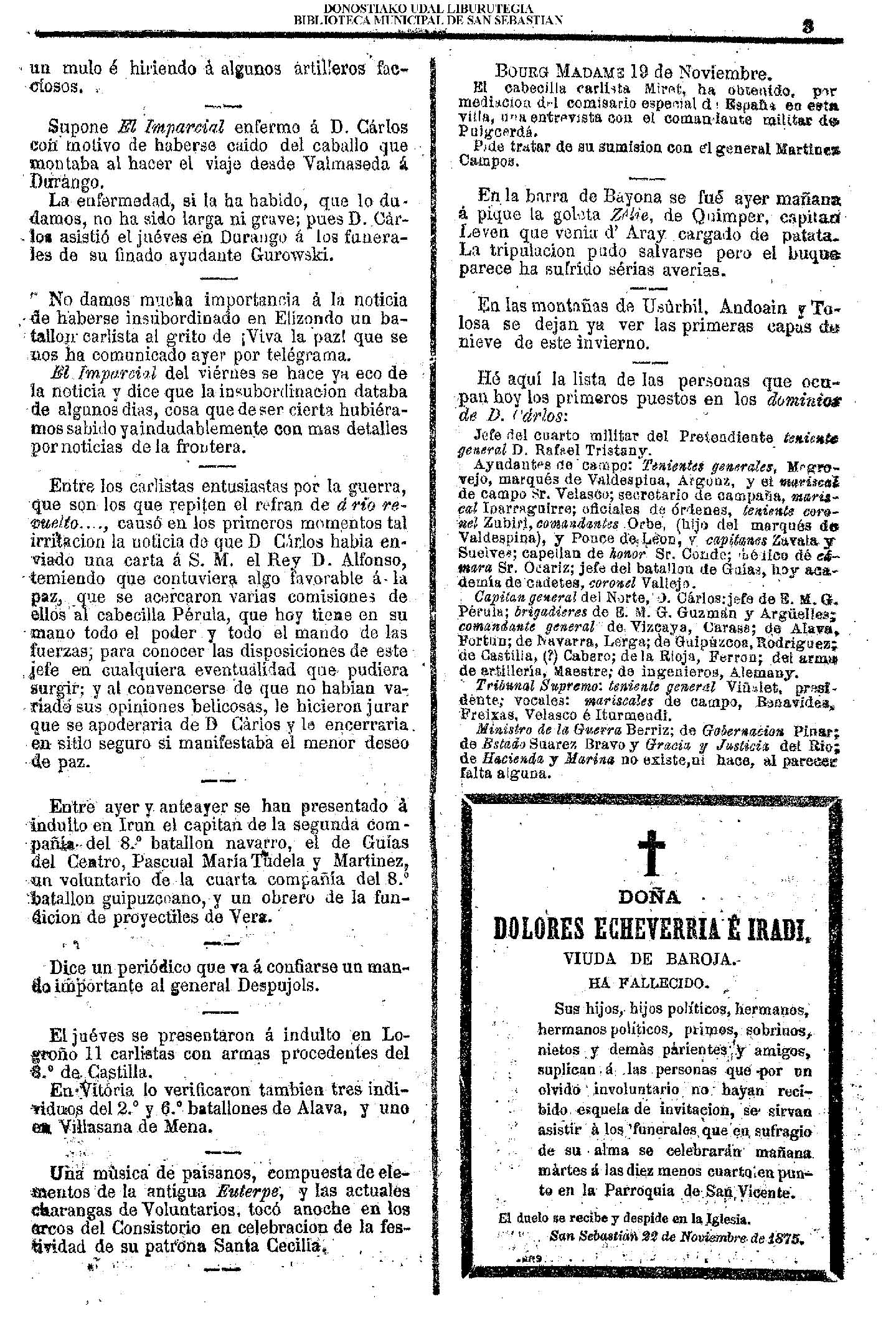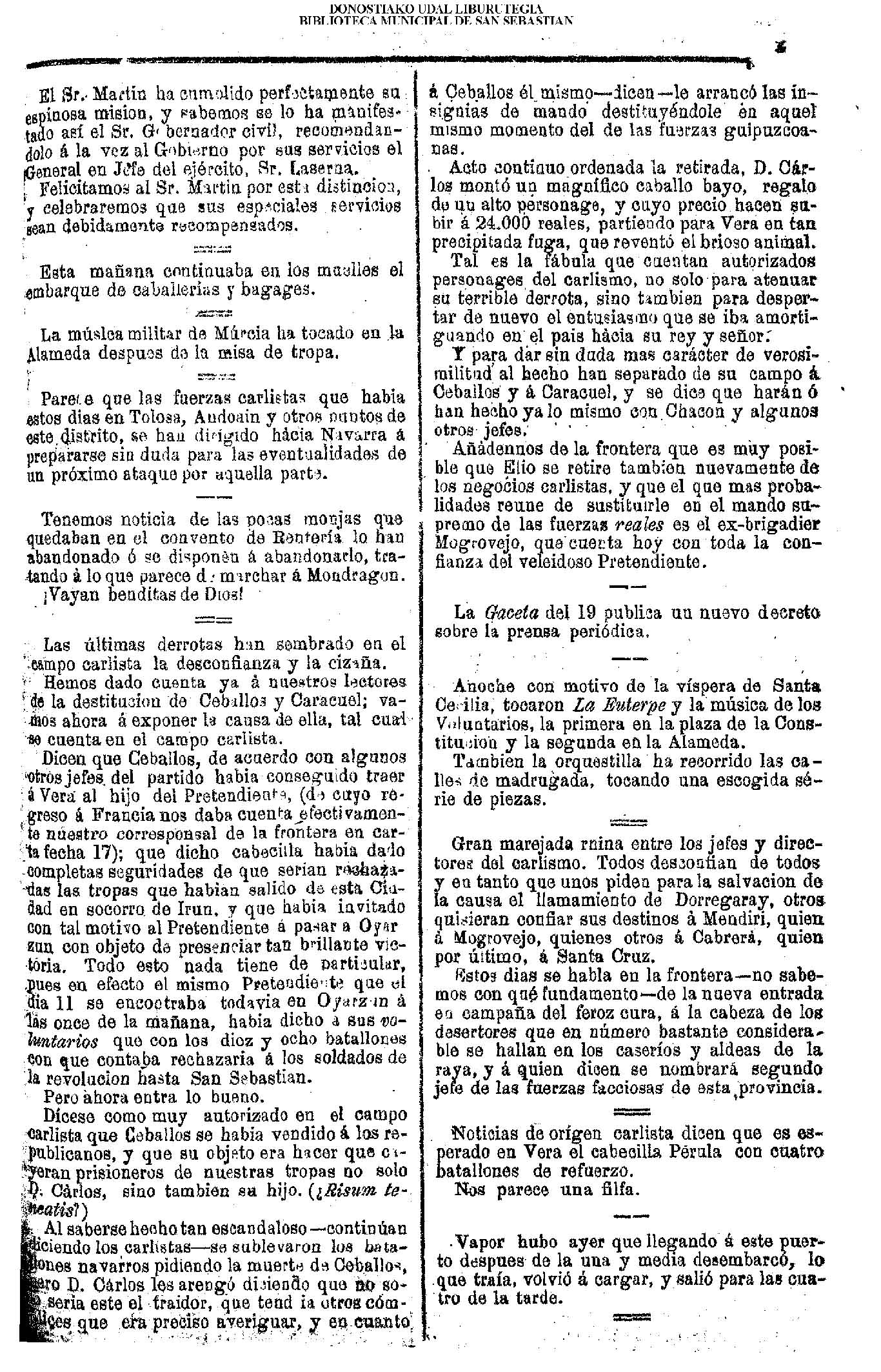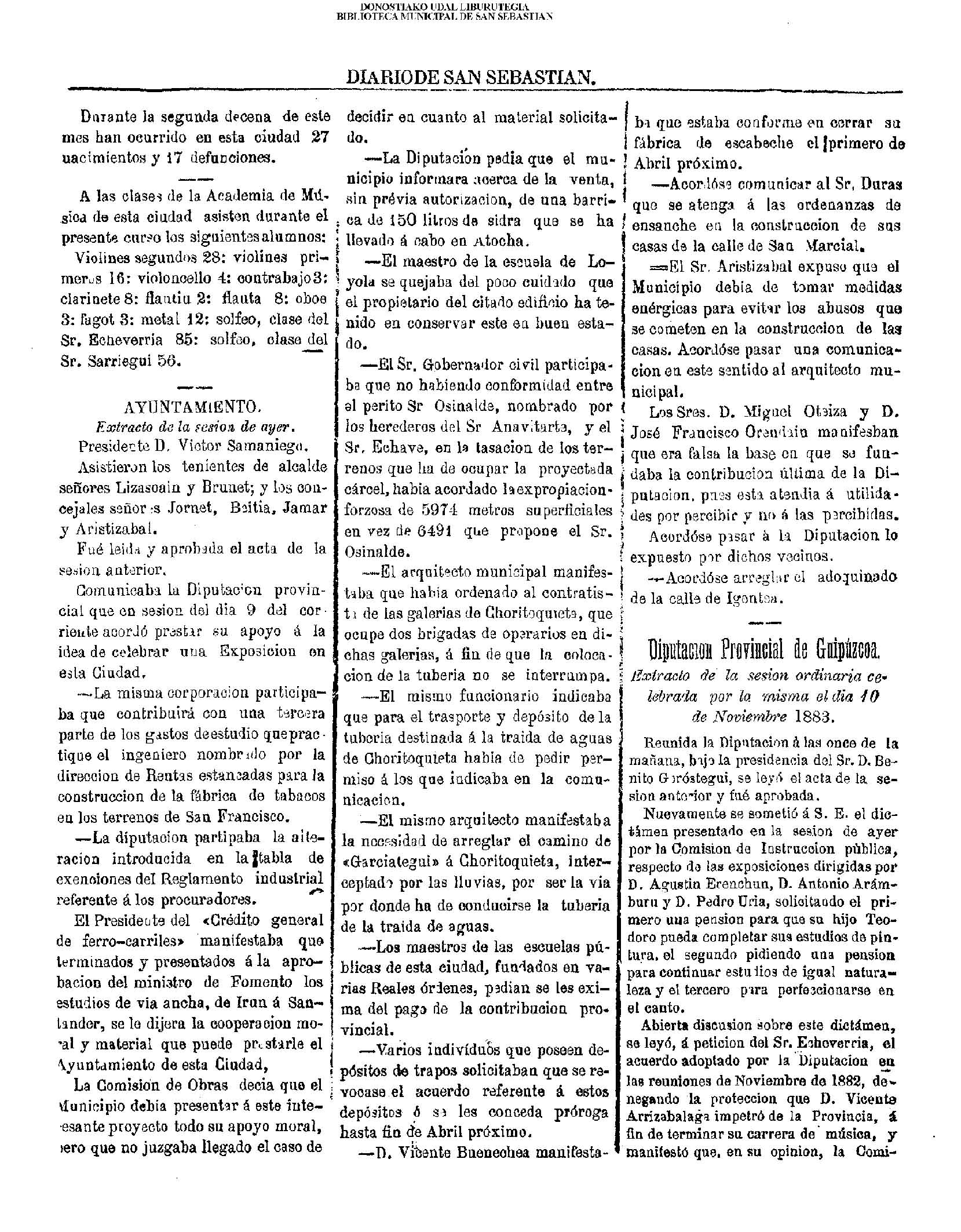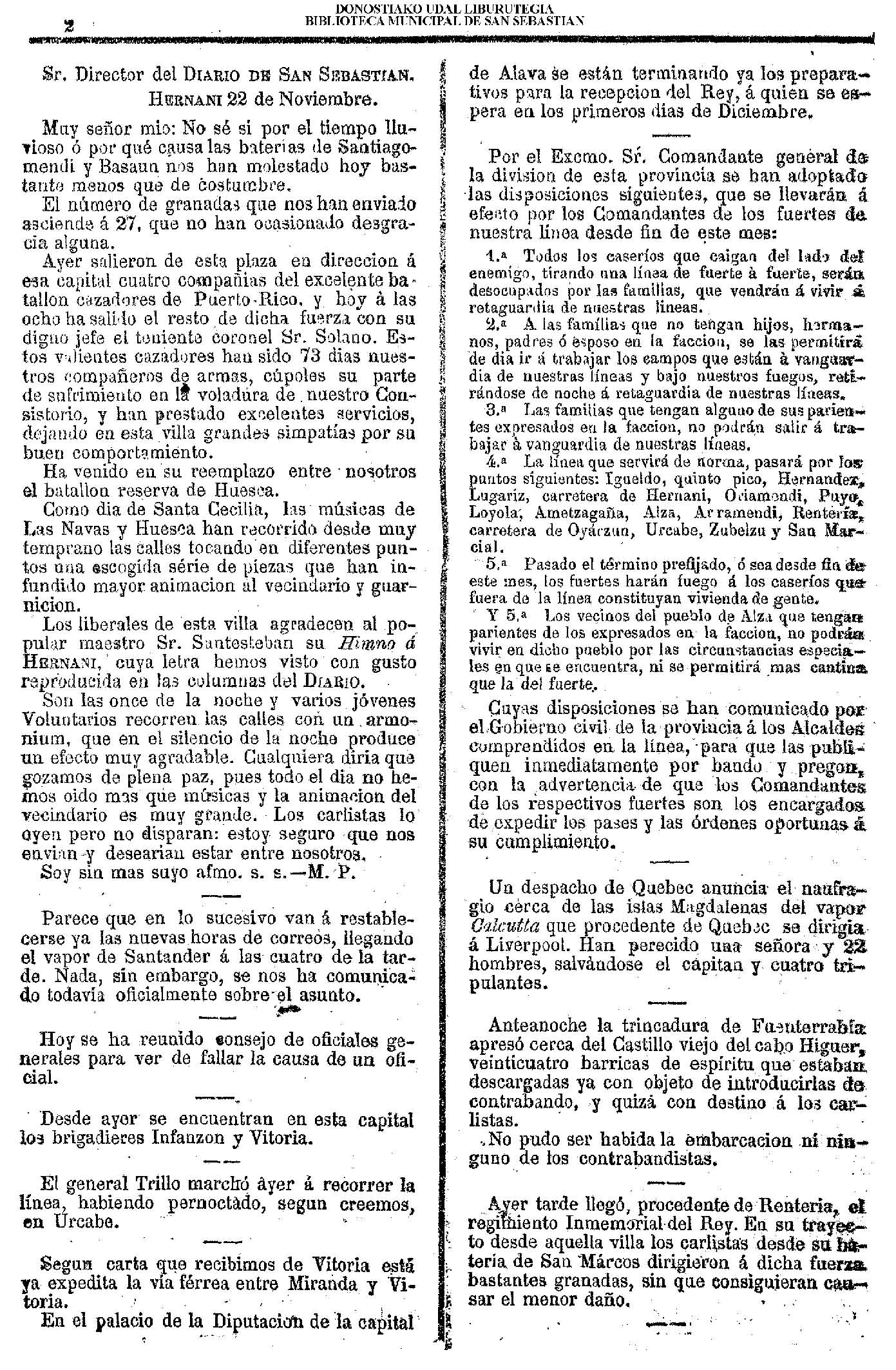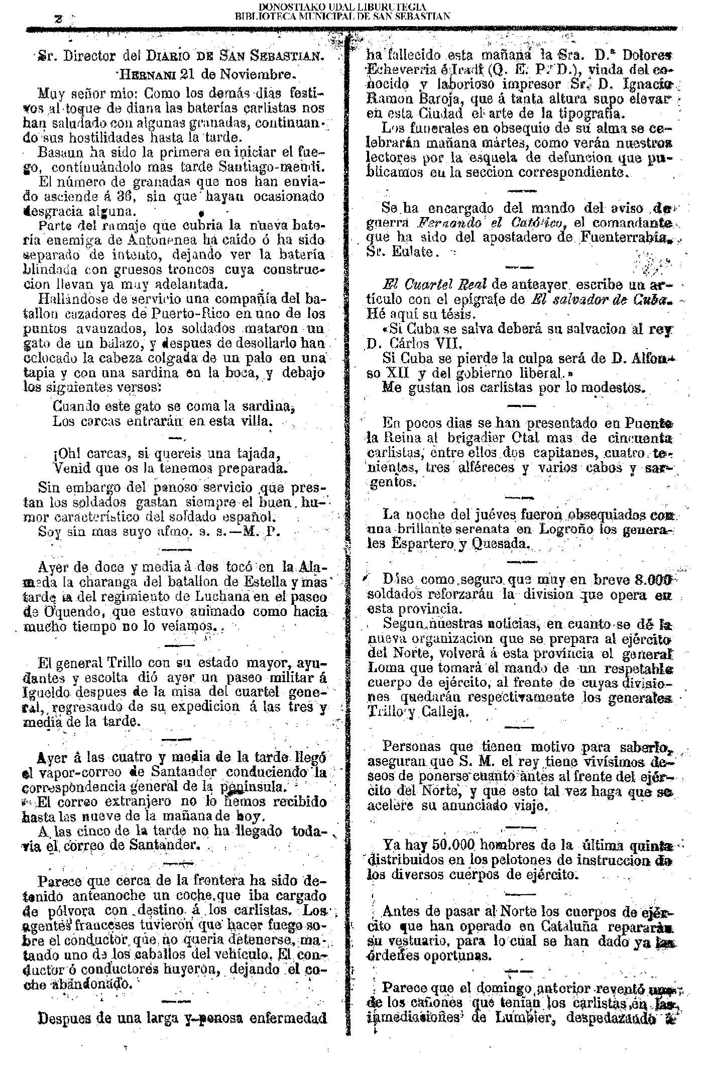 (1875) De doce y media à dos tocó en la Alameda la charanga del batallon de Estella y mas tarde ia del regimiento de Luchana en el paseo de Oquendo, que estuvo animado como hacia mucho tiempo no lo veíamos.. (Diario de San Sebastián) HERNANI 21 de Noviembre. - Como los demás dias festivos al toque de diana las baterías carlistas nos han saludado con algunas granadas, continuando sus hostilidades hasta la tarde. (......)(Diario de San Sebastián) .- Salieron de esta plaza en direccion á esa capital cuatro compañias del excelente ba tallon cazadores de Puerto Rico, y hoy à las ocho ha salido el resto de dicha fuerza con su digno jefe el toniente coronel Sr. Solano. Es-tos valientes cazadores han sido 73 dias nues-tros compañeros de armas, cúpoles su parte de sufrimiento en la voladúra de nuestro Con-sistorio, y han prestado excelentes servicios, dejando en esta villa grandes simpatías por su buen comportamiento. (Diario de San Sebastián) # El general Trillo con su estado mayor, ayu-dantes y escolta dió un paseo militar á Igueldo despues de la misa del cuartel general, regresando de su expedicion á las tres y media de la tarde. - Ha venido en su reemplazo entre nosotros el batallon reserva de Huesca. # A las cuatro y media de la tarde llegó el vapor-correo de Santander conduciendo la correspondencia general de la peninsula. (Diario de San Sebastián) Una musica de paisanos, compuesta de ele-mentos de la antigua Euterpe, y las actuales charangas de Voluntarios, tocó anoche en los arcos del Consistorio en celebracion de la fes-tividad de su patrona Santa Cecilia, (Diario de San Sebastián) |