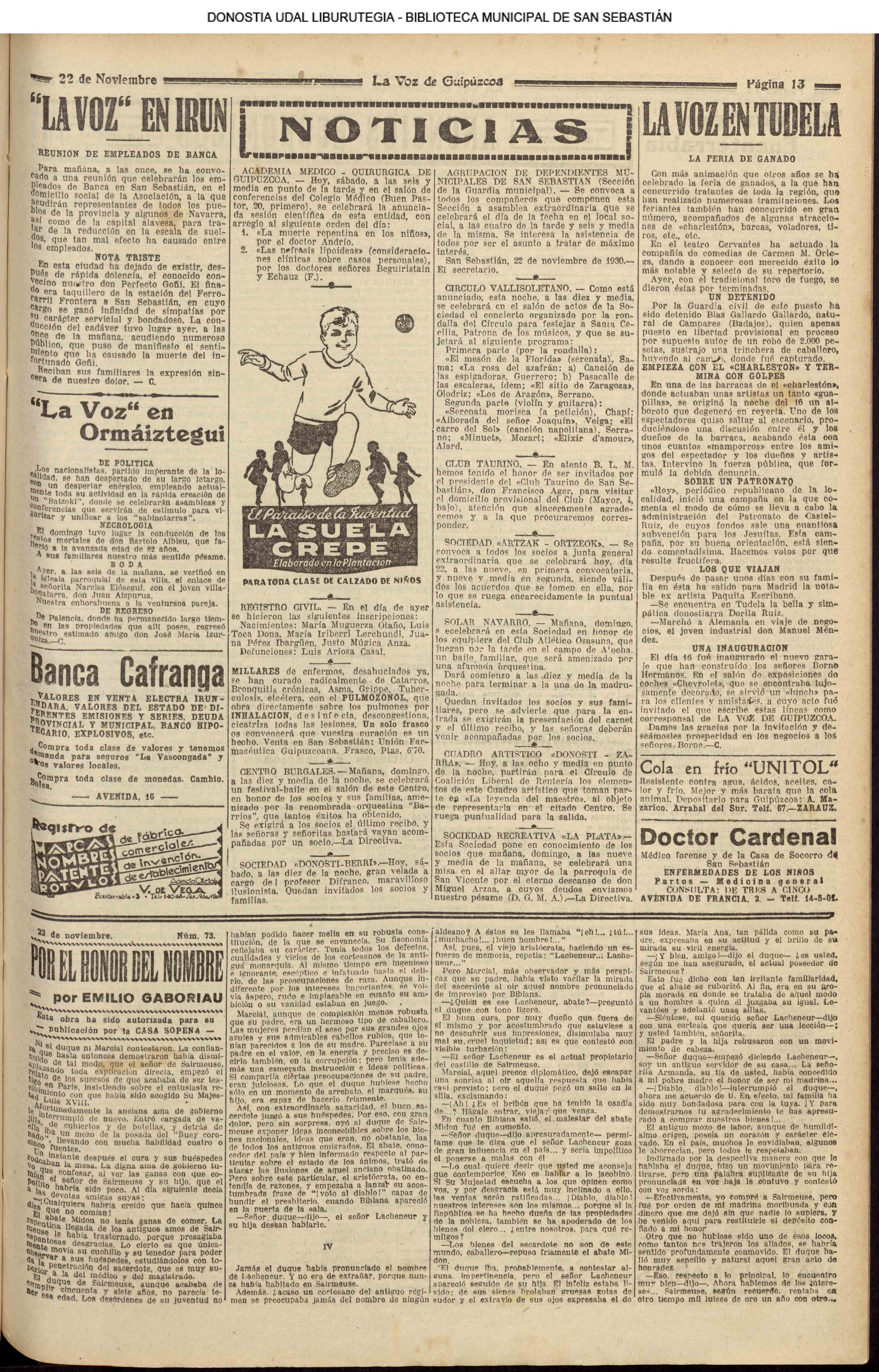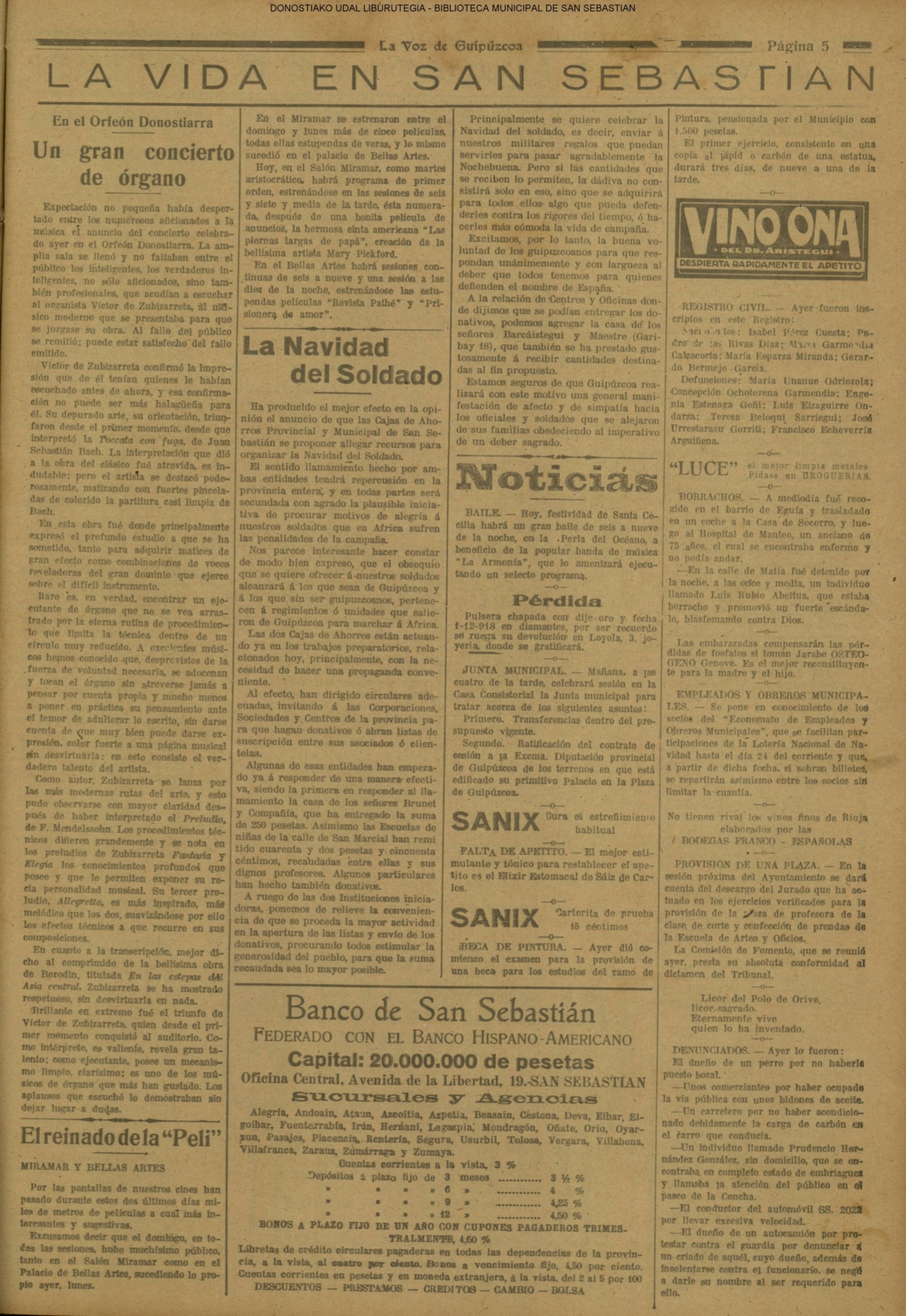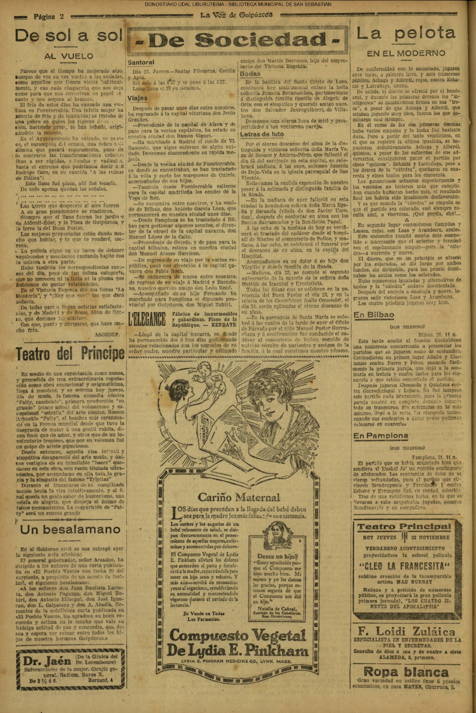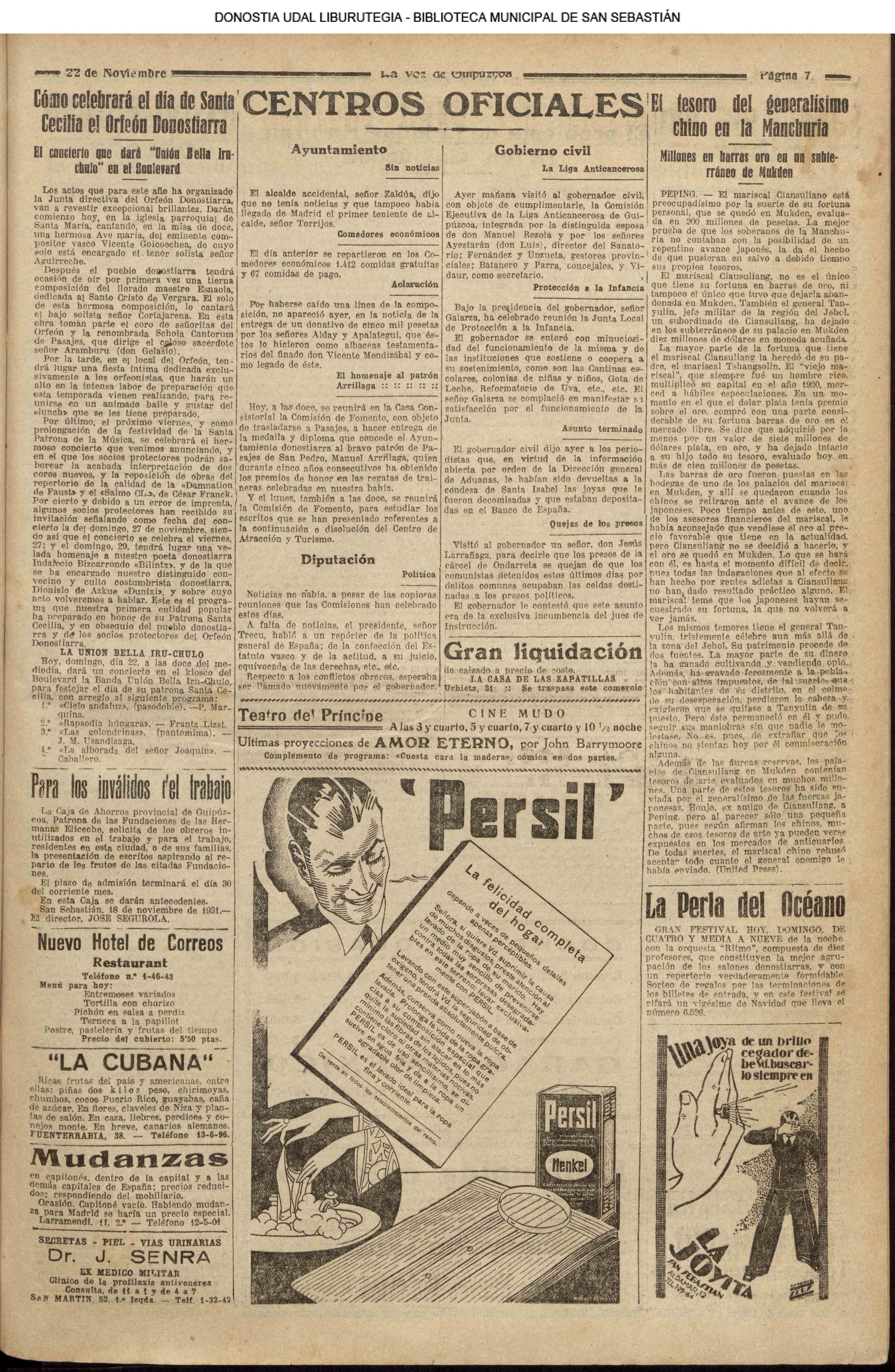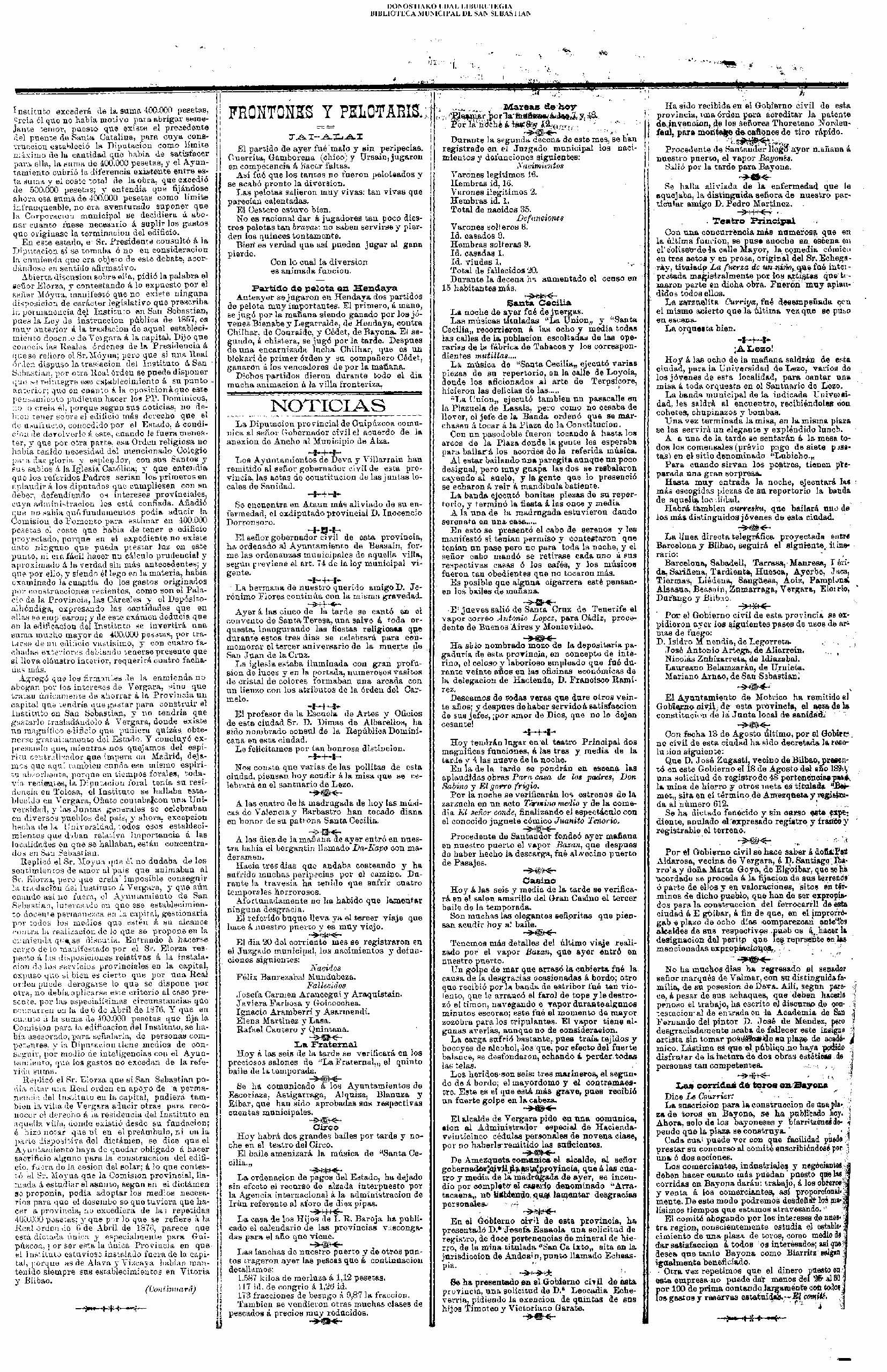 (1875) De doce y media à dos tocó en la Alameda la charanga del batallon de Estella y mas tarde ia del regimiento de Luchana en el paseo de Oquendo, que estuvo animado como hacia mucho tiempo no lo veíamos.. (Diario de San Sebastián) HERNANI 21 de Noviembre. - Como los demás dias festivos al toque de diana las baterías carlistas nos han saludado con algunas granadas, continuando sus hostilidades hasta la tarde. (......)(Diario de San Sebastián) .- Salieron de esta plaza en direccion á esa capital cuatro compañias del excelente ba tallon cazadores de Puerto Rico, y hoy à las ocho ha salido el resto de dicha fuerza con su digno jefe el toniente coronel Sr. Solano. Es-tos valientes cazadores han sido 73 dias nues-tros compañeros de armas, cúpoles su parte de sufrimiento en la voladúra de nuestro Con-sistorio, y han prestado excelentes servicios, dejando en esta villa grandes simpatías por su buen comportamiento. (Diario de San Sebastián) # El general Trillo con su estado mayor, ayu-dantes y escolta dió un paseo militar á Igueldo despues de la misa del cuartel general, regresando de su expedicion á las tres y media de la tarde. - Ha venido en su reemplazo entre nosotros el batallon reserva de Huesca. # A las cuatro y media de la tarde llegó el vapor-correo de Santander conduciendo la correspondencia general de la peninsula. (Diario de San Sebastián) Una musica de paisanos, compuesta de ele-mentos de la antigua Euterpe, y las actuales charangas de Voluntarios, tocó anoche en los arcos del Consistorio en celebracion de la fes-tividad de su patrona Santa Cecilia, (Diario de San Sebastián) |