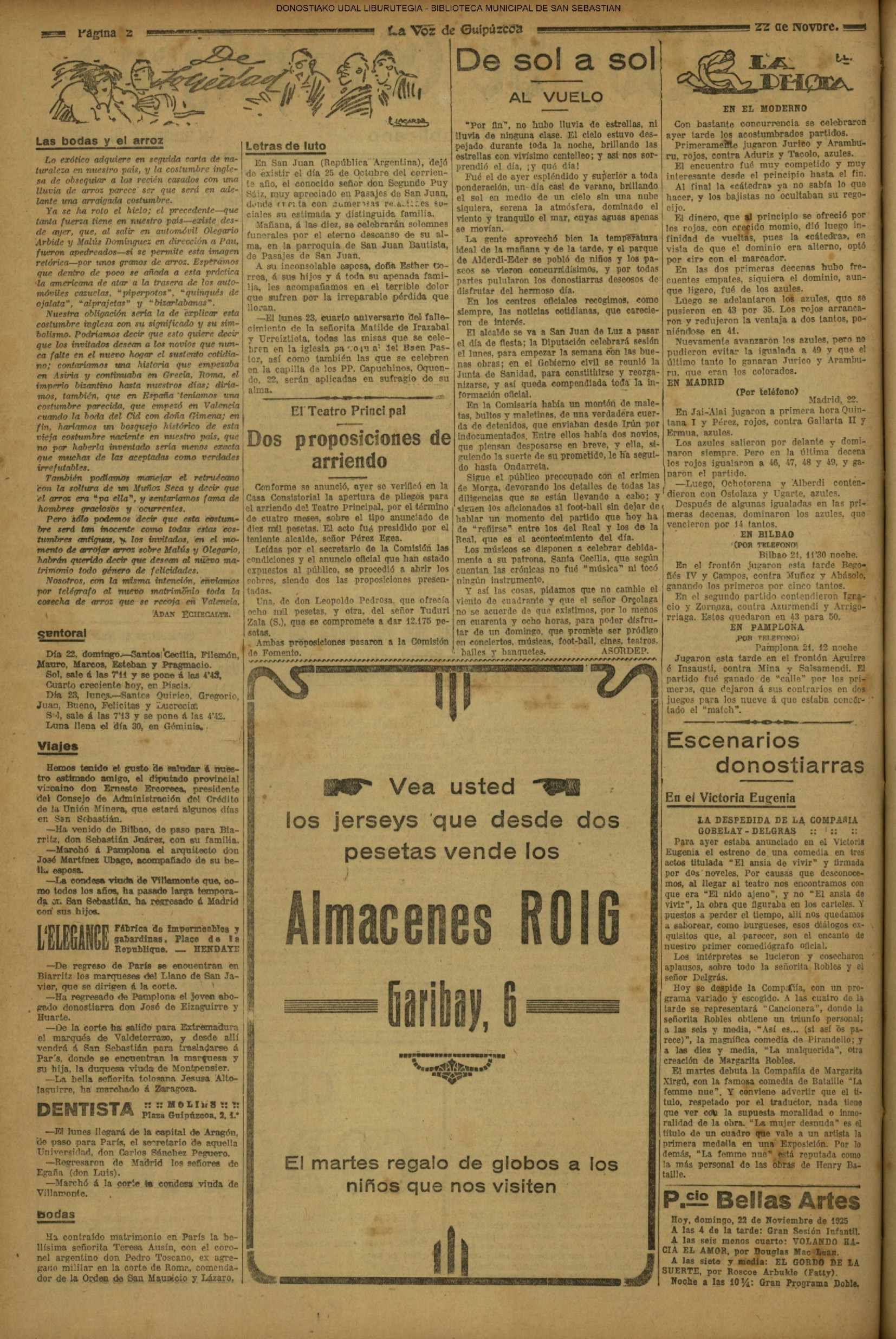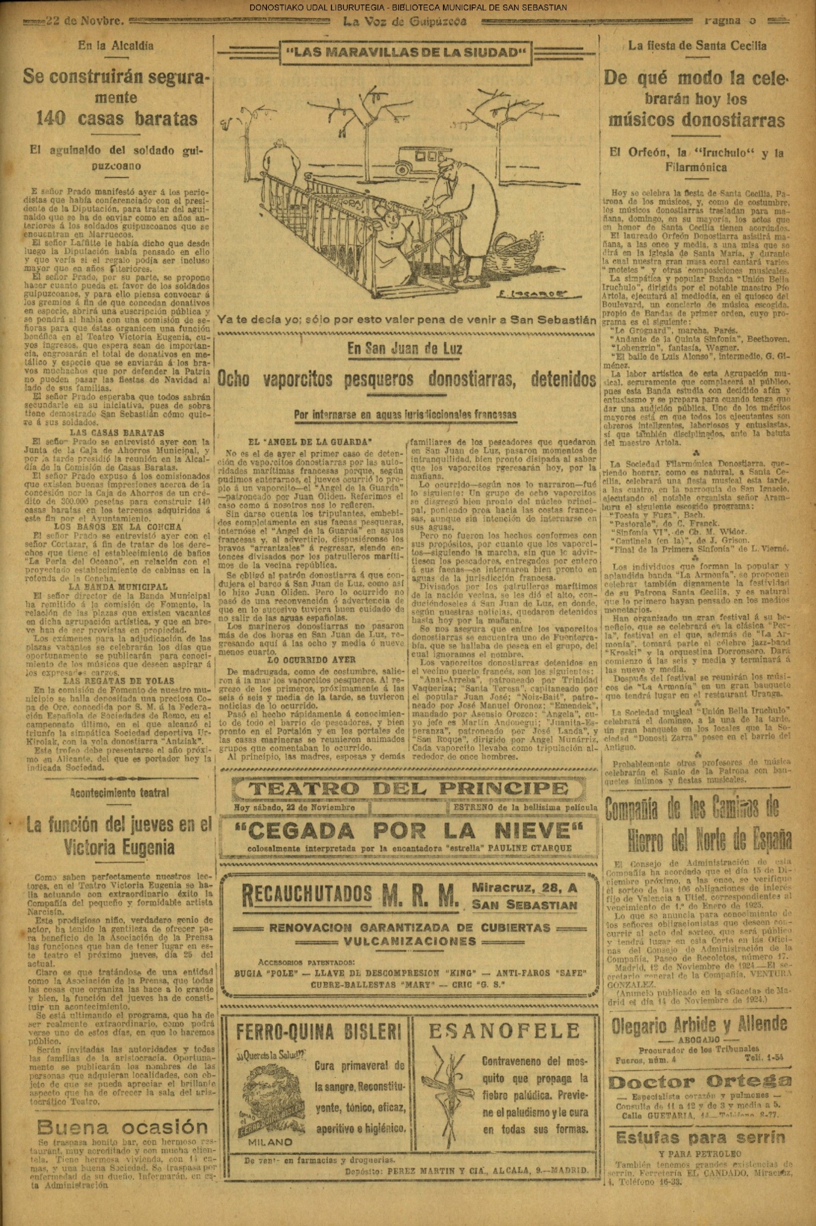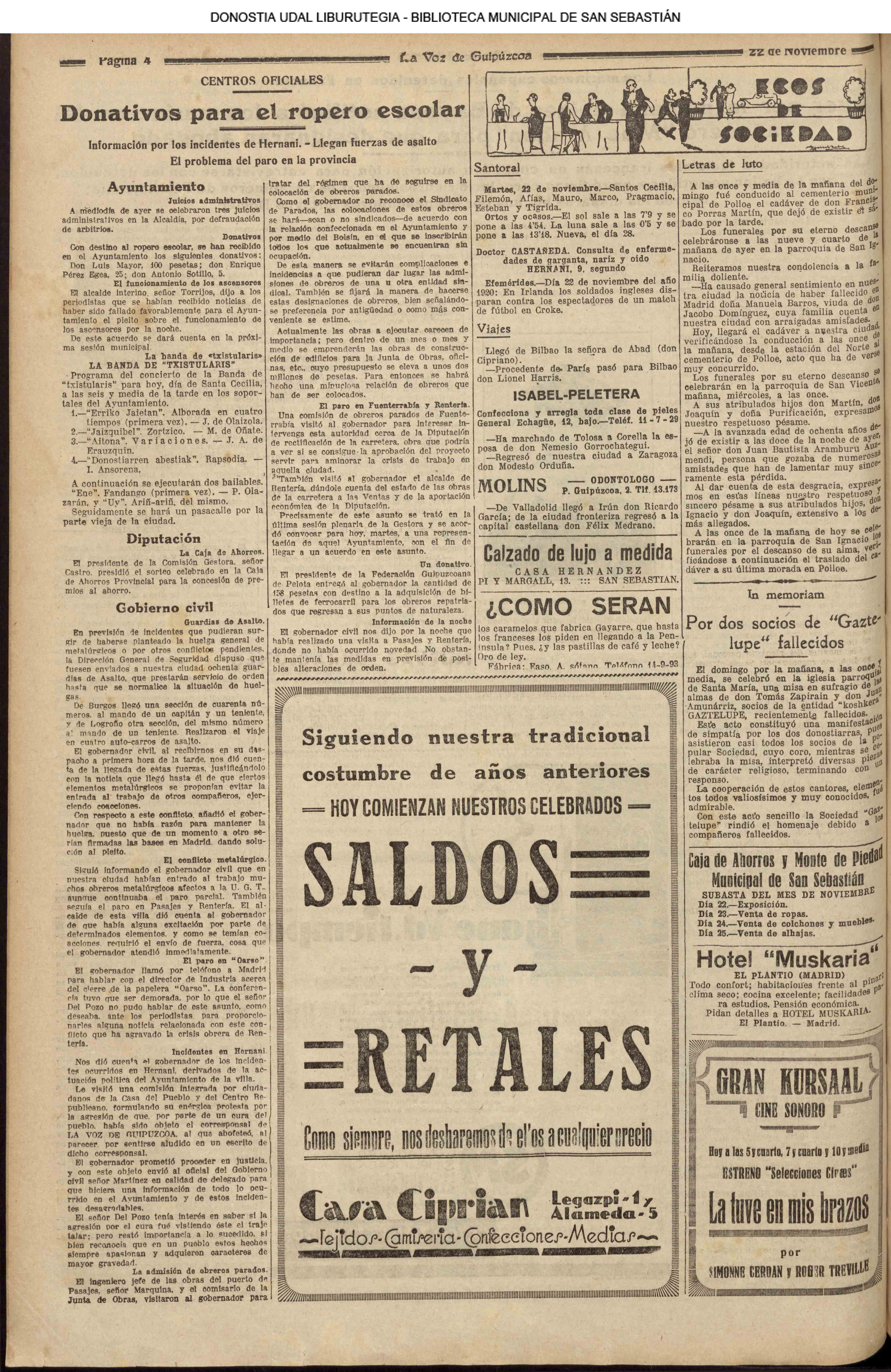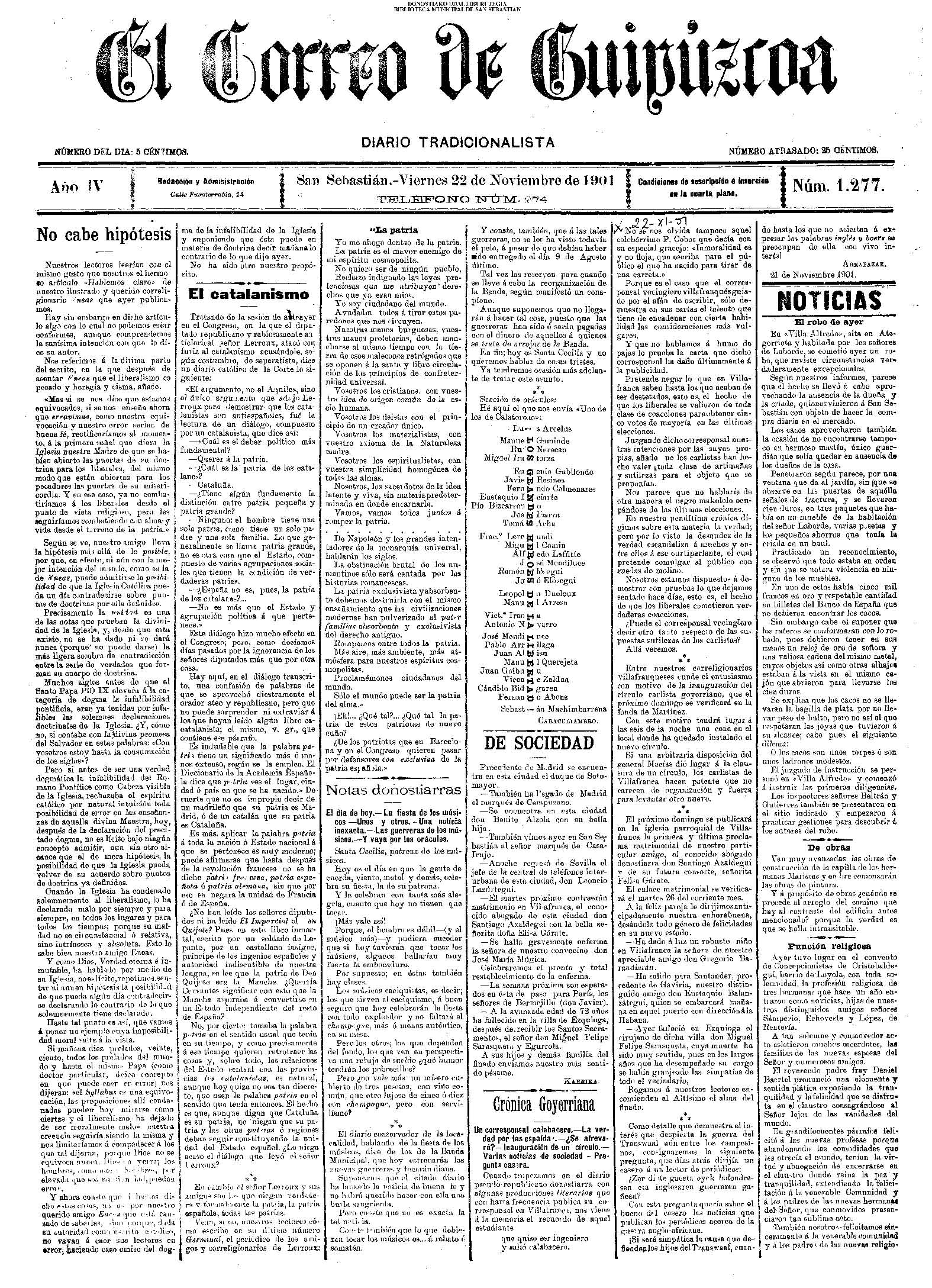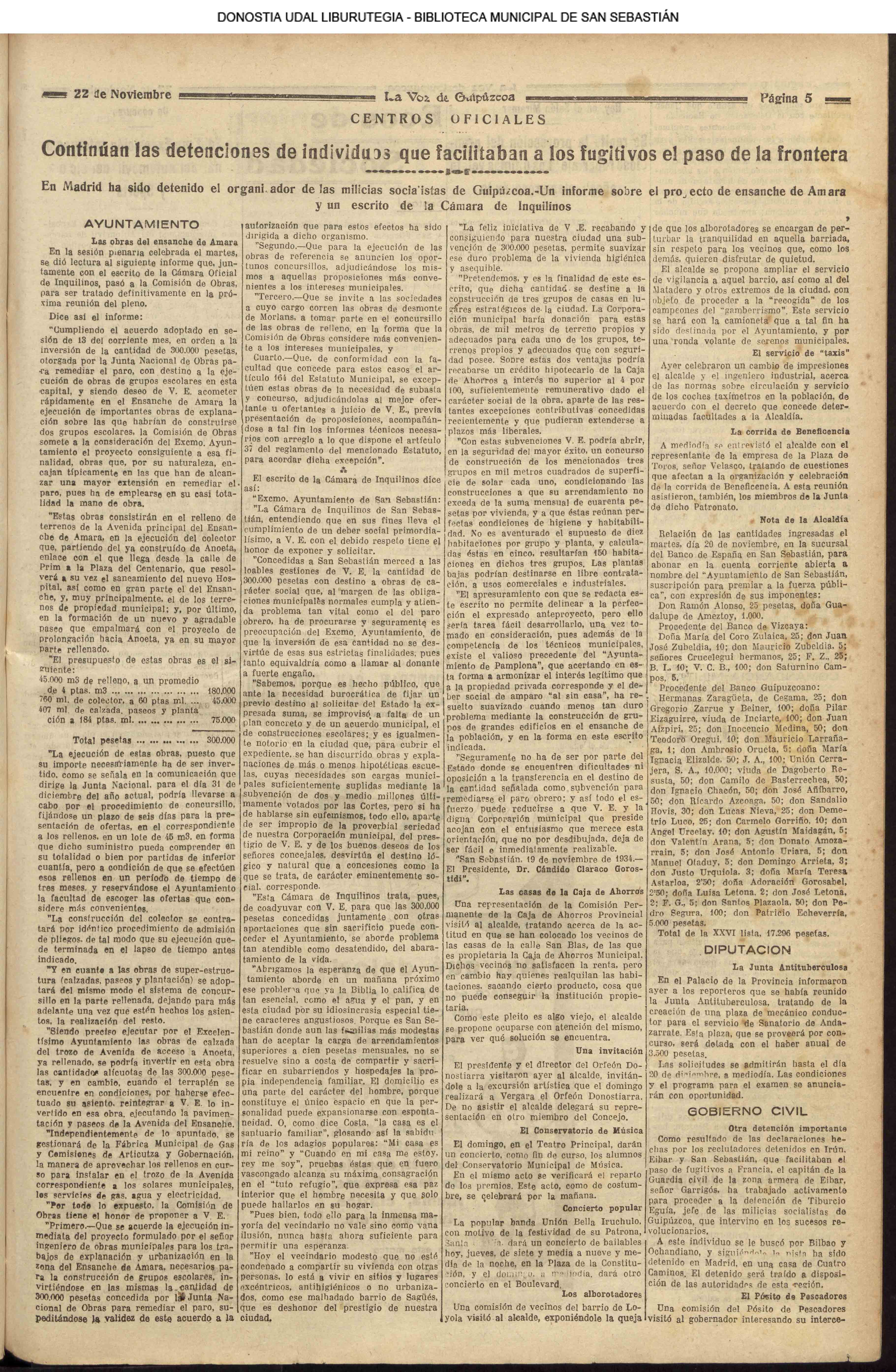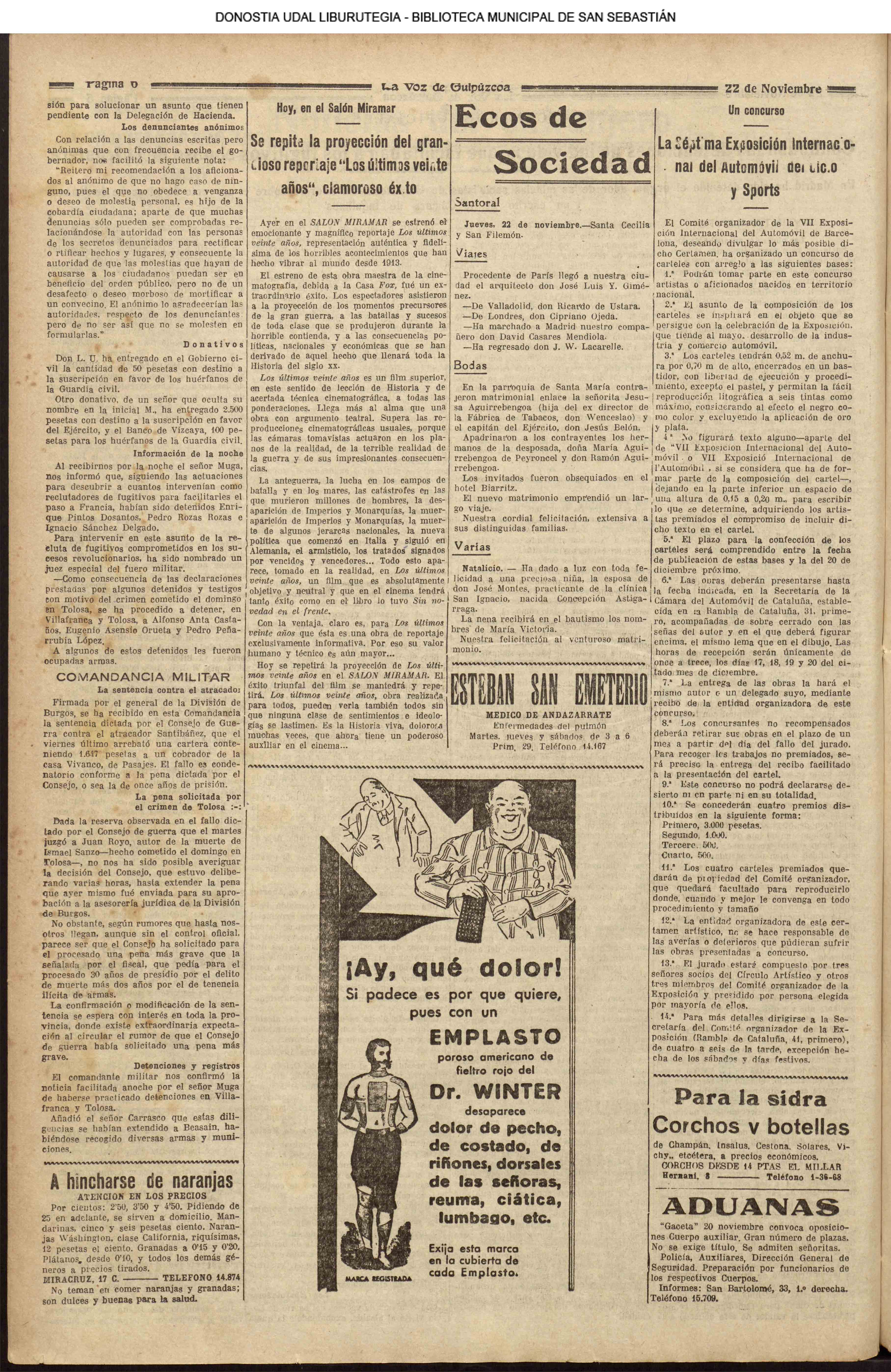(1875) De doce y media à dos tocó en la Alameda la charanga del batallon de Estella y mas tarde ia del regimiento de Luchana en el paseo de Oquendo, que estuvo animado como hacia mucho tiempo no lo veíamos.. (Diario de San Sebastián) HERNANI 21 de Noviembre. - Como los demás dias festivos al toque de diana las baterías carlistas nos han saludado con algunas granadas, continuando sus hostilidades hasta la tarde. (......)(Diario de San Sebastián) .- Salieron de esta plaza en direccion á esa capital cuatro compañias del excelente ba tallon cazadores de Puerto Rico, y hoy à las ocho ha salido el resto de dicha fuerza con su digno jefe el toniente coronel Sr. Solano. Es-tos valientes cazadores han sido 73 dias nues-tros compañeros de armas, cúpoles su parte de sufrimiento en la voladúra de nuestro Con-sistorio, y han prestado excelentes servicios, dejando en esta villa grandes simpatías por su buen comportamiento. (Diario de San Sebastián) # El general Trillo con su estado mayor, ayu-dantes y escolta dió un paseo militar á Igueldo despues de la misa del cuartel general, regresando de su expedicion á las tres y media de la tarde. - Ha venido en su reemplazo entre nosotros el batallon reserva de Huesca. # A las cuatro y media de la tarde llegó el vapor-correo de Santander conduciendo la correspondencia general de la peninsula. (Diario de San Sebastián) Una musica de paisanos, compuesta de ele-mentos de la antigua Euterpe, y las actuales charangas de Voluntarios, tocó anoche en los arcos del Consistorio en celebracion de la fes-tividad de su patrona Santa Cecilia, (Diario de San Sebastián) |