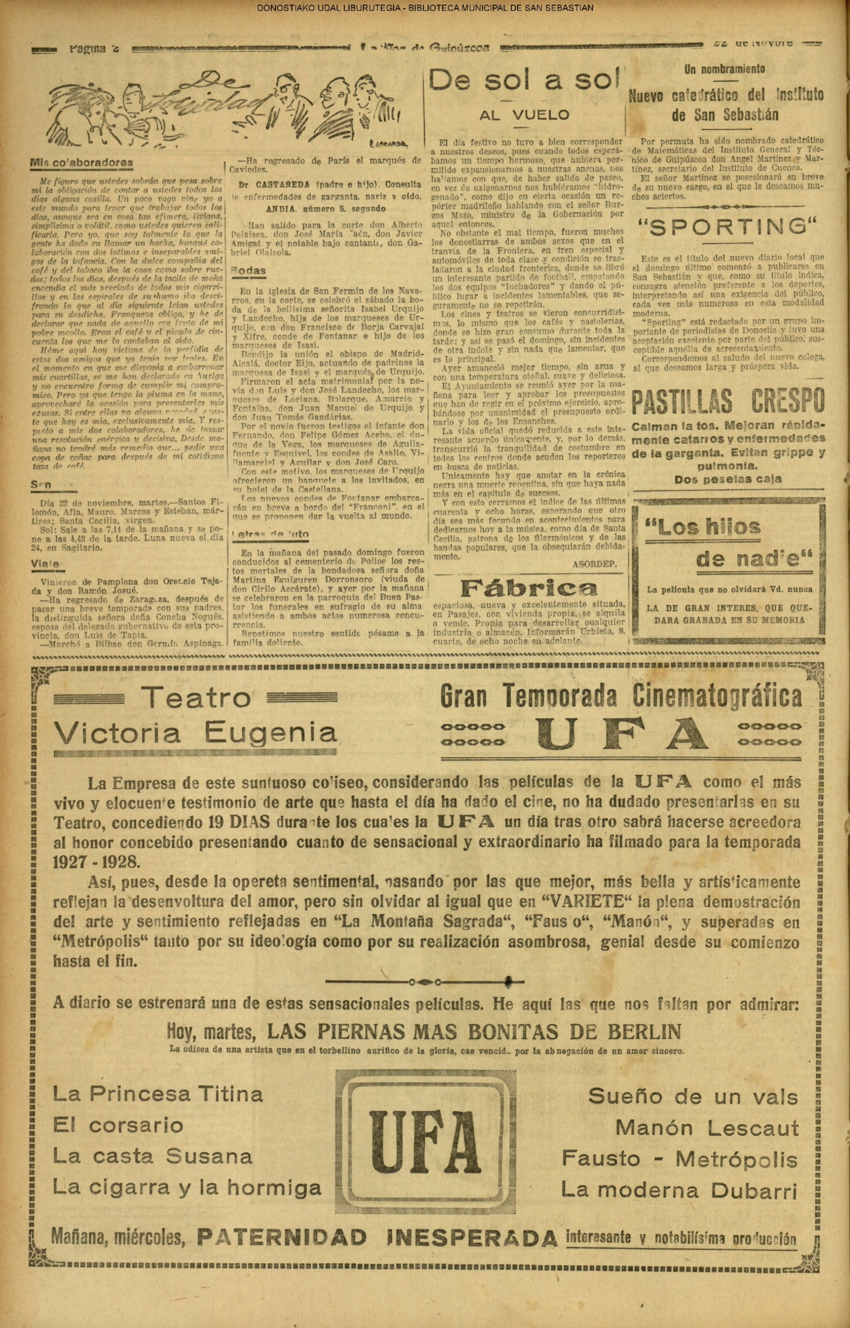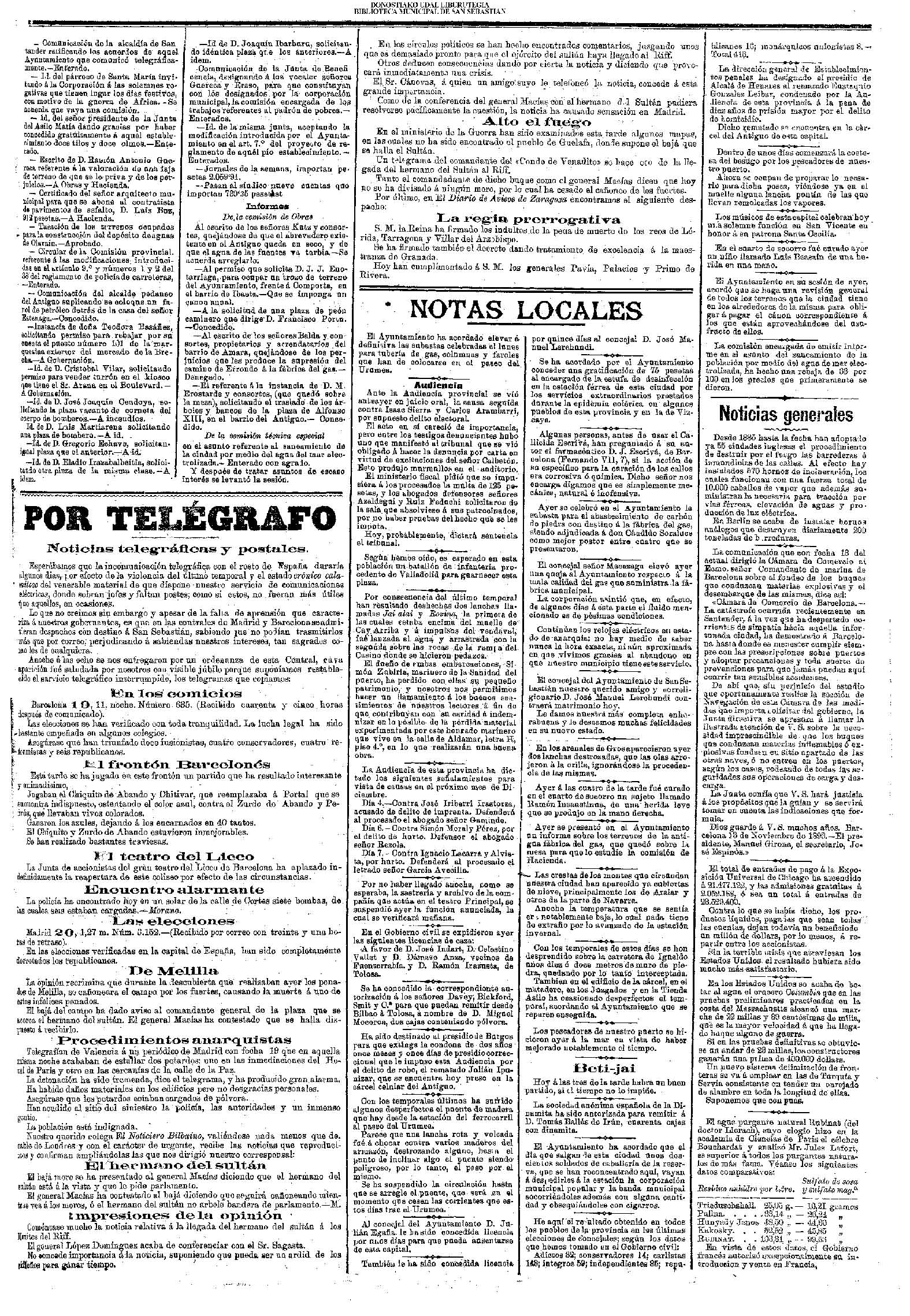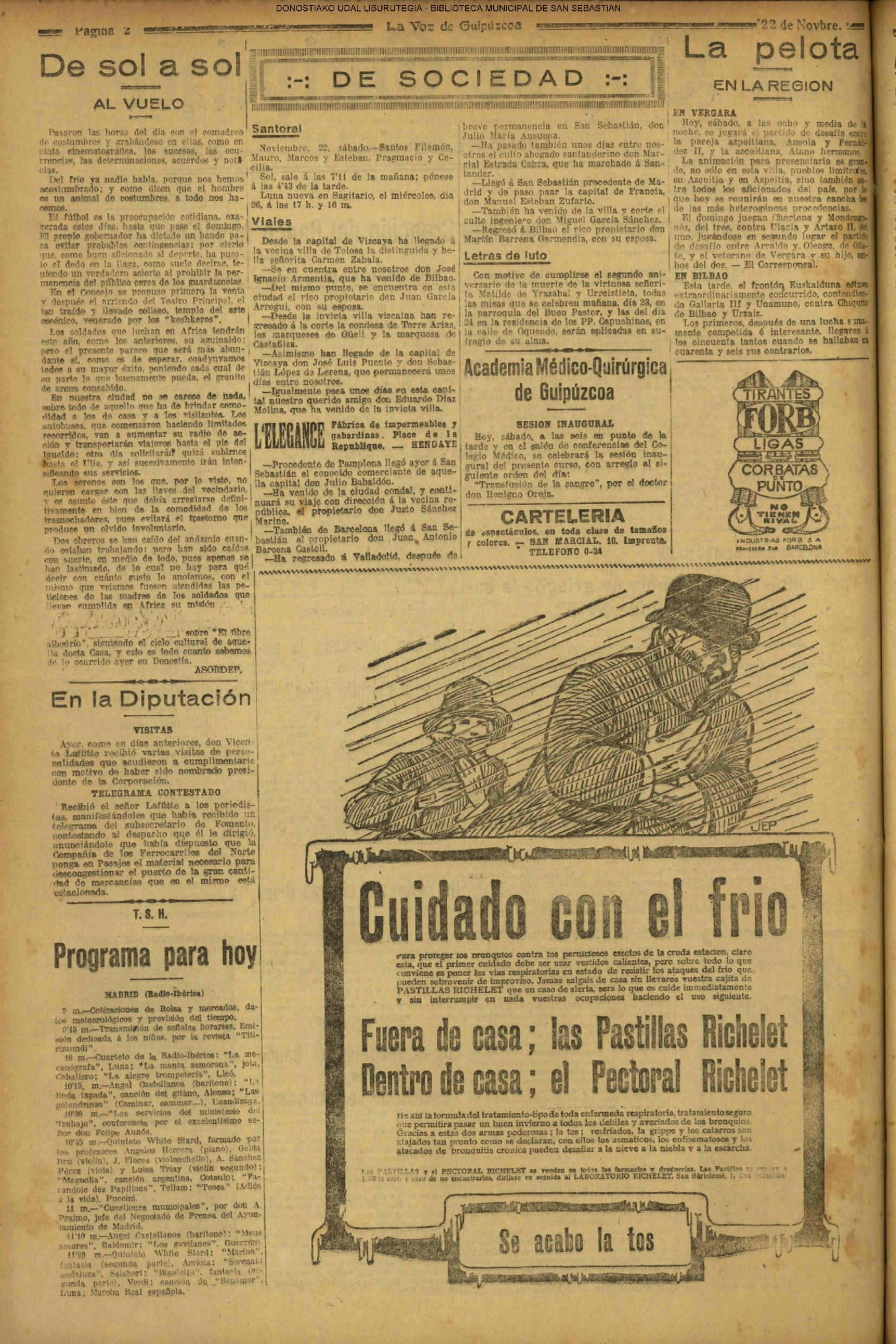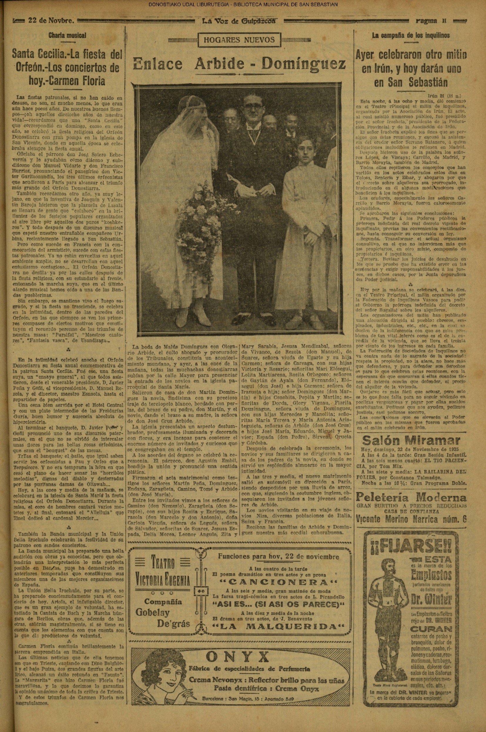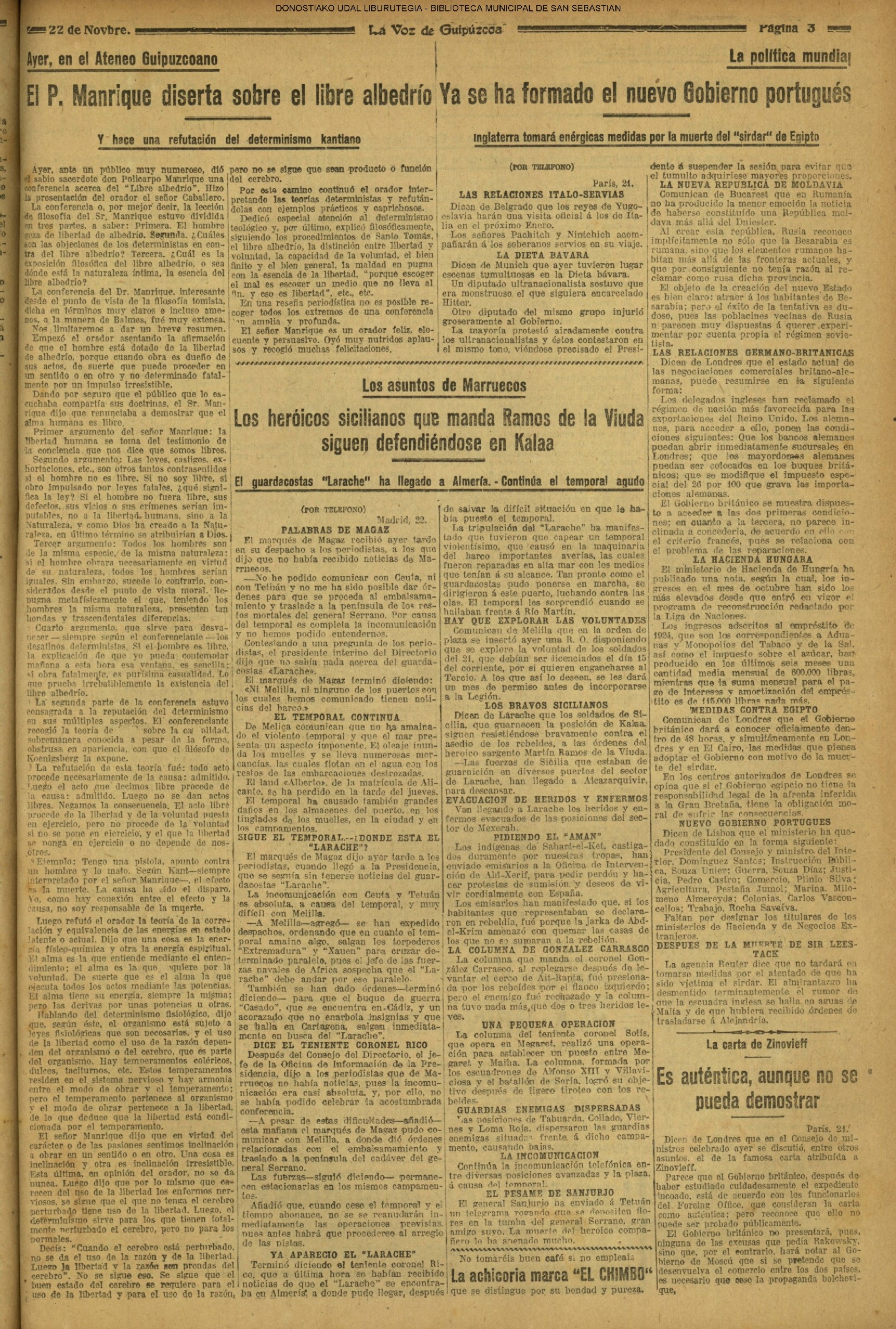 (1875) De doce y media à dos tocó en la Alameda la charanga del batallon de Estella y mas tarde ia del regimiento de Luchana en el paseo de Oquendo, que estuvo animado como hacia mucho tiempo no lo veíamos.. (Diario de San Sebastián) HERNANI 21 de Noviembre. - Como los demás dias festivos al toque de diana las baterías carlistas nos han saludado con algunas granadas, continuando sus hostilidades hasta la tarde. (......)(Diario de San Sebastián) .- Salieron de esta plaza en direccion á esa capital cuatro compañias del excelente ba tallon cazadores de Puerto Rico, y hoy à las ocho ha salido el resto de dicha fuerza con su digno jefe el toniente coronel Sr. Solano. Es-tos valientes cazadores han sido 73 dias nues-tros compañeros de armas, cúpoles su parte de sufrimiento en la voladúra de nuestro Con-sistorio, y han prestado excelentes servicios, dejando en esta villa grandes simpatías por su buen comportamiento. (Diario de San Sebastián) # El general Trillo con su estado mayor, ayu-dantes y escolta dió un paseo militar á Igueldo despues de la misa del cuartel general, regresando de su expedicion á las tres y media de la tarde. - Ha venido en su reemplazo entre nosotros el batallon reserva de Huesca. # A las cuatro y media de la tarde llegó el vapor-correo de Santander conduciendo la correspondencia general de la peninsula. (Diario de San Sebastián) Una musica de paisanos, compuesta de ele-mentos de la antigua Euterpe, y las actuales charangas de Voluntarios, tocó anoche en los arcos del Consistorio en celebracion de la fes-tividad de su patrona Santa Cecilia, (Diario de San Sebastián) |