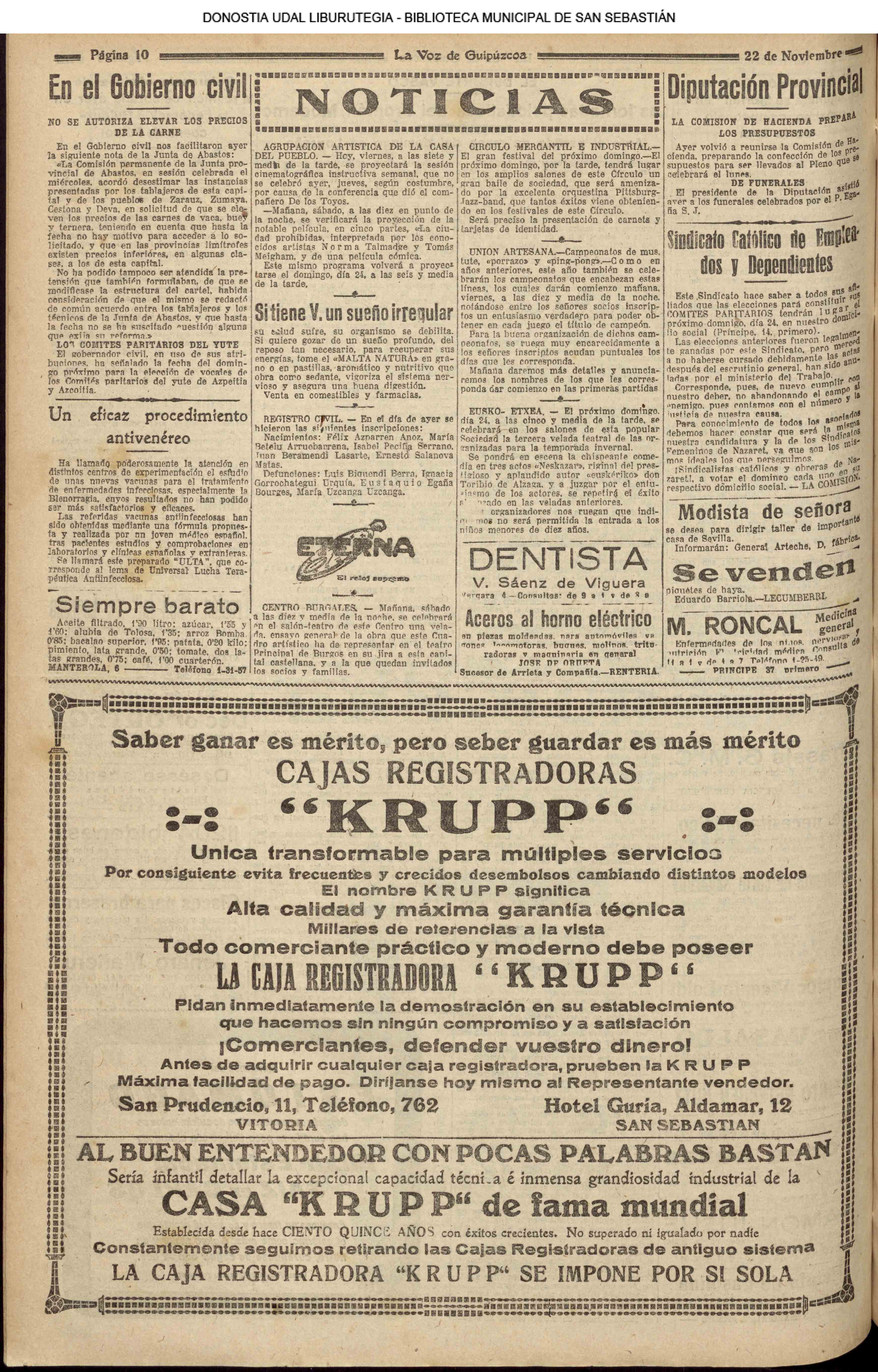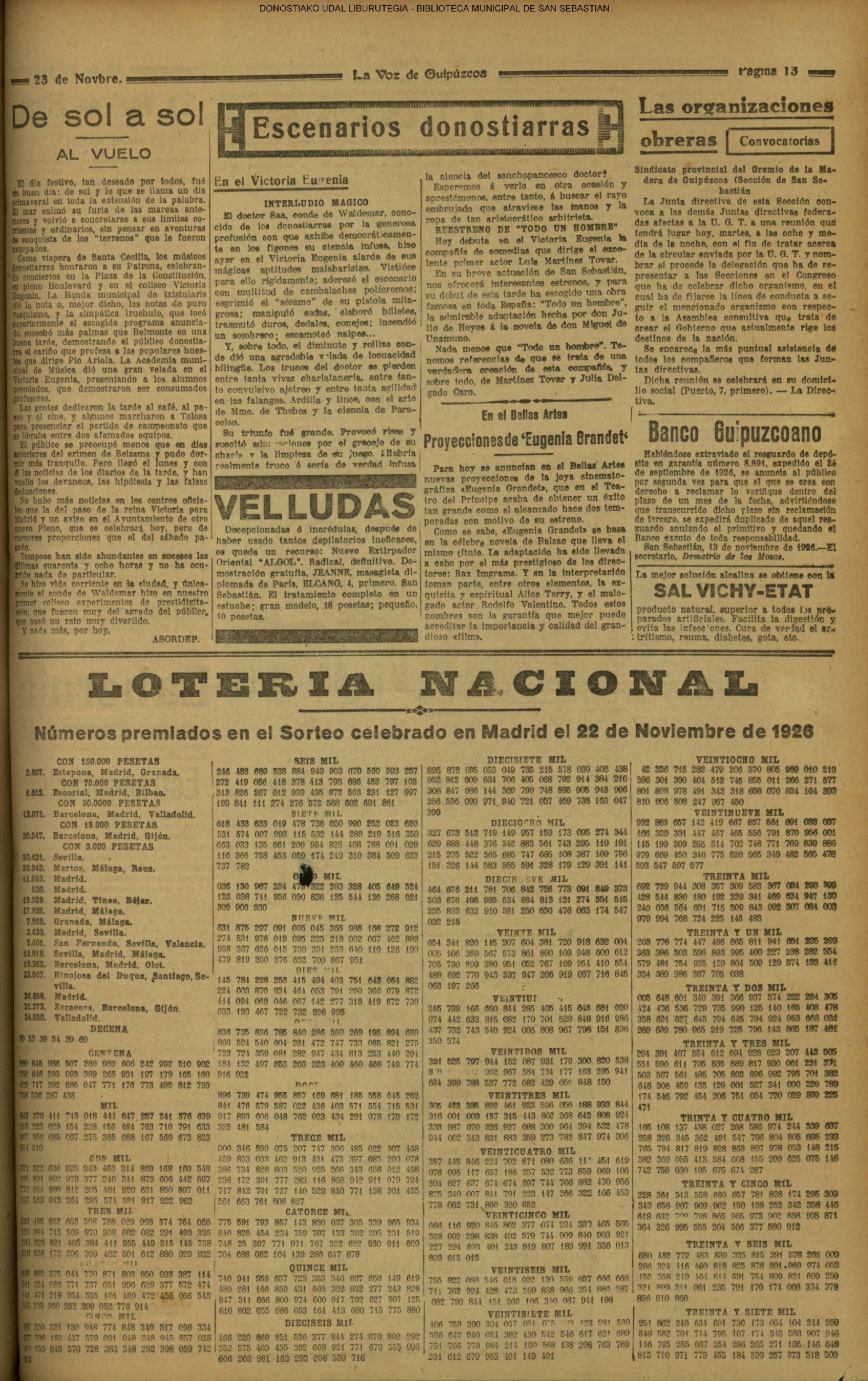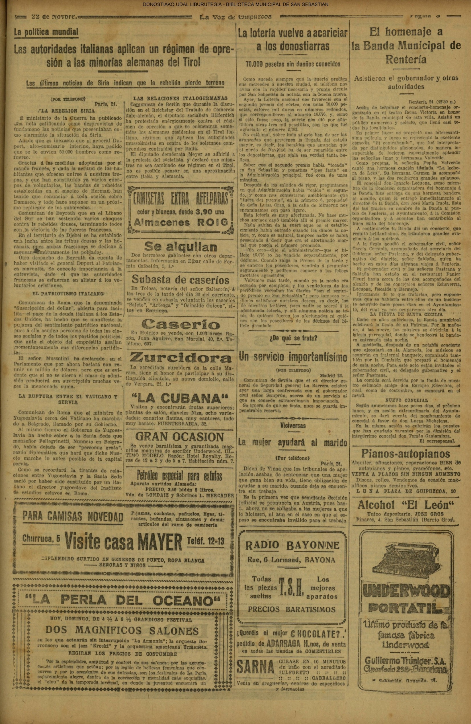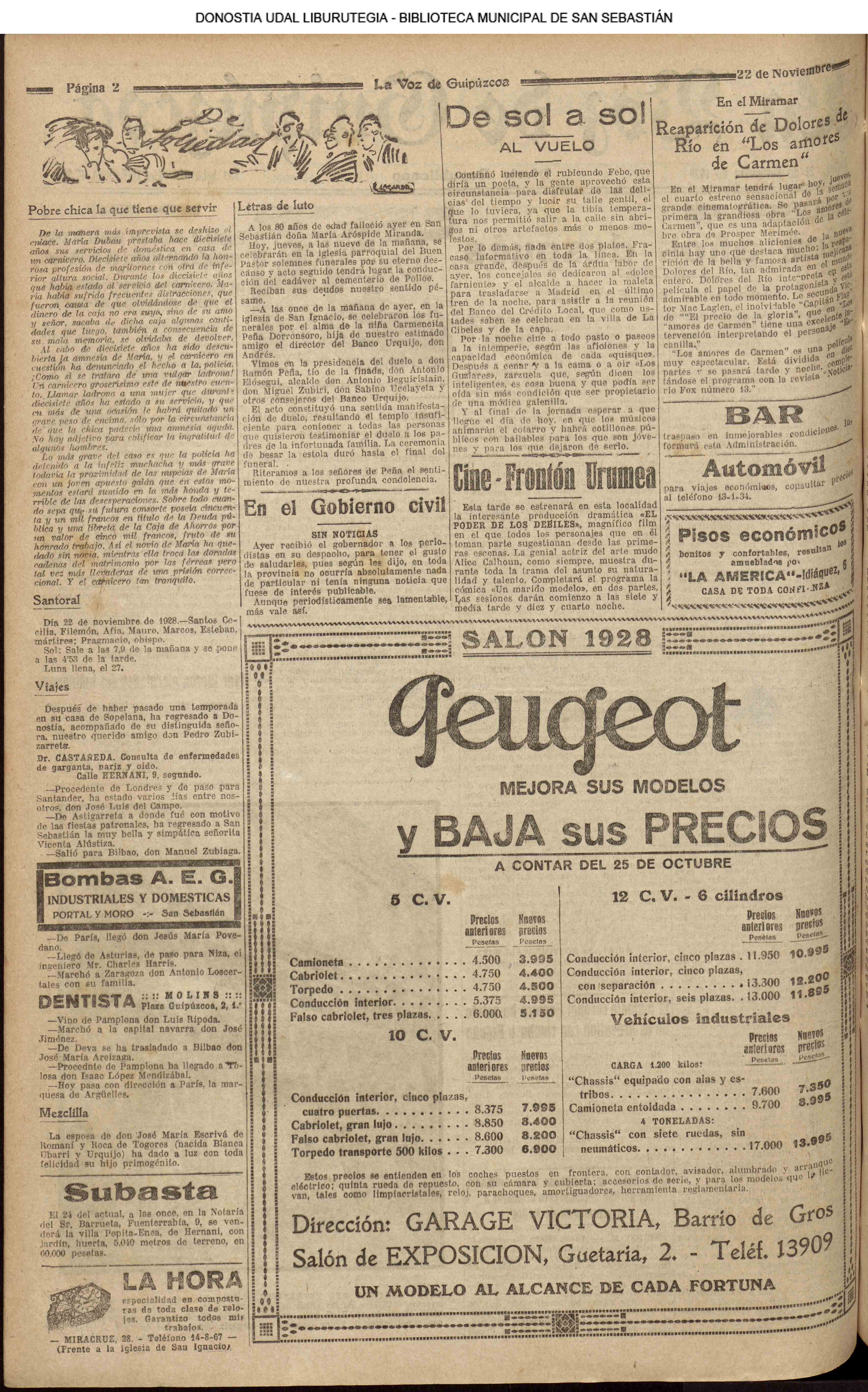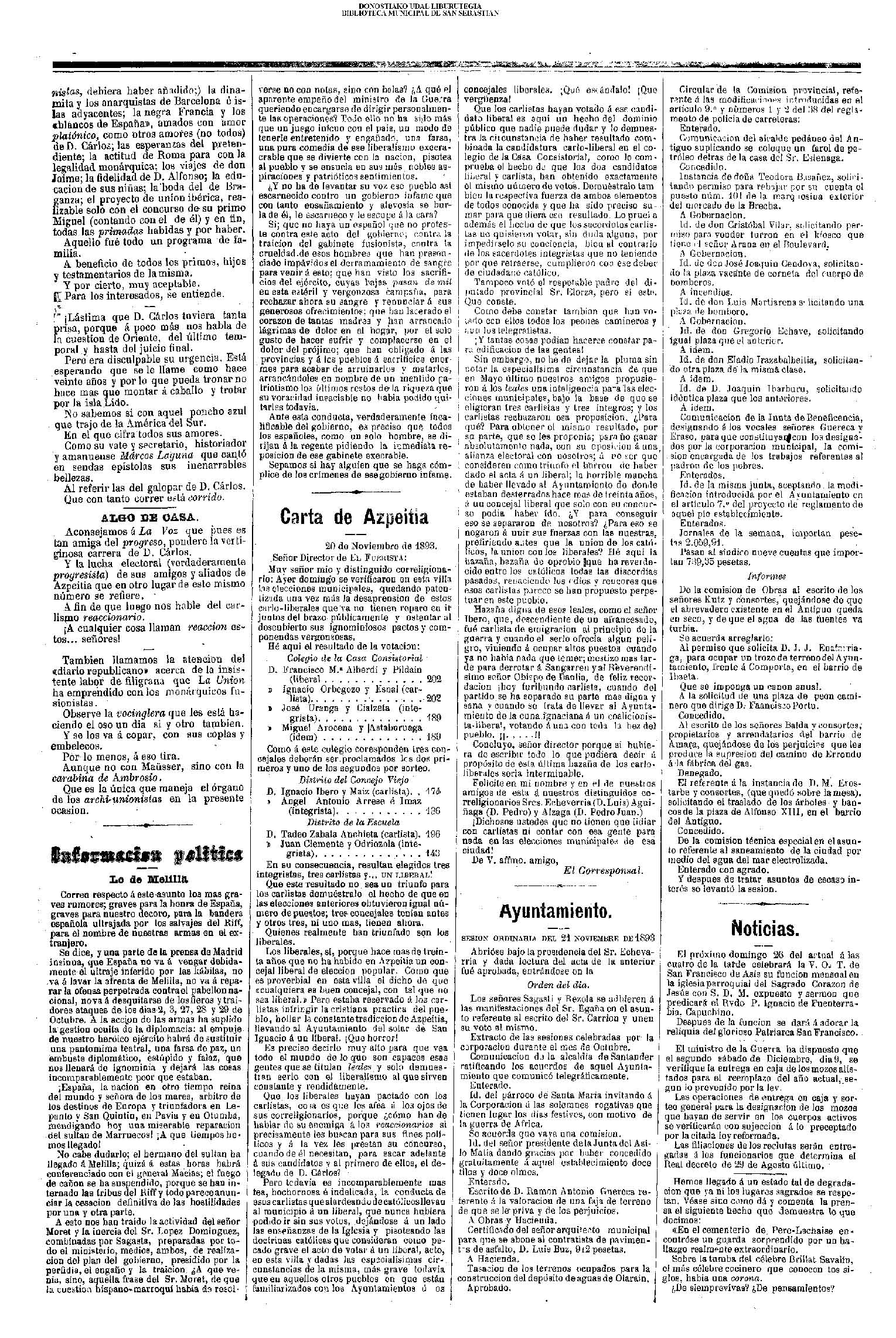 (1875) De doce y media à dos tocó en la Alameda la charanga del batallon de Estella y mas tarde ia del regimiento de Luchana en el paseo de Oquendo, que estuvo animado como hacia mucho tiempo no lo veíamos.. (Diario de San Sebastián) HERNANI 21 de Noviembre. - Como los demás dias festivos al toque de diana las baterías carlistas nos han saludado con algunas granadas, continuando sus hostilidades hasta la tarde. (......)(Diario de San Sebastián) .- Salieron de esta plaza en direccion á esa capital cuatro compañias del excelente ba tallon cazadores de Puerto Rico, y hoy à las ocho ha salido el resto de dicha fuerza con su digno jefe el toniente coronel Sr. Solano. Es-tos valientes cazadores han sido 73 dias nues-tros compañeros de armas, cúpoles su parte de sufrimiento en la voladúra de nuestro Con-sistorio, y han prestado excelentes servicios, dejando en esta villa grandes simpatías por su buen comportamiento. (Diario de San Sebastián) # El general Trillo con su estado mayor, ayu-dantes y escolta dió un paseo militar á Igueldo despues de la misa del cuartel general, regresando de su expedicion á las tres y media de la tarde. - Ha venido en su reemplazo entre nosotros el batallon reserva de Huesca. # A las cuatro y media de la tarde llegó el vapor-correo de Santander conduciendo la correspondencia general de la peninsula. (Diario de San Sebastián) Una musica de paisanos, compuesta de ele-mentos de la antigua Euterpe, y las actuales charangas de Voluntarios, tocó anoche en los arcos del Consistorio en celebracion de la fes-tividad de su patrona Santa Cecilia, (Diario de San Sebastián) |