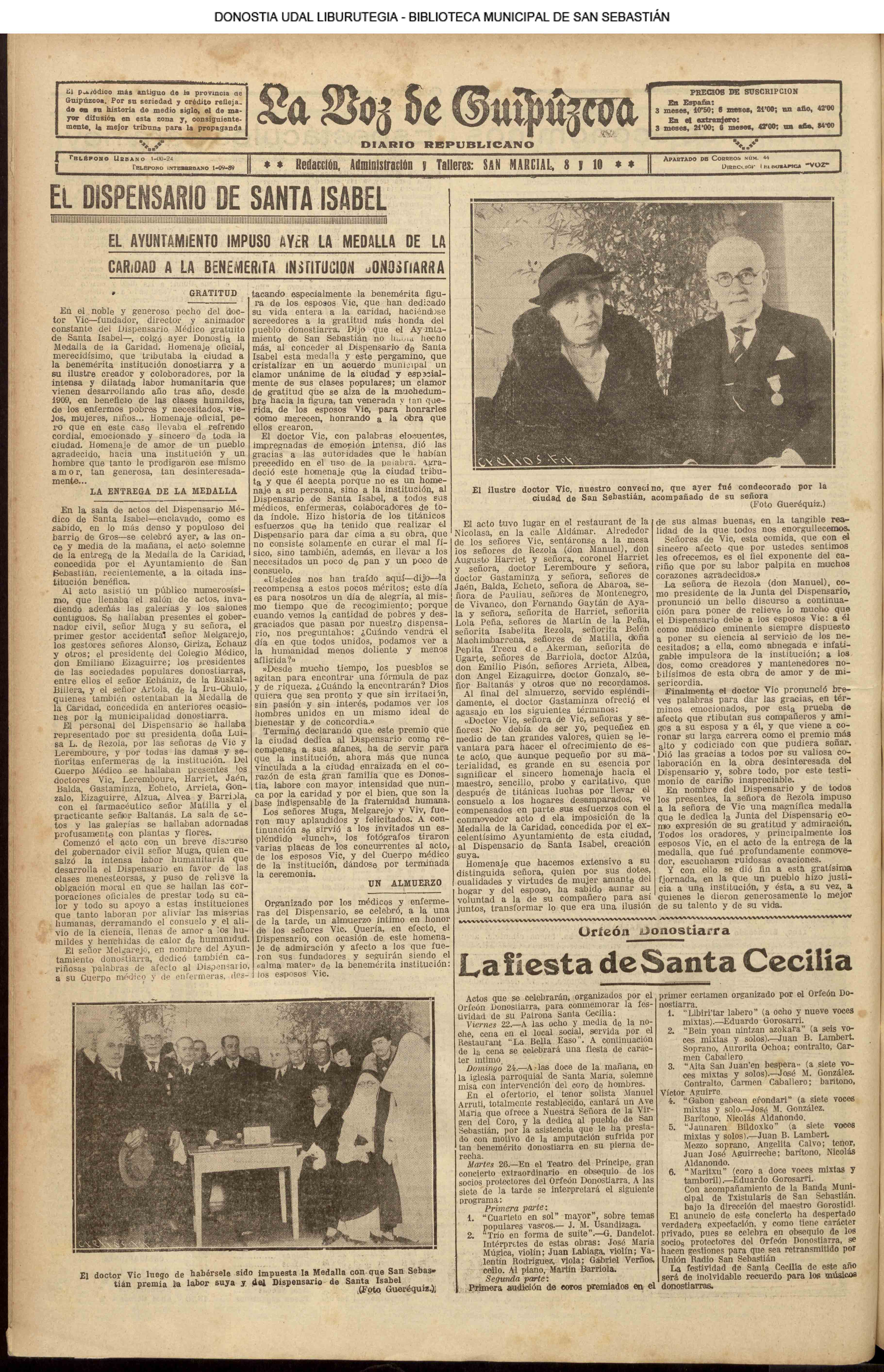 (1874) Con motivo de la víspera de Santa Cecilia, tocaron La Euterpe y los músicos de los Voluntarios; la primera en la Plaza de la Constitució y la seguna en la Alameda. - Tambien la orquestilla ha recorrido las caIles de madrugada, tocando una escogida sé-rie de piezas. (Diario de San Sebastián) |
