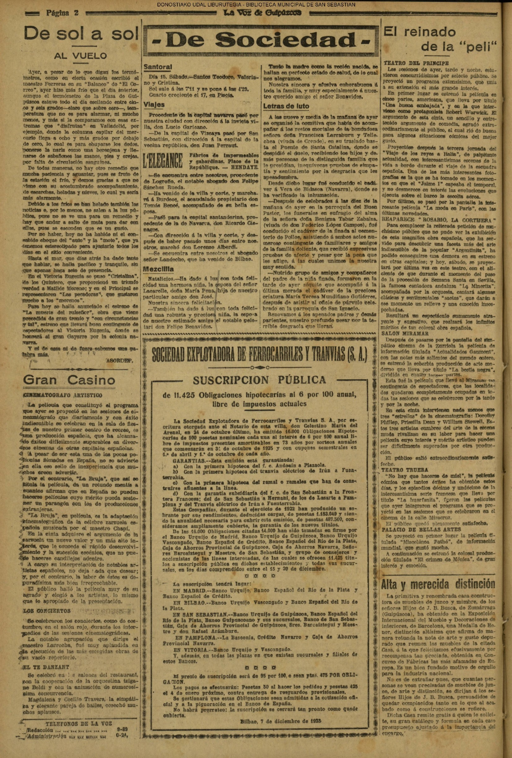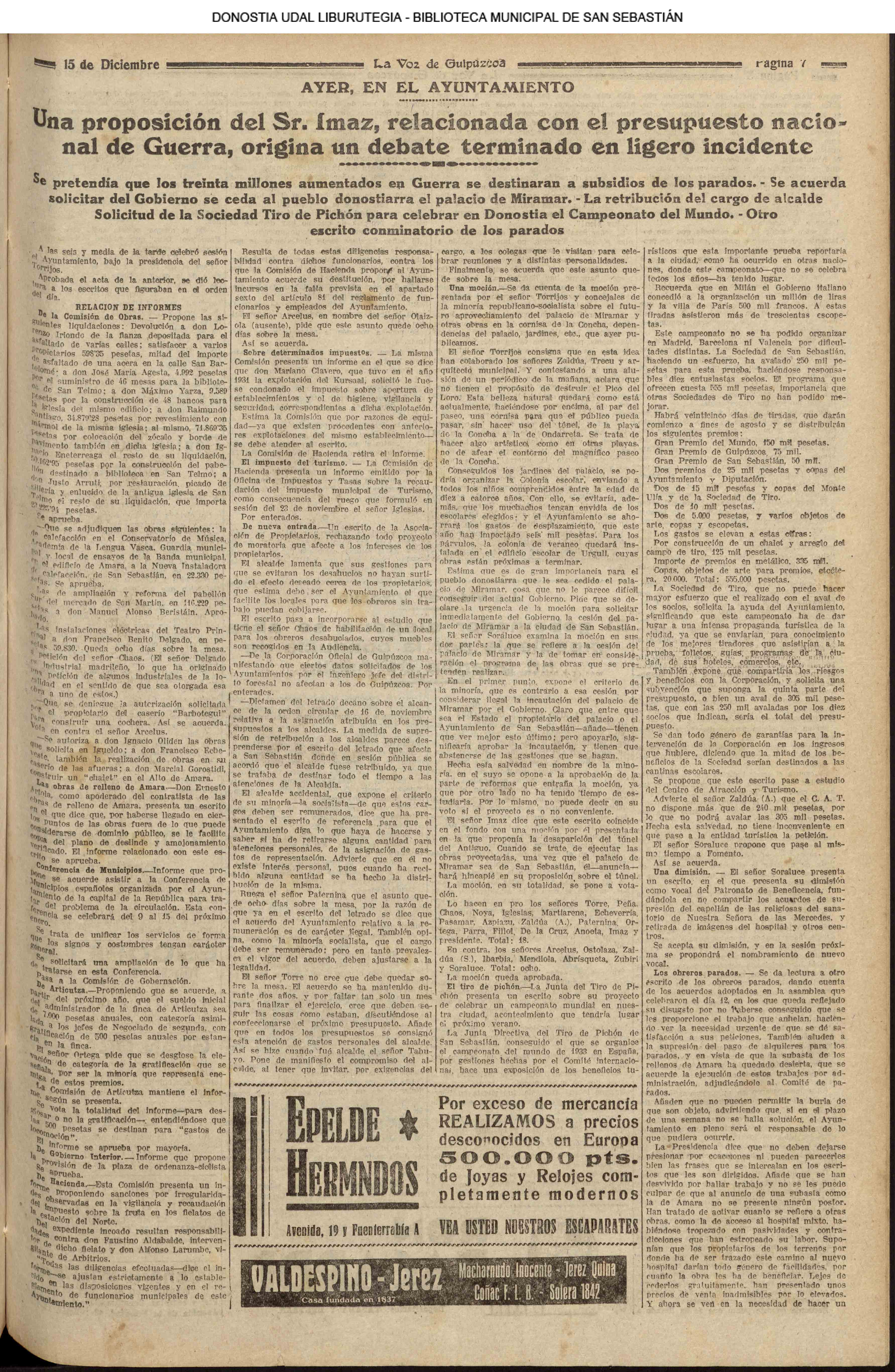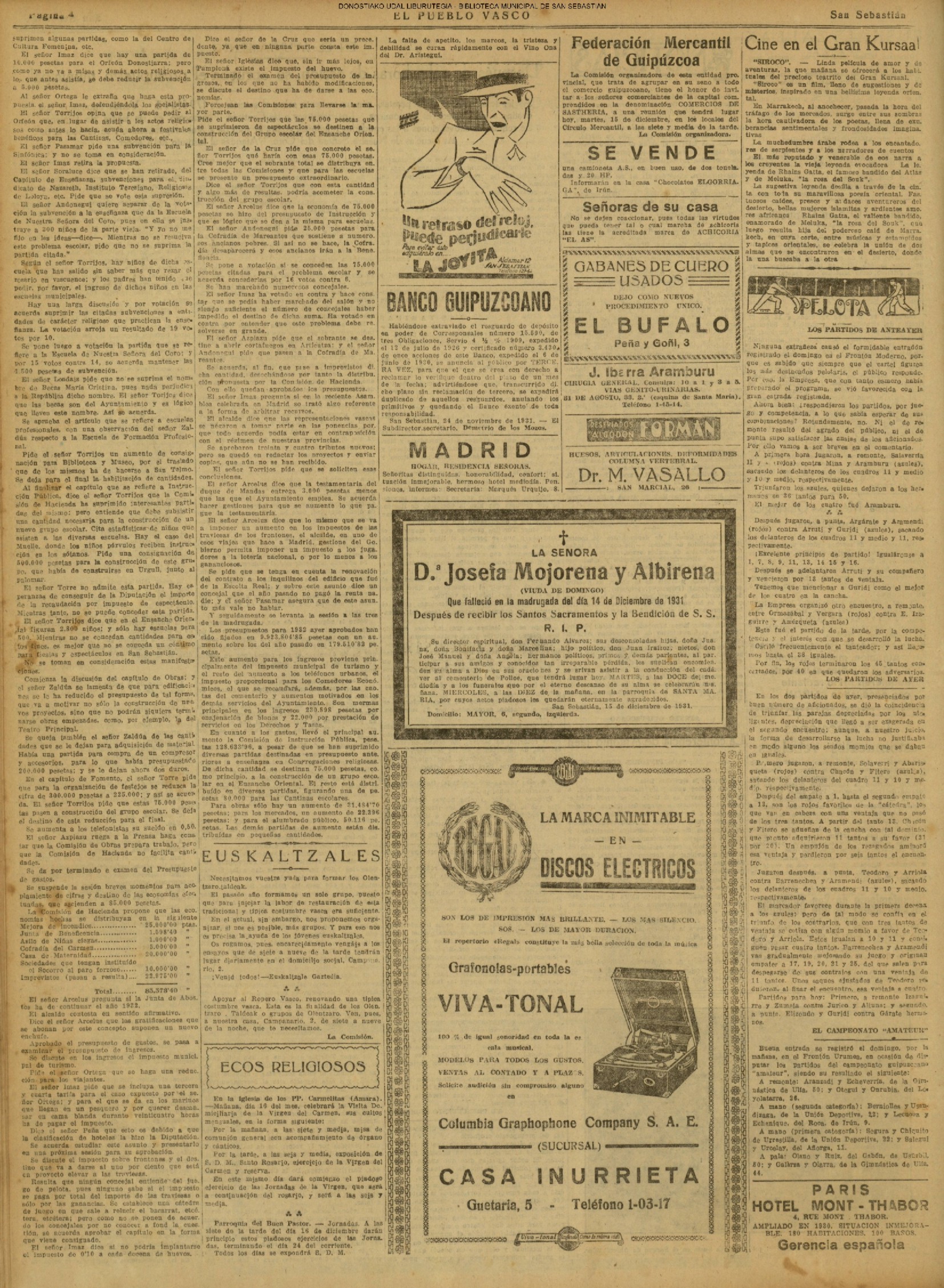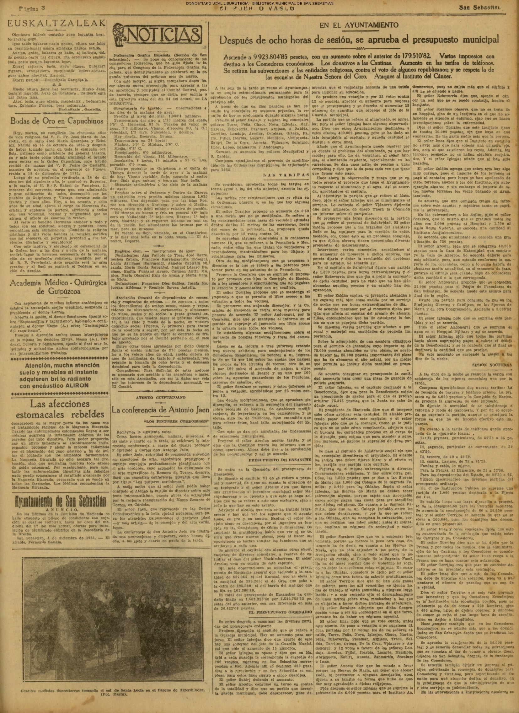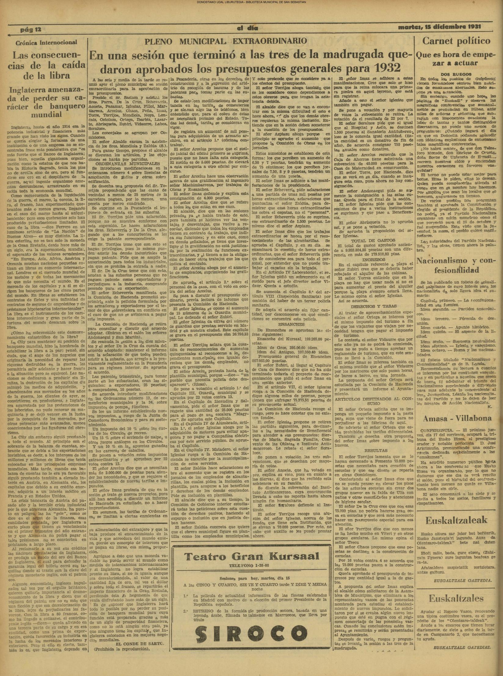 (La Voz de Guipúzcoa)(El Pueblo Vasco)(La Constancia)(1914) PLENO EXTRAORDINARIO .Es aprobado el presupuesto municipal para 1.915: 3.983. 574, 97 pesetas.