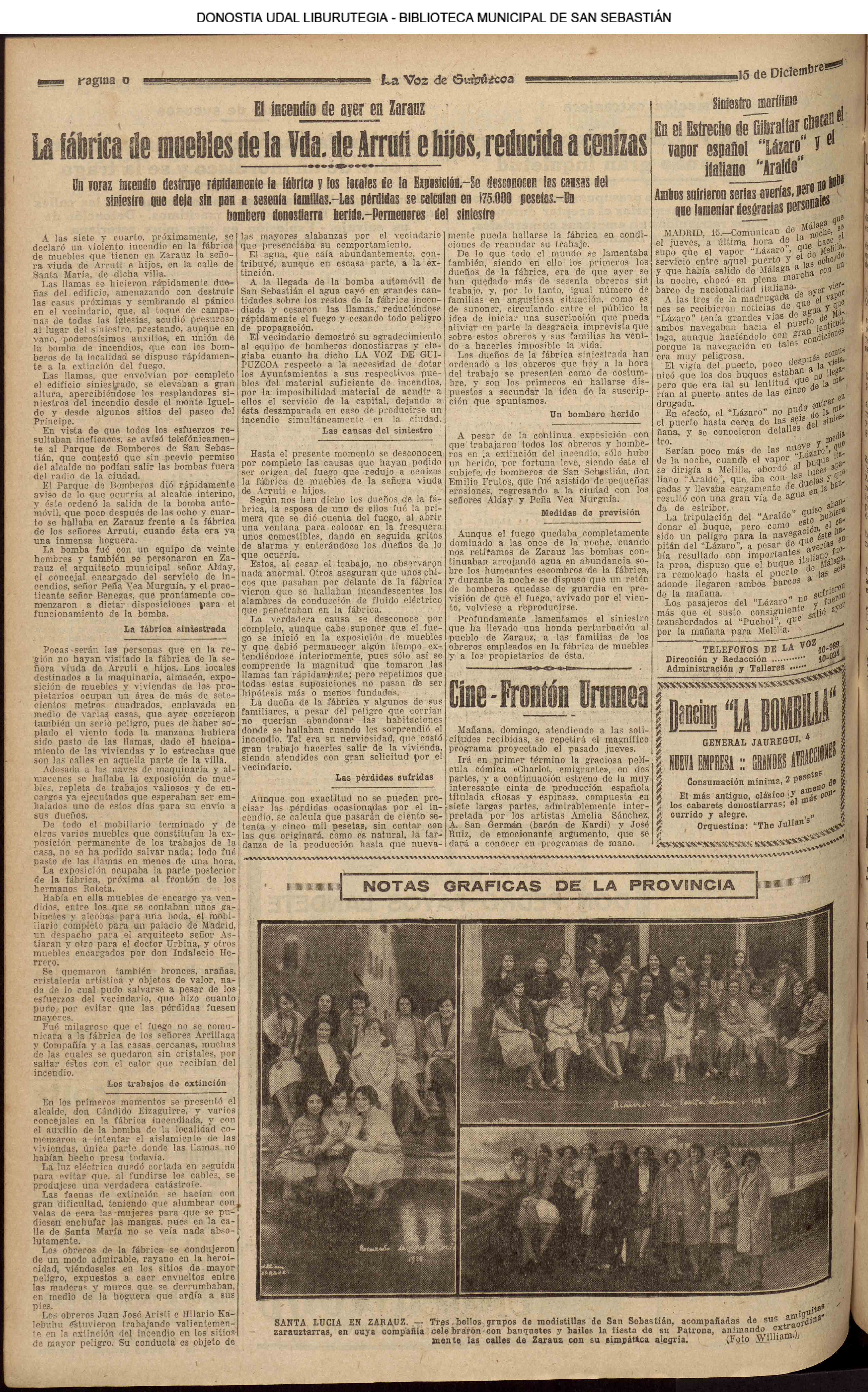 # INCENDIO EN ZARAUZ .- La fábrica de Muebles de la Vda. de Arruti e hijos, reducida a cenizas