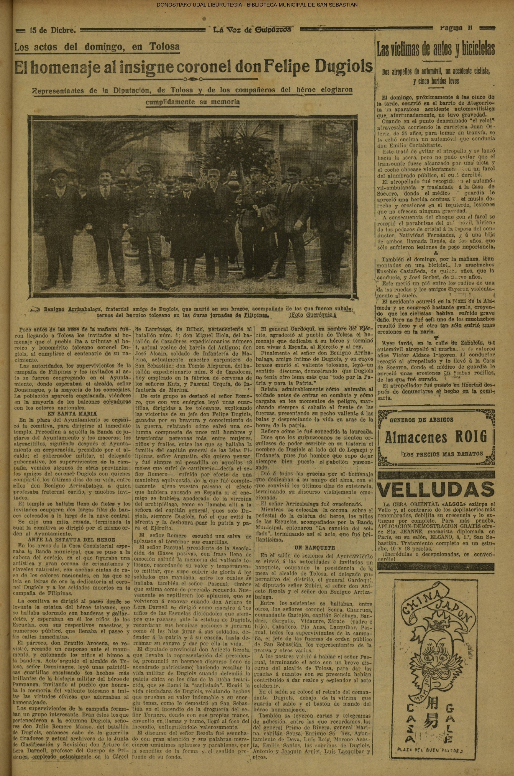 # EN TOLOSA, homenaje al insigne coronel D. Felipe Dugiols