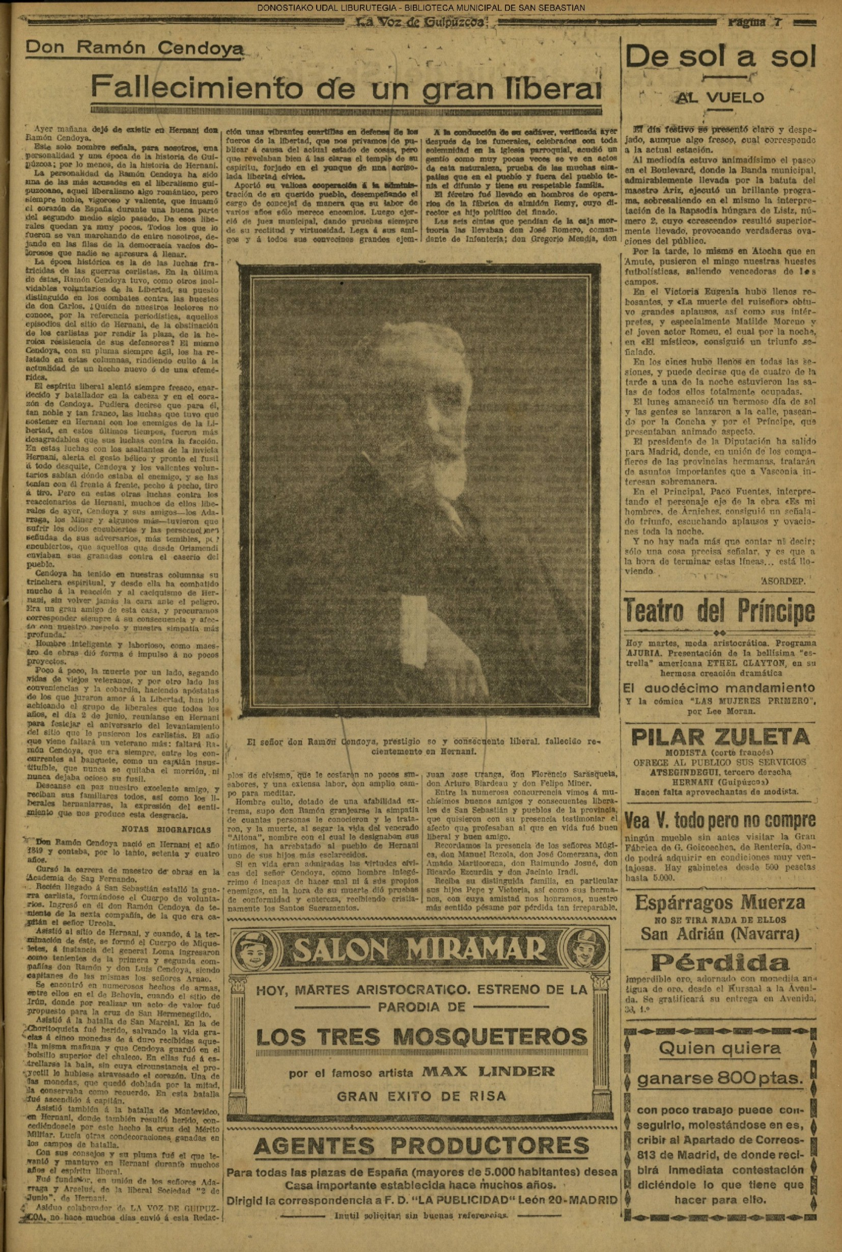 (1923) FALLECE, en Hernani, don Ramón Cendoya. Un gran liberal