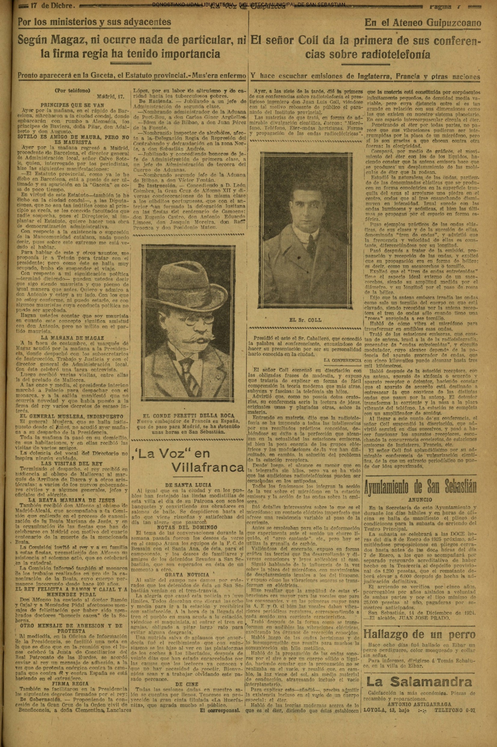 (1924 )CONFERENCIA EN EL ATENEO GUIPUZCOANO - El señor Coll da la primera de sus conferencias sobre radiotelefonía