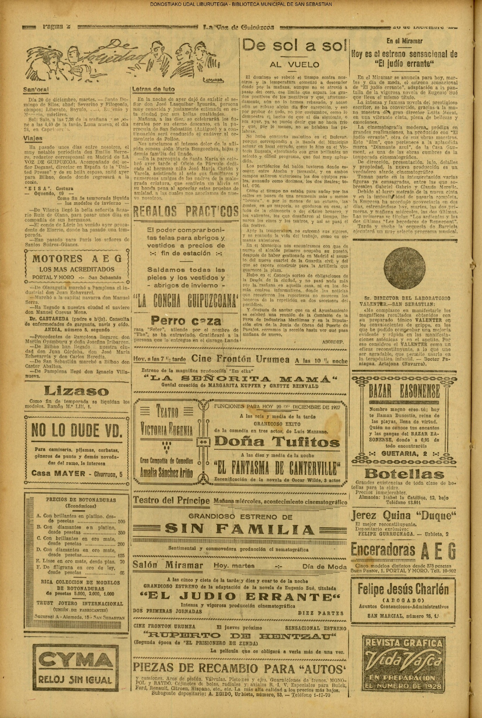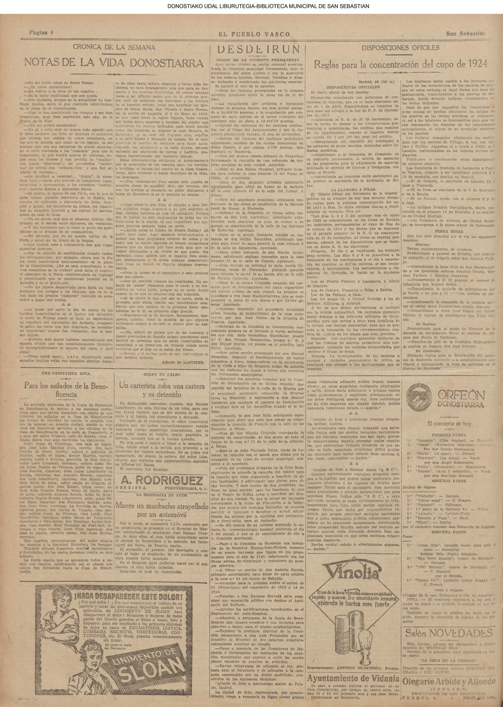 (1924) Esta tarde, en la carretera de Ategorrieta, un auto atropella, produciéndole mortales heridas, a Manuel Uranga Iribas, hijo de 12 años del conocido cochero del mismo nombre y domiciliado con sus padres en la plaza del Buen Pastor n.°6 .