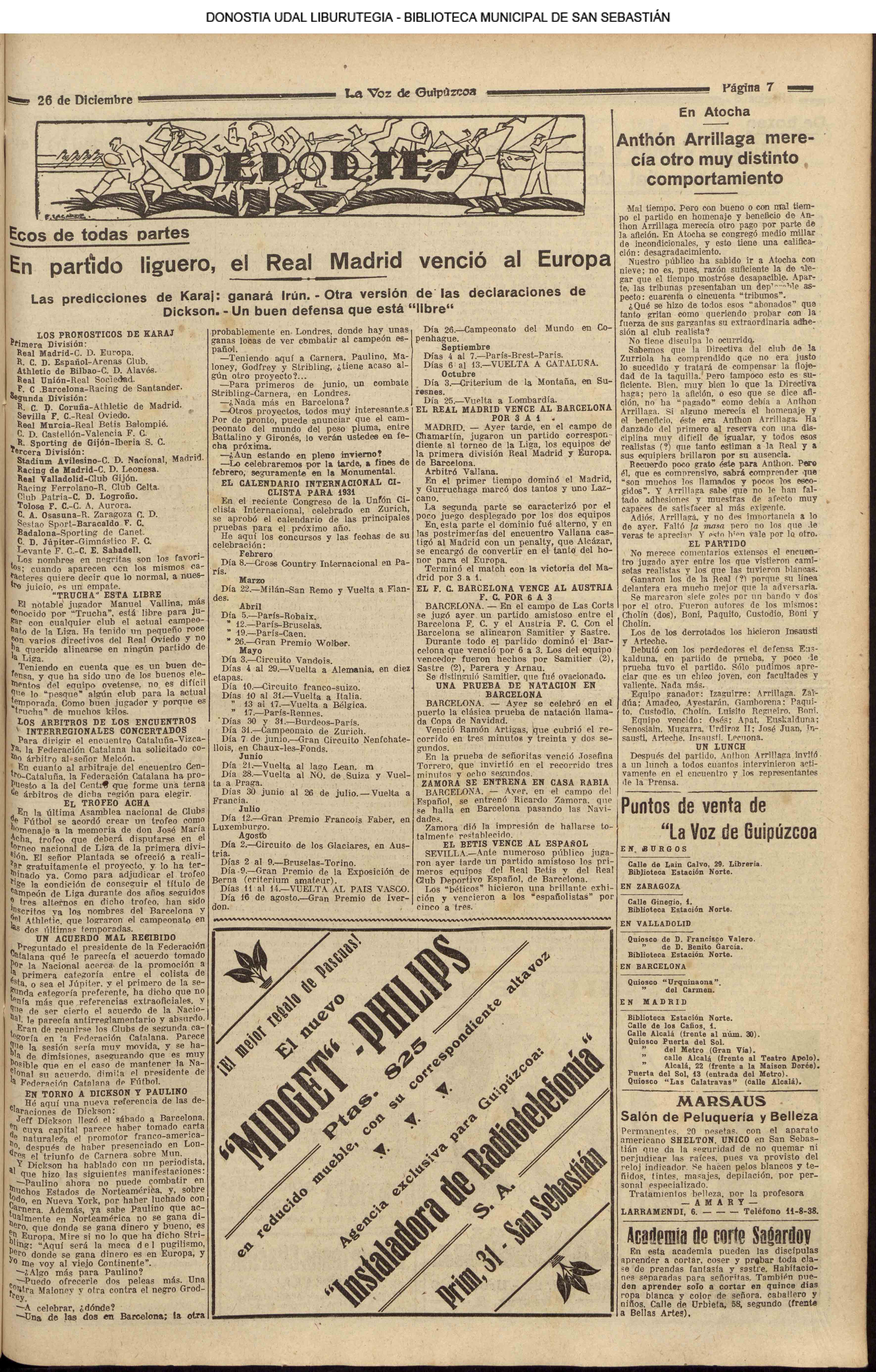 (La Voz de Guipúzcoa)(El Pueblo Vasco)(El Pais Vasco)(La Constancia)(1930) Hizo mal tiempo; pero, a pesar de ello, la cosa no tenía disculpa. En el partido de homenaje, despedida y beneficio a Anthon Arrillaga sólo habría unas 500 personas. La Rea! ganó ampliamente (7-2) a Osasuna.(La Voz de Guipuzcoa)