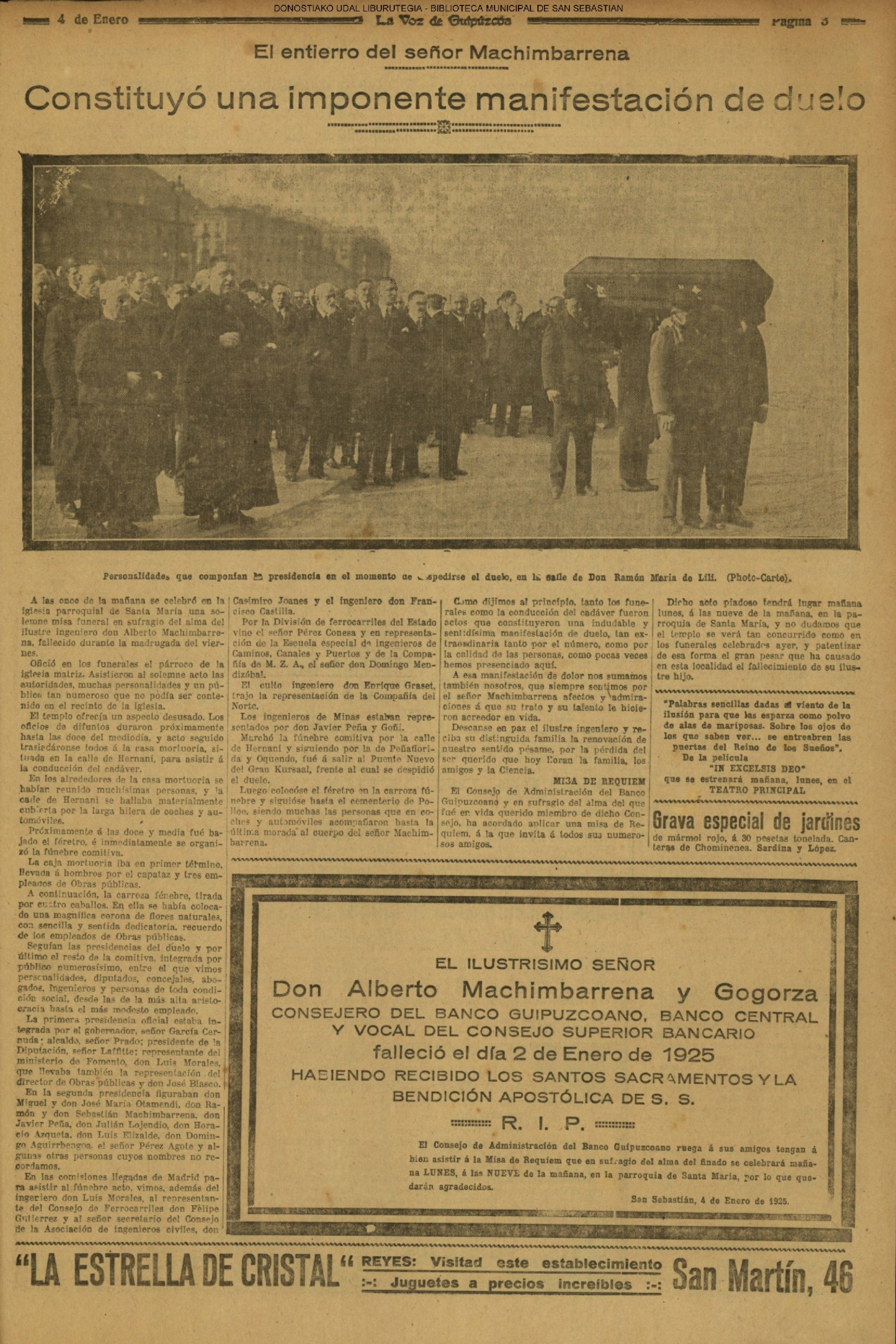 (1925) SOLEMNE FUNERAL, EN SANTA MARÍA, POR EL ALMA DEL INGENIERO D. ALBERTO MACHIMBARRENA