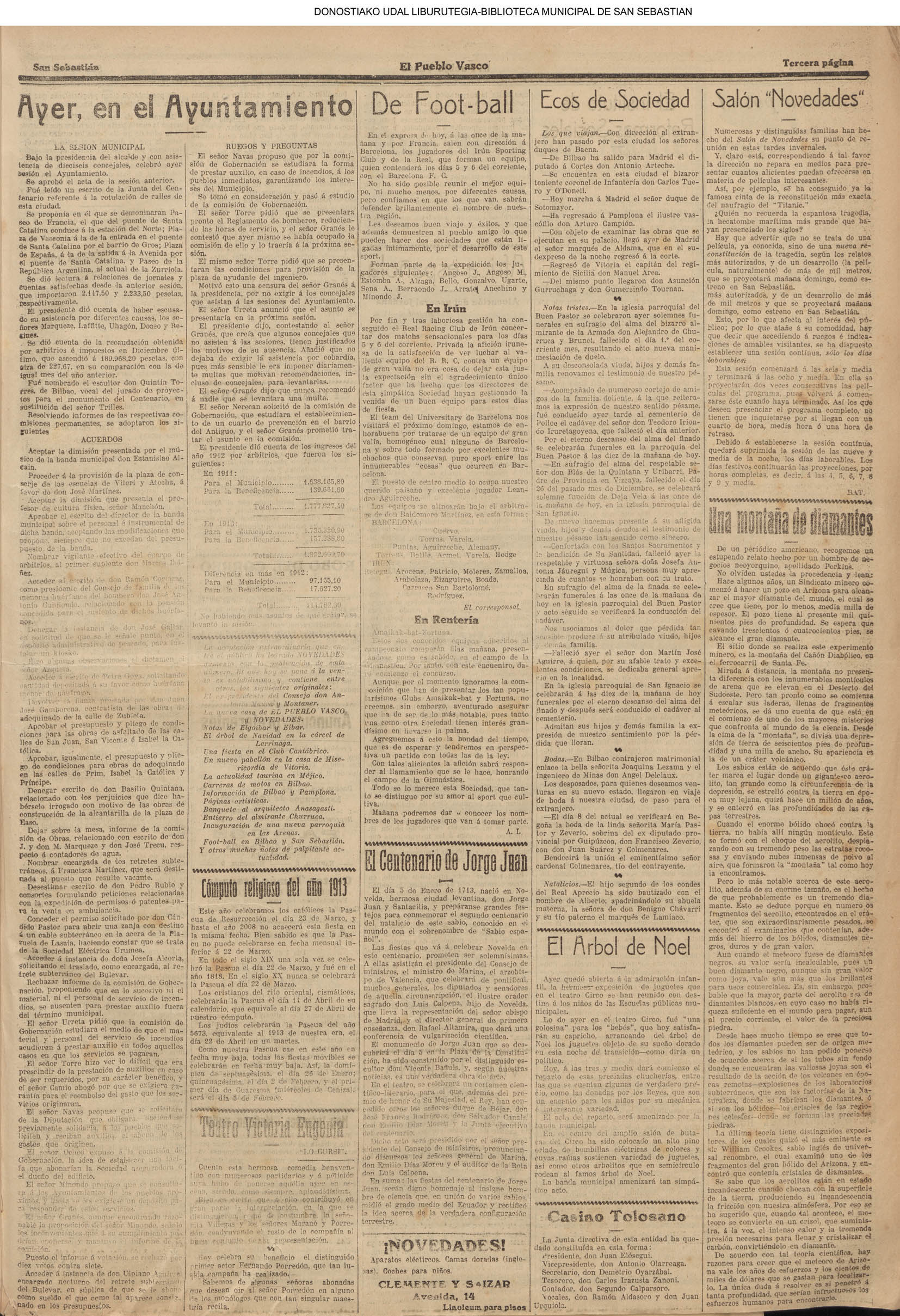 (1913) PLENO MUNICIPAL - A propuesta de la Junta del Centenario, sobre rotulación de calles, se aprueba que a la calle que se dirige desde la Estación del Norte hacia el puente de Santa Catalina se denomine "Paseo de Francia", a la plaza que se ha construido entre la calle Miracruz y el puente de Santa Catalina, "Plaza de Vasconia"; a la Plaza Elíptica que está entre el Paseo de Guernica y el de la Zurriola, "Plaza de España" y al Paseo de la Zurriola "Paseo de la República Argentina"
