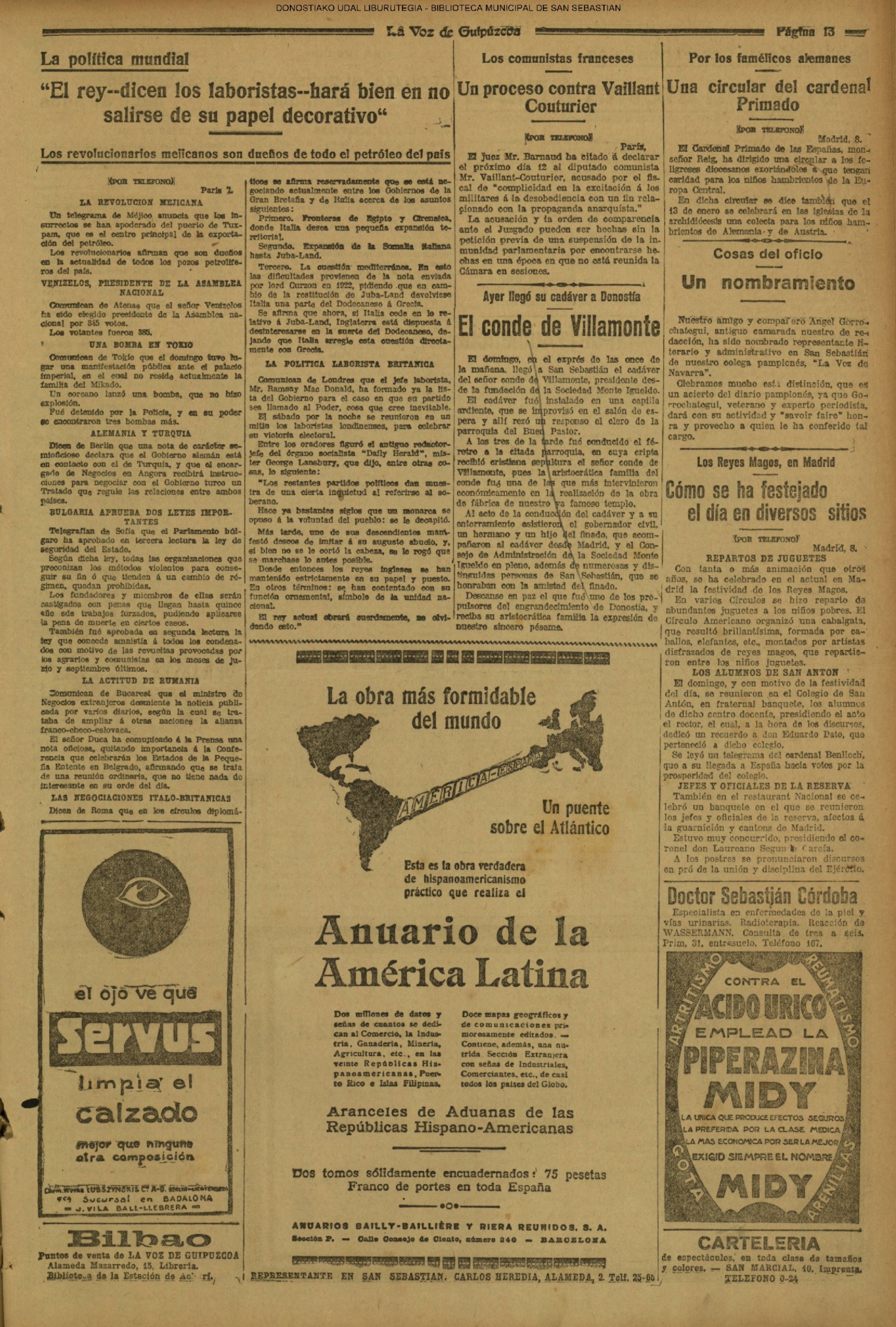 # Esta mañana, en el exprés, llega el cadáver del Conde de Villamonte —presidente de la Sociedad Monte Igueldo, desde la fundación de la misma— para ser inhumado en la cripta del Buen Pastor. El Conde había fallecido en Madrid dos días antes. (Sabido es que los Villamonte fueron de quienes más intervinieron económicamente en la realización de la obra de fábrica de nuestra actual Catedral).