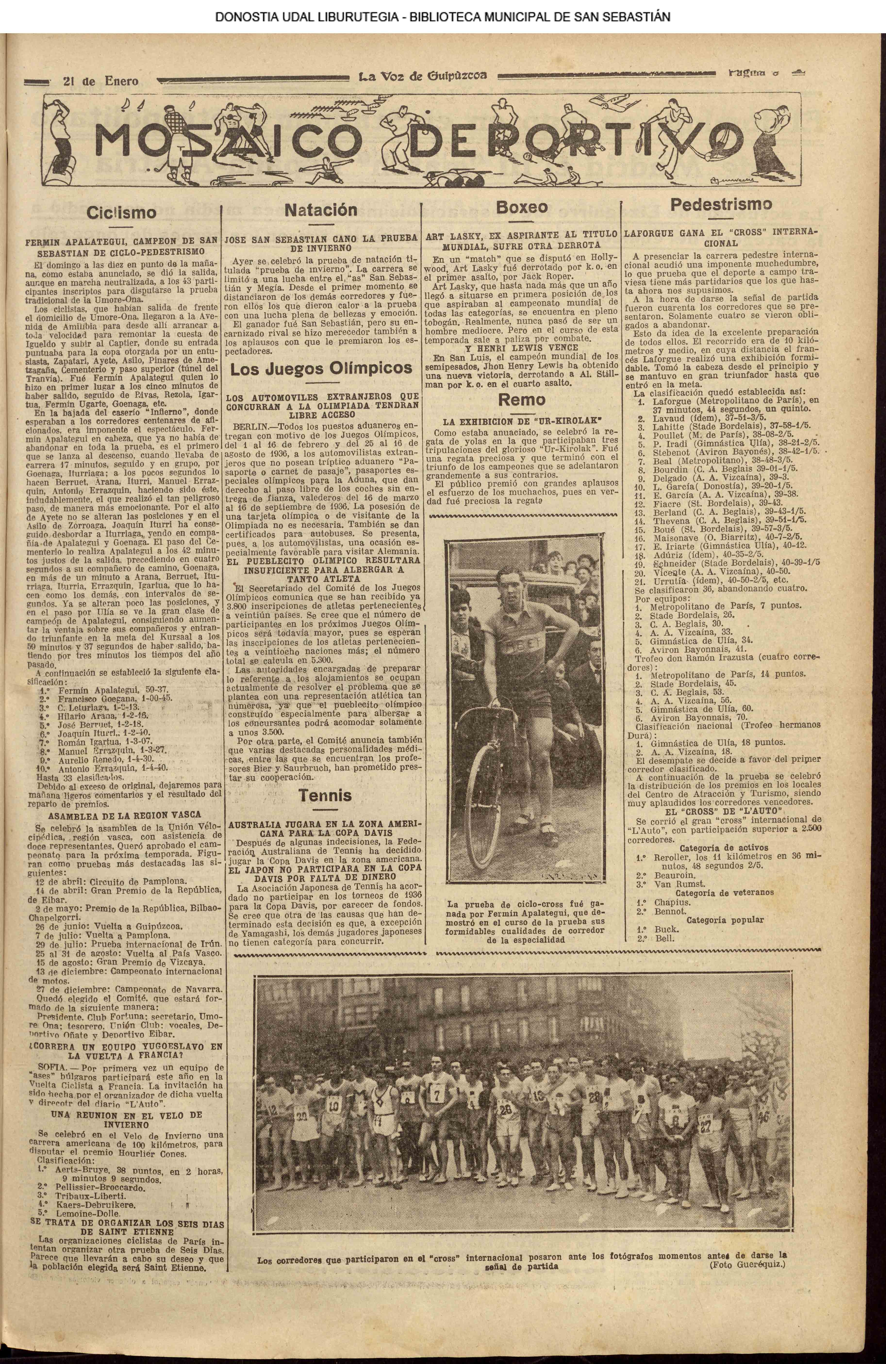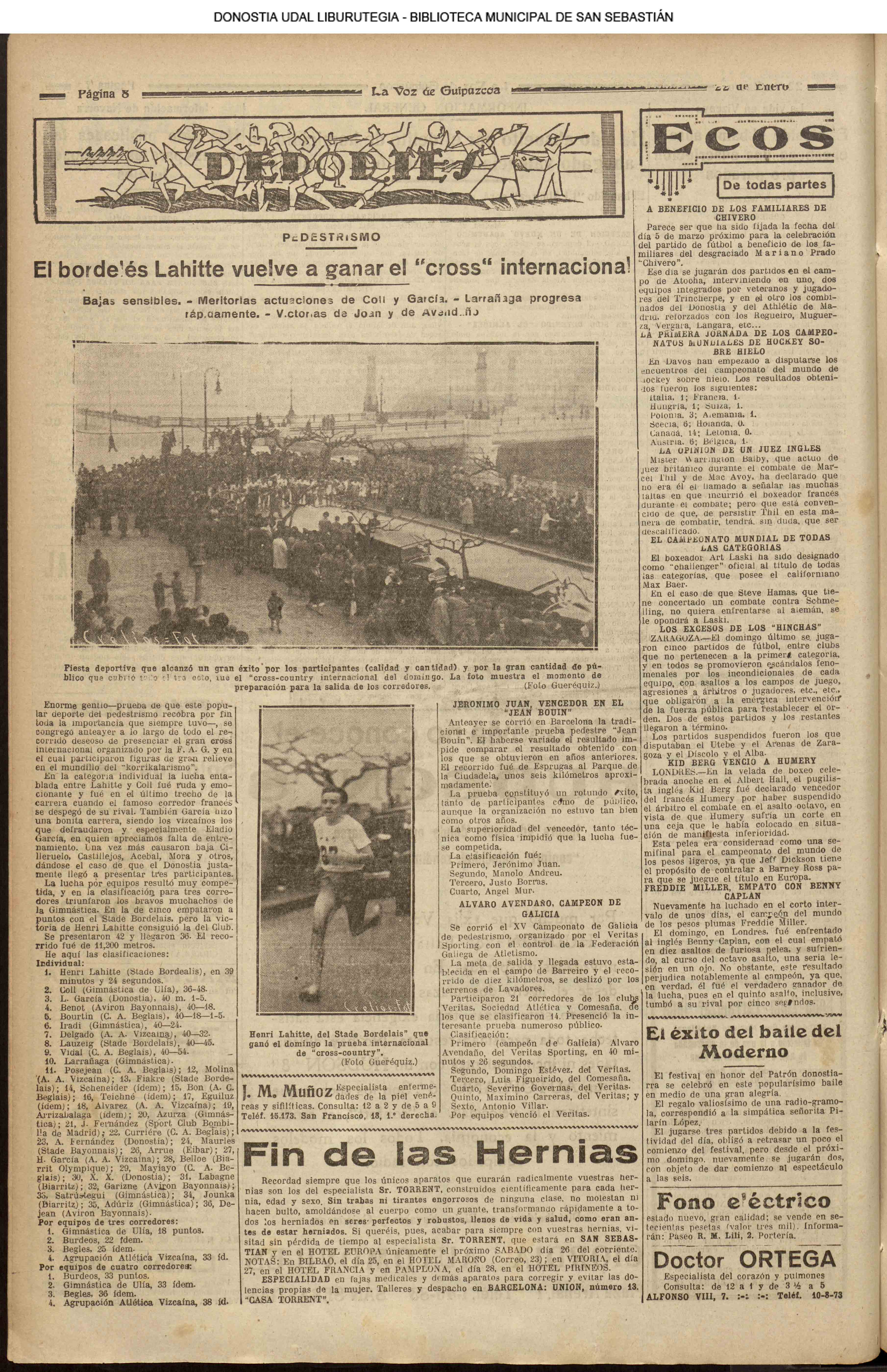 (1936) Se celebra un "cross " internacional, ( gana el francés Laforgue. (El primer español, P. Iradi de la Gimnástica de Ulía, llega el quinto).(La Voz de Guipúzcoa)