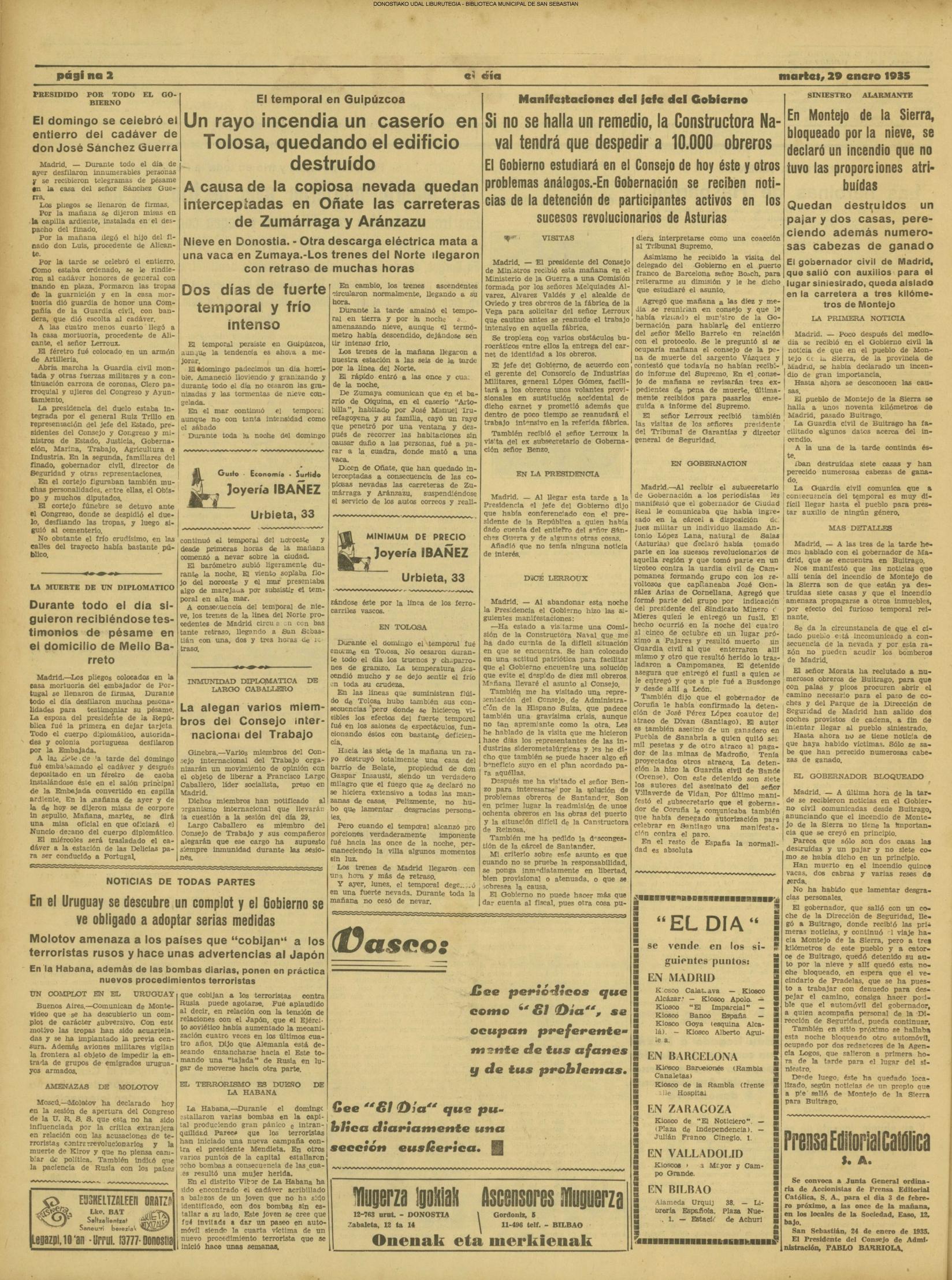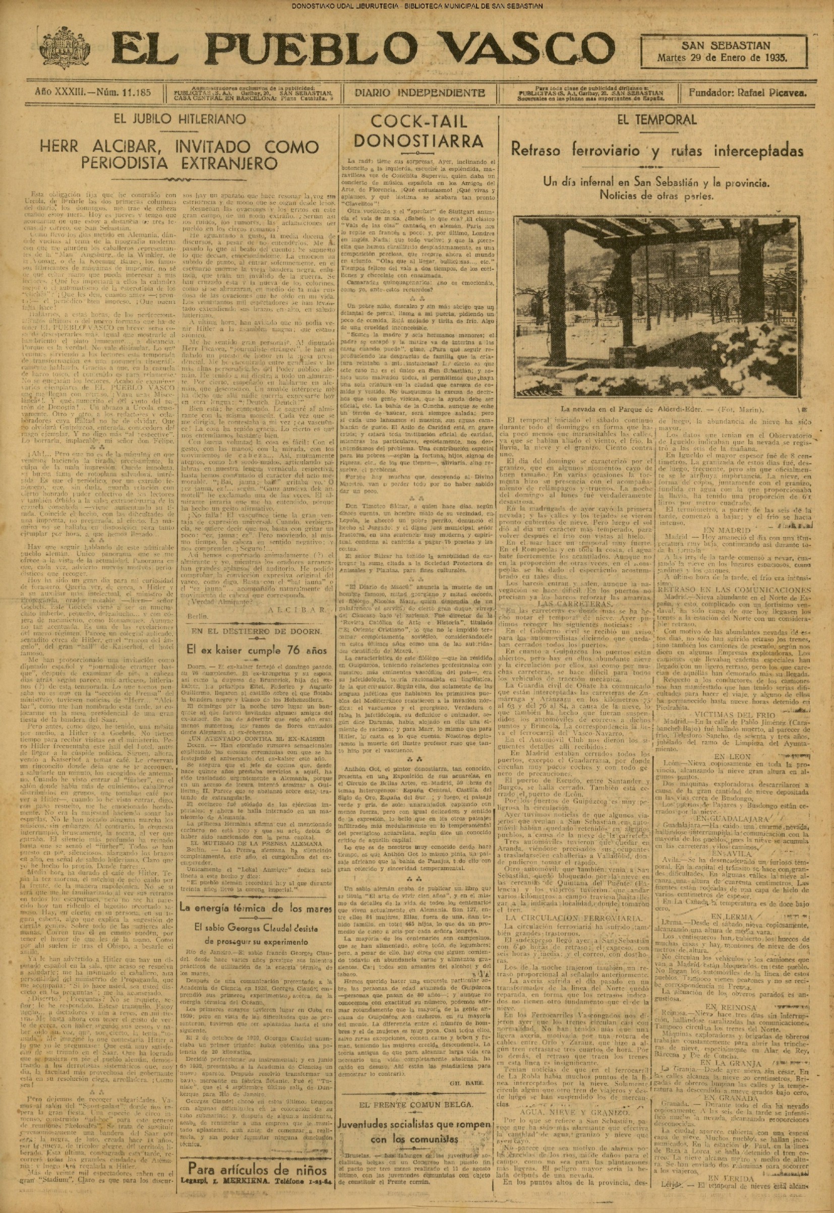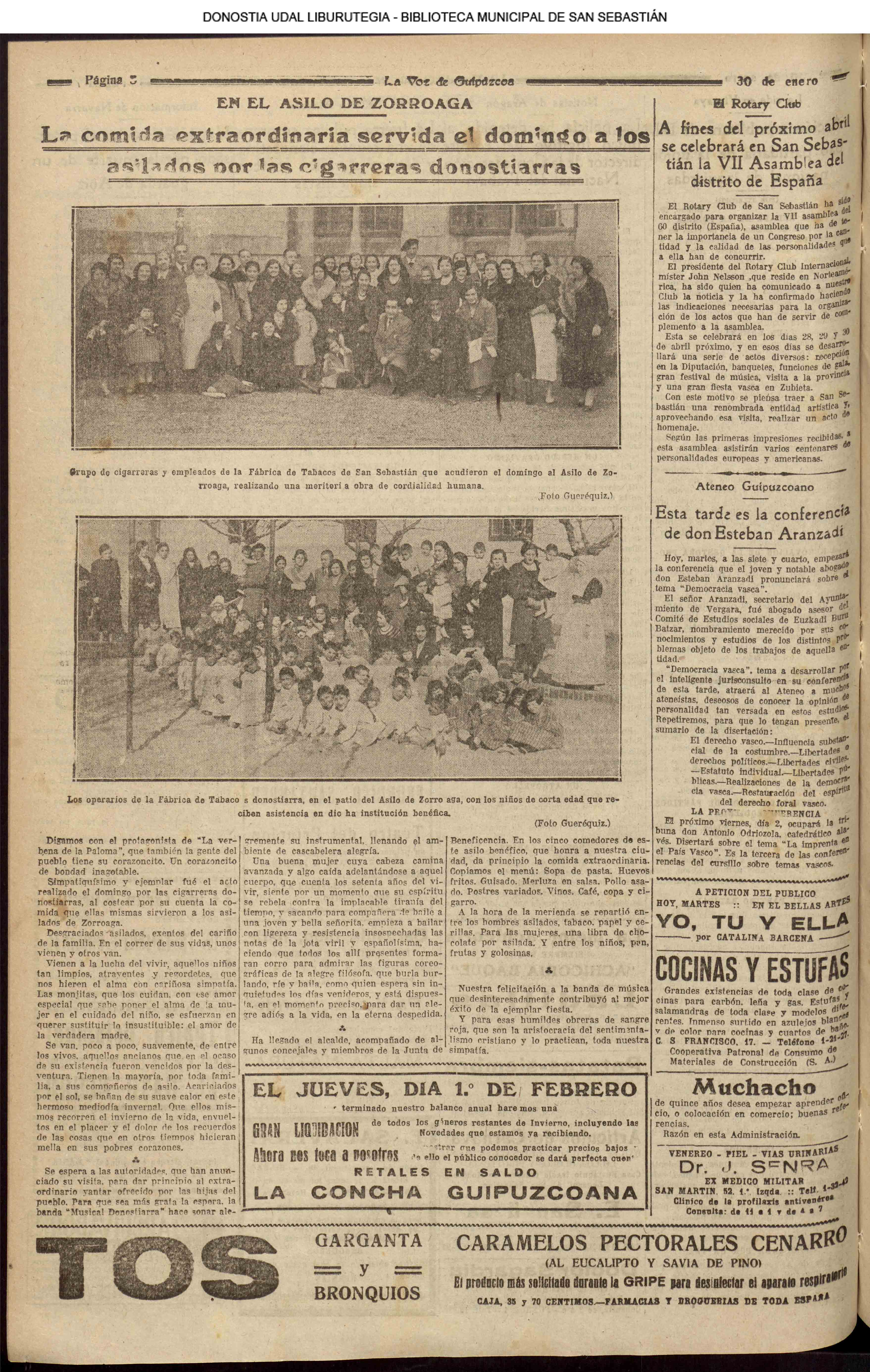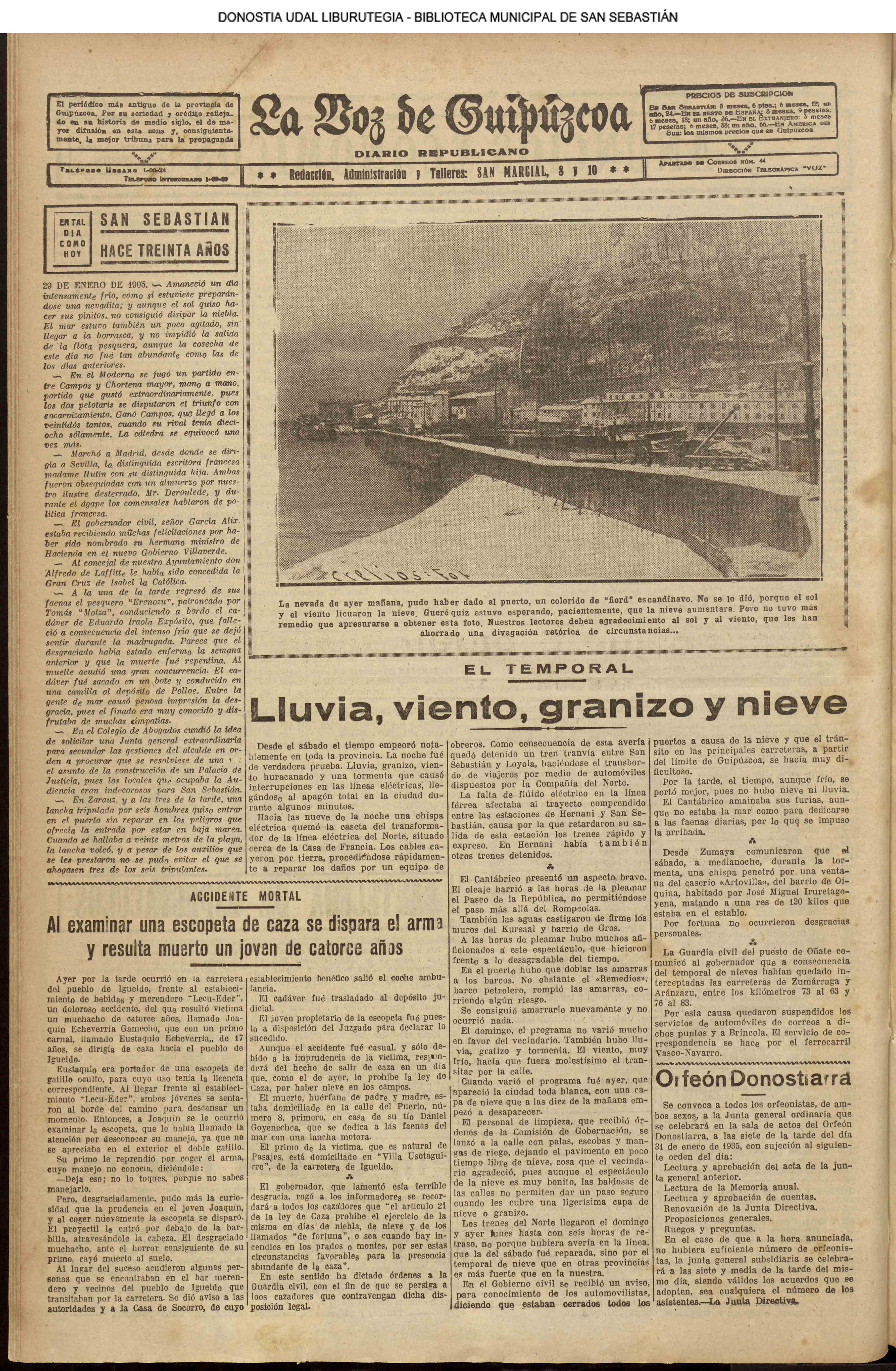 (La Voz de Guipúzcoa/cont)(El Pueblo Vasco/cont)(El Pais Vasco)(La Constancia) (1932) SESIÓN DE LA DIPUTACIÓN (La Voz de Guipúzcoa)(El Pueblo Vasco)(El Día)(La Constancia) (1934) ASILO DE ZORROAGA - Comida extraordinaria servida a los asilados por las cigarreras donostiarras (La Voz de Guipúzcoa)(El Pueblo Vasco)(El Día)(La Constancia) # VALENCIA (4-1) DONOSTIA (La Voz de Guipúzcoa)(El Pueblo Vasco)(El Día)(La Constancia) (1935) TEMPORAL DE LLUVIA, VIENTO, GRANIZO Y NIEVE (fotorreportaje) (La Voz de Guipúzcoa)(El Pueblo Vasco)(El Día/foto)(La Constancia)