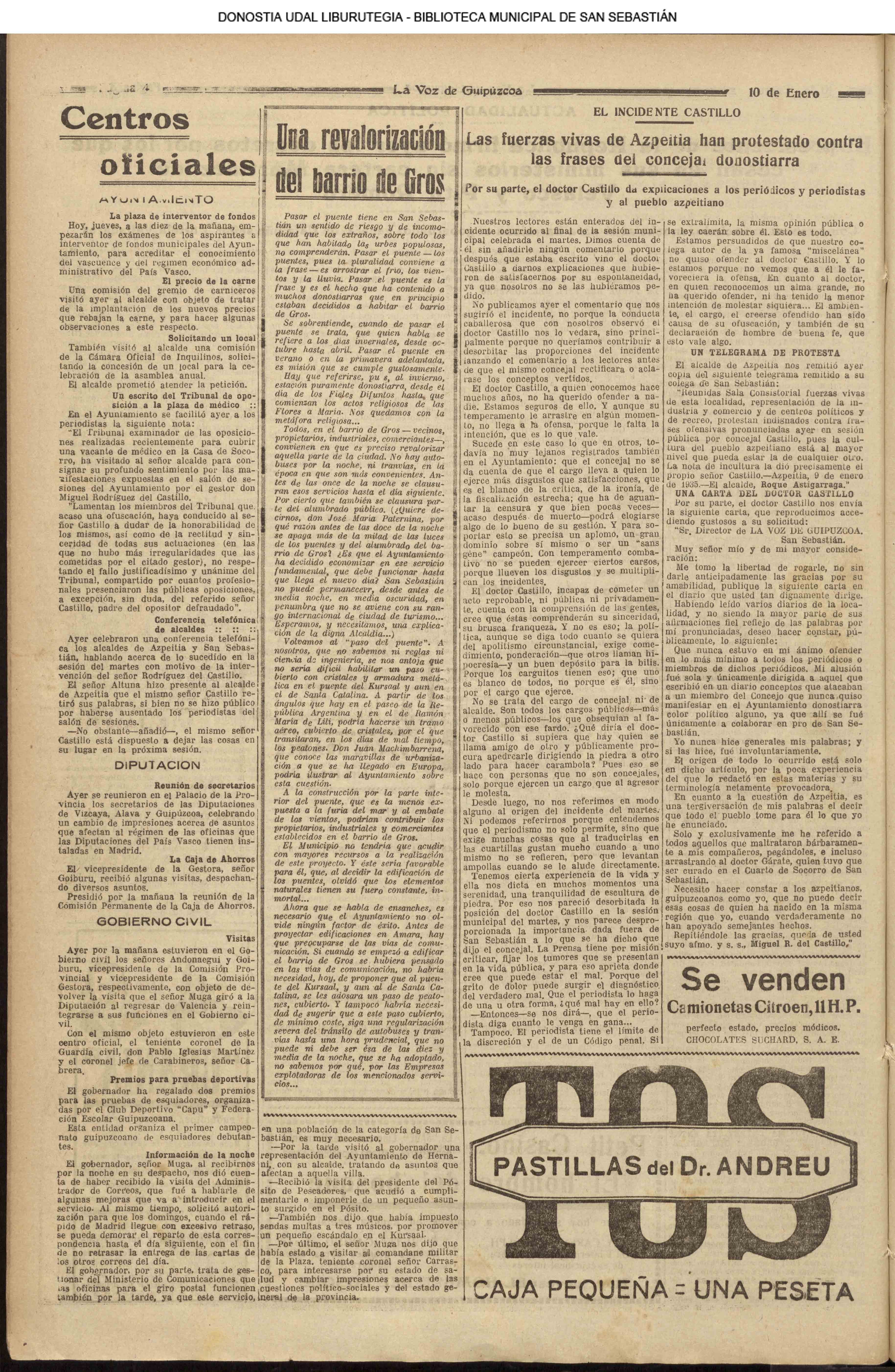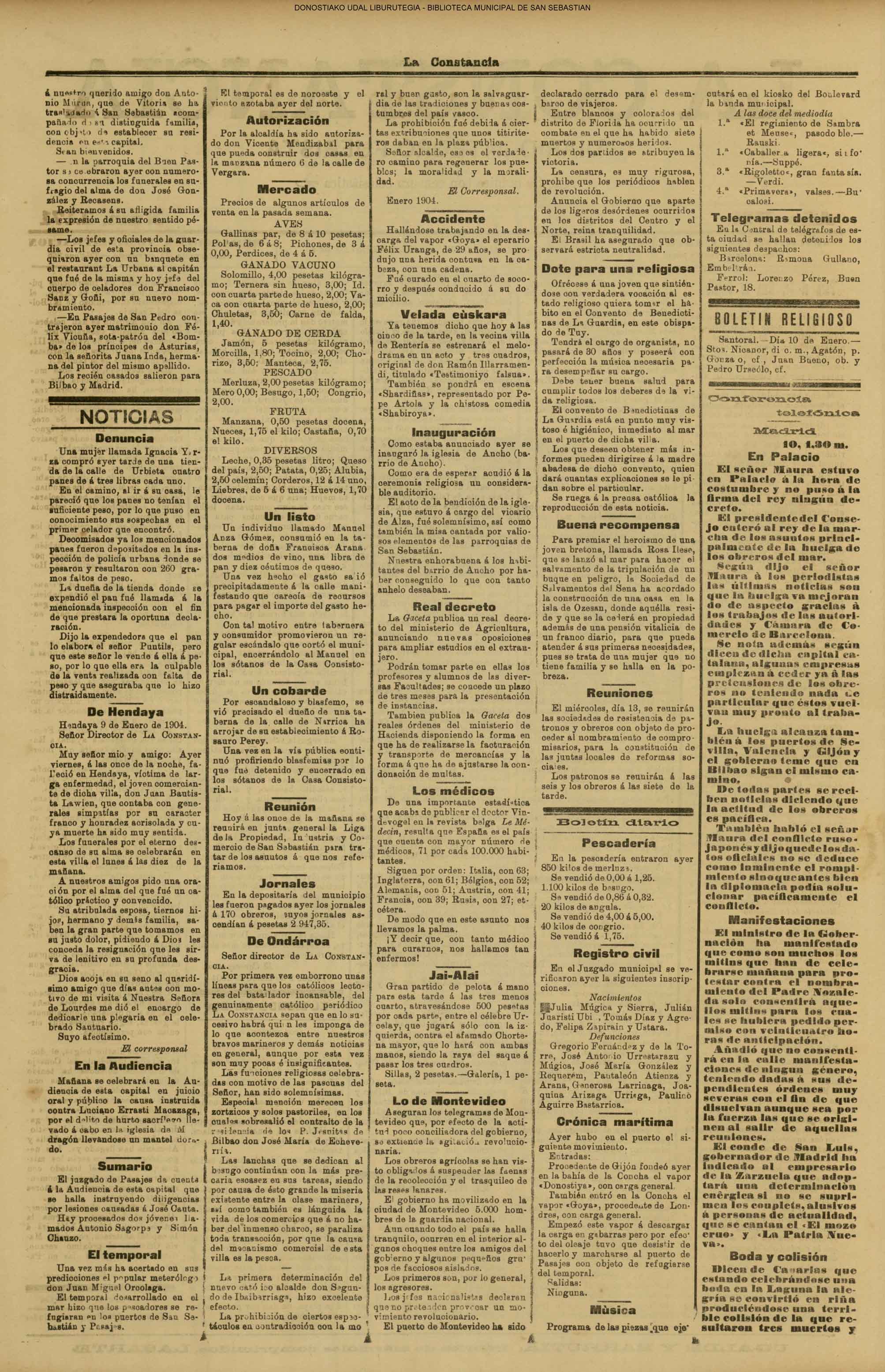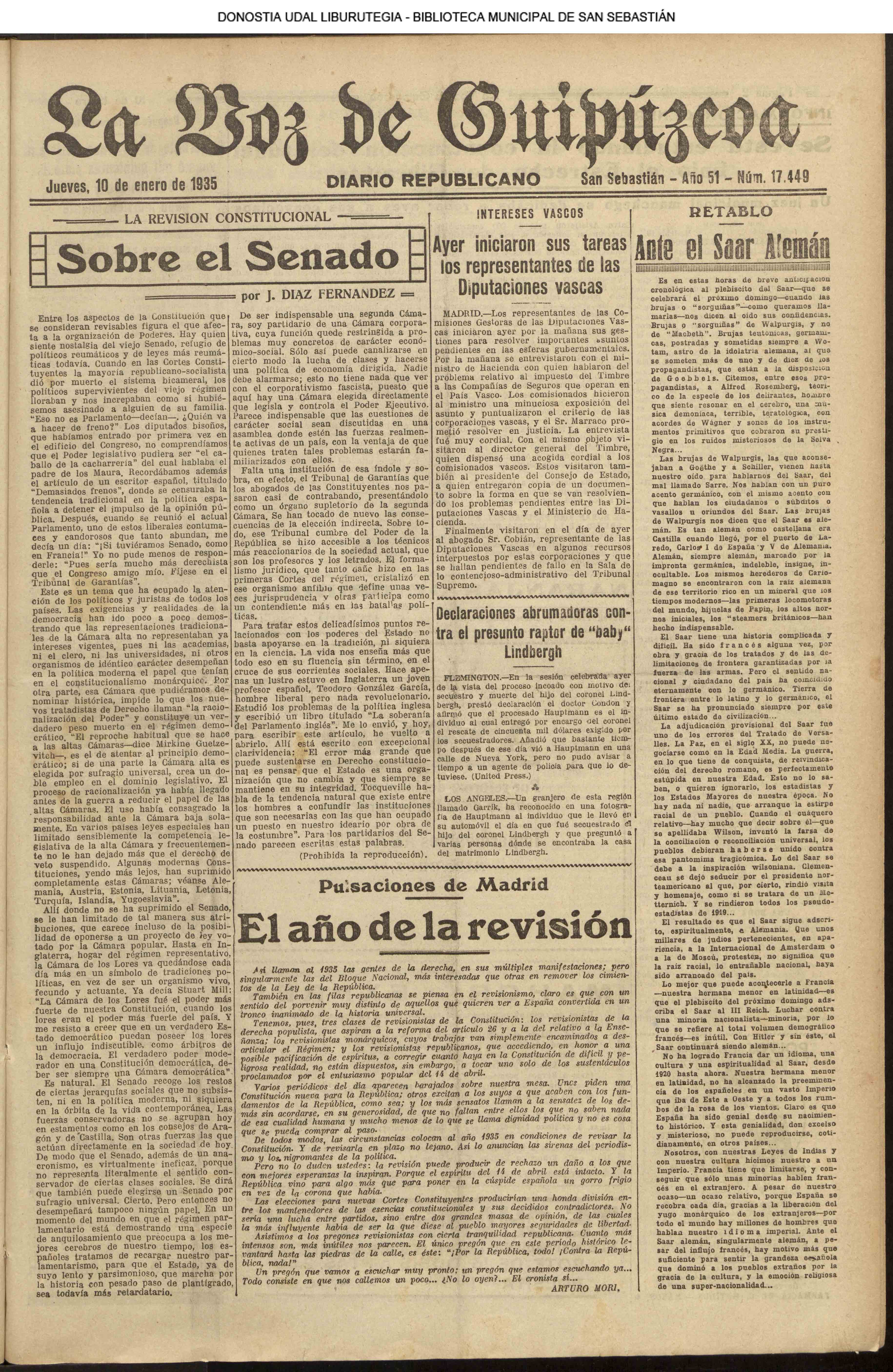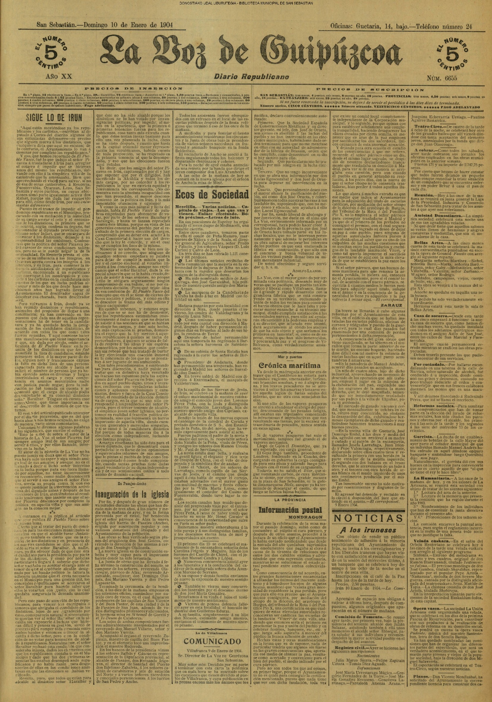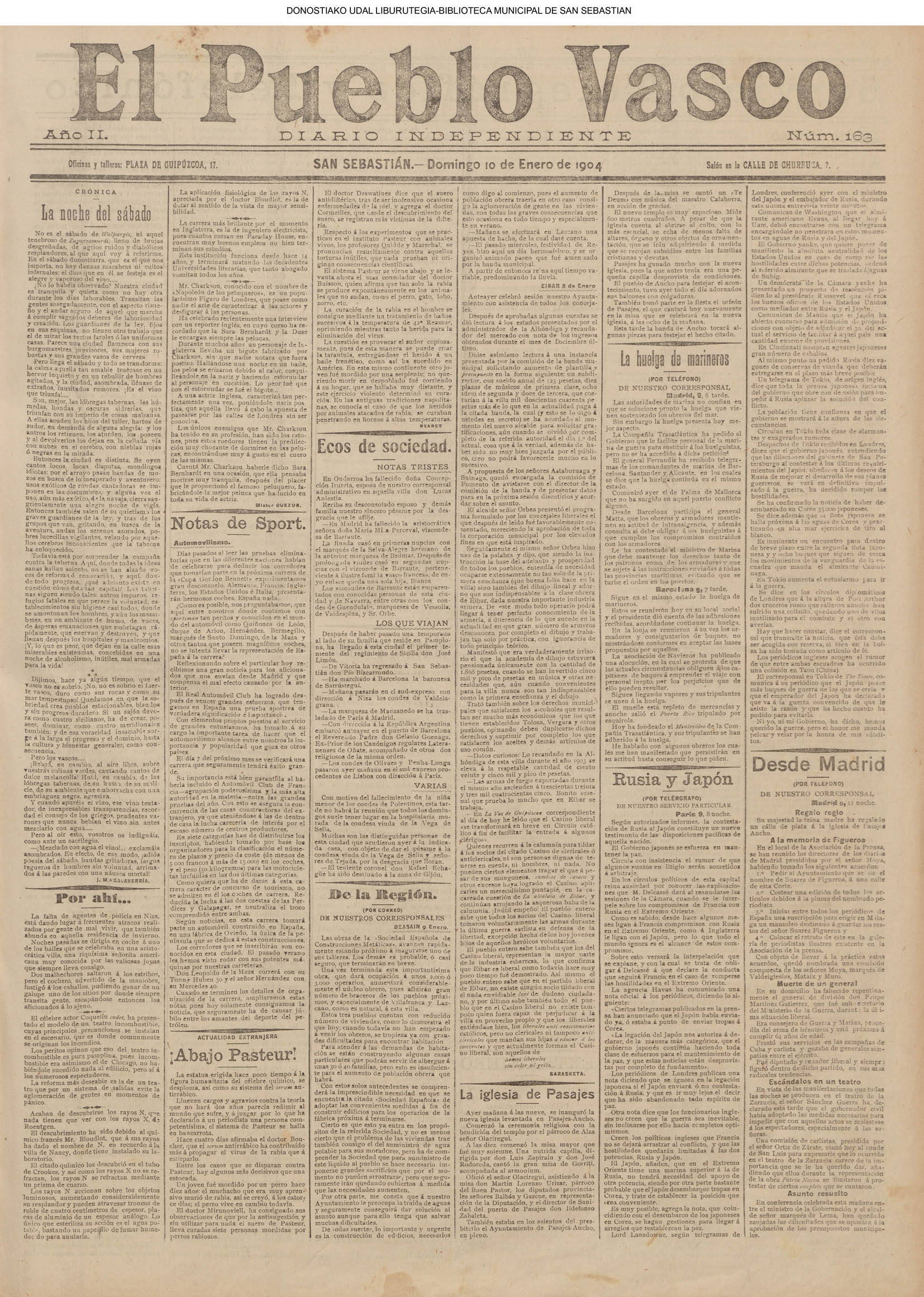 (1904) INAUGURACIÓN de la Iglesia parroquial del barrio de Pasajes Ancho, bendecida por el párroco de Alza. (La Voz de Guipúzcoa)(El Pueblo Vasco)(La Constancia) (1909) DIPUTACIÓN PROVINCIAL (El Pueblo Vasco)(El Correo de Guipúzcoa/cont)(La Constancia) (1910) La «Umore Ona» elige para el año que comienza la siguiente directiva: Pte., D. Daniel Badiola: vice., D. Raimundo Sánchez; secre., D. Antonio Sagarna; vice., D. Eugenio Urín; teso., D.César Huidobro; y vocales, Claudio Madariaga,D. José Laza, D. José Sánchez y D. Francisco Laza. (La Voz de Guipúzcoa)(El Pueblo Vasco)(El Correo de Guipuzcoa)(La Constancia) (1910) Nueva directiva de la “Euskal-Billera”: Presidente, D. Francisco Pamiés; vicepresidente, R- Armando Larzábal; secretario, D. Ramón Zapirain; tesorero, D. Sebastián Gurruchaga; vocales R. José Recarte, D. Angel Lizarríbar, D. Manuel Cendoya D. Félix Unzueta. (La Voz de Guipúzcoa)(El Pueblo Vasco) (1910) SOCIEDAD DE FOOTBALL (segundo equipo) (7-1) NAUTIQUE DE BAYONA @ - (La Voz de Guipuzcoa)(El Correo de Guipuzcoa)(La Constancia)(1914) (1916) ATHLETIC CLUB (4-0) REAL SOCIEDAD (La Voz de Guipúzcoa) (1919) El diputado por San Sebastián don Horacio Azqueta es nombrado Director General de Obras Públicas. (La Voz de Guipúzcoa) (1921) ATLETISMO.- Se disputa la IV PRUEBA DE LA GIMNÁSTICA DE ULÍA (La Voz de Guipúzcoa)(El Pueblo Vasco)(La Información)(La Constancia)(1924) Furioso temporal en el Cantábrico (La Voz de Guipúzcoa/cont)(El Pueblo Vasco)(El Pais Vasco)(La Constancia) # EL NAUFRAGIO DE PASAJES (La Voz de Guipúzcoa) #AYUNTAMIENTO PLENO.- ACTA nº.- LOS PRESUPUESTOS MUNICIPALES PARA 1924 (La Voz de Guipúzcoa/cont)(El Pueblo Vasco)(El Pais Vasco)(La Constancia) (1927) REAL SOCIEDAD (2-1) OSASUNA @ - La Voz de Guipúzcoa (ver más)(1929) (La Voz de Guipúzcoa)(El Pueblo Vasco)(El Pais Vasco)(La Constancia) (1934) (La Voz de Guipúzcoa)(El Pueblo Vasco)(El Día)(La Constancia) (1937) GUERRA CIVIL (EL DIARIO VASCO)(LA VOZ DE ESPAÑA) (UNIDAD) (1938) GUERRA CIVIL (EL DIARIO VASCO)(LA VOZ DE ESPAÑA) (UNIDAD) (1939) GUERRA CIVIL (EL DIARIO VASCO)(LA VOZ DE ESPAÑA) (UNIDAD) (1944) VALENCIA (3-0) REAL SOCIEDAD (LA HOJA DEL LUNES)(LA VOZ DE ESPAÑA) (1949) REAL SOCIEDAD (5-1) CD. MALAGA (LA HOJA DEL LUNES)(LA VOZ DE ESPAÑA) (1954) (LA VOZ DE ESPAÑA) (1955) HERCULES (4-1) REAL SOCIEDAD (LA HOJA DEL LUNES)(LA VOZ DE ESPAÑA) (1959) (LA VOZ DE ESPAÑA) (1964) ( LA VOZ DE ESPAÑA) (UNIDAD) (1966) REAL SOCIEDAD (5-2) LANGREO (LA HOJA DEL LUNES)(LA VOZ DE ESPAÑA) (1969) ( LA VOZ DE ESPAÑA) (UNIDAD) (1974) ( LA VOZ DE ESPAÑA) (UNIDAD) (1979) - ATENTADO (Llodio)- Ciriaco Sanz García es Ametrallado mientras viajaba en su vehículo. Murió en el Hospital de Cruces (1980) - ATENTADO (Alsasua))- Sebastián Arroyo González (Agente de la Guardia Civil retirado). Ametrallado mientras salía de su trabajo, causando un choque fatal con el Parque de Bomberos de Alsasua. Falleció a la mañana siguiente en el Hospital de Navarra (LA VOZ DE ESPAÑA) (1984) (1989) (1994) (1999) Multitudinaria manifestación en Bilbao a favor del acercamiento de los presos. (EL DIARIO VASCO) |