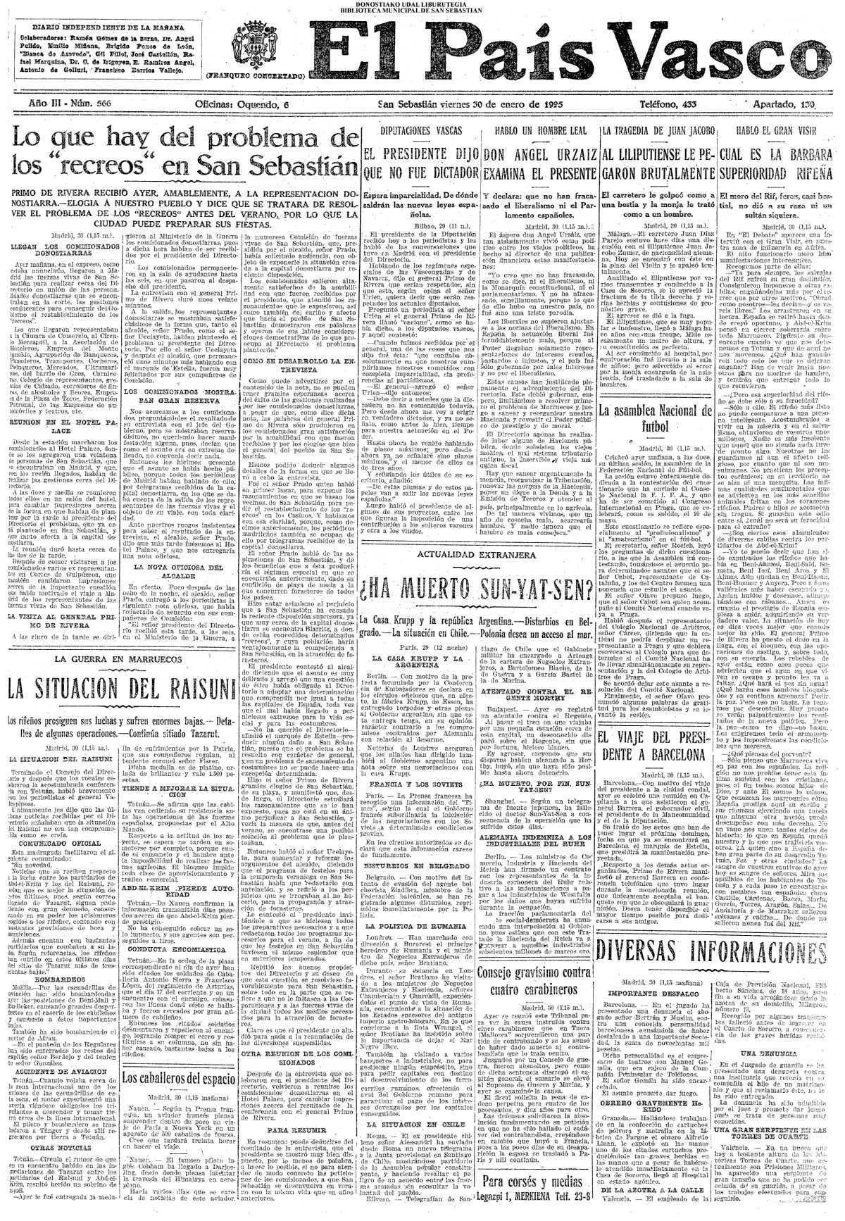 (1925) LA SUPRESIÓN DE LOS "RECREOS"- El general Primo de Rivera recibe a los representantes donostiarras