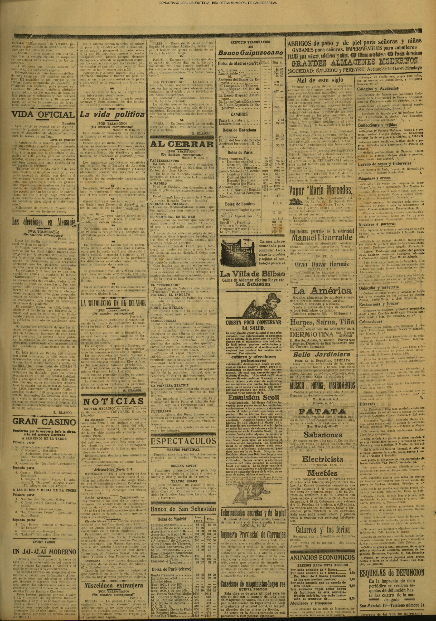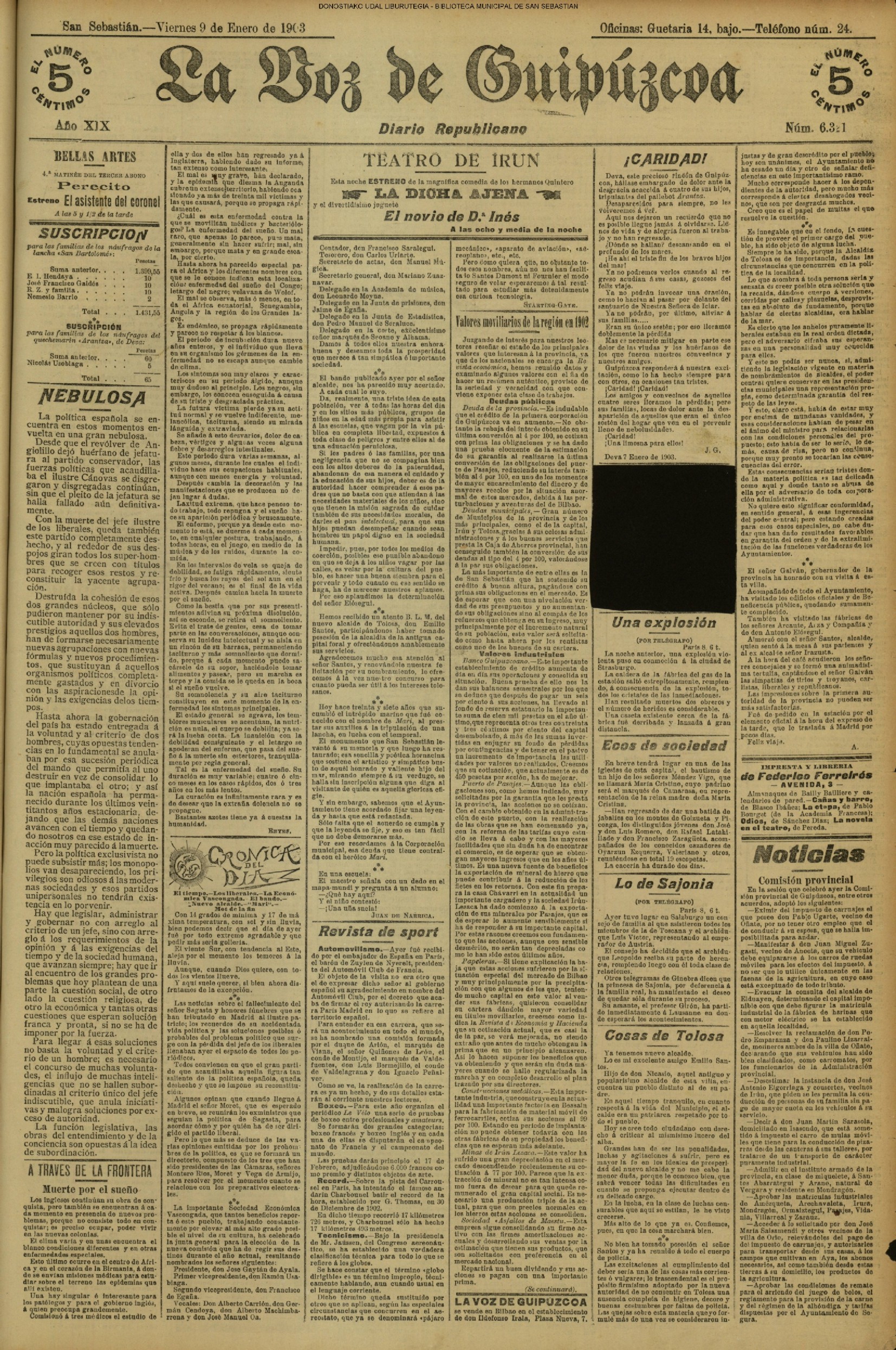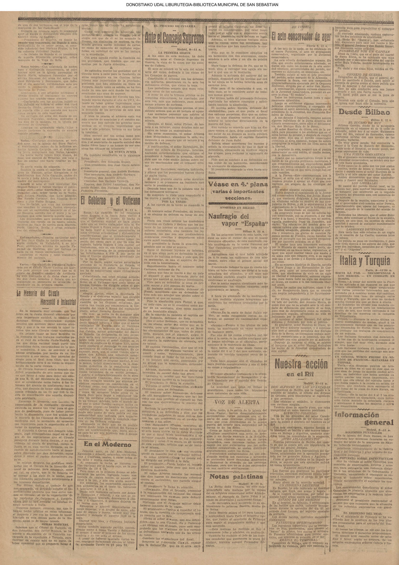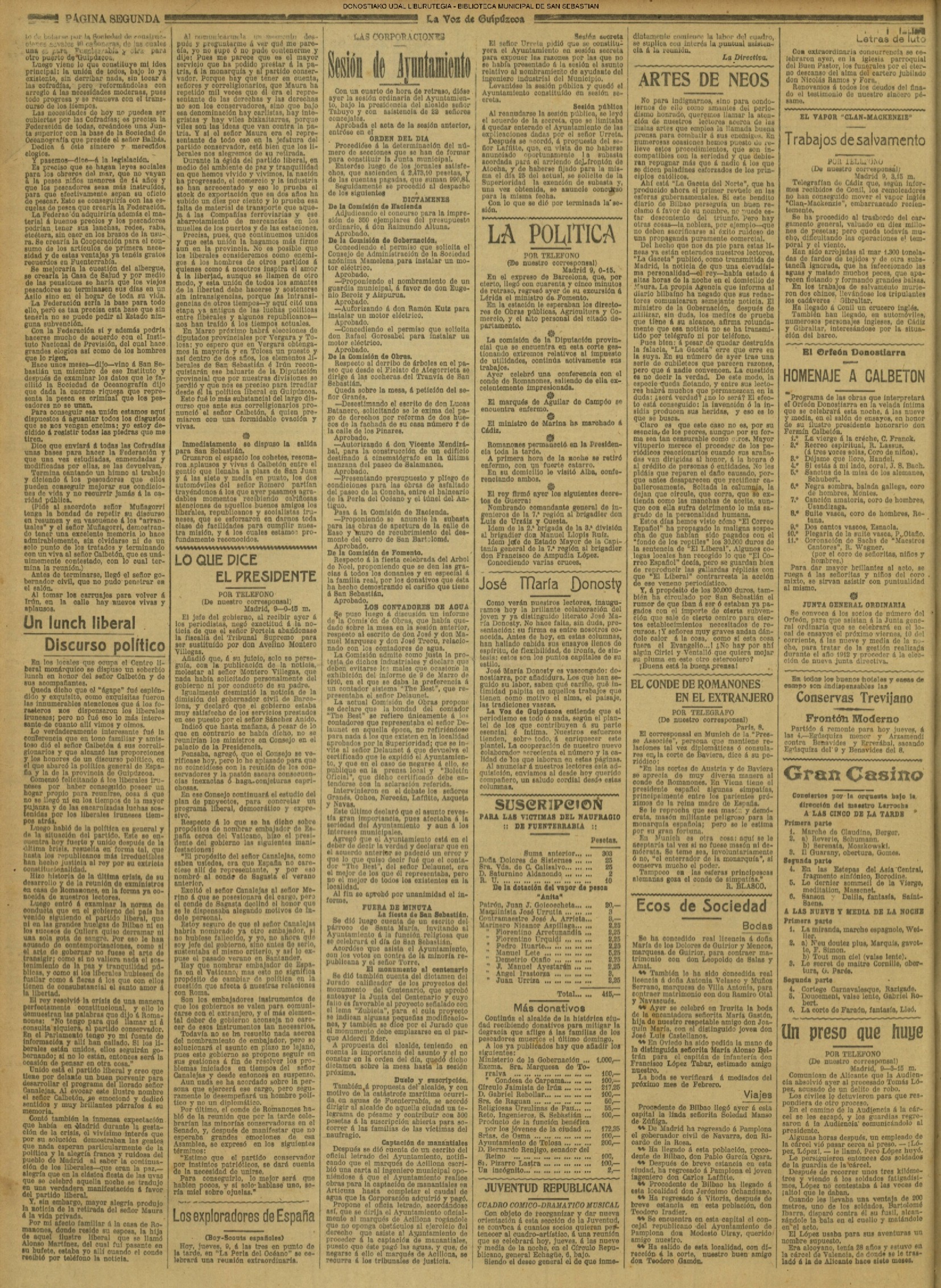 (1901) Nueva directiva del R. C. Náutico: Presidente, D. Fernando Colmenares; vicepresidente,D. José María de Aristiguieta; secretario, D. Enrique Pardiñas; tesorero, D. Remigio Ituarte; vocales, D. Juan Córdoba, D. Pedro Navarro, D. Pedro Bidaguren D. José Moyúa. (1903) BANDO del Sr. Alcalde sobre el abandono de los niños (La Voz de Guipúzcoa/BANDO)(La Unión Vascongada) (1908) AYUNTAMIENTO PLENO.- ACTA nº. (La Voz de Guipúzcoa)(El Pueblo Vasco)(El Correo de Guipuzcoa)(La Constancia) (1912) Festejando su nombramiento de conserje de la Nueva Plaza de Toros, reúne a sus amigos en una suculenta cena don Ramón Sagarna, que había desempeñado idéntico cargo en la Plaza que tuvo Arana en Atocha.(La Voz de Guipúzcoa) # UNA BODA ILUSTRE (La Voz de Guipúzcoa/cont)(El Pueblo Vasco)(El Correo de Guipuzcoa)(La Constancia) (1913) SESIÓN DE AYUNTAMIENTO (La Voz de Guipúzcoa)(El Pueblo Vasco)(El Correo de Guipuzcoa)(La Constancia) (1918) UNA BODA ELEGANTE (La Voz de Guipúzcoa)(El Pueblo Vasco)(El Correo de Guipuzcoa)(La Constancia) (1922) REAL SOCIEDAD (1-0) CETTE (Fr:) (1923) (1928) DEPORTIVO ALAVÉS (5-0) REAL SOCIEDAD (1930) Se estrena esta noche, en el Liceo de Barcelona, la ópera que de la zarzuela «Las golondrinas», de José María Usandizaga, hizo su hermano Ramón. Se guarda un minuto de silencio en homenaje a la memoria de aquél. Dirige la orquesta el maestro Alfredo Padavoni. (1933) DONOSTIA (4-1) VALENCIA (1937) GUERRA CIVIL (EL DIARIO VASCO)(LA VOZ DE ESPAÑA) (UNIDAD) (1938) GUERRA CIVIL (EL DIARIO VASCO)(LA VOZ DE ESPAÑA) (UNIDAD) (1939) GUERRA CIVIL (EL DIARIO VASCO)(LA VOZ DE ESPAÑA) (UNIDAD) (1941) REAL SOCIEDAD (14-2) VALLADOLID (Máxima victoria Global) (EL DIARIO VASCO)(LA VOZ DE ESPAÑA)(UNIDAD) (1943) (EL DIARIO VASCO)(LA VOZ DE ESPAÑA)(UNIDAD) (1948) (EL DIARIO VASCO)(LA VOZ DE ESPAÑA)(UNIDAD) (1953) (LA VOZ DE ESPAÑA)(UNIDAD) (1956) HERCULES (1-1) REAL SOCIEDAD @ - (HOJA DEL LUNES)(LA VOZ DE ESPAÑA)(1958) (LA VOZ DE ESPAÑA)(UNIDAD) (1963) (LA VOZ DE ESPAÑA)(UNIDAD) (1967) REAL SOCIEDAD (3-0) SANTANDER @ - (HOJA DEL LUNES)(LA VOZ DE ESPAÑA)(1968) (LA VOZ DE ESPAÑA)(UNIDAD) (1973) (LA VOZ DE ESPAÑA)(UNIDAD) (1978) (LA VOZ DE ESPAÑA)(UNIDAD) (1983) (1988) (1989) REAL SOCIEDAD (2-1) OSASUNA (1993) (1998) Lopez de Arriortúa, herido muy grave en accidente de coche |