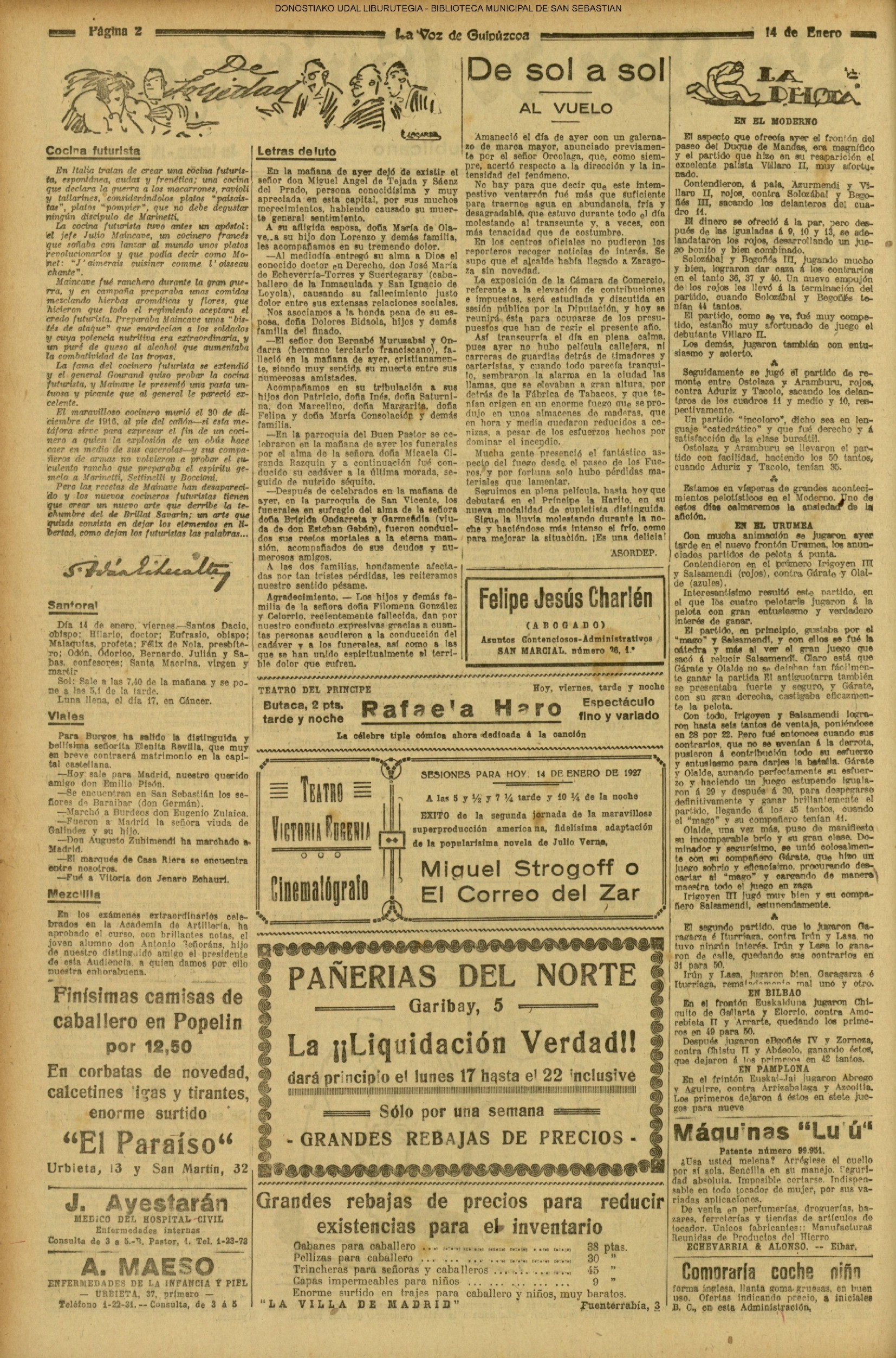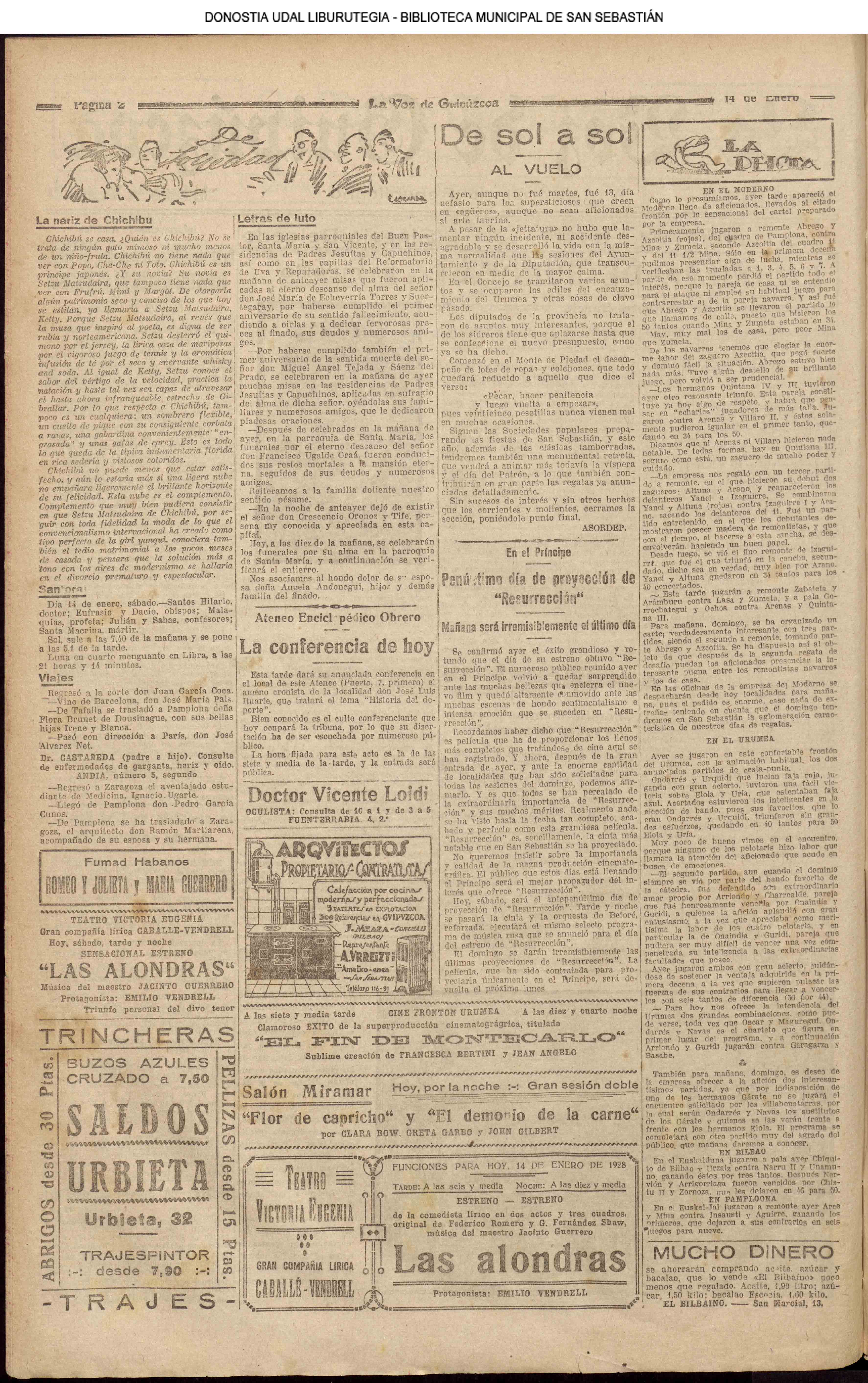 | 1904 | (MIÉRCOLES) (*).- UN SUICIDIO .- A las cinco y cuarto de la tarde llevaron a la nueva casa de socorro aviso de que un hombre se había arrojado desde uno de los balcones de la casa número 40 de la calle del Príncipe.(........) (LA VOZ DE GUIPÚZCOA.14/01. PÁG.01) **********************************************