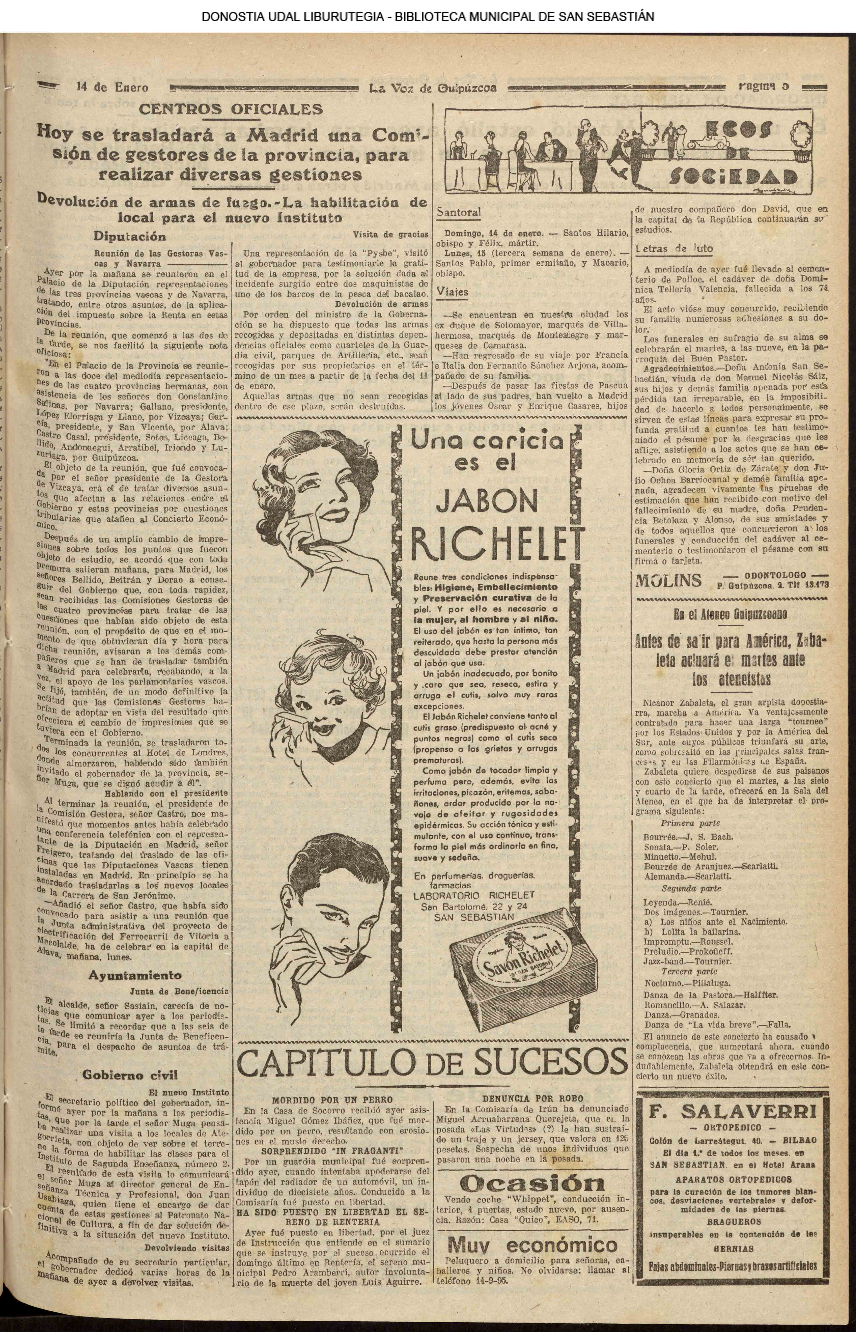 | 1889 | (DOMINGO) (*).-Sobre las once de la mañana, fue detenida frente a la casa número 14 de la calle de Santa Ana una mujer por un carabinero que quiso hacerla entrar en un portal diciéndola entregara el contrabando que tenía, resistiéndose a ello la mujer, por cuanto carecía completamente de género que adeudase derecho alguno, pues su mercancía se reducía a unas merluzas que traía en una cesta y que podía verlas con levantar tan sólo la tapa de la cesta. No conformándose con esta explicación el citado carabinero, fue la mujer conducida a la fuerza a la caseta de carabineros que al extremo del puente de Santa Catalina existe, y no estando en el puesto la matrona para el registro, fue esta reconocida, por una mujer ajena ésta a este cargo. Ahora bien : ¿hay derecho para coger a una persona dentro de la población y llevarla al registro al extremo del Puente de Santa Catalina? Llamamos la atención de quién corresponda a fin de que se eviten hechos como el relatado. (LA VOZ DE GUIPÚZCOA. 14/01. pág.02) *************************************************