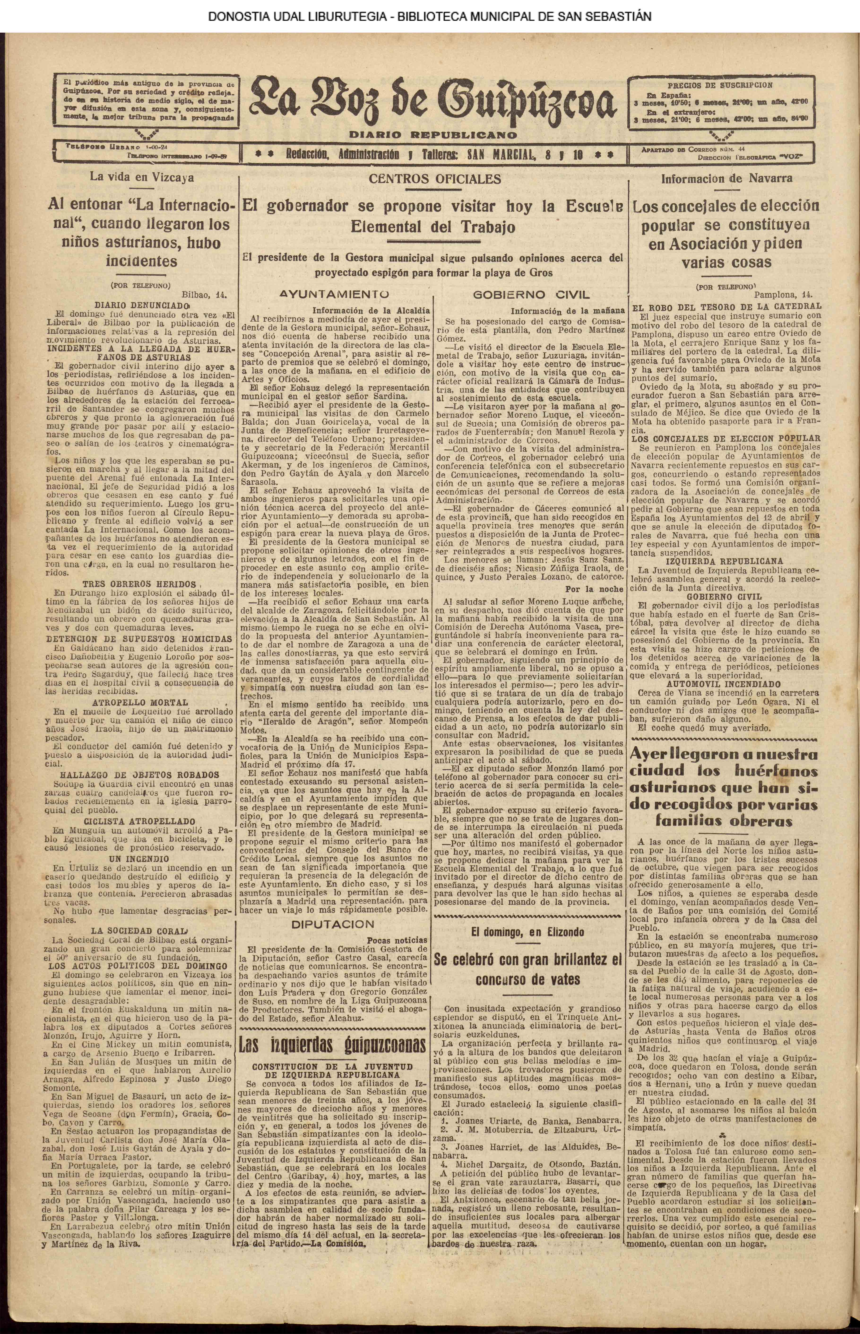 1913![]() ![]() Alcalde: Marino Tabuyo PRENSA # La Constancia: diario íntegro fuerista. # El Correo del Norte: diario regional tradicionalista. #El Pueblo Vasco. #La Voz de Guipúzcoa: diario republicano # |