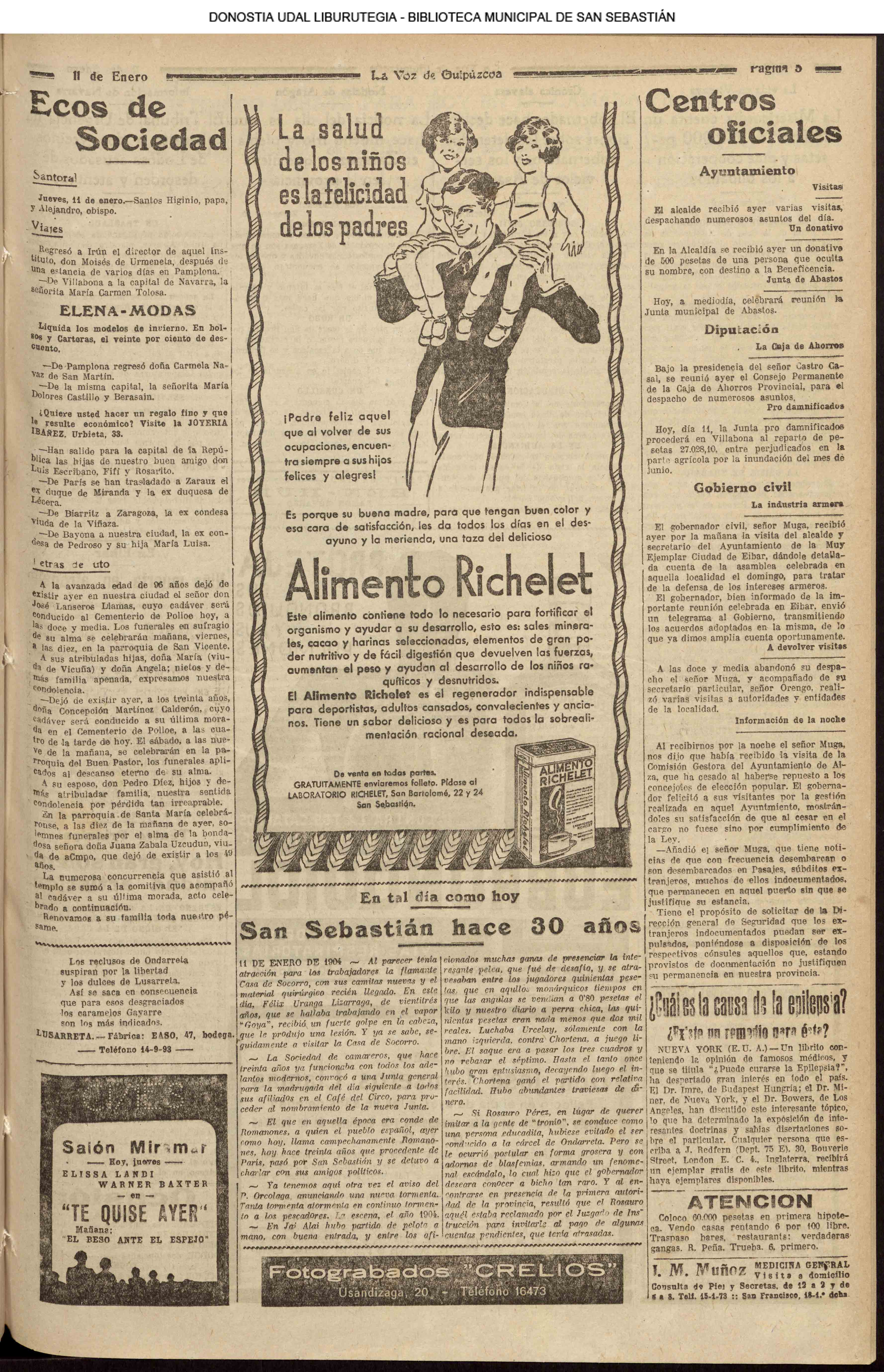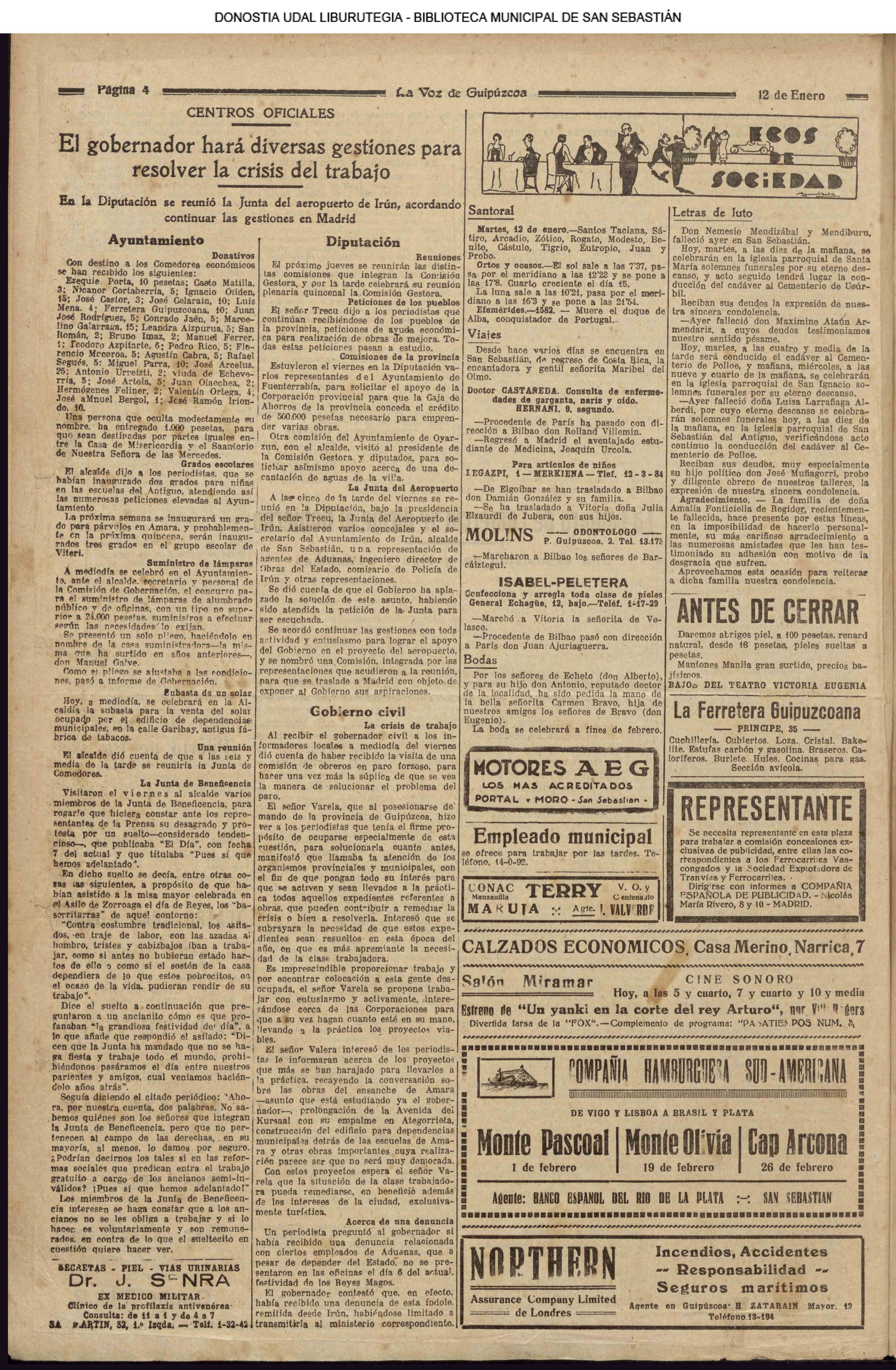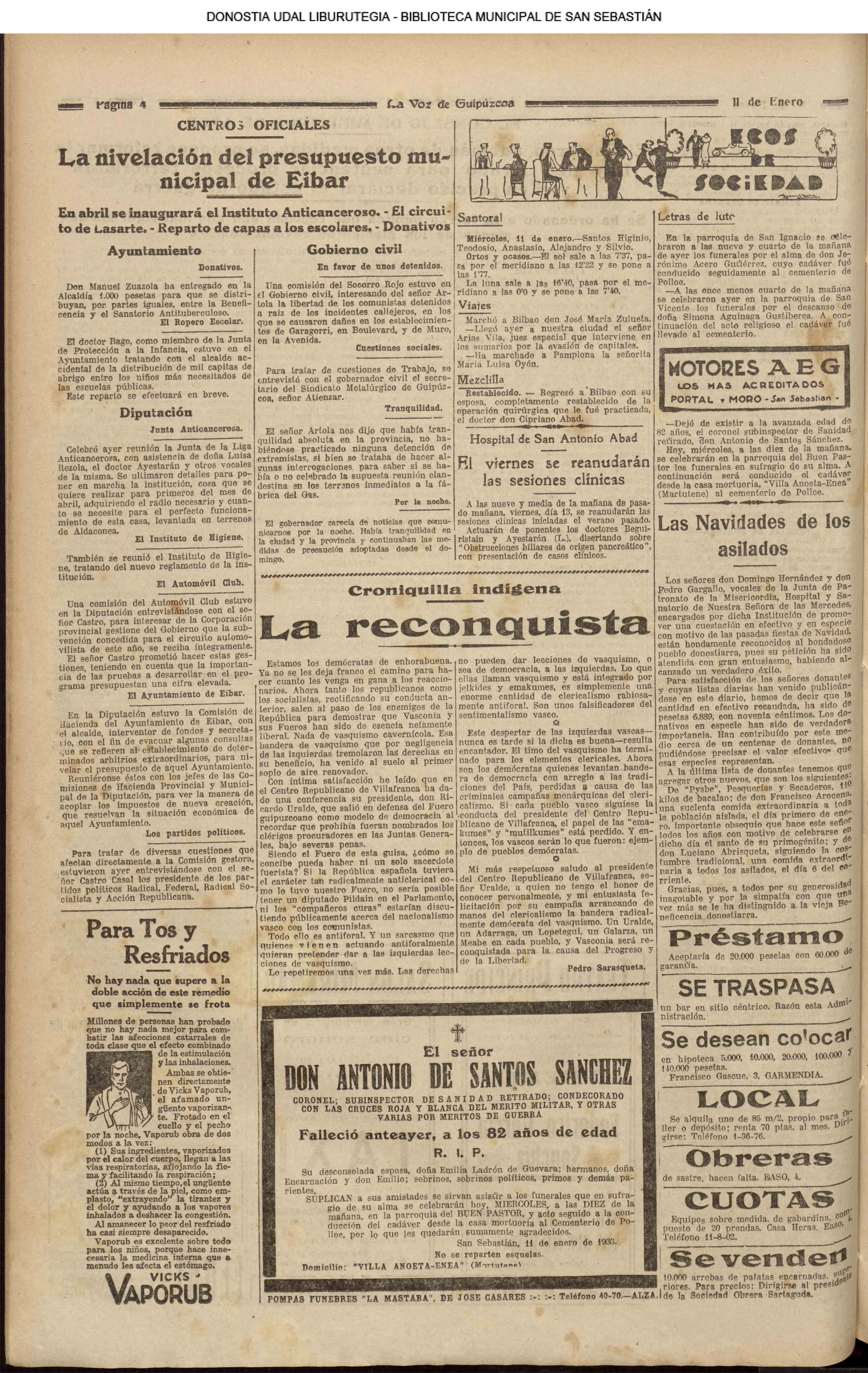 (1931) El Club Taurino renueva su Junta de este modo: Pte., D. Francisco Ager; vice., D, Eusebio García Serrano; secre, D. José García Sanmillán; teso.,D. Manuel Sánchez; cont., D. Victoriano Calvo; vocales, D. Pascual Palao, D. Pablo Martínez Elizondo, don Félix Clemente y D. Ángel Lasagabáster. (La Voz de Guipúzcoa)(El Pueblo Vasco)(El Día)(La Constancia) (1931) El Centro Asturiano —domiciliado en Esterlines, 12, bajo —designa para el año entrante la Directiva siguiente: Luis Pérez Egea (pte), Félix Gracia (secre), Dionisio García (teso), Félix Lorente (conta), Manuel Ai diñes, Ernesto Bayón, Máximo Santos y Dionisio García (vocales), y Francisco Fernández y Balbino Sánchez (revisores de cuentas). (La Voz de Guipúzcoa)(El Pueblo Vasco)(El Día)(La Constancia) (1931).—Boda en el Buen Pastor: don Salvador Pasamontes, empleado del Banco de los Previsores del Porvenir, y Petrita Fernández. (La Voz de Guipúzcoa)(El Pueblo Vasco)(El Día)(La Constancia) |