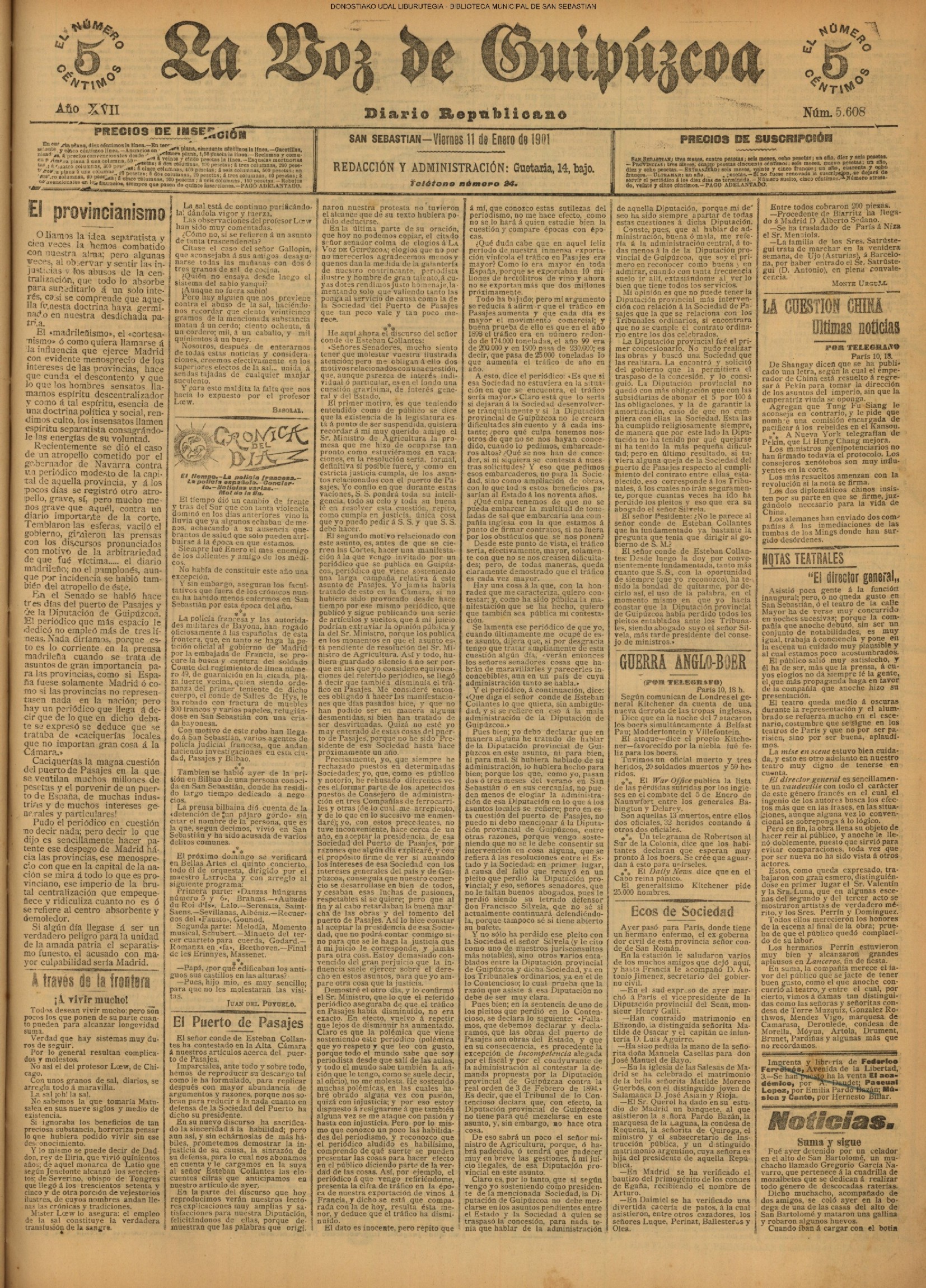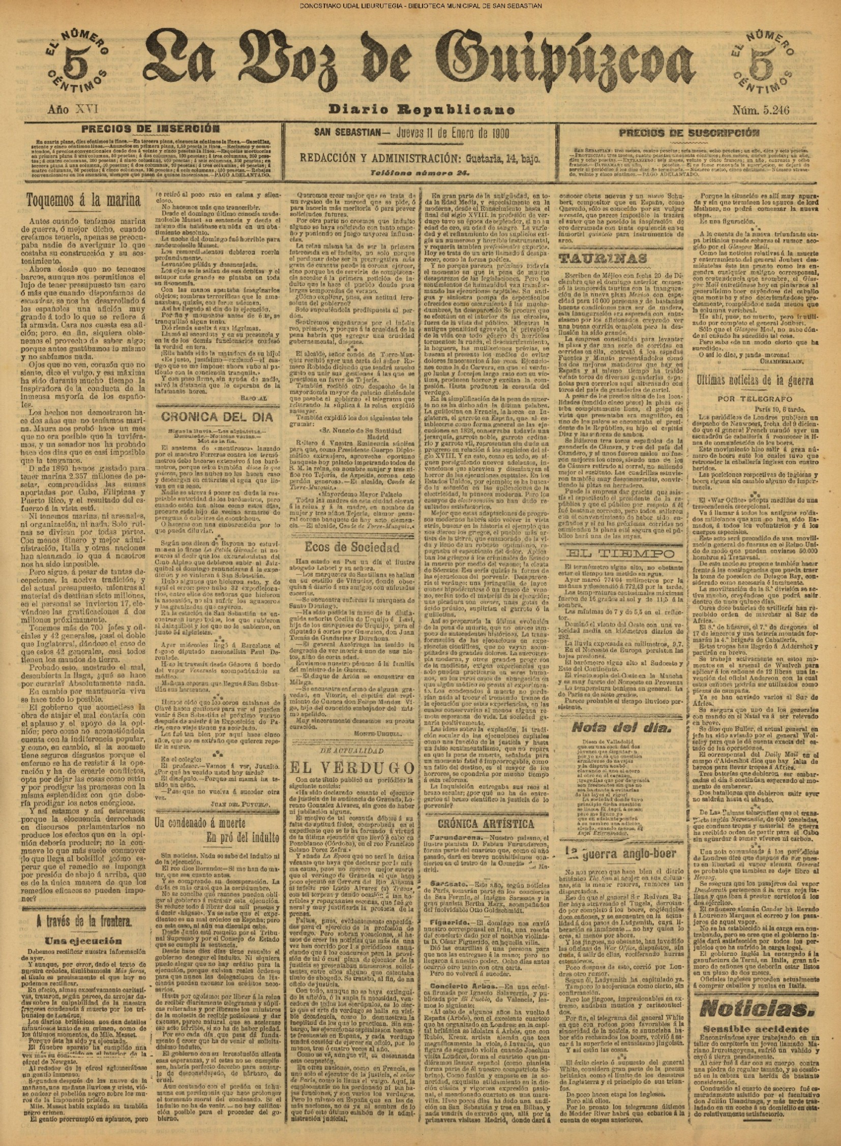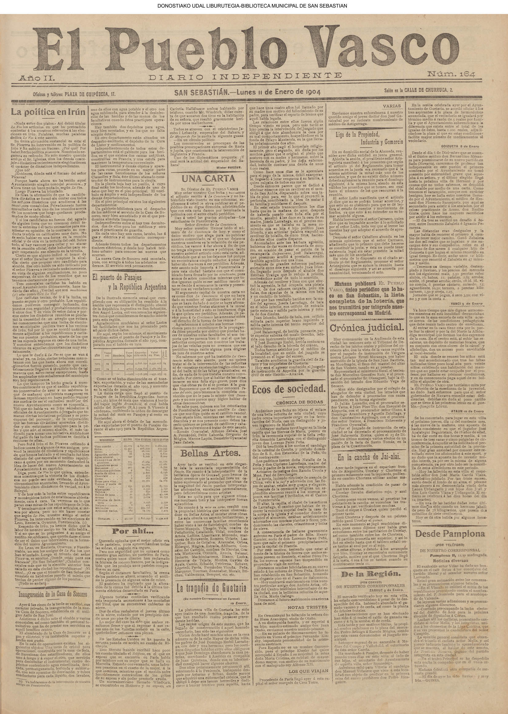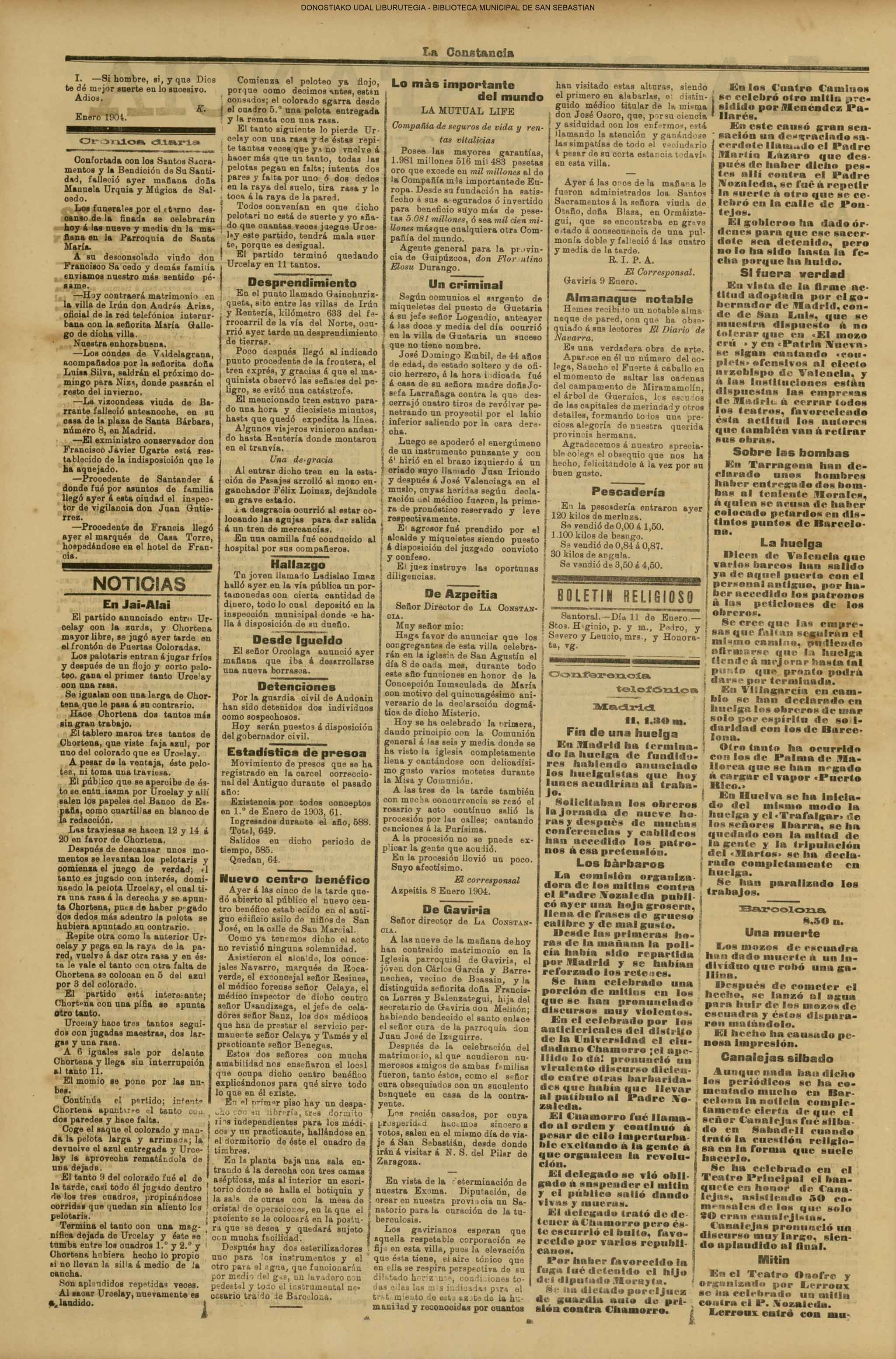 (1931) El Club Taurino renueva su Junta de este modo: Pte., D. Francisco Ager; vice., D, Eusebio García Serrano; secre, D. José García Sanmillán; teso.,D. Manuel Sánchez; cont., D. Victoriano Calvo; vocales, D. Pascual Palao, D. Pablo Martínez Elizondo, don Félix Clemente y D. Ángel Lasagabáster. (La Voz de Guipúzcoa)(El Pueblo Vasco)(El Día)(La Constancia) (1931) El Centro Asturiano —domiciliado en Esterlines, 12, bajo —designa para el año entrante la Directiva siguiente: Luis Pérez Egea (pte), Félix Gracia (secre), Dionisio García (teso), Félix Lorente (conta), Manuel Ai diñes, Ernesto Bayón, Máximo Santos y Dionisio García (vocales), y Francisco Fernández y Balbino Sánchez (revisores de cuentas). (La Voz de Guipúzcoa)(El Pueblo Vasco)(El Día)(La Constancia) (1931).—Boda en el Buen Pastor: don Salvador Pasamontes, empleado del Banco de los Previsores del Porvenir, y Petrita Fernández. (La Voz de Guipúzcoa)(El Pueblo Vasco)(El Día)(La Constancia) |