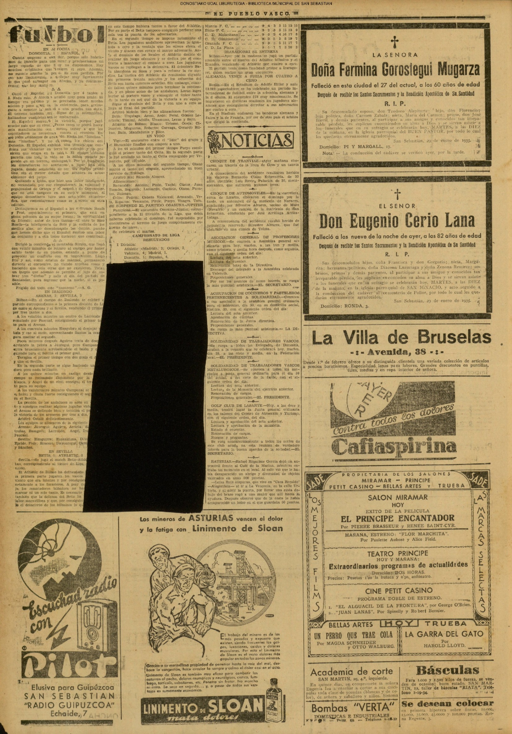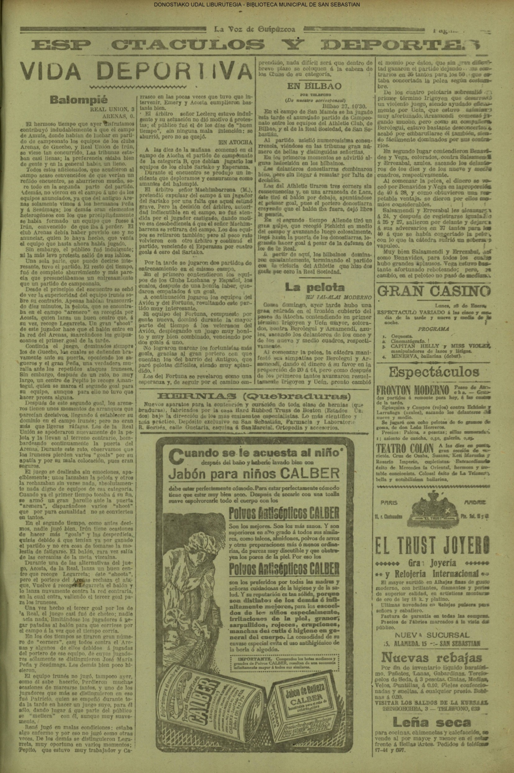 (1834).- Las partidas carlistas incomunican San Sebastián, impidiendo la circulación de las gentes y la entrada y salida del correo. (1875).- Cuatro carlistas allanaron la casa Sagasticho, llevándose catorce mantas de las camas que allí había. No ha sido posible acreditarlo porque, aunque hubo caseros que les vieron cómo llevaban las mantas, por temor a venganzas, se niegan a declararlo. (FUENTE: "Anales de la Segunda Guerra Carlista en San Sebastián". FERMIN MUÑOZ ECHABEGUREN) (1876).- Los carlistas han debido retirar la artillería de Mendizorrotz, Arratsain y Venta-ciquin, en vista del importante movimiento ejecutado por el General Moriones. Sobre la población no han hecho un solo disparo, ni creemos que vuelvan a hostigarnos más (DSS) (FUENTE: "Anales de la Segunda Guerra Carlista en San Sebastián". FERMIN MUÑOZ ECHABEGUREN) (1879)CARTA DEL PRESIDENTE DE LA NUEVA ARMONIA A PROPOSITO DE UNA FUNCION Diario de San Sebastián: periódico de noticias. (1880)SE SEÑALA QUE EN EL CUADERNO 31 DE LA HISTORIA DE LA ULTIMA GUERRA CIVIL APARECEN 2 PLANOS SOBRE EL SITIO DE IRUN PROPUESTA DEL MINISTERIO DE LA GUERRA DE ADQUISICION DE FUSILES PROPIEDAD DE LA DIPUTACION DE GUIPUZCOA Y FABRICADOS EN PLASENCIA Diario de San Sebastián: periódico de noticias. (1881)SOBRE LA NECESIDAD DE CONSTRUCCION DE UN NUEVO ESTABLECIMIENTO PENITENCIARIO El Urumea: periódico no político. (1882)PETICION DE LOS AGENTES INTERNACIONALES DE ADUANAS PARA QUE SE LES EXIJA EL SELLO MOVIL DE 10 CENTIMOS A LAS PROVINCIAS VASCONGADAS APLICANDO LA LEY PROVISIONAL DE LA RENTA DE TIMBRE DEL ESTADO El Urumea: periódico no político. (1883)CARTA DE IRUN LA COMPAÑIA DEL NORTE DEBE SER LA PARTE MAS INTERESADA EN PROTEGER EL PUERTO DE PASAJES PROPORCIONANDO UN MAYOR TRAFICO DE MERCANCIAS HACIA FRANCIA #El Urumea: periódico no político. # PLAN DE ENSANCHAMIENTO DEL PASEO DE LA ALAMEDA # Diario de San Sebastián: periódico de noticias. (1884)JUEGOS FLORALES EUSKEROS CRONICA DE LOS JUEGOS FLORALES CELEBRADOS EN EL TEATRO PRINCIPAL El Eco de San Sebastián (1885)EL BAILE DEL DOMINGO EXPOSICION DE OBRAS DE ARTE DE VARIOS ARTISTAS EN EL SALON DEL PALACIO DE LA PROVINCIA. El Urumea: periódico no político. # BAILES Y JUEGOS DESCRIPCION DEL JUEGO DE LA PELOTA VASCA #El Eco de San Sebastián (1886)MEMORIA DE LA UNION OBRERA La Voz de Guipúzcoa: diario republicano APROBADA LA CONCESION DE TERRENOS A LA REPRESENTACION DE LOS CONCESIONARIOS DE LAS OBRAS PARA GANAR TERRENOS AL MAR EN LA MARGEN IZQUIERDA DEL URUMEA EN LA ZONA LLAMADA DE LA ZURRIOLA # EL DIRECTOR GENERAL DE SANIDAD SR.ZUGASTI VA A REMITIR UNA CIRCULAR A LOS GOBERNADORES DE LA PROVINCIA Y JEFES DE SANIDAD MARITIMA CON LAS MEDIDAS PREVENTIVAS QUE DEBERAN TOMAR PARA EVITAR CUALQUIER ALTERACION EN LA SALUD PUBLICA # LA PRIMERA ENSEÑANZA EN SAN SEBASTIAN PROYECTO PARA HABILITAR EL MERCADO DE LA BRECHA Y CONVERTIRLO EN UN CENTRO DE ENSEÑANZA PRIMARIA PUBLICA #El Eco de San Sebastián (1887) OBRAS EN EL PASEO DE LA ZURRIOLA PARA EL ARBOLADO,PETICION DE MEJORA DE LA INFRAESTRUCTURA ENERGETICA DEL GAS # LOS QUE PINTAN DESPERTAR DE LA AFICION PICTORICA ENTRE LAS MUJERES DE SAN SEBASTIAN El Eco de San Sebastián (1888)RESORTES MESTIZOS ARTICULO EN EL QUE EL FUERISTA EXPONE SU RECHAZO A LOS MESTIZOS YA QUE CUALQUIER TIPO DE LIBERALISMO ES PECADO # El Fuerista: periódico católico. Dios, Patria, Rey. CARTA ENVIADA POR EL CORRESPONSAL DE AZPEITIA AL DIRECTOR DE "EL ECO DE SAN SEBASTIAN" EN LA QUE RESPONDE A LA QUEJA DEL DIRECTOR EN LA QUE MUESTRA SU DESENCANTO PORQUE TODOS NO HAN CELEBRADO EL DIA DEL REY ALFONSO XIII # LA ESTATUA A OQUENDO LA COMISION DE LA ESTATUA A OQUENDO CELEBRA SESION EN LAS CASAS CONSISTORIALES #El Eco de San Sebastián (1889)ANUNCIO DE CORRIDA DE BUEYES EN EL ANTIGUO # TAMBORRADA DE LA UNION ARTESANA LA VISPERA DE CARNAVAL #La Voz de Guipúzcoa: diario republicano (1890) Dimite el músico de la Banda Municipal D. Manuel Vidate. (1890) ARTICULO QUE RECOGE LA IDEA DE CREAR EN IRUN UNA SOCIEDAD COOPERATIVA PARA COMPRAR ARTICULOS DE PRIMERA NECESIDAD A PRECIOS MAS BAJOS. #La Unión Liberal: diario monárquico guipuzcoano. (1891)ORGANIZACION DE UN BAILE DE NIÑOS POR EL GRAN CASINO DE SAN SEBASTIAN EN CARNAVALES # CONSTRUCCION DE ACANTARILLADO EN EL BARRIO DE AMARA # CARNAVALES POR LA SOCIEDAD LA FRANTERNAL #La Voz de Guipúzcoa: diario republicano # LA FRATERNAL LA FRATERNAL ORGANIZA UNA FUNCION DE CARNAVAL EN EL TEATRO DEL CIRCO # La Libertad. # QUEJA POR LA CANTIDAD DE MENDIGOS QUE SE LOCALIZAN ESTOS DIAS PIDIENDO EN LAS PUERTAS DE LAS IGLESIAS #El Guipuzcoano: diario liberal reformista # PROCLAMACION DE LAS CANDIDATURAS PARA LAS ELECCIONES GENERALES #El Fuerista: periódico católico. Dios, Patria, Rey. (1892)UN SERMON EN SAN VICENTE CRITICA A UN SERMON PREDICADO EN LA IGLESIA DE SAN VICENTE EN CONTRA DEL SOCIALISMO # SOBRE LA VESTIMENTA DE LOS VASCOS. DATOS HISTORICOS. # La Voz de Guipúzcoa: diario republicano # LOS MISIONEROS CAPUCHINOS EN LAS PALAOS Y VENEZUELA NOTICIAS DE LOS MISIONEROS CAPUCHINOS, EN SU MAYORIA VASCOS Y NAVARROS QUE HAN IDO A LAS PALAOS Y VENEZUELA # La Unión Vascongada. # OTRA EXPOSICION OFICIO AL GOBERNADOR CIVIL PARA QUE EXHORTE A TODOS AQUELLOS QUE TENGAN QUE VER CON EL TEATRO Y LA MUSICA, O CON LAS INDUSTRIAS CON ELLOS RELACIONADAS, PARA QUE ACUDAN A UNA EXPOSICION QUE SOBRE ESTE TEMA SE CELEBRARA EN VIENA #El Guipuzcoano: diario liberal reformista (1893)OBRAS QUE SE REALIZAN EN EL CASTILLO DE LA MOTA PARA LA ESCUELA PRACTICA DE LA FUERZA DE ARTILLERIA QUE RESIDE EN ESTA PLAZA # La Unión Vascongada. #TU DIXISTI DECLARACION DE CARLISTAS NAVARROS SOBRE CUALIFICACION E IDONEIDAD EN LA ELECCION DE CANDIDATOS, DESHECHANDO ORIGEN O NACIMIENTO #El Fuerista: periódico católico. Dios, Patria, Rey. (1894)TRAJES DE LOS VASCONGADOS SOBRE LOS VESTIDOS Y TRAJES DE LOS VASCOS EN LA ANTIGUEDAD. # HISTORIA RETROSPECTIVA (LA BATALLA DE SAN MARCIAL) SOBRE LA BATALLA DE SAN MARCIAL # La Voz de Guipúzcoa: diario republicano (1895)NOTICIA
