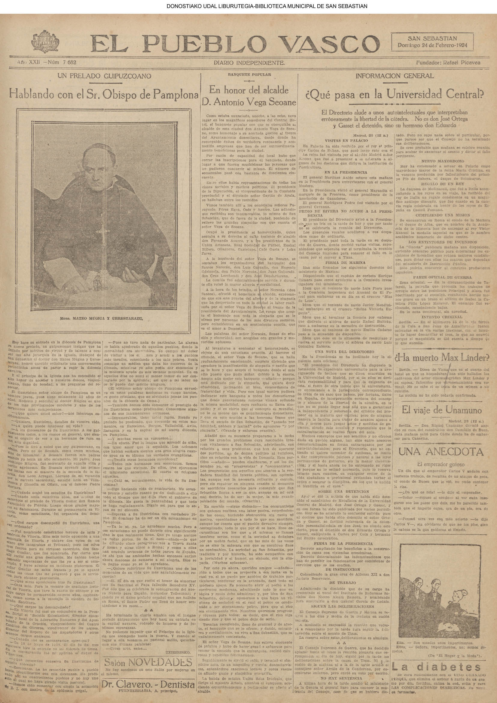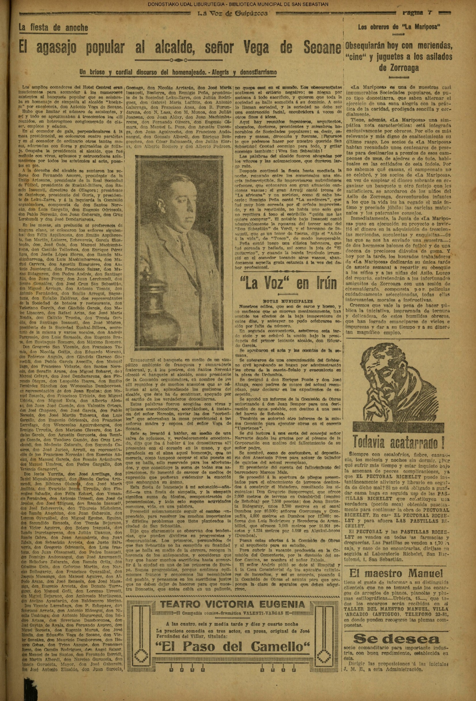 (1924) Las sociedades populares —cerca de 300 comensales— obsequian esta noche con un banquete en el hotel Central al Alcalde, don Antonio Vega de Seoane. Ofreció el agasajo don Santos Nerecán, presidente de la Comisión organizadora, y el homenajeado pronunció un vibrante discurso de tonos donostiarrísimos, terminando con un «¡Viva San Sebastián!». Luego se hizo música por los artistas del casa: Remigio Peña, Arruti,el bajo Insausti... y para final llegó la Iruchulo.