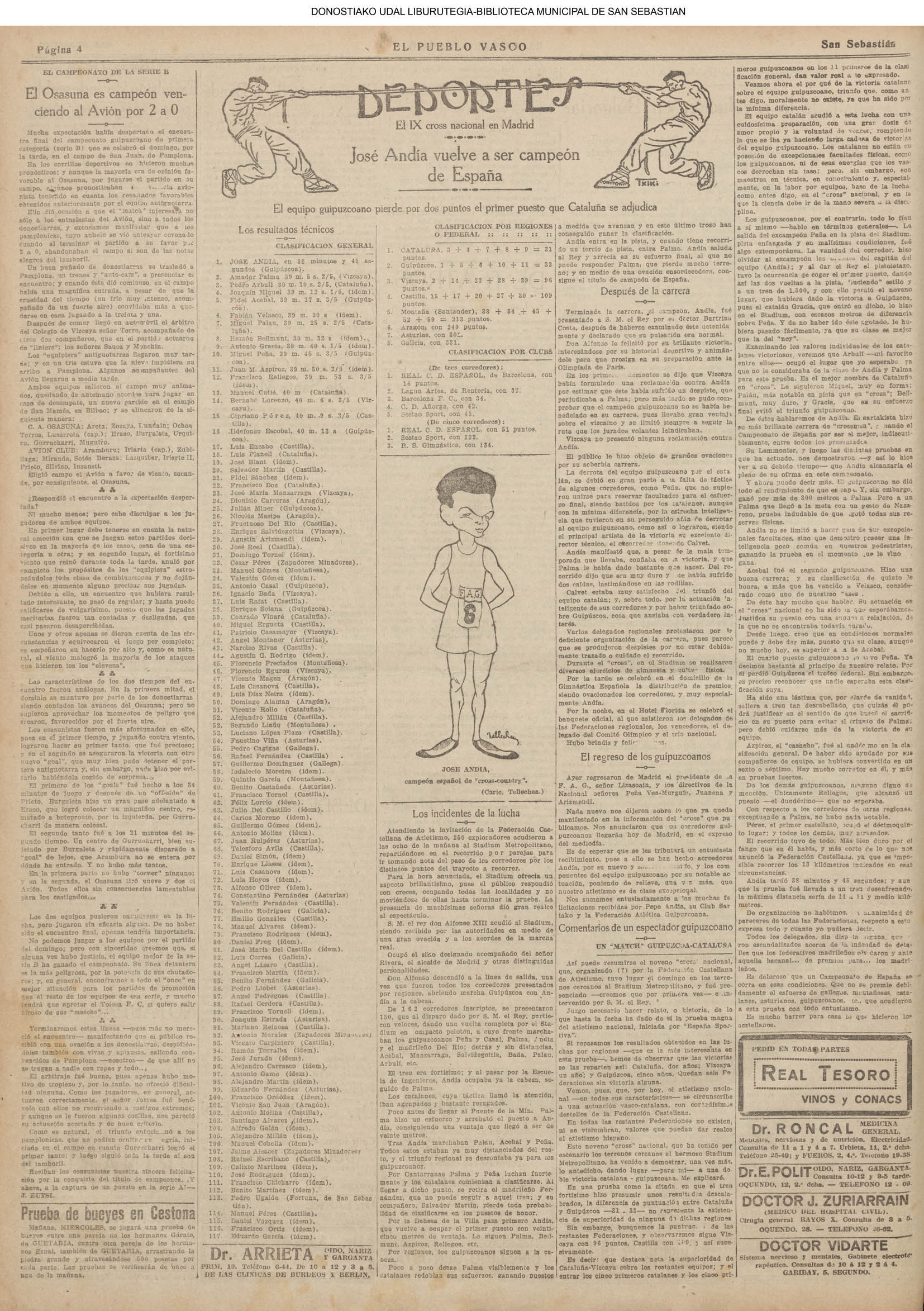 (1924) IX CAMPEONATO NACIONAL DE “CROSS COUNTRY” - José Andía (Guipuzcoa) reconquista brillantemente el título de Campeón de España - En la clasificación social por regiones se adjudica el triunfo Cataluña - Por dos puntos, ocupa el segundo puesto Guipúzcoa.
