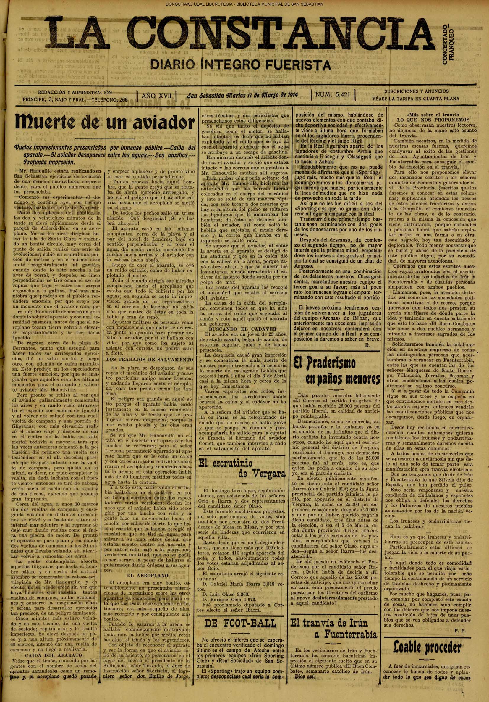 (2010) - ATENTADO - Asesinado un policía francés en un tiroteo con un comando de ETA cerca de París (EL DIARIO VASCO) (2011) - El cadáver de Amaia Azkue, de 39 años de edad, natural de Orio, es hallado en aguas del embalse Ibai Eder. La víctima, atada de pies y manos, presenta grandes lesiones en la cabeza.(EL DIARIO VASCO) (2012) - FALLECE el artista Javier Álvarez de Eulate, a los 93 años de edad. Nacido en San Sebastián, en 1919 ingresó en la orden franciscana. En 1950 fue encargado de realizar las vidrieras de Arantzazu. Autor de una importante obra plástica. (EL DIARIO VASCO) (2013) INAUGURACIÓN : Este mediodía se ha inaugurado, en la PARTE VIEJA, una escultura realizada por Dora Salazar y que incluye un bertso de Maialen Lujanbio. # REAL SOCIEDAD (4-1) VALLADOLID @ - (EL DIARIO VASCO) (2014) REAL SOCIEDAD (1-0) VALENCIA @ - (EL DIARIO VASCO) (2015) GETAFE (0-1) REAL SOCIEDAD @ - (EL DIARIO VASCO) (2020)- PANDEMIA POR CORONAVIRUS (COVID 19)- ESTADO DE ALARMA,DÍA 03 (2021) (2023) REAL SOCIEDAD (0-0) ROMA @ - (EL DIARIO VASCO) |