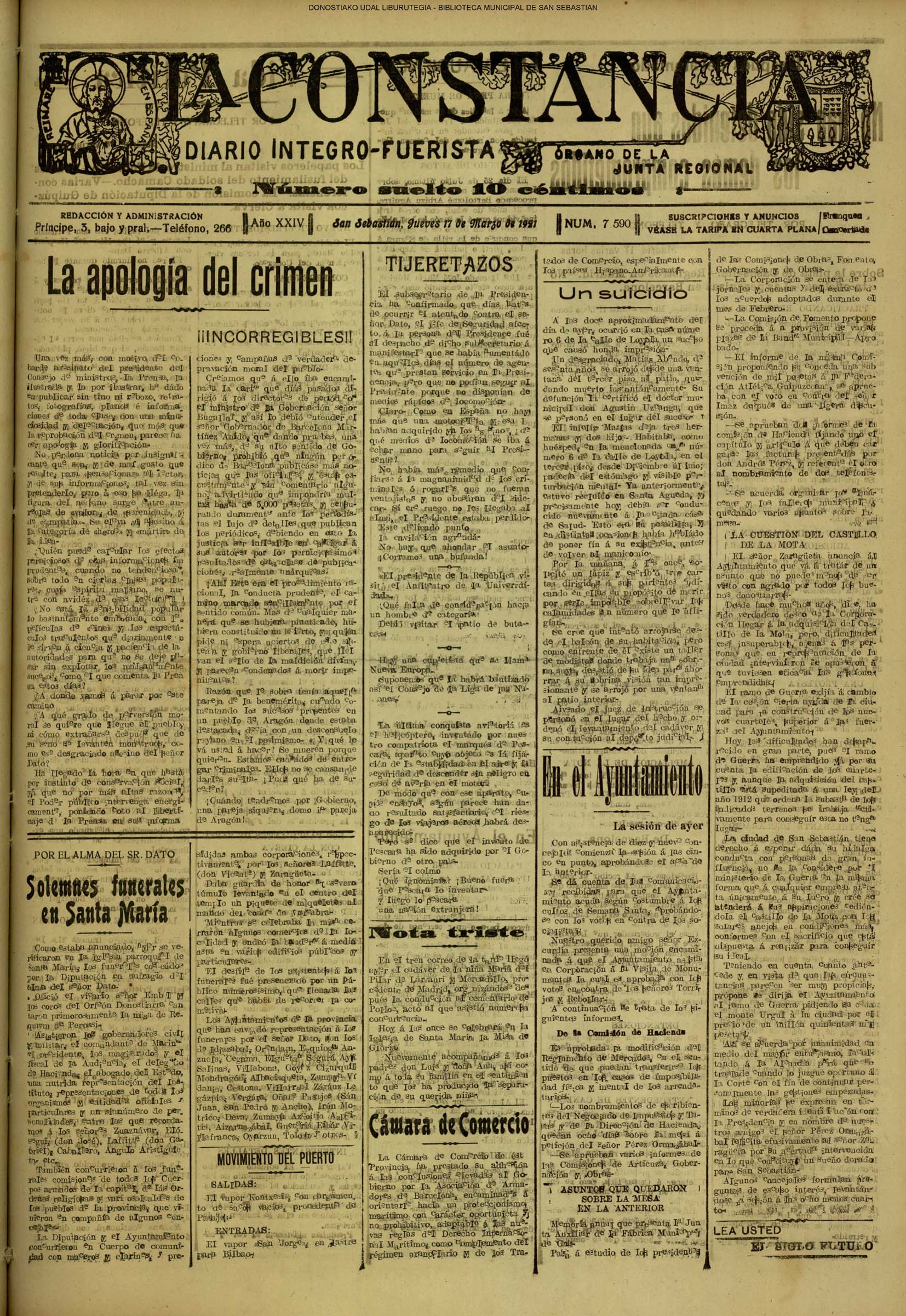 (1885) Pescando en aguas donostiarras, el “Mamelena núm. 5” abordó, echándolo pique, al “Mamelena núm. 2”, cuya tripulación se salvó en su totalidad. (1856) (1861) (1866) (1871) (1891) Dimite el platillero de la Banda municipal, D. Juan González. |