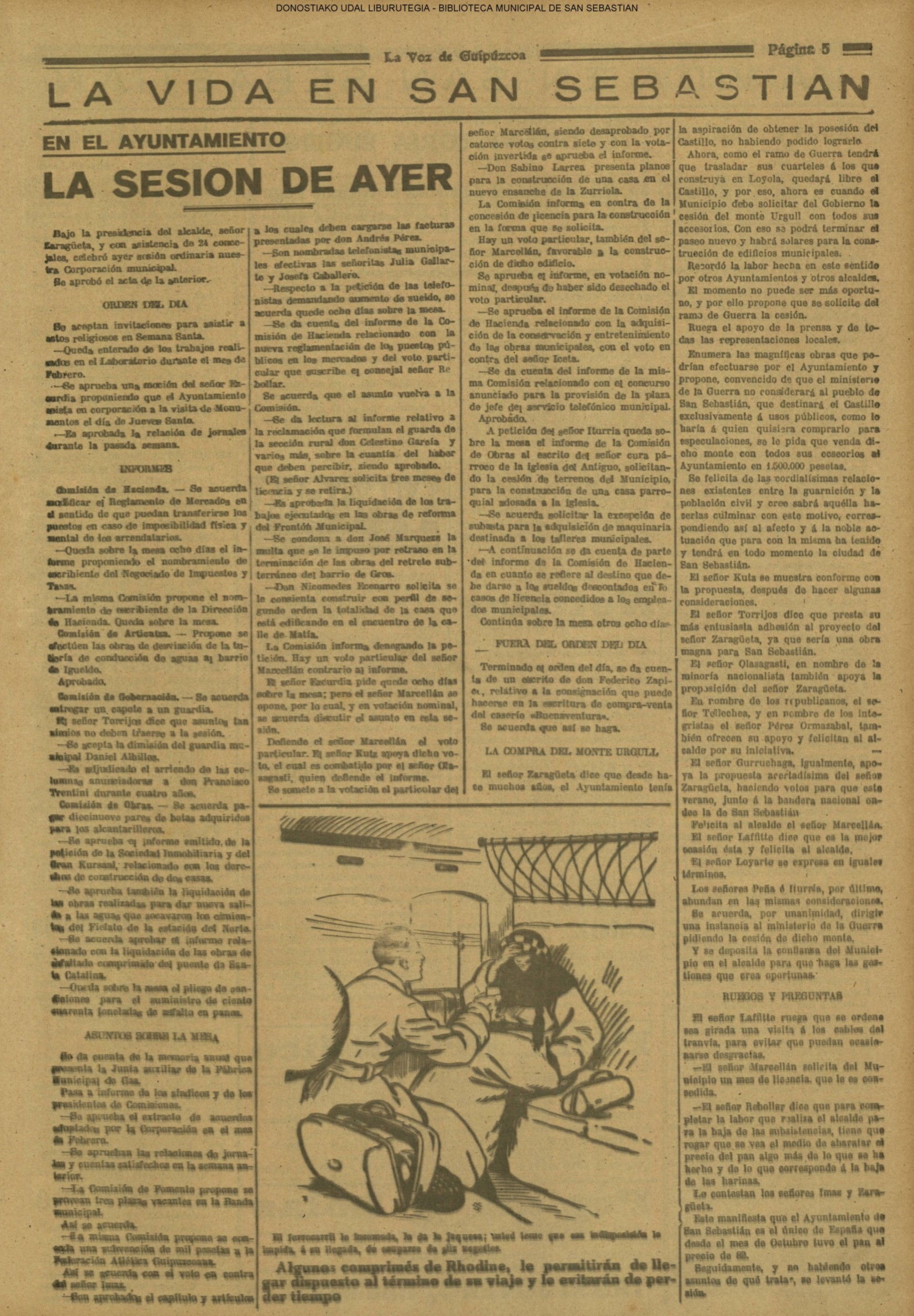 (1901).—Represéntase en el teatro Principal, por primera vez en San Sebastián, la zarzuela de Selles, con música de Vives, "La balada de la luz", que fué muy del agrado del público. (1906) (1910) El arquitecto D. Eugenio Elgarresta es nombrado profesor de Estereotomía, Construcción y Dibujo aplicado de la Escuela de Artes y Oficios. 1910 - PLENO MUNICIPAL (La Constancia : diario íntegro fuerista //@ - El Correo de Guipúzcoa : diario tradicionalista //@ - El Pueblo Vasco : diario independiente //@ - La Voz de Guipúzcoa: diario republicano (1911) (1916) (1921)- PLENO MUNICIPAL : -El Ayuntamiento que preside el señor Zaragüeta, por acuerdo unánime, decide la compra del Monte Urgull al Ministerio de la Guerra dado que se van a construir nuevos cuarteles en el barrio de Loyola. La cantidad a abonar es de 1.500.000 pesetas. (La Voz de Guipúzcoa)(El Pueblo Vasco))(La Constancia) (1926) 1929 - El Ayuntamiento adquiere la totalidad de las acciones del establecimiento "La Perla del Océano", por un importe de 1.525.000 pesetas. - El mismo día y en relación con la recogida de basuras acuerda la compra de 11 camiones automóviles de tracción eléctrica y 9 metros cúbicos de capacidad cada uno, así como la instalación de un horno crematorio pues "los informes de los técnicos en todas las ciudades que se preocupan del problema sanitario prueban que el único medio de asegurar una perfecta esterilización de las basuras es la cremación de las mismas"