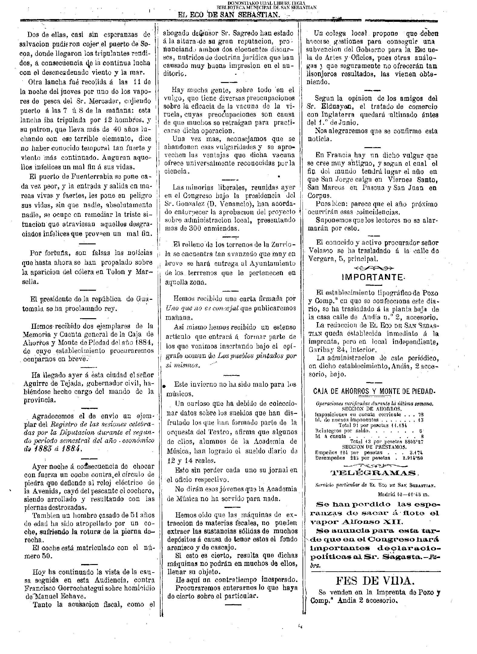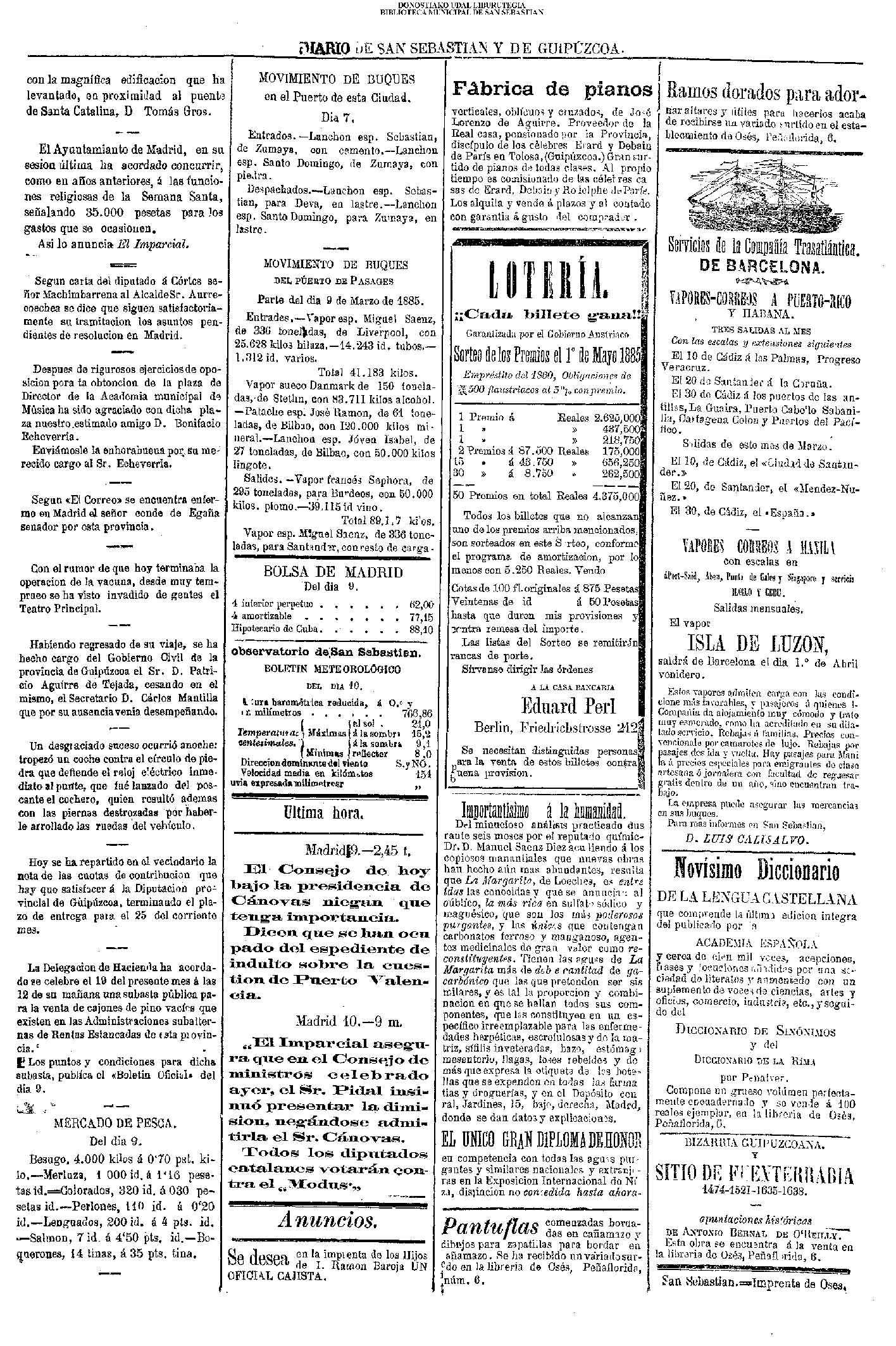 | (LUNES) (*).- GESTIONES DE LA EMBAJADA GUIPUZCOANA EN MADRID, para recabar la solución del problema del Puerto de Pasajes. # Reunión previa .- A la Presidencia acude también el alcalde de Barcelona y presidente de la Trasatlántica, conde de Güell .- El Gobierno ofrece dos millones y medio de pesetas durante veinte años .- Se hará un empréstito de 31 millones de pesetas al cinco por ciento. (LVG.10/03/p.01) |