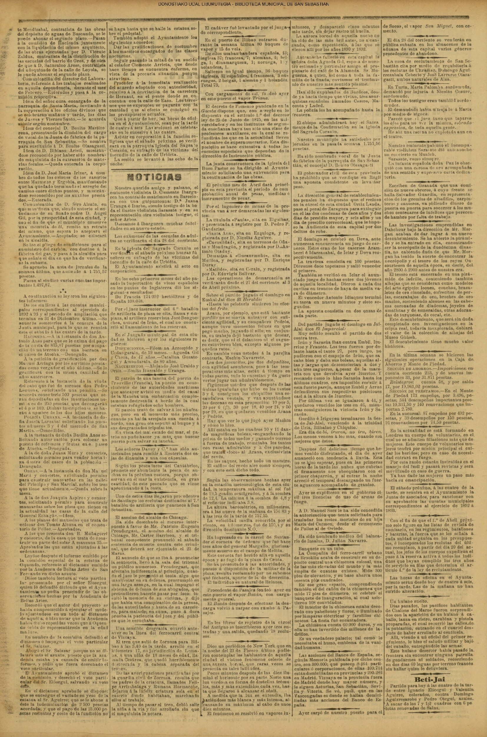 1817 - Informe de la Junta sobre las parcelas existentes en la ciudad destruida. La burguesía local y la aristocracia rural poseen solares de gran tamaño, en su mayoría concentrados. Así Salvatierra es dueño de toda la manzana 4, con acceso de la calle Mayor y Campanario; San Millán, de la manzana 8 y parte de la 18; Villalcázar de la parcela entre la Calle Trinidad y Juan de Bilbao, etc. 1837 - La División de Operaciones de Cantabria, establecida en Alza, desaloja a varias partidas carlistas de su posición en Ametzagaña. En los días siguientes se producen combates en los alrededores de San Sebastián, entre ellos el de Oriamendi con victoria carlista y numerosas bajas en ambos bandos. Se habilitan como hospitales la iglesia de San Vicente y las tres iglesias de Pasajes. 1850 - En relación con el accidente del pasado día 9, el Ayuntamiento acuerda que "la Junta de Beneficencia acoja en los Píos establecimientos a los hijos de los referidos desgraciados (...) y que en sufragio de sus almas se celebren funerales mañana 14 en la Parroquia de Santa María". 1870 : NACE Joaquín Muñoz-Baroja, que entre otros méritos tendrá el de fundador del ORFEÓN DONOSTIARRA. (1872) PLENO MUNICIPAL. ACTA nº13. (1894) PLENO MUNICIPAL
