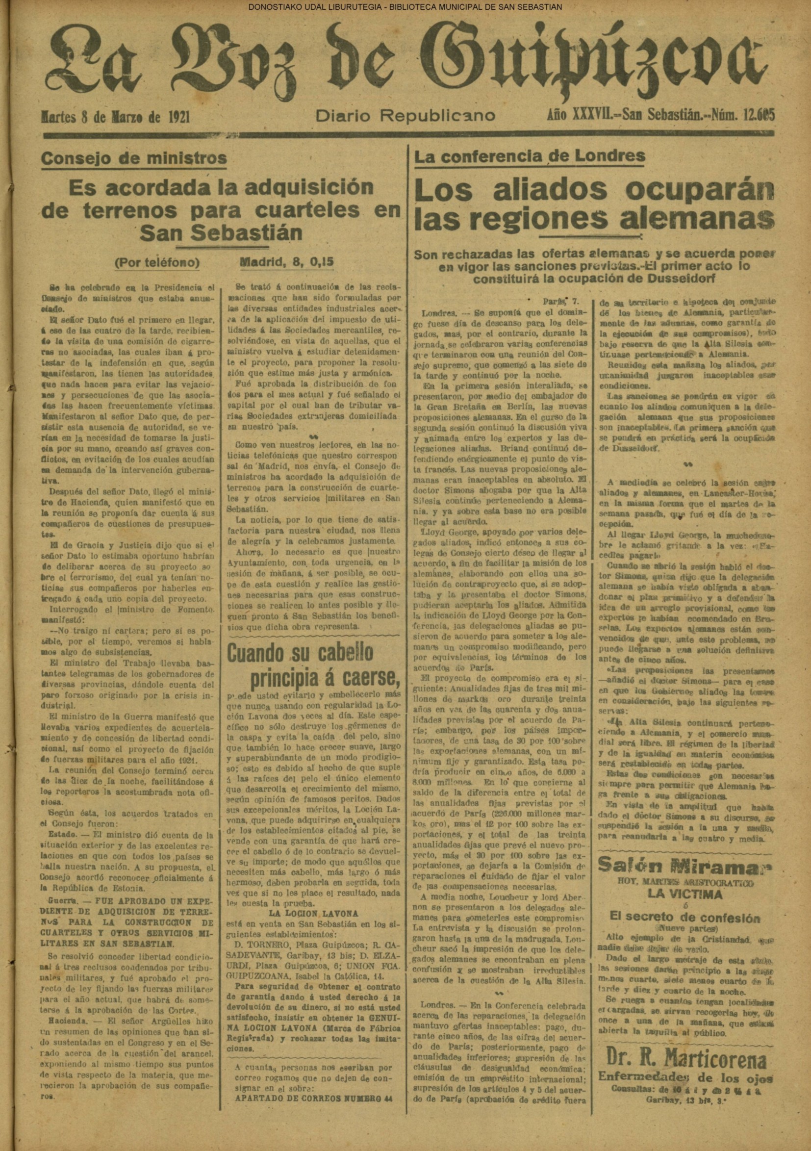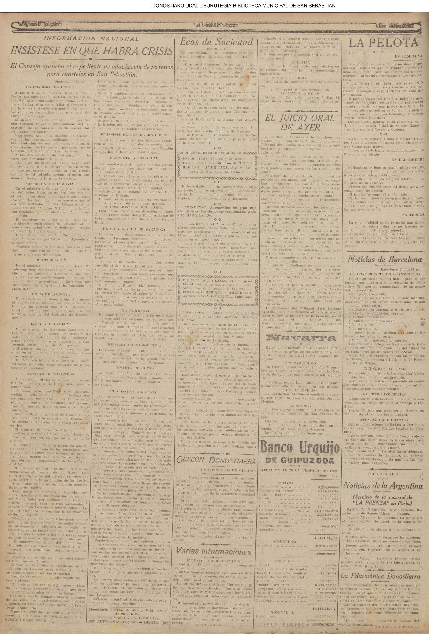(1921) CONSEJO DE MINISTROS - Es acordada la adquisición de terrenos para cuarteles en San Sebastián
