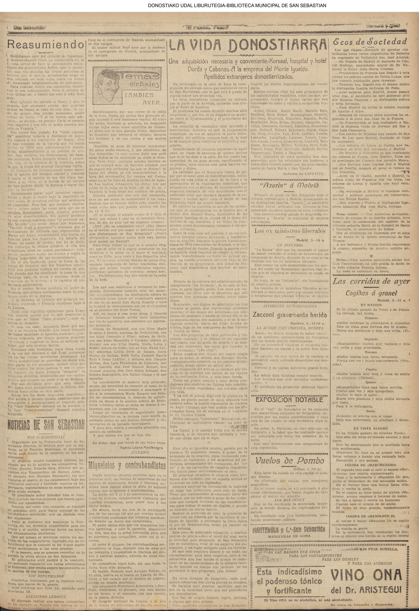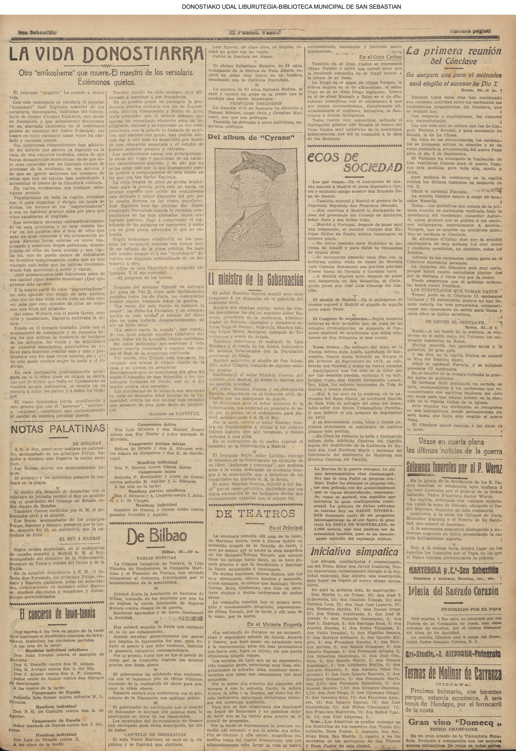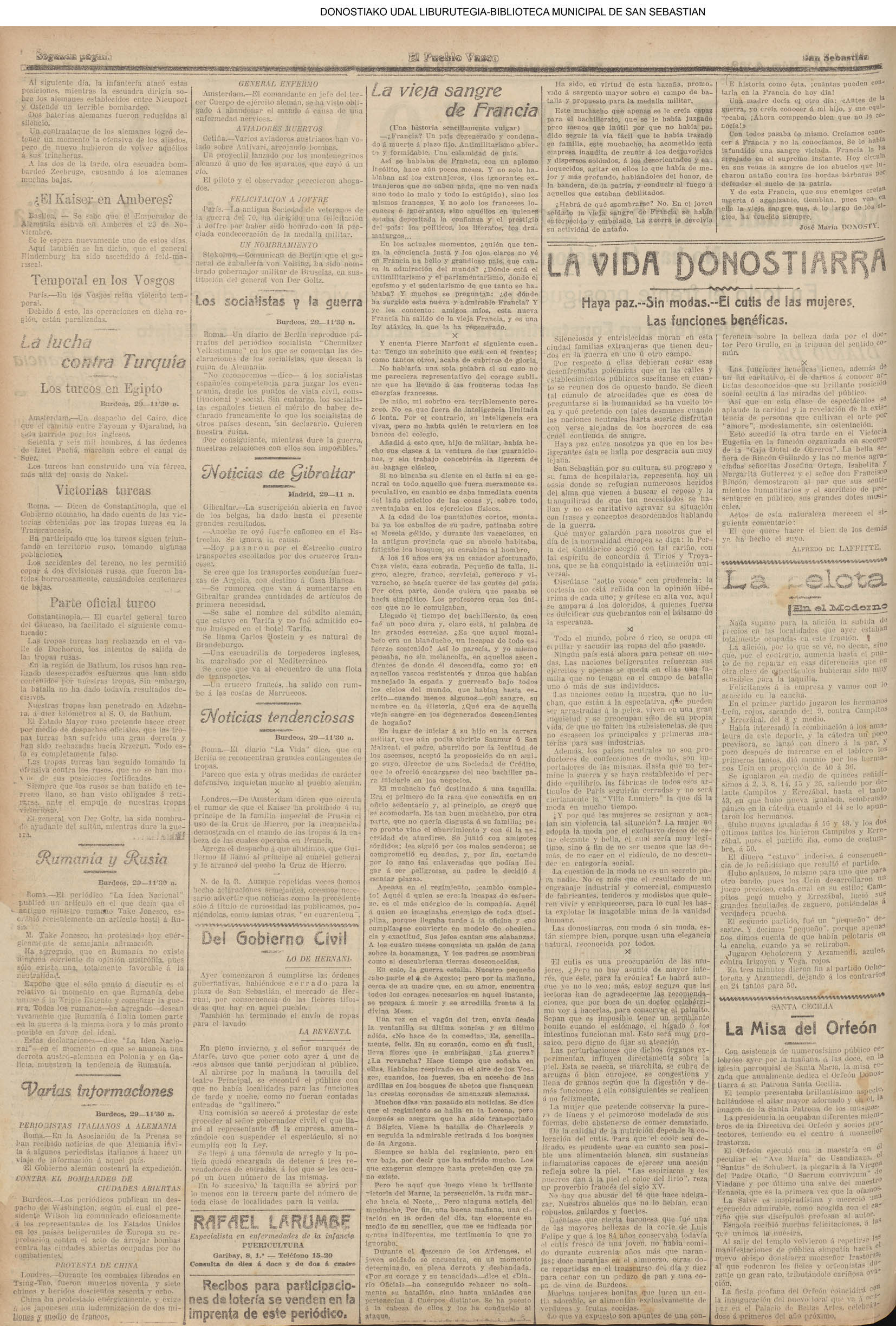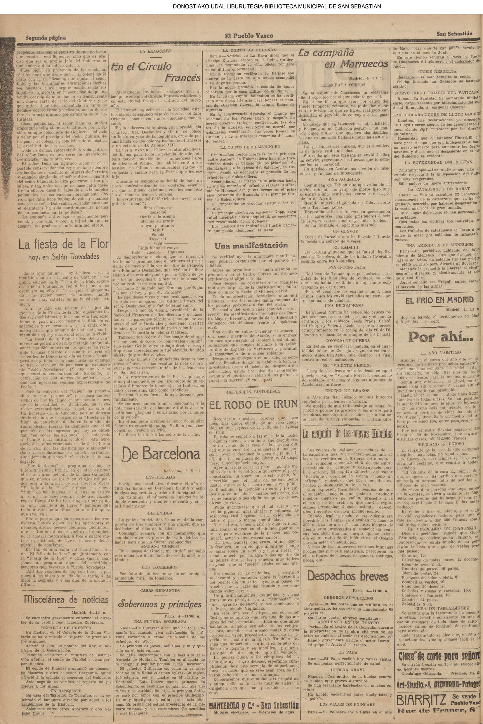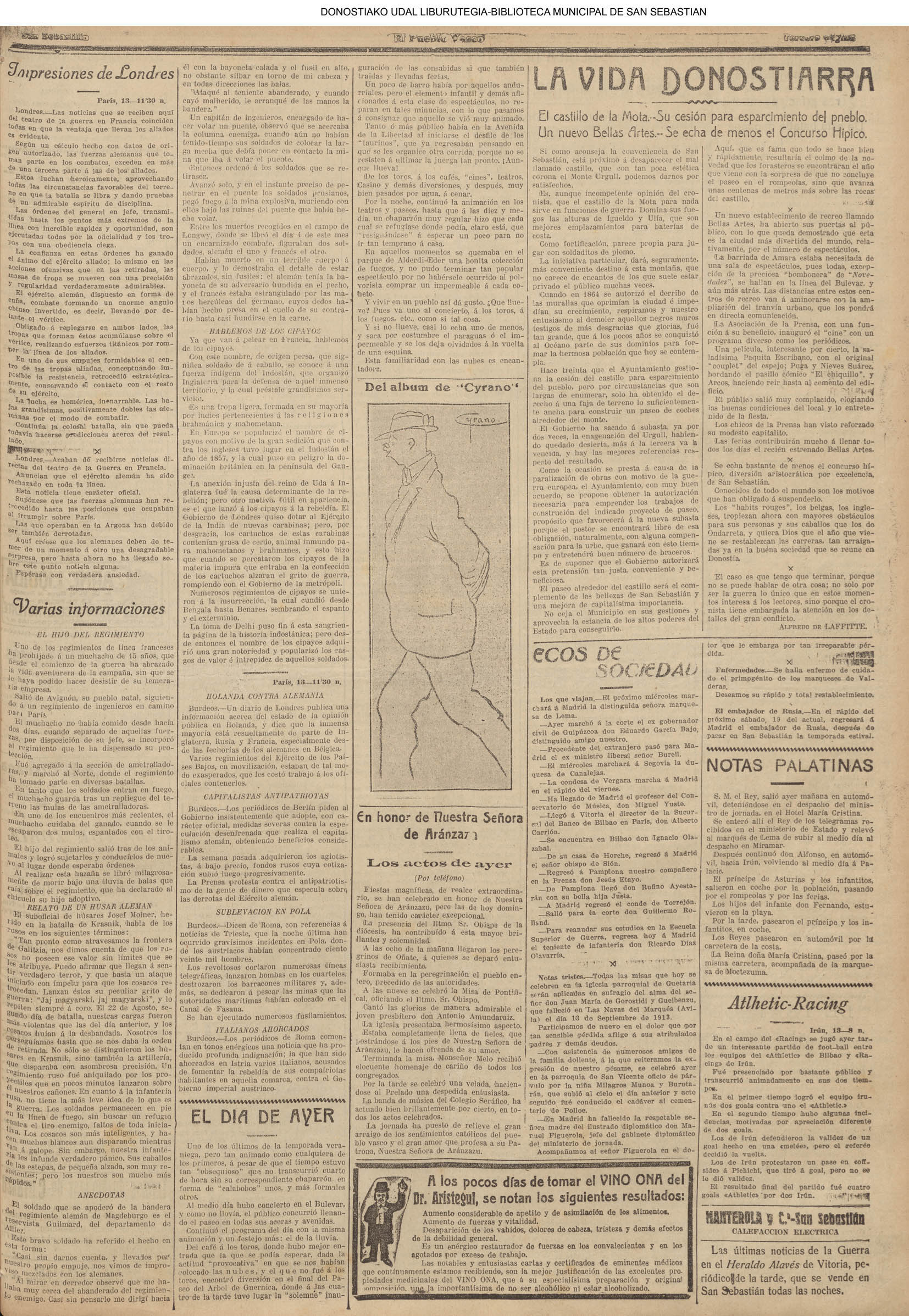 Con la venia del tiempo - que no está, ciertamente, para otorgar muchos favores - el pueblo donostiarra se entregará hoy a las alegrias propias de la fiesta de su patrón y de su nombre : ¡San Sebastián! Un motivo de duelo suprime este año la clásica tamborrada; pero no por eso faltarán festejos que puedan divertir a los vecinos..... que tengan humor para ello. A las diez de la mañana, la banda municipal recorrerá las calles de la ciudad, tocando diana. Se lanzarán también cohetes en la abundancia que se pueda. A las diez y media, el Ayuntamiento en corporación y con maceros, se dirigira a la iglesia de Santa María para asistir a la misa mayor. A las once se verificará el acto de descubrir la lápida colocada en la casa donde vivió el maestro donostiarra Sarriegui. La comitiva saldrá de la Plaza de la Constitución, forméndola representaciones de todas las sociedades de recreo y elementos populares. Irá también la Comisión de Fomento y marcharán a la cabeza el Orfeón Donostiarra y la Banda Municipal, ejecutando ésta durante el trayecto la gran marcha de Gounod. Al descubrirse la lápida cantará el Orfeón la célebre composición vasca del malogrado maestro, titulada "Illunabarra", y la banda ejecutará la marcha de San Sebastián. La Comisión de Fomento estará representada por los señores Nerecán, Pena, Kutz, Saralegui y Delaunet. El señor Nerecán hará uso de la palabra y pronunciará un discurso alusivo al acto. La Sociedad recreativa "Euskal-billera" que se halla situada frente a la casa donde se coloca la lápida, como homenaje al finado maestro, pone a disposición de la comisión municipal su sala, y estará debidamente engalanada, con colgaduras con fleco negro y bandera a media asta con crespón de luto. En el salón de esta popular sociedad se hallarán todos los miembros de la Junta de Festejos, ostentando las nuevas insignias de la asociación. Luego se verificará el regreso en el mismo orden. A las nueve de la noche, se verificará el gran banquete tradicional en la veterana Sociedad donostiarra "Unión Artesana" siendo presidido por el alcalde señor Uhagón. De nueve a once la banda "Iru-chulo" amenizará la plazuela de Lasala, y a las mismas horas lo hará la denominada "La Armonía", en la Plaza de la Constitución. Habrá, claro está, iluminaciones y baile, y cuanto se pida dentro de lo que se pueda dar. Se dará rancho extraordinario a los presos de la cárcel.
