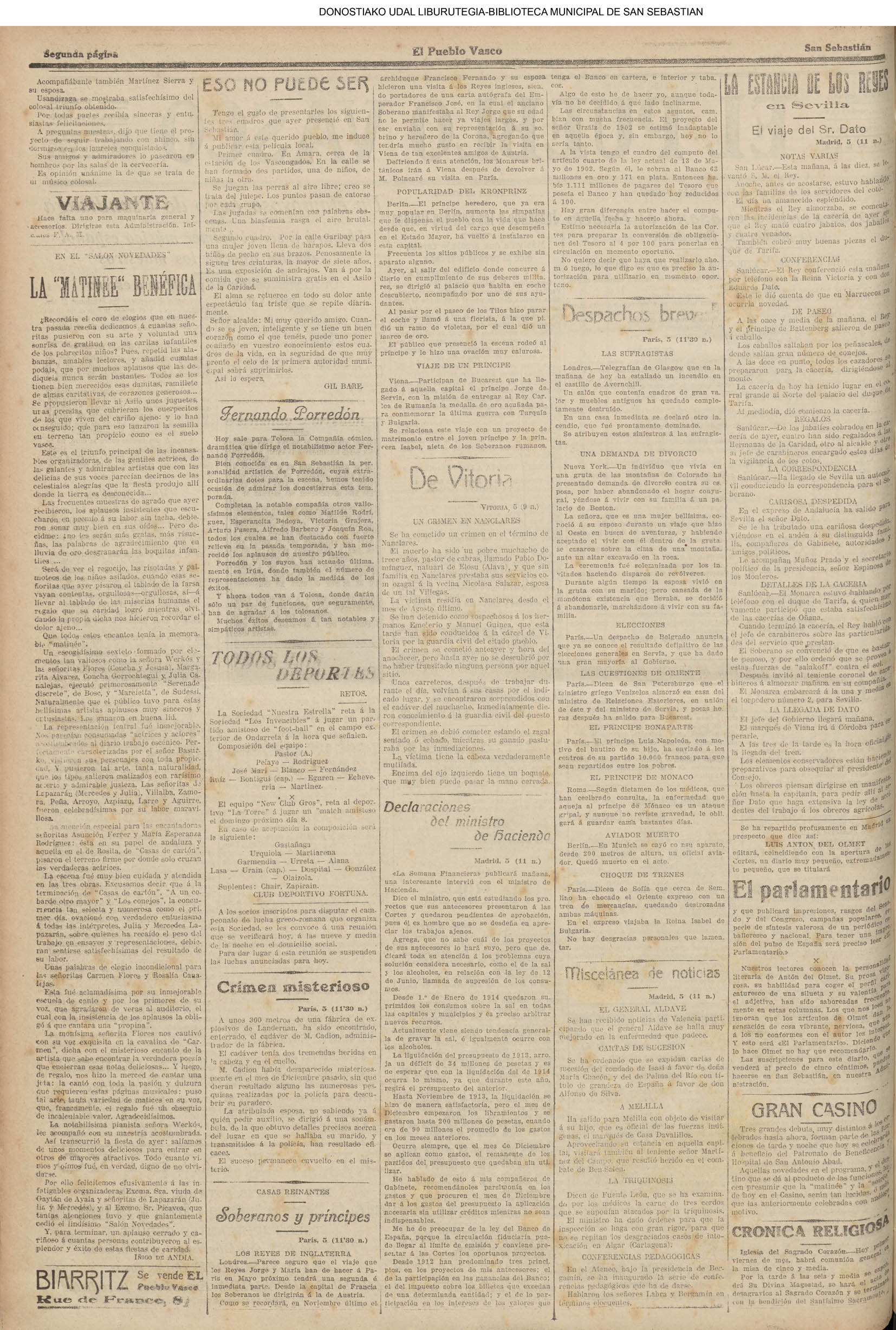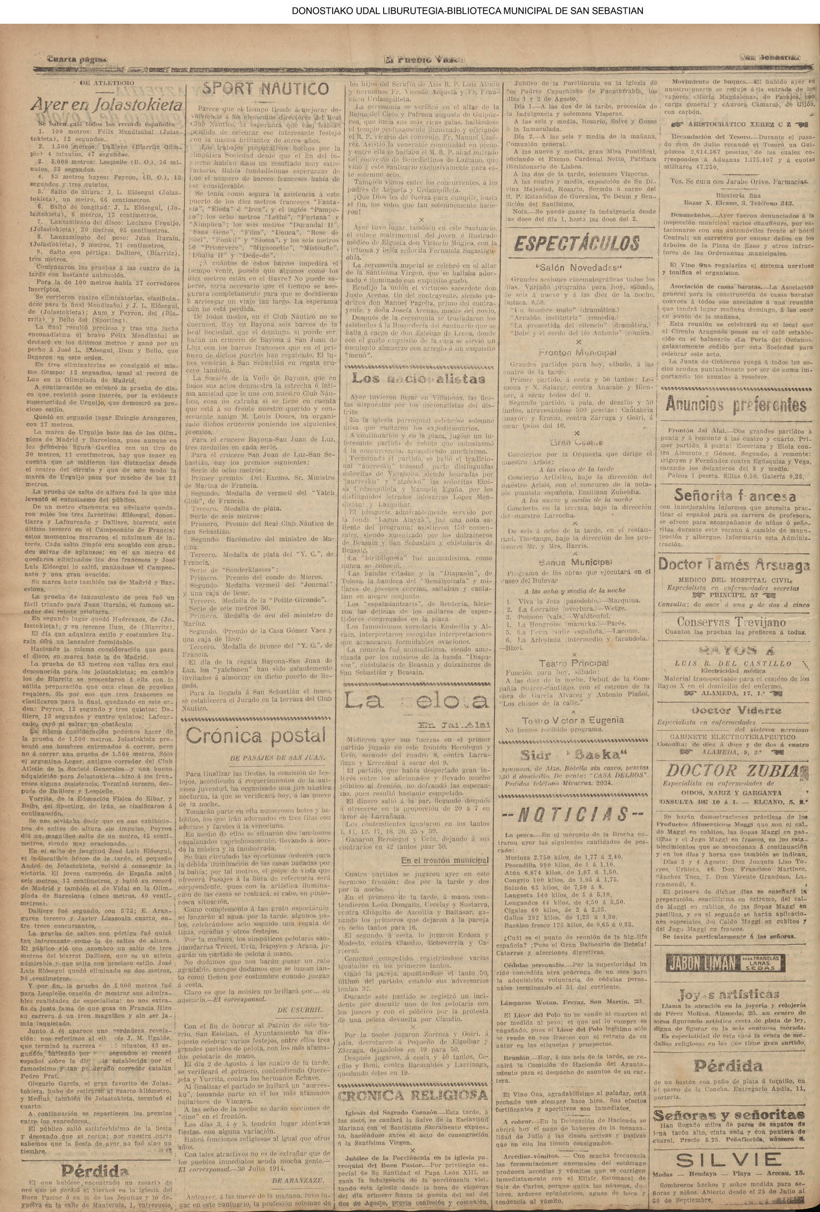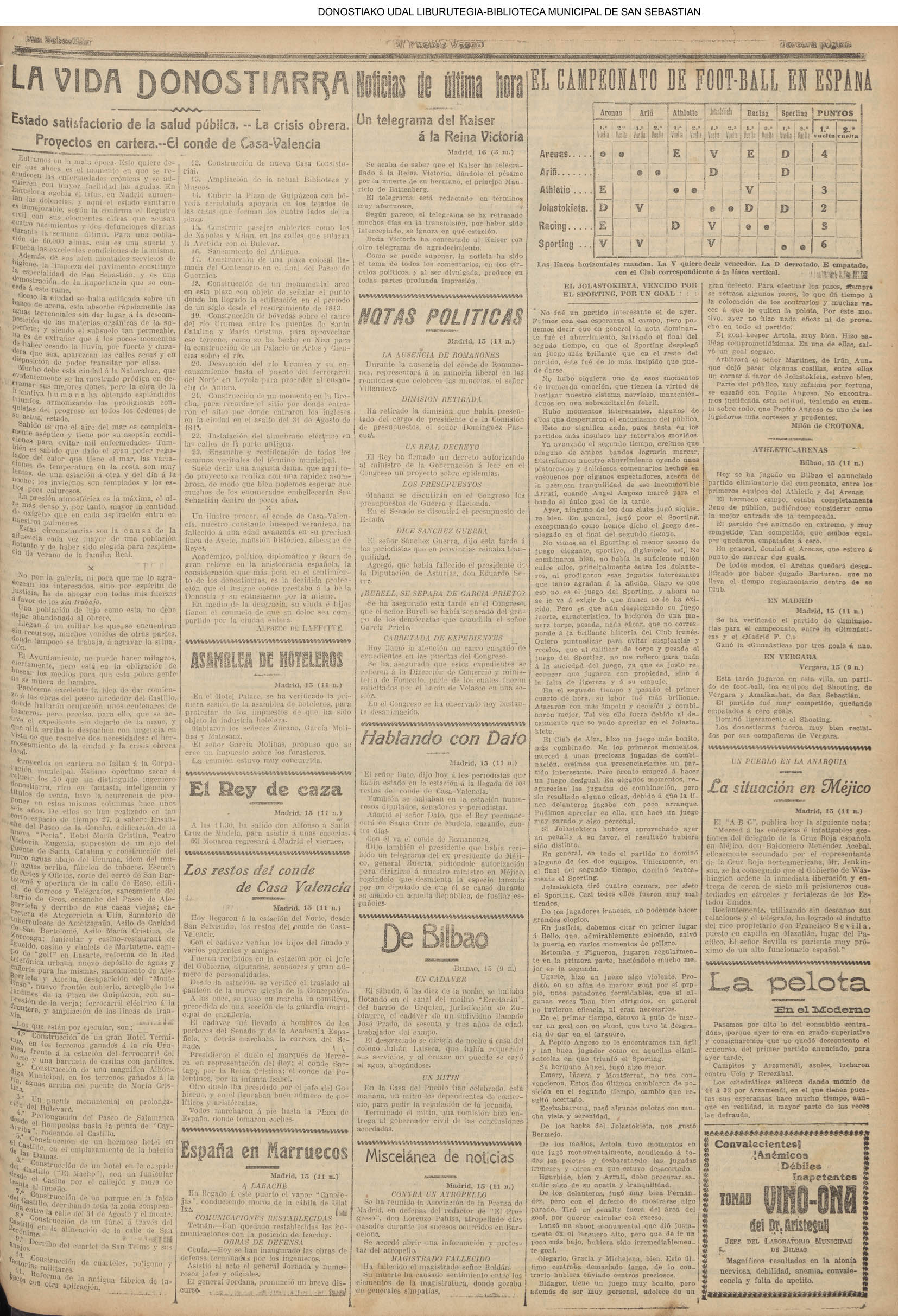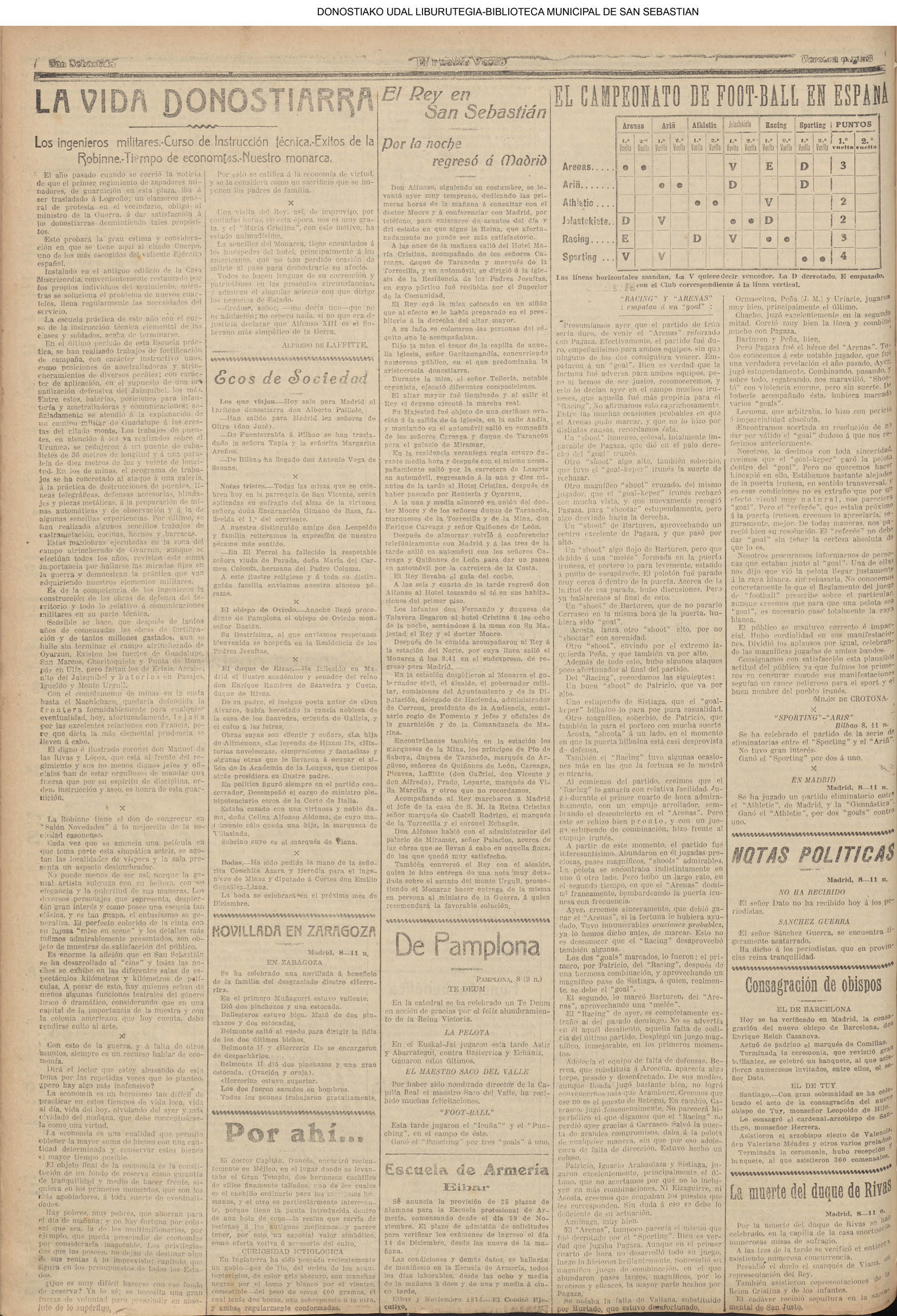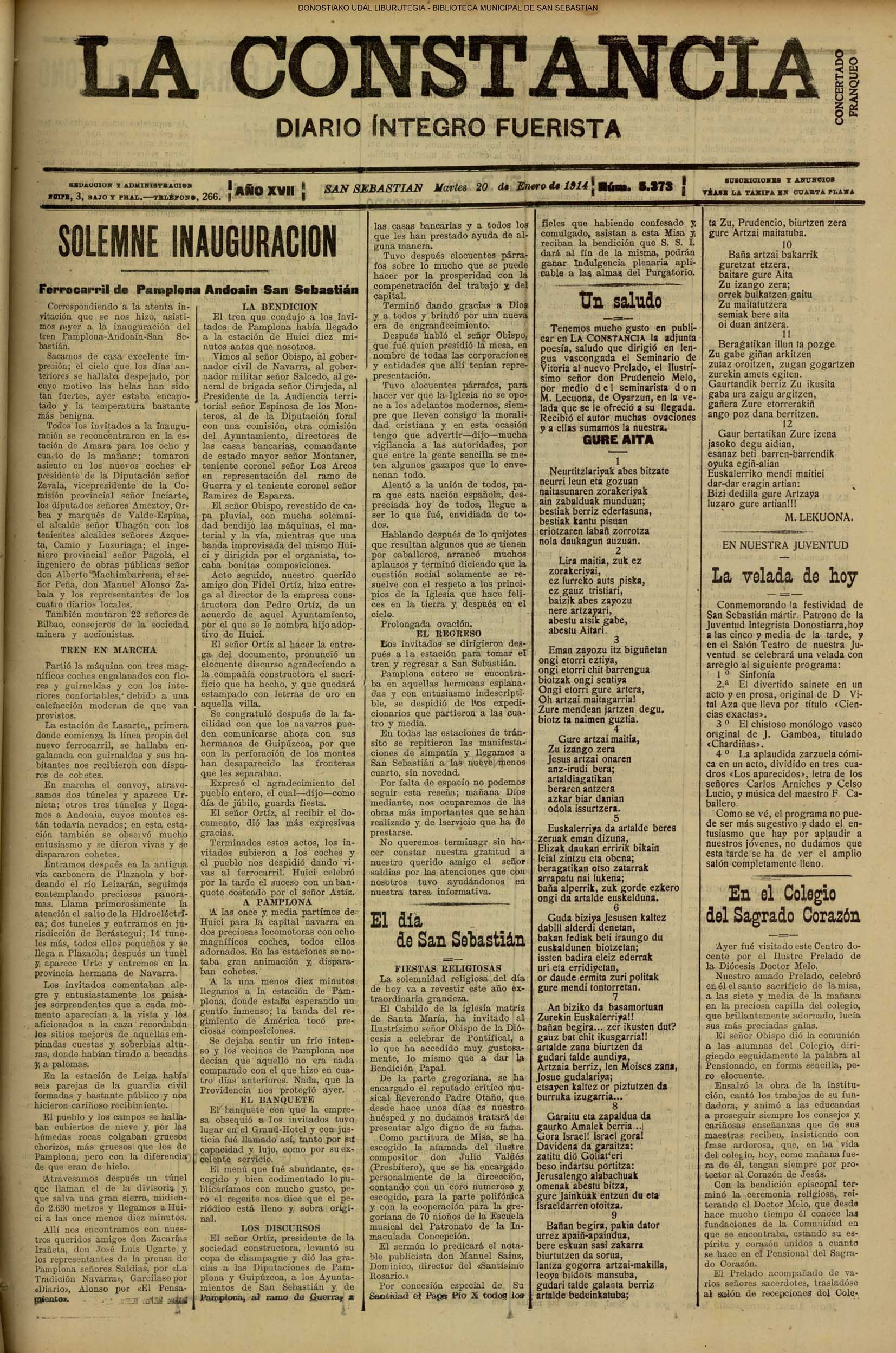 Con la venia del tiempo - que no está, ciertamente, para otorgar muchos favores - el pueblo donostiarra se entregará hoy a las alegrias propias de la fiesta de su patrón y de su nombre : ¡San Sebastián! Un motivo de duelo suprime este año la clásica tamborrada; pero no por eso faltarán festejos que puedan divertir a los vecinos..... que tengan humor para ello. A las diez de la mañana, la banda municipal recorrerá las calles de la ciudad, tocando diana. Se lanzarán también cohetes en la abundancia que se pueda. A las diez y media, el Ayuntamiento en corporación y con maceros, se dirigira a la iglesia de Santa María para asistir a la misa mayor. A las once se verificará el acto de descubrir la lápida colocada en la casa donde vivió el maestro donostiarra Sarriegui. La comitiva saldrá de la Plaza de la Constitución, forméndola representaciones de todas las sociedades de recreo y elementos populares. Irá también la Comisión de Fomento y marcharán a la cabeza el Orfeón Donostiarra y la Banda Municipal, ejecutando ésta durante el trayecto la gran marcha de Gounod. Al descubrirse la lápida cantará el Orfeón la célebre composición vasca del malogrado maestro, titulada "Illunabarra", y la banda ejecutará la marcha de San Sebastián. La Comisión de Fomento estará representada por los señores Nerecán, Pena, Kutz, Saralegui y Delaunet. El señor Nerecán hará uso de la palabra y pronunciará un discurso alusivo al acto. La Sociedad recreativa "Euskal-billera" que se halla situada frente a la casa donde se coloca la lápida, como homenaje al finado maestro, pone a disposición de la comisión municipal su sala, y estará debidamente engalanada, con colgaduras con fleco negro y bandera a media asta con crespón de luto. En el salón de esta popular sociedad se hallarán todos los miembros de la Junta de Festejos, ostentando las nuevas insignias de la asociación. Luego se verificará el regreso en el mismo orden. A las nueve de la noche, se verificará el gran banquete tradicional en la veterana Sociedad donostiarra "Unión Artesana" siendo presidido por el alcalde señor Uhagón. De nueve a once la banda "Iru-chulo" amenizará la plazuela de Lasala, y a las mismas horas lo hará la denominada "La Armonía", en la Plaza de la Constitución. Habrá, claro está, iluminaciones y baile, y cuanto se pida dentro de lo que se pueda dar. Se dará rancho extraordinario a los presos de la cárcel.