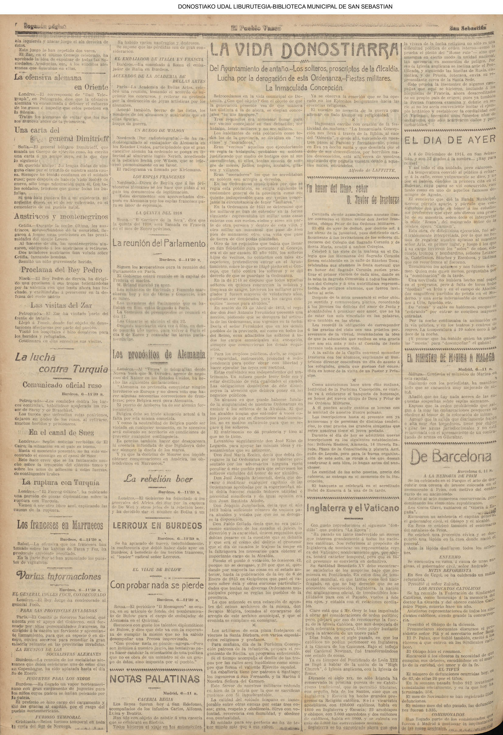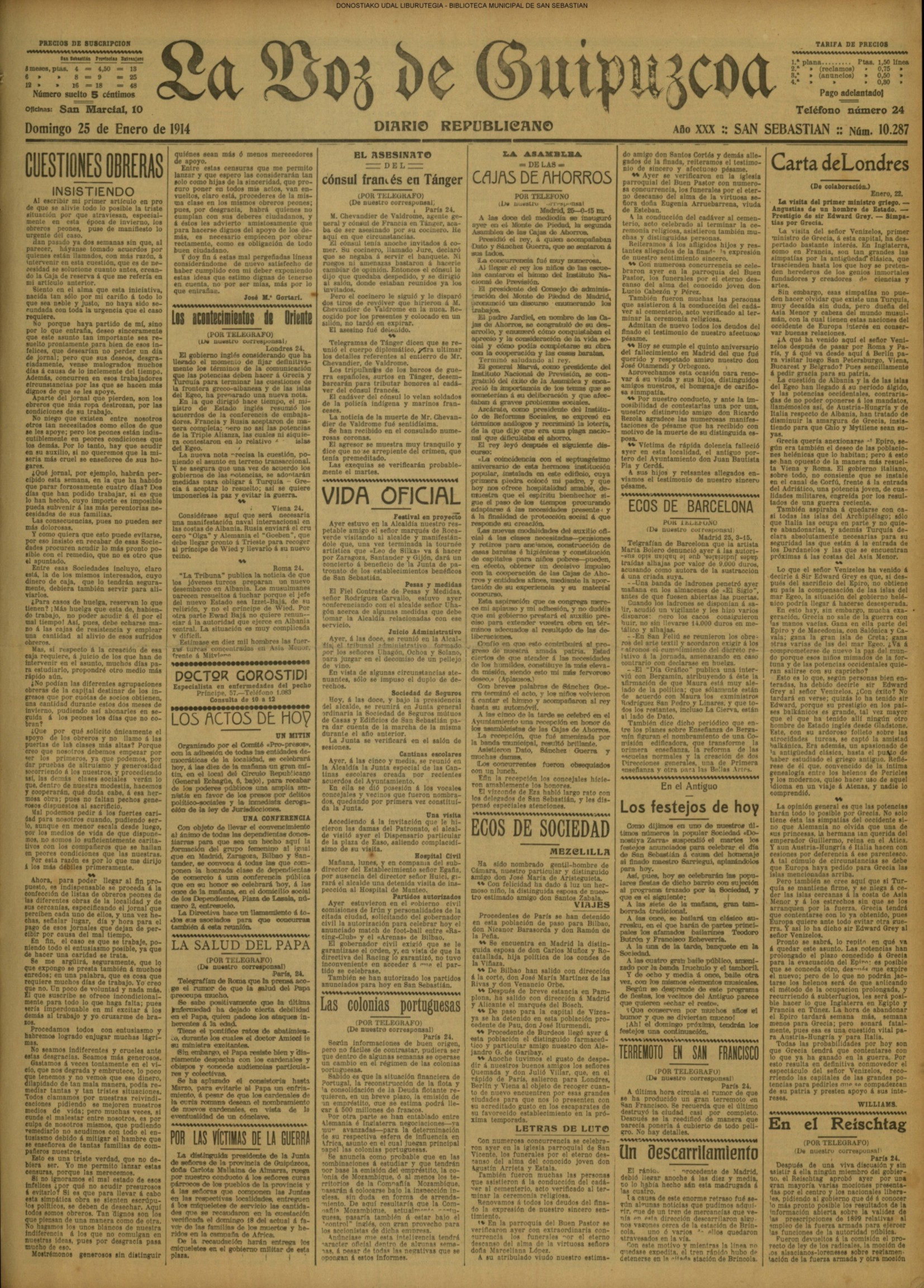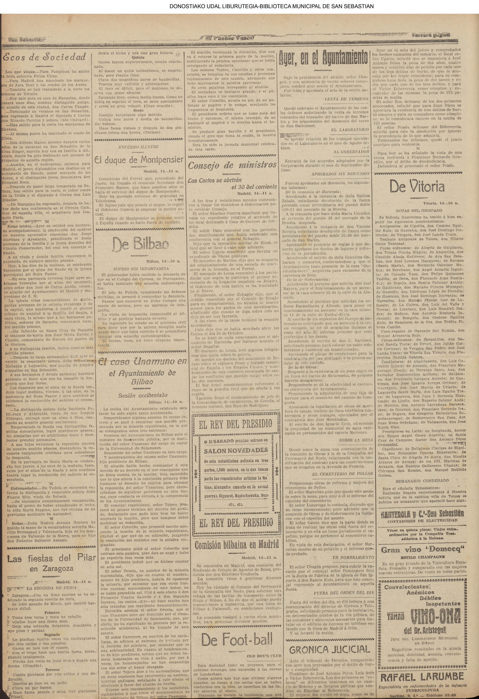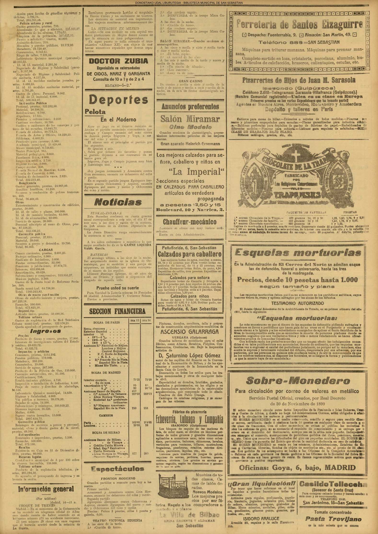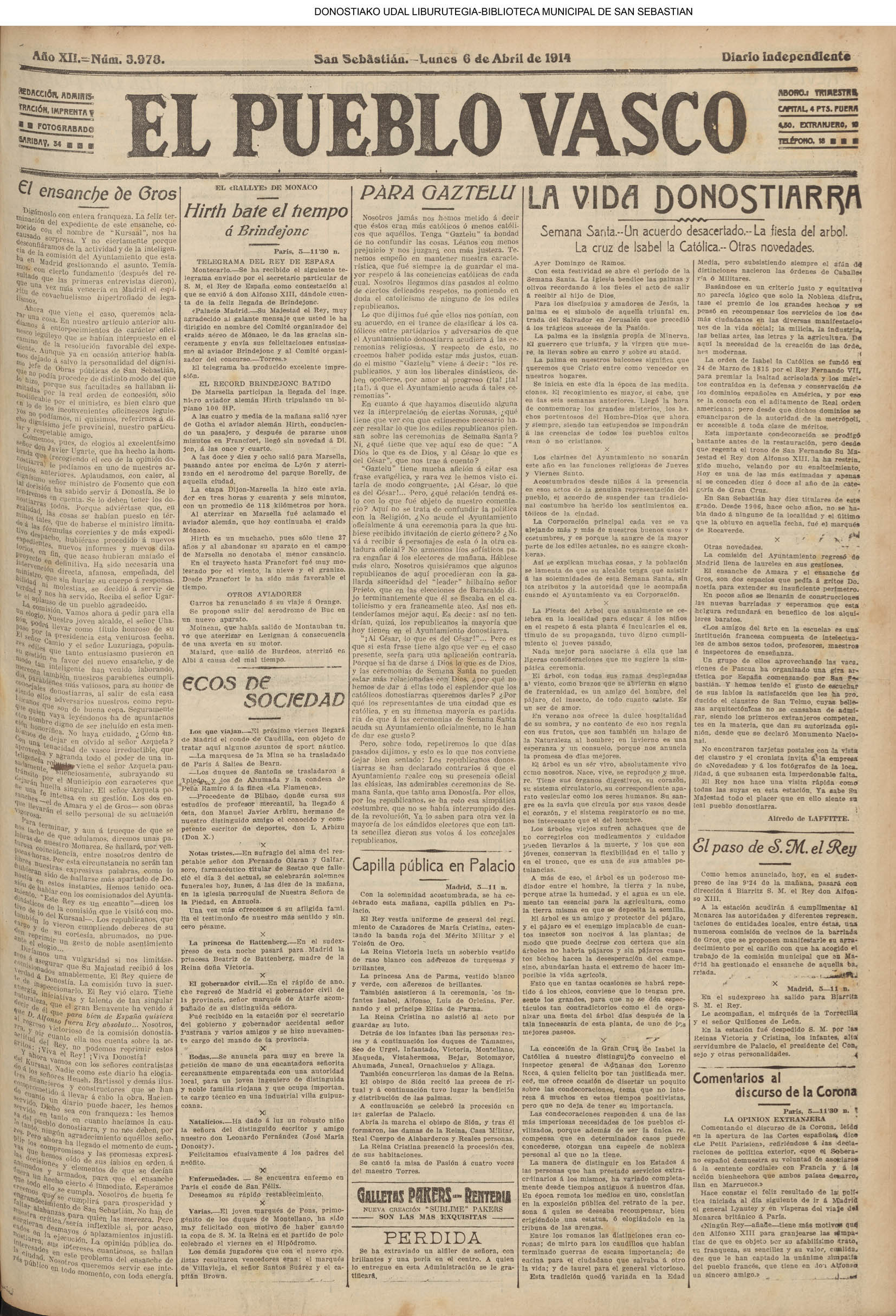 Con la venia del tiempo - que no está, ciertamente, para otorgar muchos favores - el pueblo donostiarra se entregará hoy a las alegrias propias de la fiesta de su patrón y de su nombre : ¡San Sebastián! Un motivo de duelo suprime este año la clásica tamborrada; pero no por eso faltarán festejos que puedan divertir a los vecinos..... que tengan humor para ello. A las diez de la mañana, la banda municipal recorrerá las calles de la ciudad, tocando diana. Se lanzarán también cohetes en la abundancia que se pueda. A las diez y media, el Ayuntamiento en corporación y con maceros, se dirigira a la iglesia de Santa María para asistir a la misa mayor. A las once se verificará el acto de descubrir la lápida colocada en la casa donde vivió el maestro donostiarra Sarriegui. La comitiva saldrá de la Plaza de la Constitución, forméndola representaciones de todas las sociedades de recreo y elementos populares. Irá también la Comisión de Fomento y marcharán a la cabeza el Orfeón Donostiarra y la Banda Municipal, ejecutando ésta durante el trayecto la gran marcha de Gounod. Al descubrirse la lápida cantará el Orfeón la célebre composición vasca del malogrado maestro, titulada "Illunabarra", y la banda ejecutará la marcha de San Sebastián. La Comisión de Fomento estará representada por los señores Nerecán, Pena, Kutz, Saralegui y Delaunet. El señor Nerecán hará uso de la palabra y pronunciará un discurso alusivo al acto. La Sociedad recreativa "Euskal-billera" que se halla situada frente a la casa donde se coloca la lápida, como homenaje al finado maestro, pone a disposición de la comisión municipal su sala, y estará debidamente engalanada, con colgaduras con fleco negro y bandera a media asta con crespón de luto. En el salón de esta popular sociedad se hallarán todos los miembros de la Junta de Festejos, ostentando las nuevas insignias de la asociación. Luego se verificará el regreso en el mismo orden. A las nueve de la noche, se verificará el gran banquete tradicional en la veterana Sociedad donostiarra "Unión Artesana" siendo presidido por el alcalde señor Uhagón. De nueve a once la banda "Iru-chulo" amenizará la plazuela de Lasala, y a las mismas horas lo hará la denominada "La Armonía", en la Plaza de la Constitución. Habrá, claro está, iluminaciones y baile, y cuanto se pida dentro de lo que se pueda dar. Se dará rancho extraordinario a los presos de la cárcel.