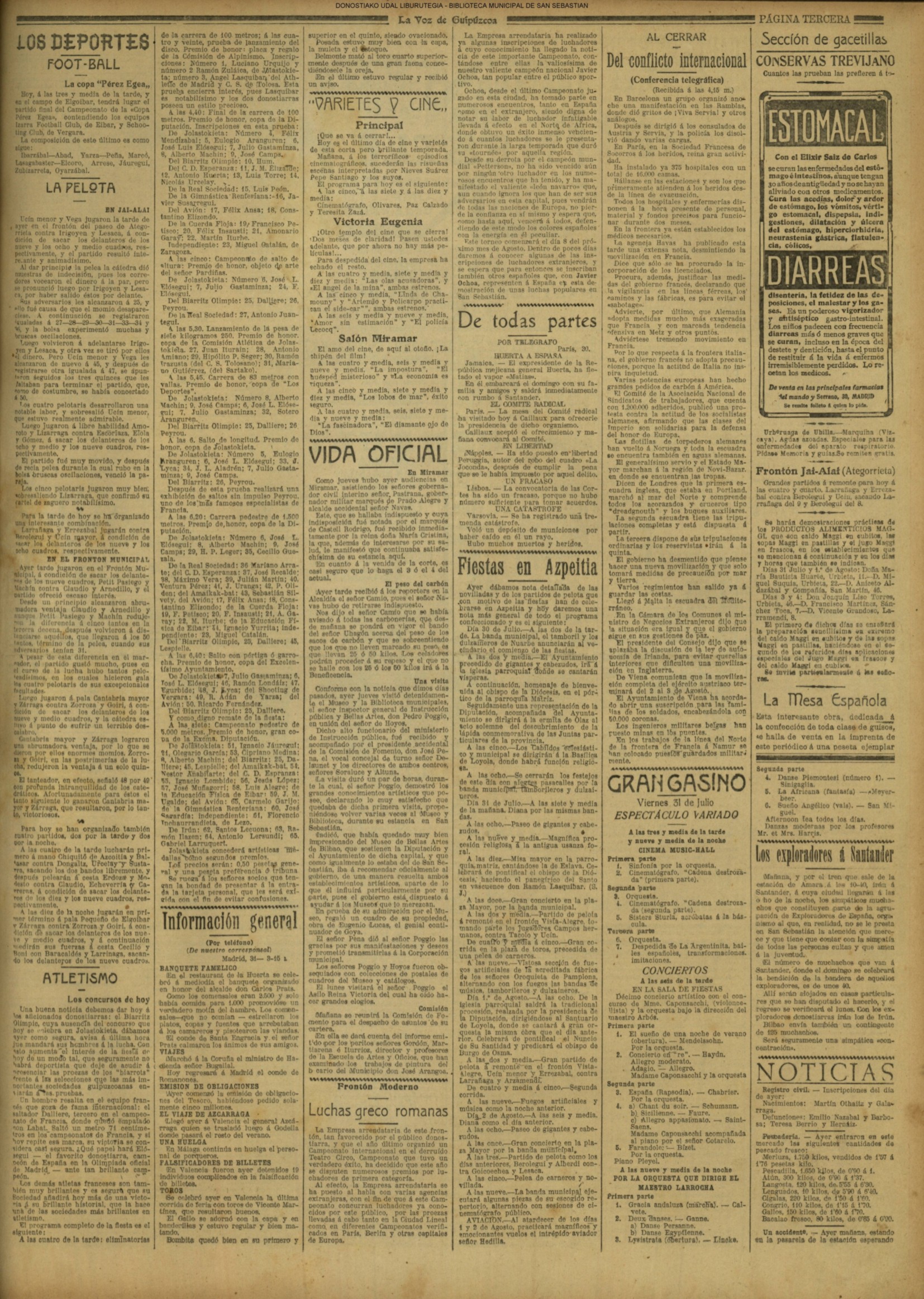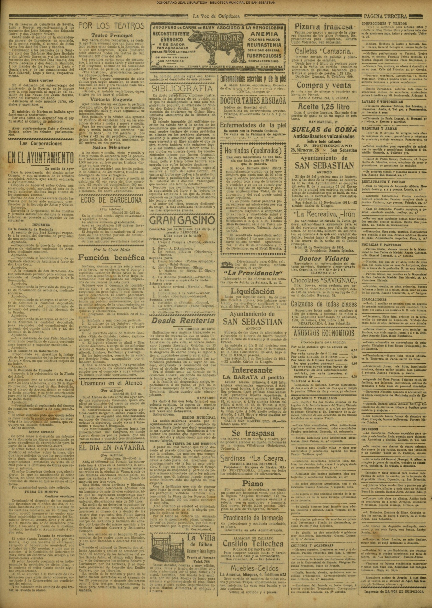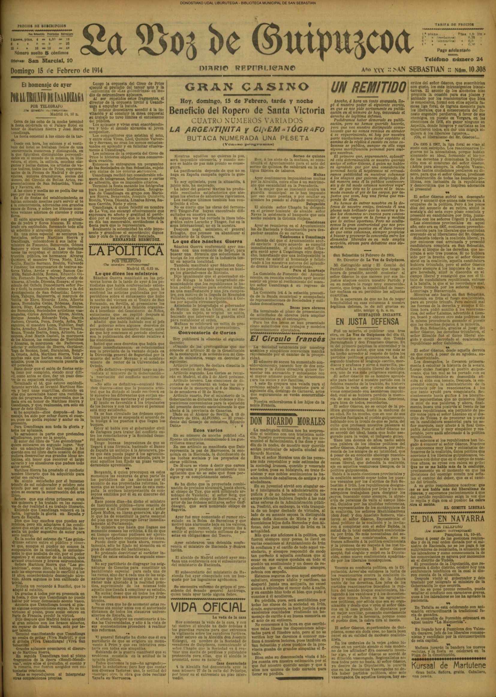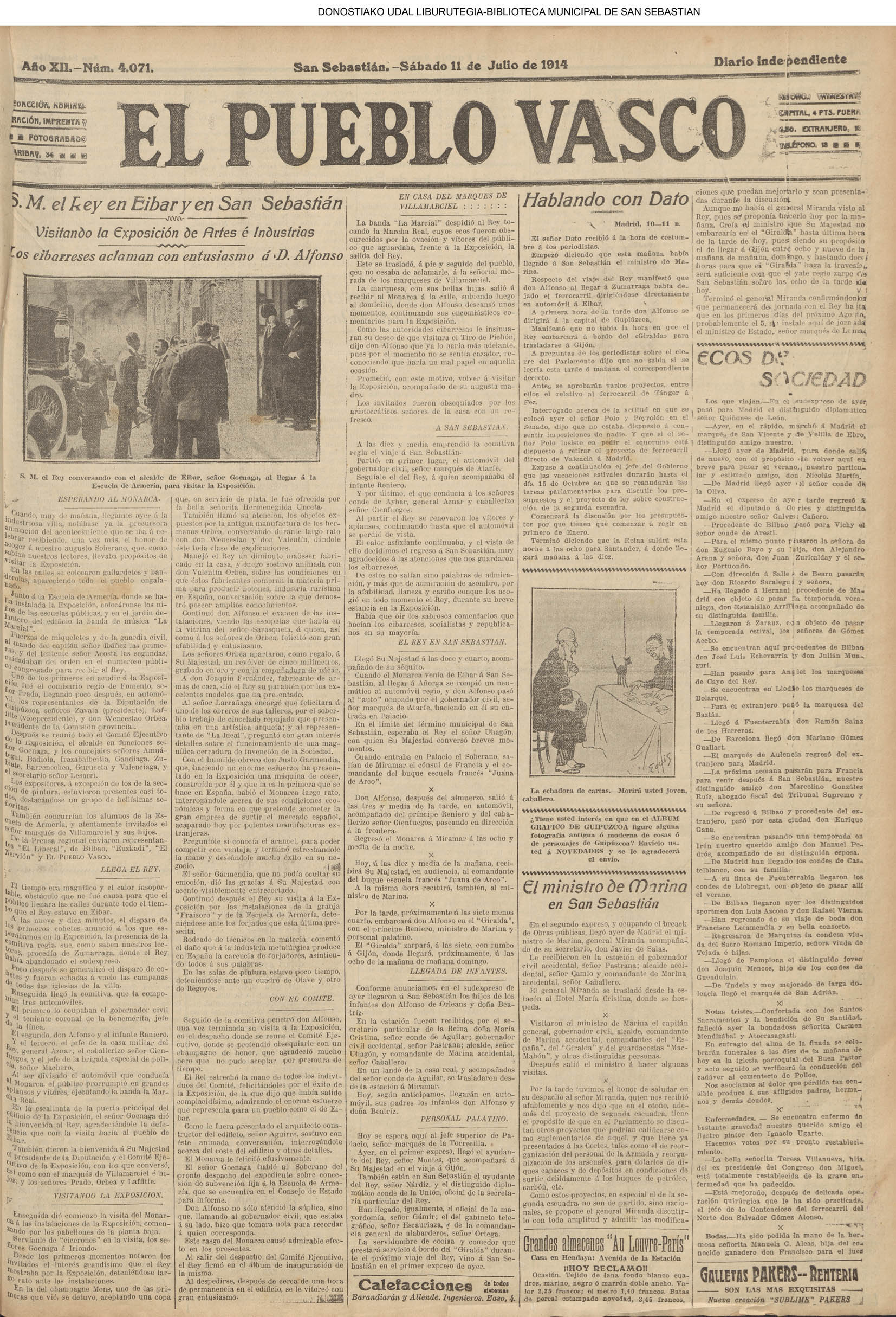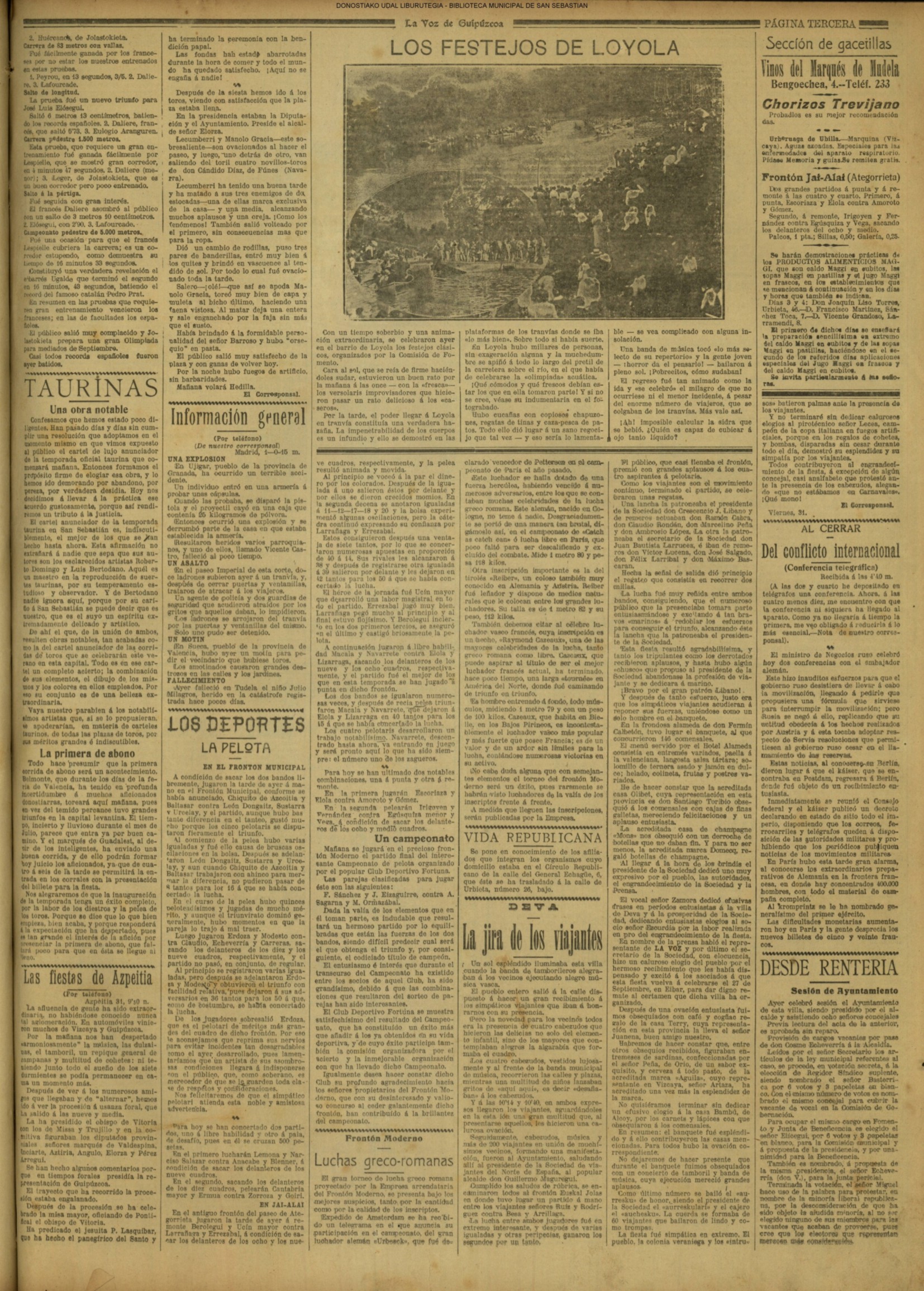 Con la venia del tiempo - que no está, ciertamente, para otorgar muchos favores - el pueblo donostiarra se entregará hoy a las alegrias propias de la fiesta de su patrón y de su nombre : ¡San Sebastián! Un motivo de duelo suprime este año la clásica tamborrada; pero no por eso faltarán festejos que puedan divertir a los vecinos..... que tengan humor para ello. A las diez de la mañana, la banda municipal recorrerá las calles de la ciudad, tocando diana. Se lanzarán también cohetes en la abundancia que se pueda. A las diez y media, el Ayuntamiento en corporación y con maceros, se dirigira a la iglesia de Santa María para asistir a la misa mayor. A las once se verificará el acto de descubrir la lápida colocada en la casa donde vivió el maestro donostiarra Sarriegui. La comitiva saldrá de la Plaza de la Constitución, forméndola representaciones de todas las sociedades de recreo y elementos populares. Irá también la Comisión de Fomento y marcharán a la cabeza el Orfeón Donostiarra y la Banda Municipal, ejecutando ésta durante el trayecto la gran marcha de Gounod. Al descubrirse la lápida cantará el Orfeón la célebre composición vasca del malogrado maestro, titulada "Illunabarra", y la banda ejecutará la marcha de San Sebastián. La Comisión de Fomento estará representada por los señores Nerecán, Pena, Kutz, Saralegui y Delaunet. El señor Nerecán hará uso de la palabra y pronunciará un discurso alusivo al acto. La Sociedad recreativa "Euskal-billera" que se halla situada frente a la casa donde se coloca la lápida, como homenaje al finado maestro, pone a disposición de la comisión municipal su sala, y estará debidamente engalanada, con colgaduras con fleco negro y bandera a media asta con crespón de luto. En el salón de esta popular sociedad se hallarán todos los miembros de la Junta de Festejos, ostentando las nuevas insignias de la asociación. Luego se verificará el regreso en el mismo orden. A las nueve de la noche, se verificará el gran banquete tradicional en la veterana Sociedad donostiarra "Unión Artesana" siendo presidido por el alcalde señor Uhagón. De nueve a once la banda "Iru-chulo" amenizará la plazuela de Lasala, y a las mismas horas lo hará la denominada "La Armonía", en la Plaza de la Constitución. Habrá, claro está, iluminaciones y baile, y cuanto se pida dentro de lo que se pueda dar. Se dará rancho extraordinario a los presos de la cárcel.