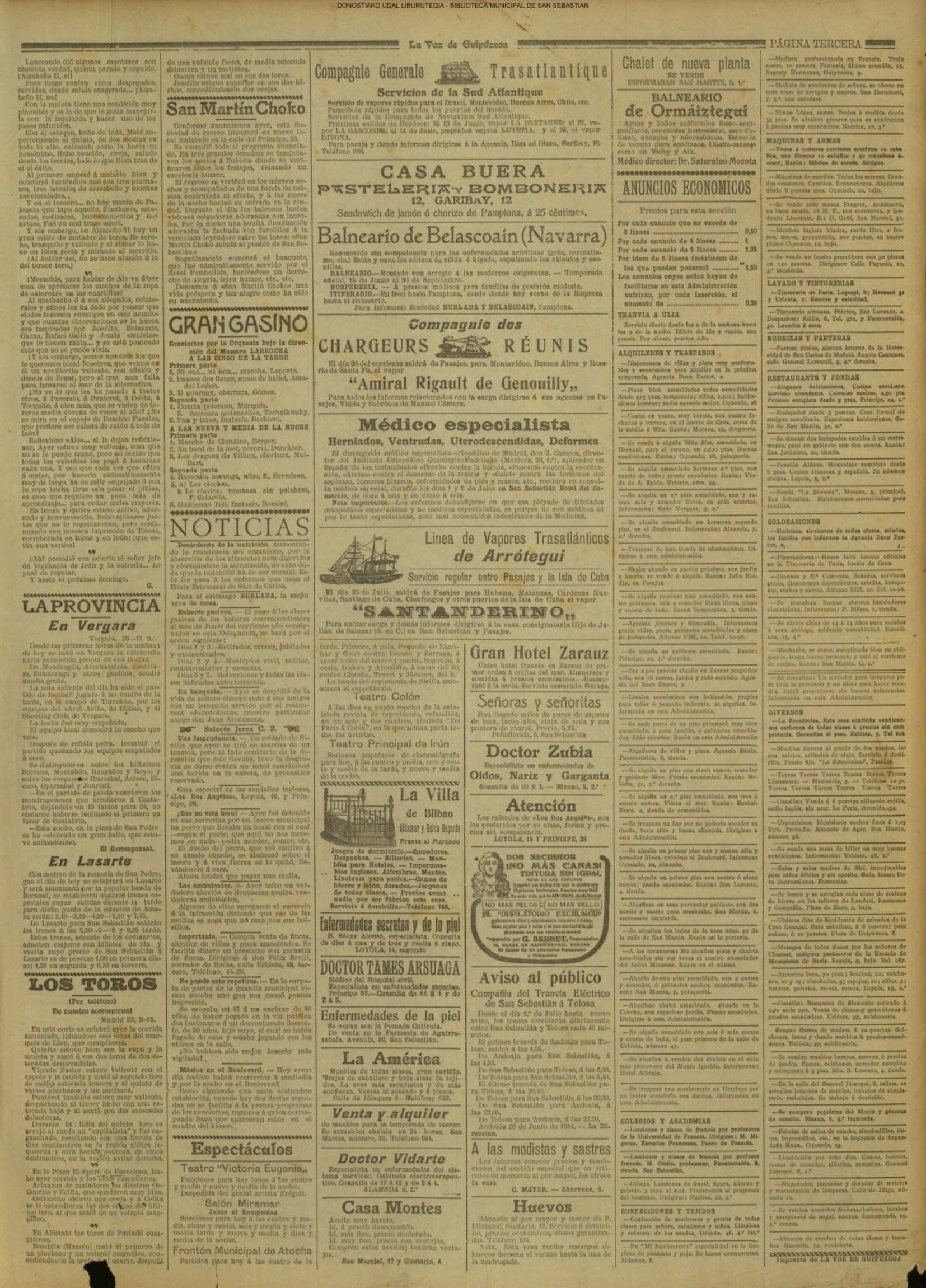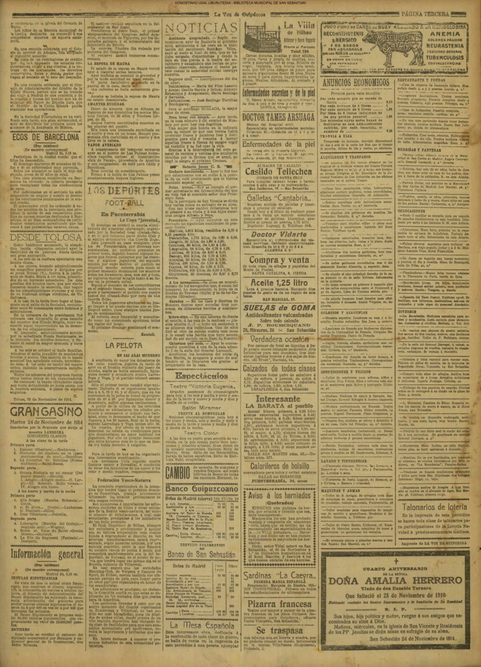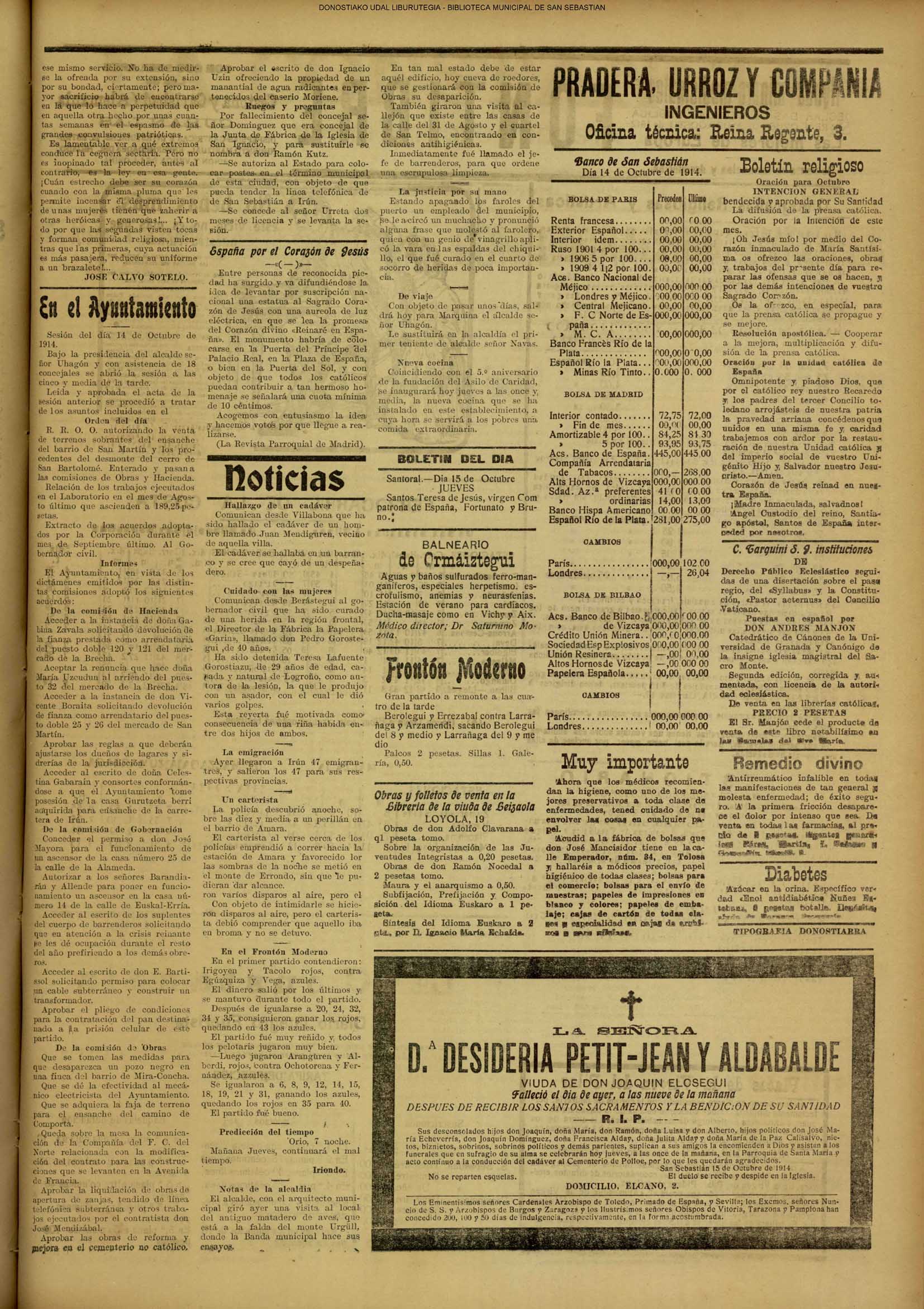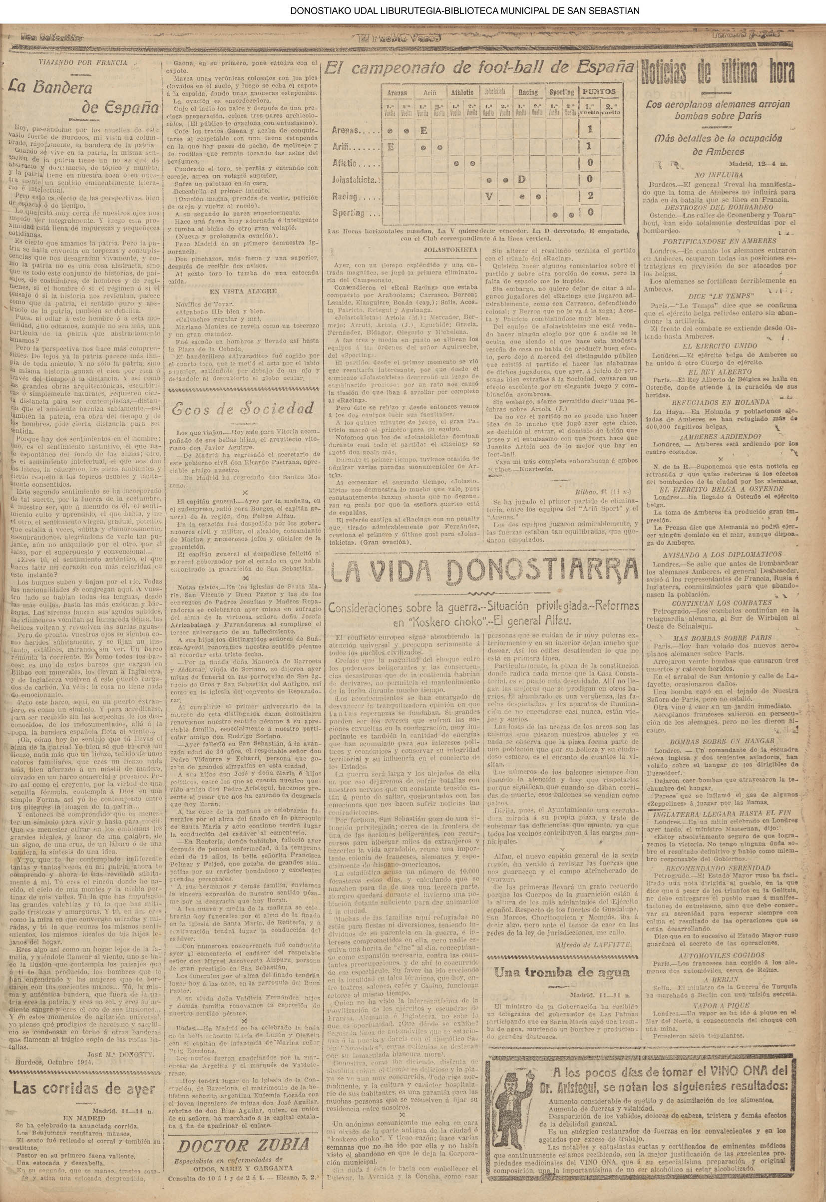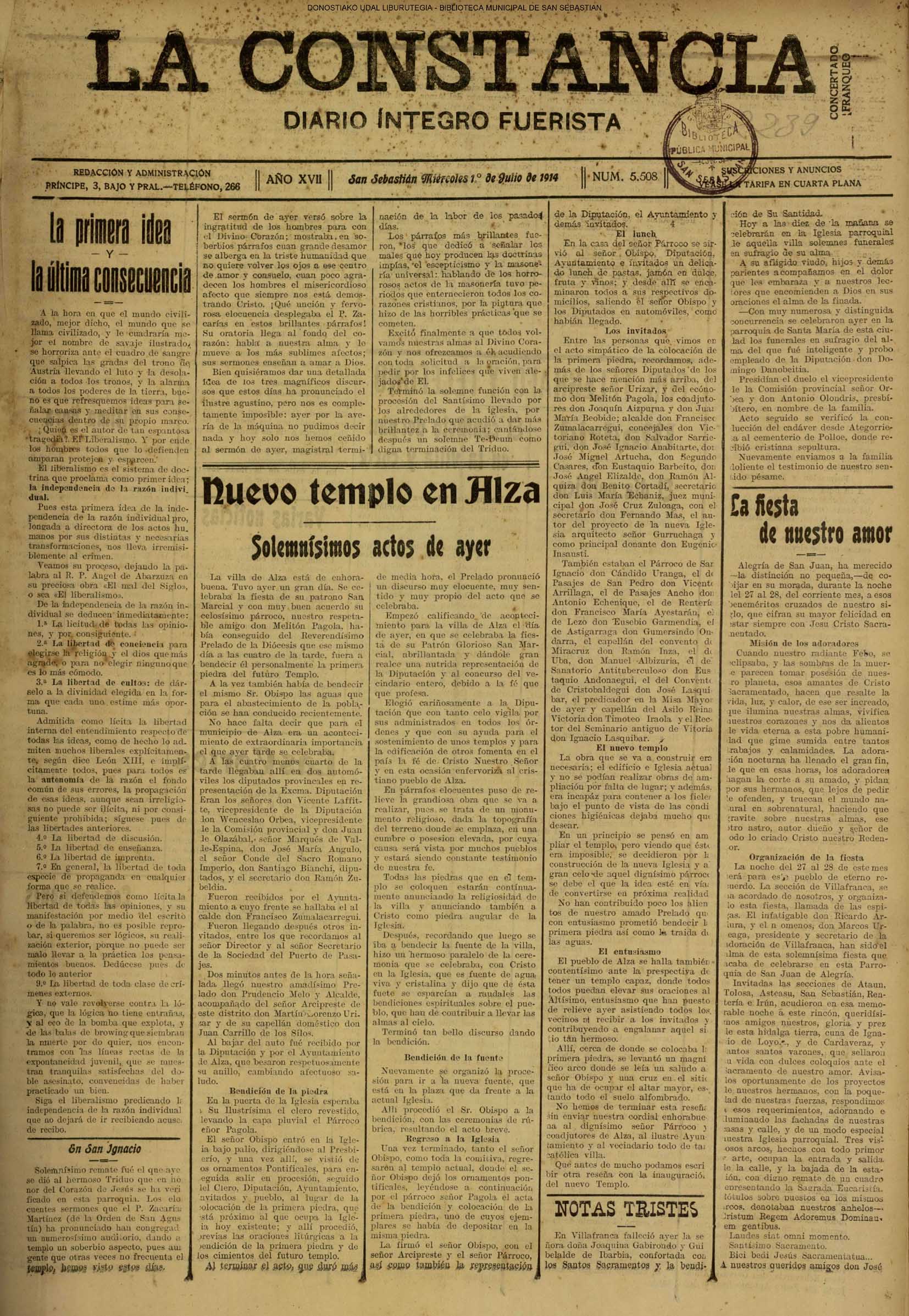 Con la venia del tiempo - que no está, ciertamente, para otorgar muchos favores - el pueblo donostiarra se entregará hoy a las alegrias propias de la fiesta de su patrón y de su nombre : ¡San Sebastián! Un motivo de duelo suprime este año la clásica tamborrada; pero no por eso faltarán festejos que puedan divertir a los vecinos..... que tengan humor para ello. A las diez de la mañana, la banda municipal recorrerá las calles de la ciudad, tocando diana. Se lanzarán también cohetes en la abundancia que se pueda. A las diez y media, el Ayuntamiento en corporación y con maceros, se dirigira a la iglesia de Santa María para asistir a la misa mayor. A las once se verificará el acto de descubrir la lápida colocada en la casa donde vivió el maestro donostiarra Sarriegui. La comitiva saldrá de la Plaza de la Constitución, forméndola representaciones de todas las sociedades de recreo y elementos populares. Irá también la Comisión de Fomento y marcharán a la cabeza el Orfeón Donostiarra y la Banda Municipal, ejecutando ésta durante el trayecto la gran marcha de Gounod. Al descubrirse la lápida cantará el Orfeón la célebre composición vasca del malogrado maestro, titulada "Illunabarra", y la banda ejecutará la marcha de San Sebastián. La Comisión de Fomento estará representada por los señores Nerecán, Pena, Kutz, Saralegui y Delaunet. El señor Nerecán hará uso de la palabra y pronunciará un discurso alusivo al acto. La Sociedad recreativa "Euskal-billera" que se halla situada frente a la casa donde se coloca la lápida, como homenaje al finado maestro, pone a disposición de la comisión municipal su sala, y estará debidamente engalanada, con colgaduras con fleco negro y bandera a media asta con crespón de luto. En el salón de esta popular sociedad se hallarán todos los miembros de la Junta de Festejos, ostentando las nuevas insignias de la asociación. Luego se verificará el regreso en el mismo orden. A las nueve de la noche, se verificará el gran banquete tradicional en la veterana Sociedad donostiarra "Unión Artesana" siendo presidido por el alcalde señor Uhagón. De nueve a once la banda "Iru-chulo" amenizará la plazuela de Lasala, y a las mismas horas lo hará la denominada "La Armonía", en la Plaza de la Constitución. Habrá, claro está, iluminaciones y baile, y cuanto se pida dentro de lo que se pueda dar. Se dará rancho extraordinario a los presos de la cárcel.