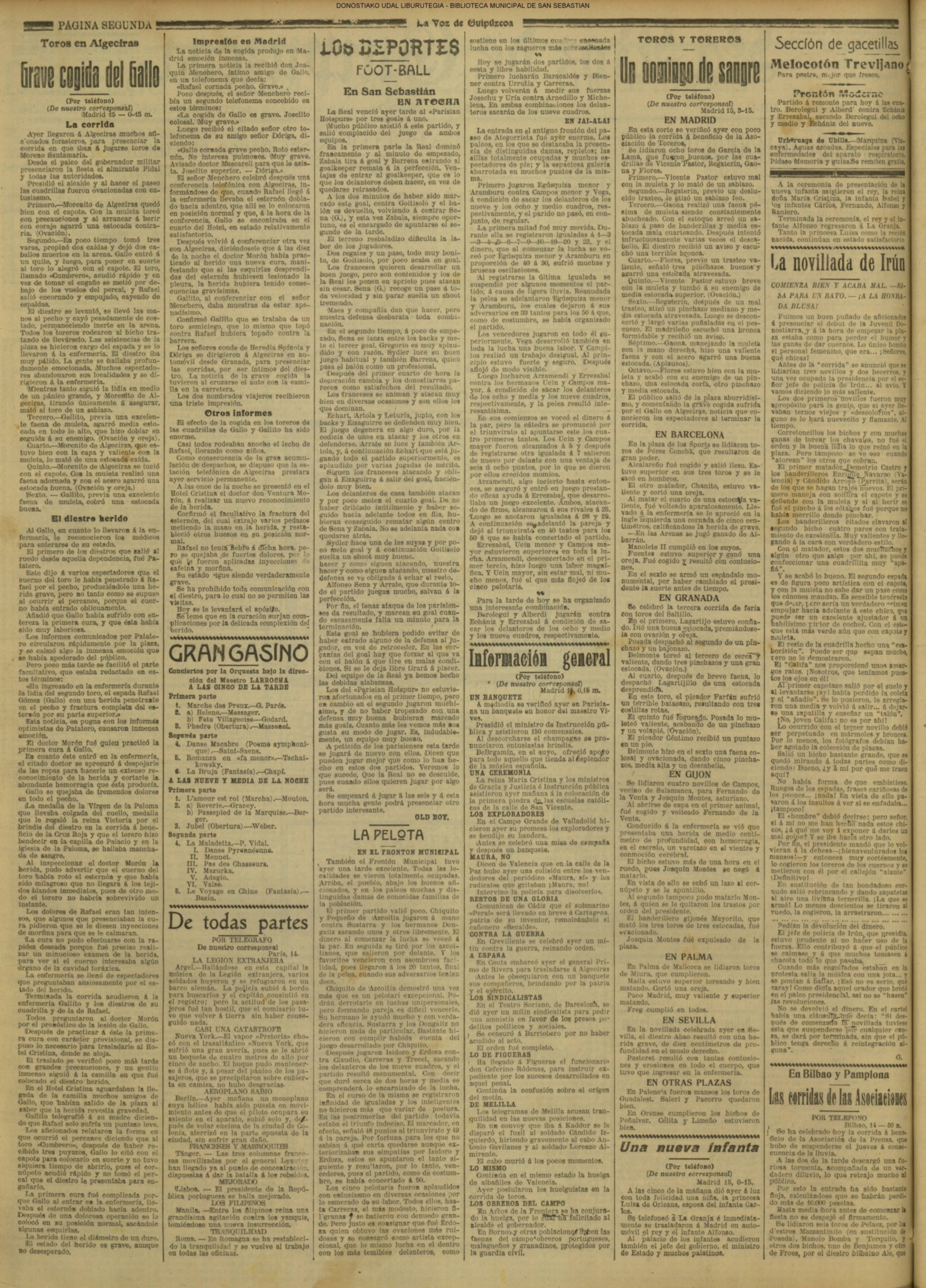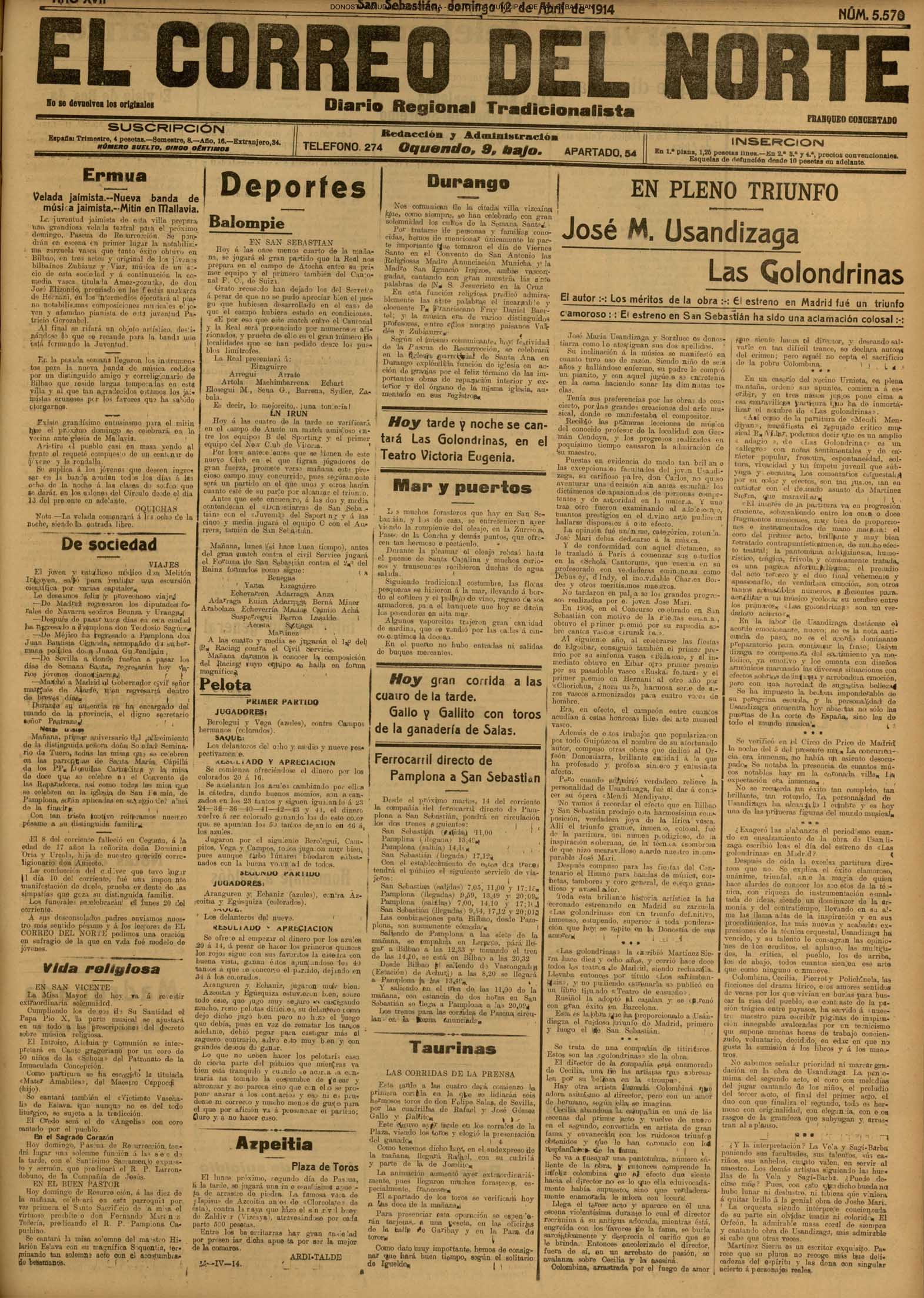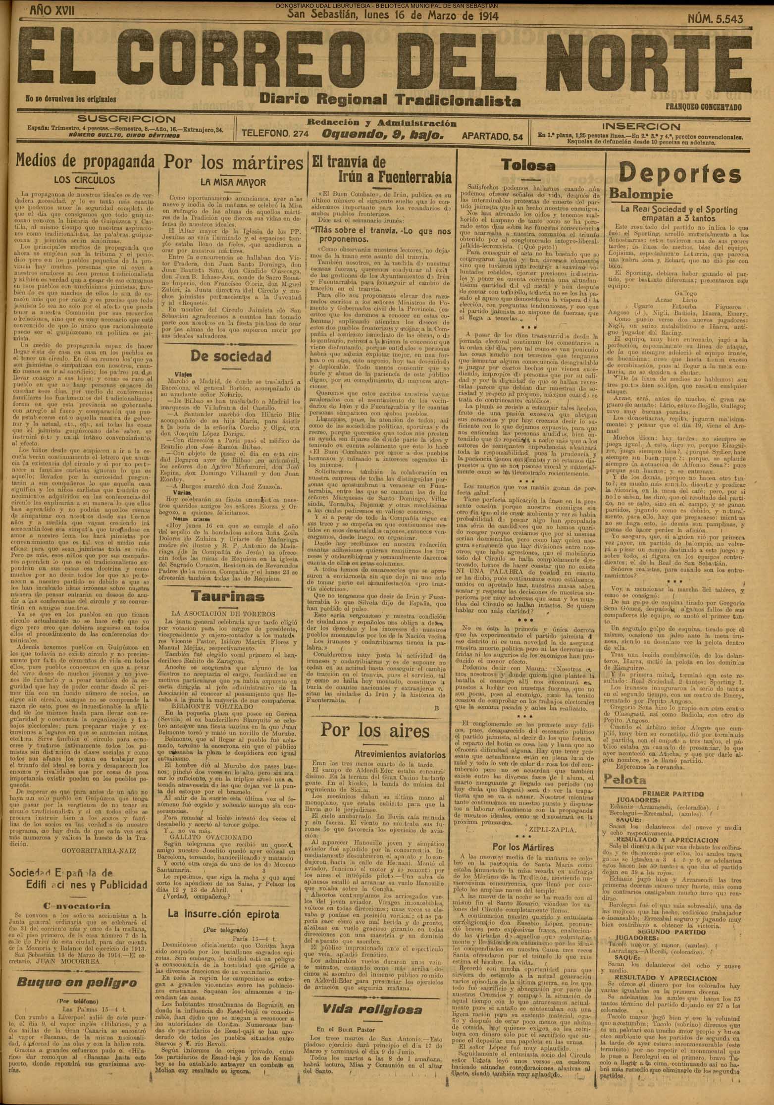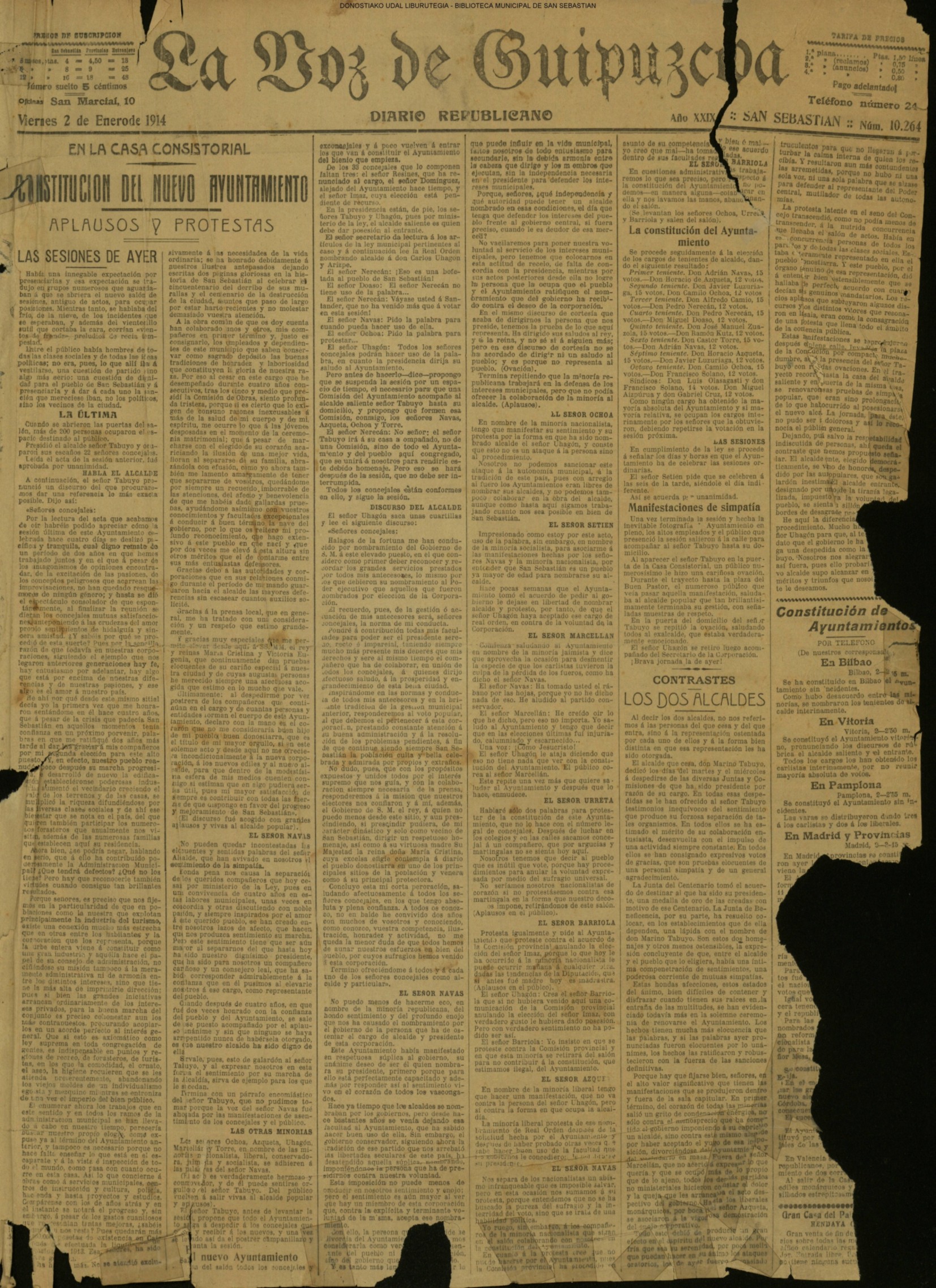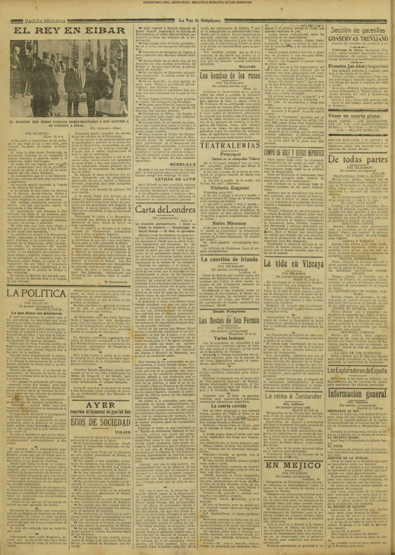 Con la venia del tiempo - que no está, ciertamente, para otorgar muchos favores - el pueblo donostiarra se entregará hoy a las alegrias propias de la fiesta de su patrón y de su nombre : ¡San Sebastián! Un motivo de duelo suprime este año la clásica tamborrada; pero no por eso faltarán festejos que puedan divertir a los vecinos..... que tengan humor para ello. A las diez de la mañana, la banda municipal recorrerá las calles de la ciudad, tocando diana. Se lanzarán también cohetes en la abundancia que se pueda. A las diez y media, el Ayuntamiento en corporación y con maceros, se dirigira a la iglesia de Santa María para asistir a la misa mayor. A las once se verificará el acto de descubrir la lápida colocada en la casa donde vivió el maestro donostiarra Sarriegui. La comitiva saldrá de la Plaza de la Constitución, forméndola representaciones de todas las sociedades de recreo y elementos populares. Irá también la Comisión de Fomento y marcharán a la cabeza el Orfeón Donostiarra y la Banda Municipal, ejecutando ésta durante el trayecto la gran marcha de Gounod. Al descubrirse la lápida cantará el Orfeón la célebre composición vasca del malogrado maestro, titulada "Illunabarra", y la banda ejecutará la marcha de San Sebastián. La Comisión de Fomento estará representada por los señores Nerecán, Pena, Kutz, Saralegui y Delaunet. El señor Nerecán hará uso de la palabra y pronunciará un discurso alusivo al acto. La Sociedad recreativa "Euskal-billera" que se halla situada frente a la casa donde se coloca la lápida, como homenaje al finado maestro, pone a disposición de la comisión municipal su sala, y estará debidamente engalanada, con colgaduras con fleco negro y bandera a media asta con crespón de luto. En el salón de esta popular sociedad se hallarán todos los miembros de la Junta de Festejos, ostentando las nuevas insignias de la asociación. Luego se verificará el regreso en el mismo orden. A las nueve de la noche, se verificará el gran banquete tradicional en la veterana Sociedad donostiarra "Unión Artesana" siendo presidido por el alcalde señor Uhagón. De nueve a once la banda "Iru-chulo" amenizará la plazuela de Lasala, y a las mismas horas lo hará la denominada "La Armonía", en la Plaza de la Constitución. Habrá, claro está, iluminaciones y baile, y cuanto se pida dentro de lo que se pueda dar. Se dará rancho extraordinario a los presos de la cárcel.
