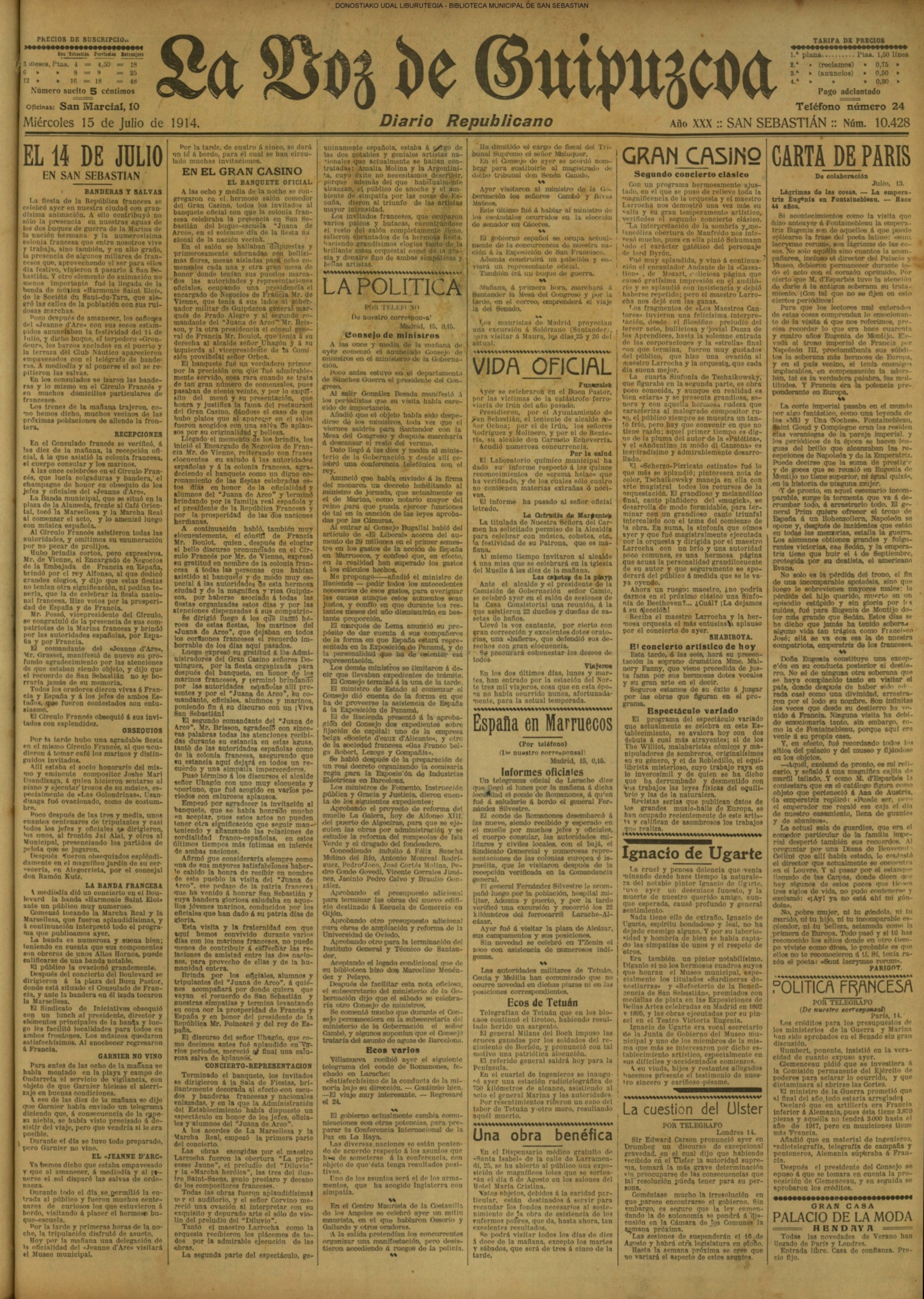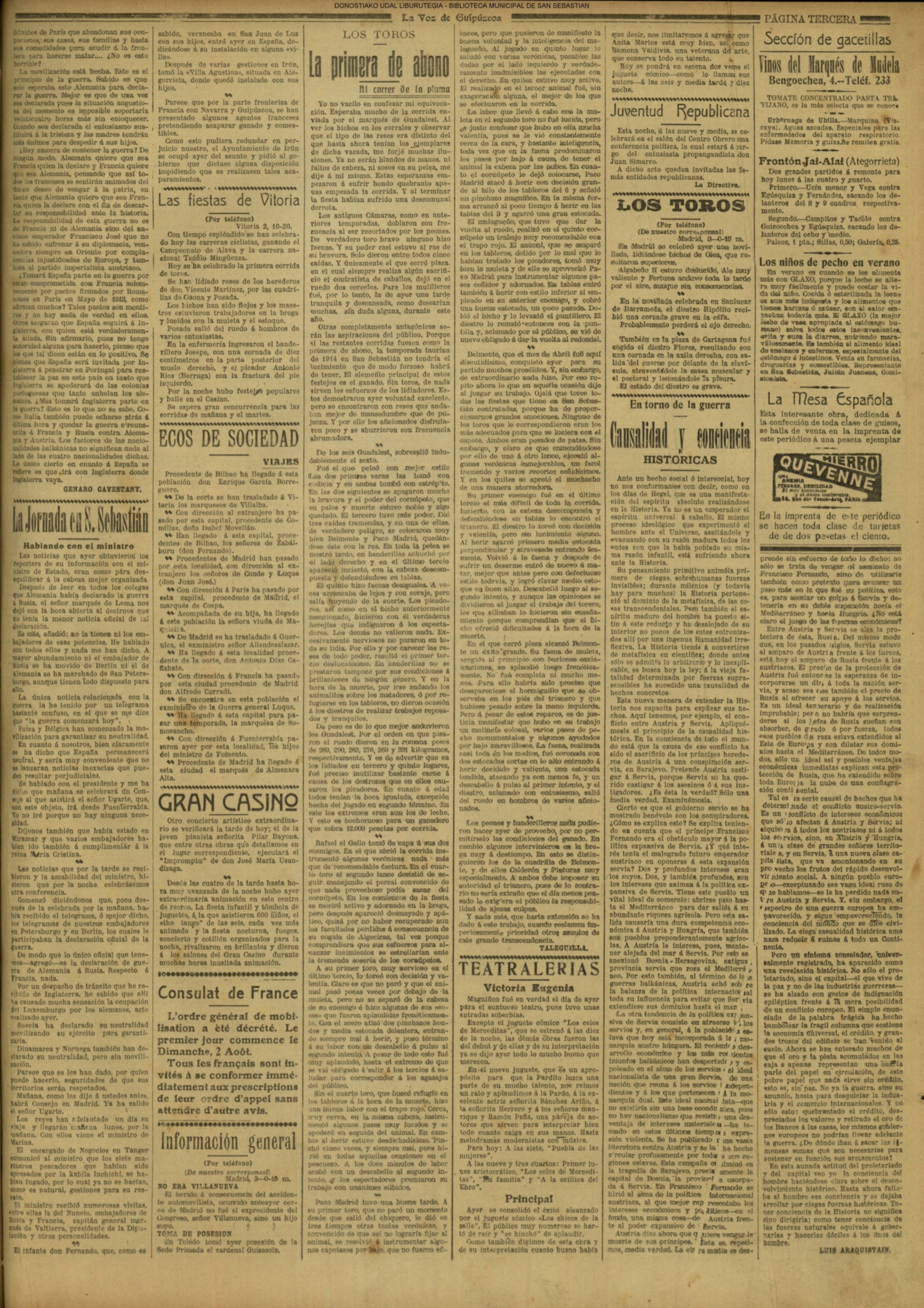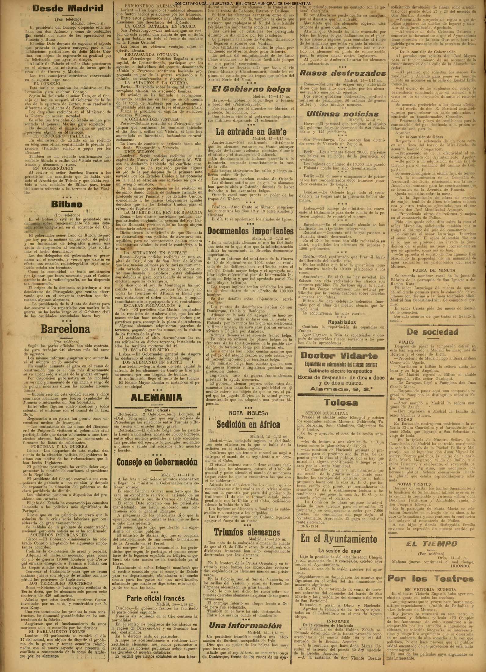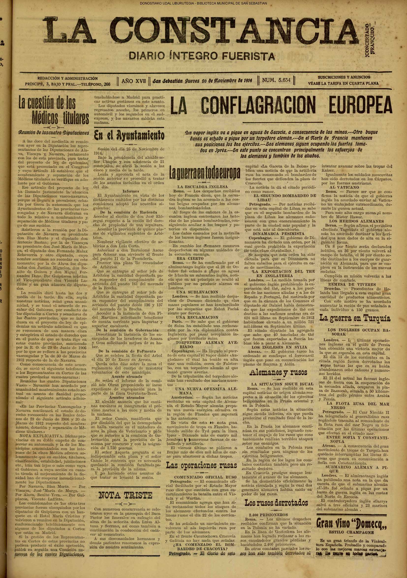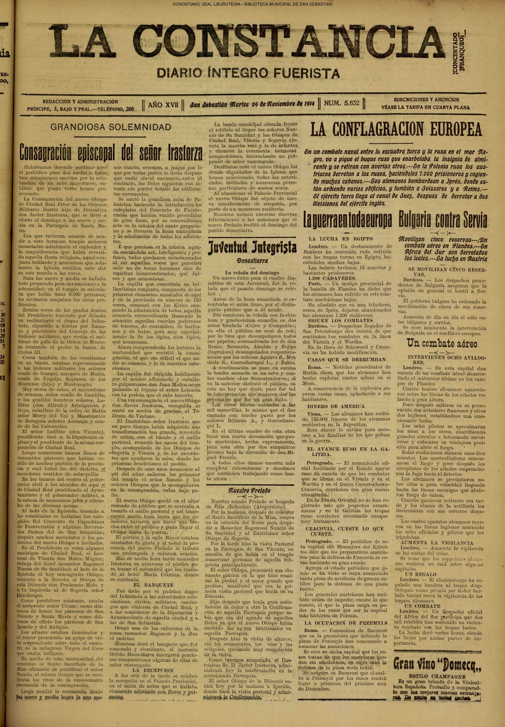 Con la venia del tiempo - que no está, ciertamente, para otorgar muchos favores - el pueblo donostiarra se entregará hoy a las alegrias propias de la fiesta de su patrón y de su nombre : ¡San Sebastián! Un motivo de duelo suprime este año la clásica tamborrada; pero no por eso faltarán festejos que puedan divertir a los vecinos..... que tengan humor para ello. A las diez de la mañana, la banda municipal recorrerá las calles de la ciudad, tocando diana. Se lanzarán también cohetes en la abundancia que se pueda. A las diez y media, el Ayuntamiento en corporación y con maceros, se dirigira a la iglesia de Santa María para asistir a la misa mayor. A las once se verificará el acto de descubrir la lápida colocada en la casa donde vivió el maestro donostiarra Sarriegui. La comitiva saldrá de la Plaza de la Constitución, forméndola representaciones de todas las sociedades de recreo y elementos populares. Irá también la Comisión de Fomento y marcharán a la cabeza el Orfeón Donostiarra y la Banda Municipal, ejecutando ésta durante el trayecto la gran marcha de Gounod. Al descubrirse la lápida cantará el Orfeón la célebre composición vasca del malogrado maestro, titulada "Illunabarra", y la banda ejecutará la marcha de San Sebastián. La Comisión de Fomento estará representada por los señores Nerecán, Pena, Kutz, Saralegui y Delaunet. El señor Nerecán hará uso de la palabra y pronunciará un discurso alusivo al acto. La Sociedad recreativa "Euskal-billera" que se halla situada frente a la casa donde se coloca la lápida, como homenaje al finado maestro, pone a disposición de la comisión municipal su sala, y estará debidamente engalanada, con colgaduras con fleco negro y bandera a media asta con crespón de luto. En el salón de esta popular sociedad se hallarán todos los miembros de la Junta de Festejos, ostentando las nuevas insignias de la asociación. Luego se verificará el regreso en el mismo orden. A las nueve de la noche, se verificará el gran banquete tradicional en la veterana Sociedad donostiarra "Unión Artesana" siendo presidido por el alcalde señor Uhagón. De nueve a once la banda "Iru-chulo" amenizará la plazuela de Lasala, y a las mismas horas lo hará la denominada "La Armonía", en la Plaza de la Constitución. Habrá, claro está, iluminaciones y baile, y cuanto se pida dentro de lo que se pueda dar. Se dará rancho extraordinario a los presos de la cárcel.