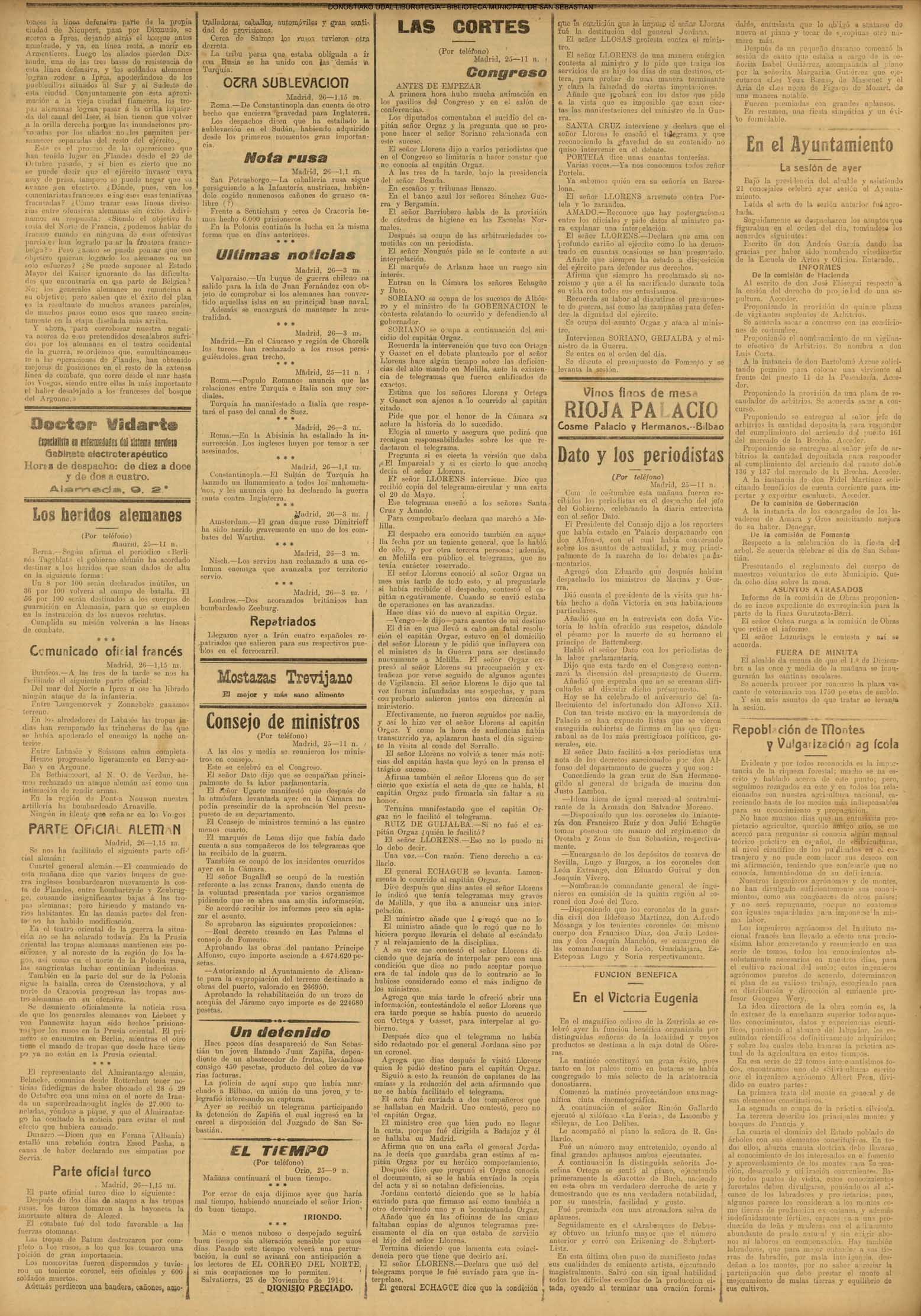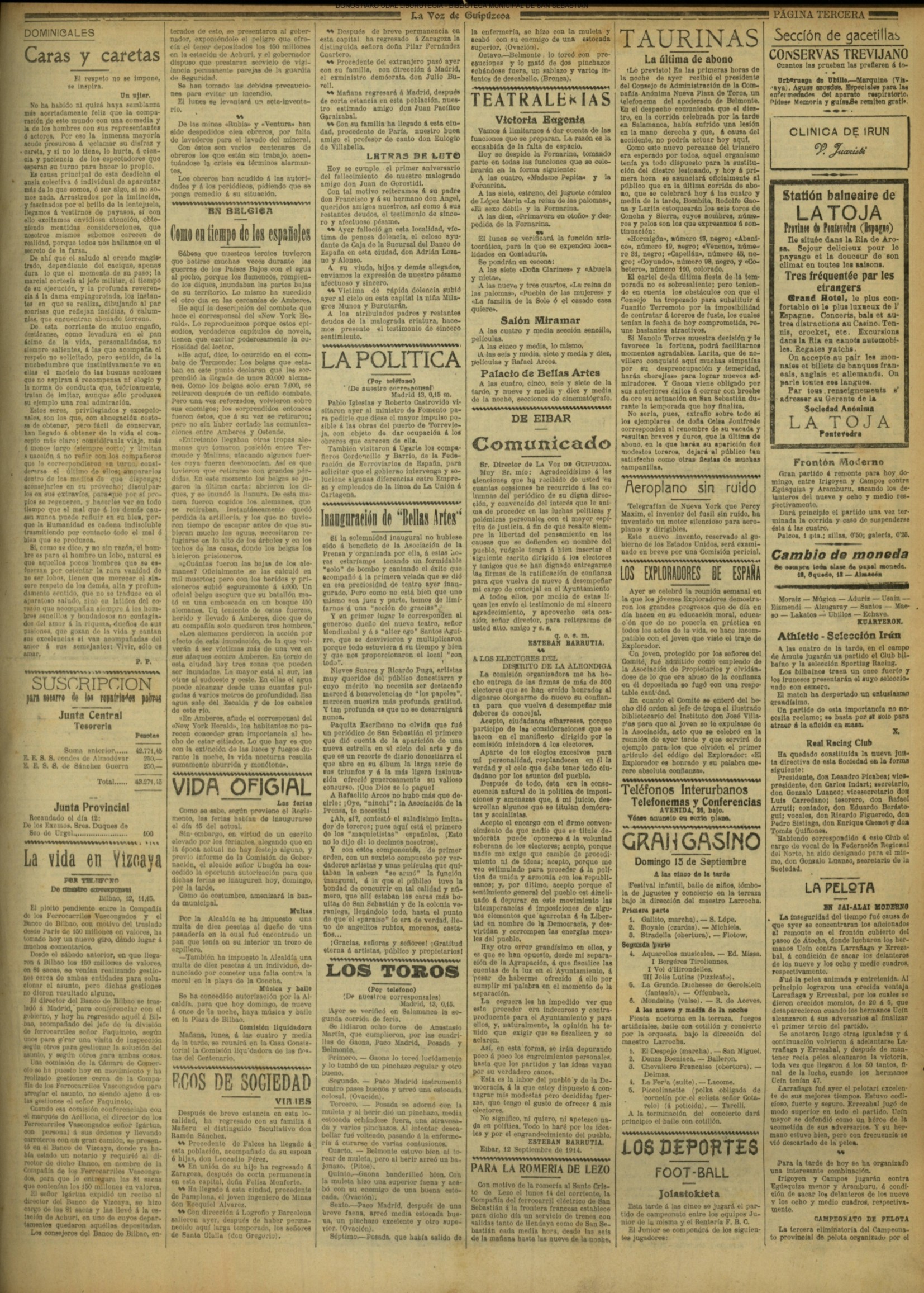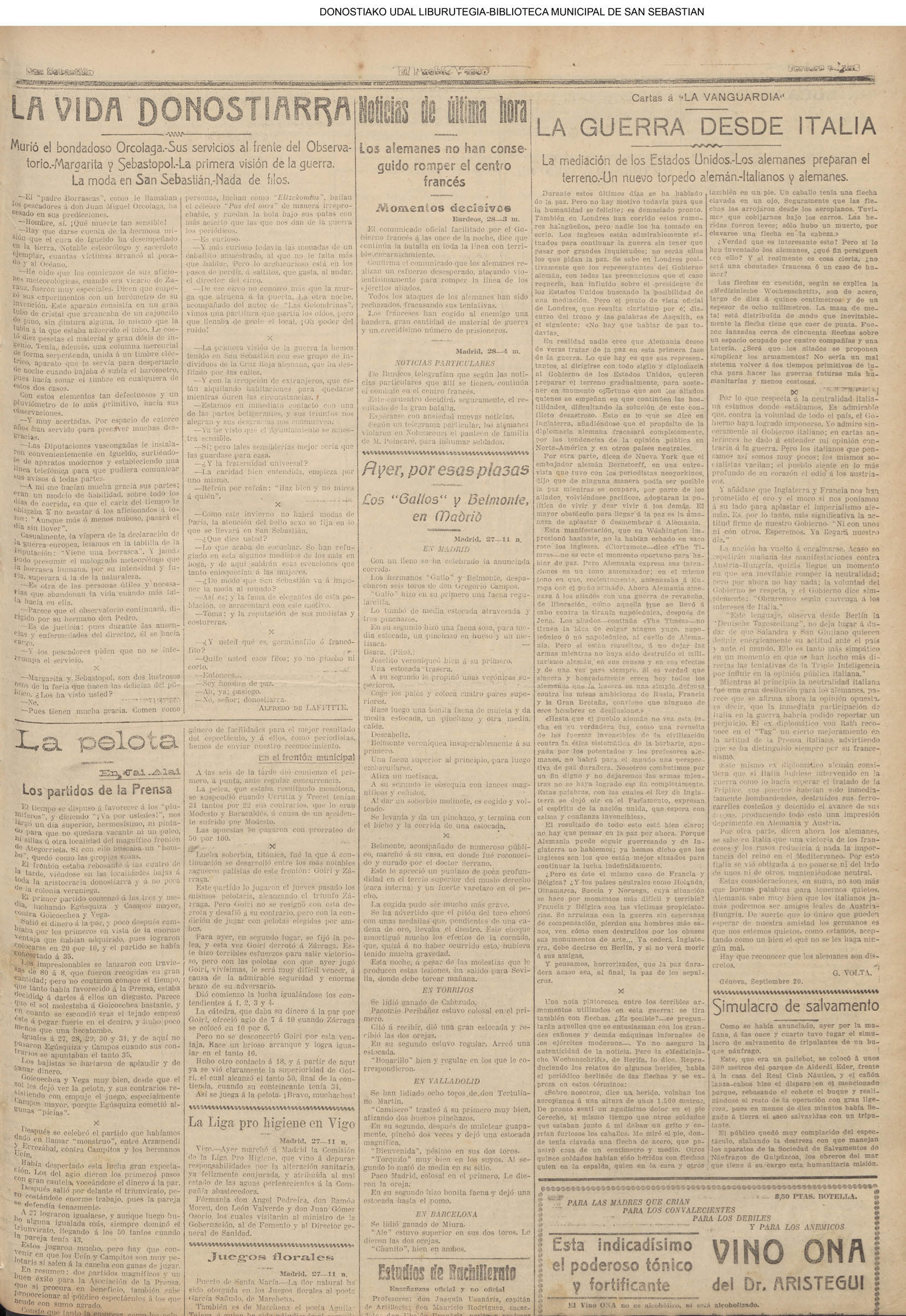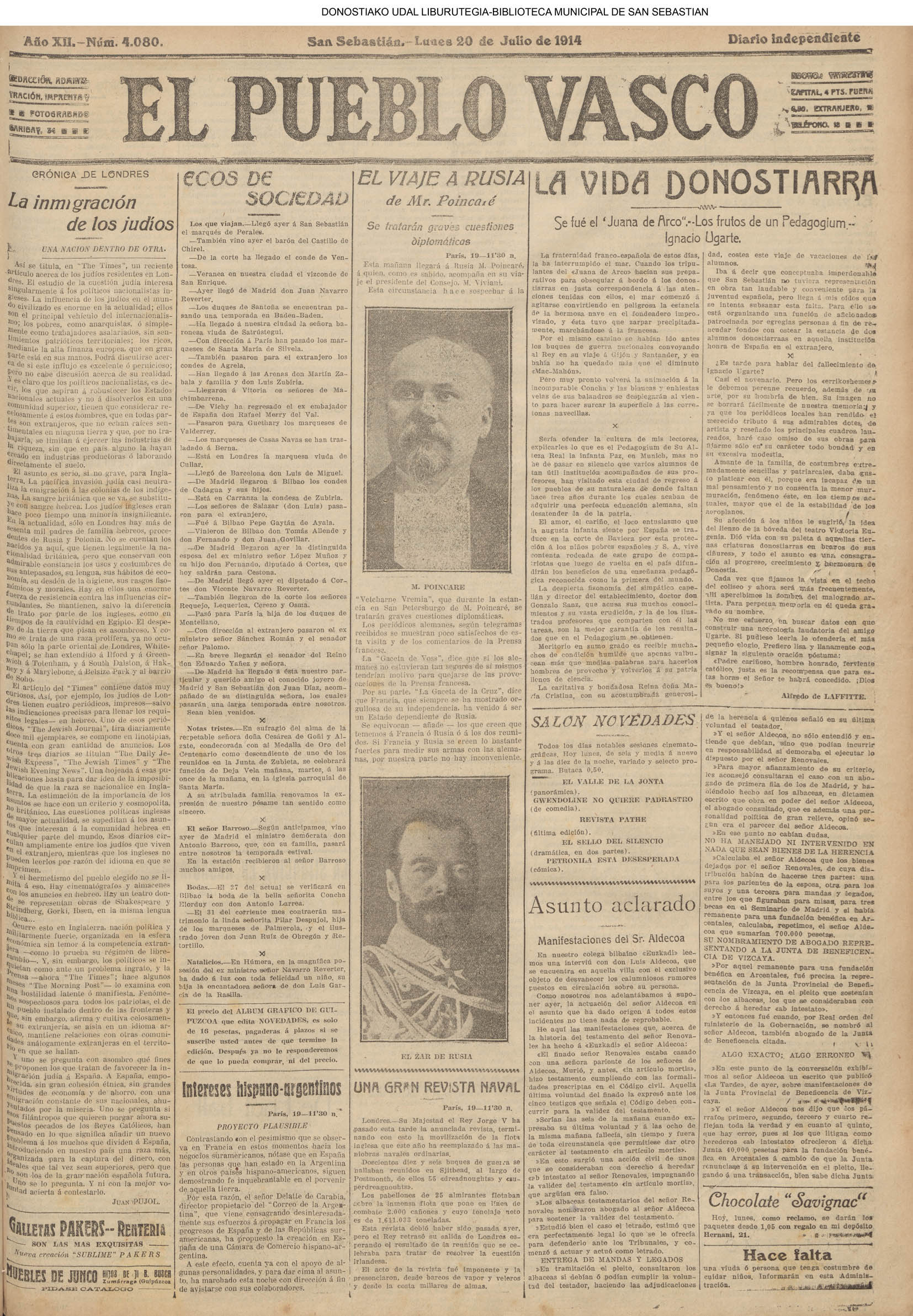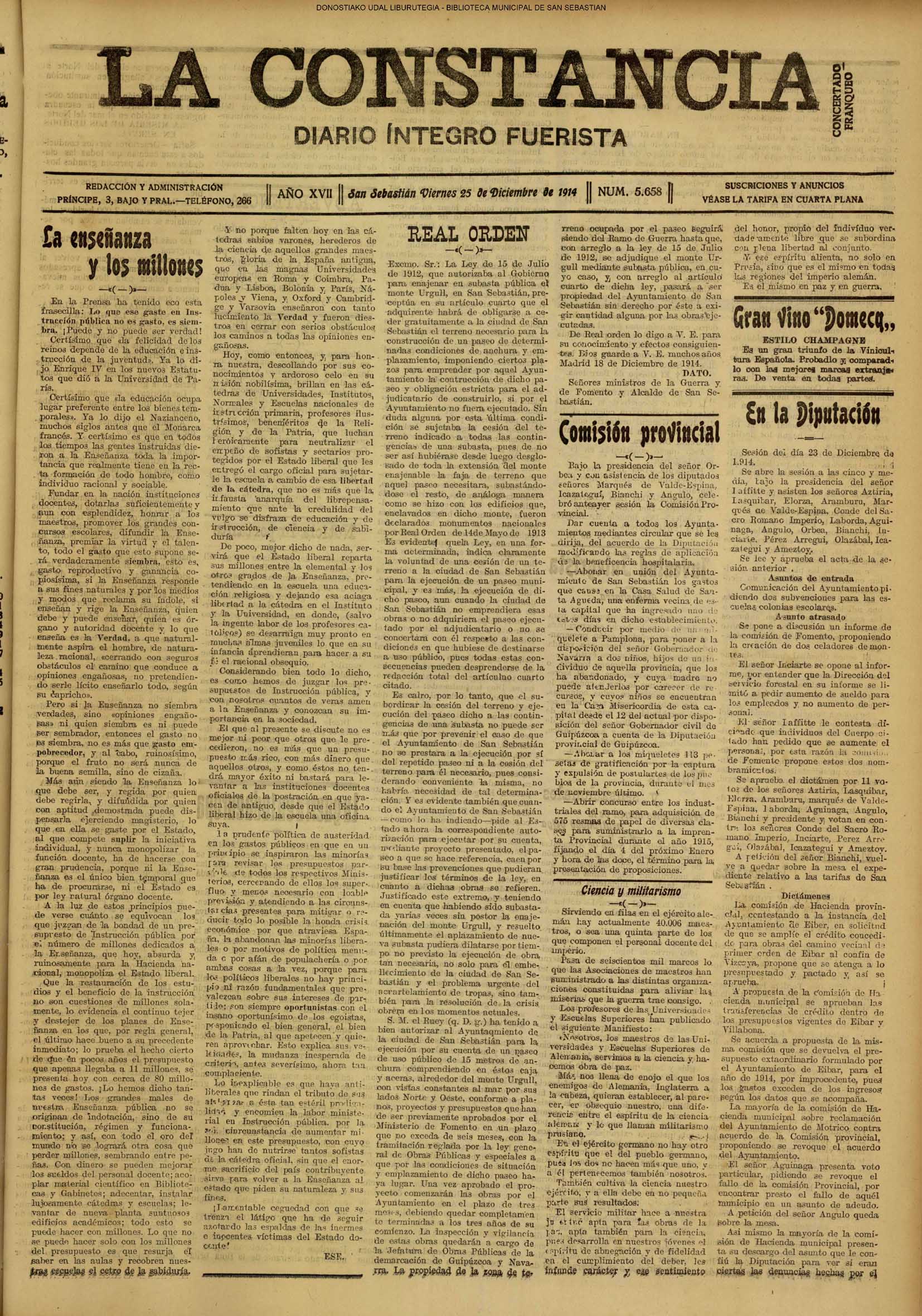 Con la venia del tiempo - que no está, ciertamente, para otorgar muchos favores - el pueblo donostiarra se entregará hoy a las alegrias propias de la fiesta de su patrón y de su nombre : ¡San Sebastián! Un motivo de duelo suprime este año la clásica tamborrada; pero no por eso faltarán festejos que puedan divertir a los vecinos..... que tengan humor para ello. A las diez de la mañana, la banda municipal recorrerá las calles de la ciudad, tocando diana. Se lanzarán también cohetes en la abundancia que se pueda. A las diez y media, el Ayuntamiento en corporación y con maceros, se dirigira a la iglesia de Santa María para asistir a la misa mayor. A las once se verificará el acto de descubrir la lápida colocada en la casa donde vivió el maestro donostiarra Sarriegui. La comitiva saldrá de la Plaza de la Constitución, forméndola representaciones de todas las sociedades de recreo y elementos populares. Irá también la Comisión de Fomento y marcharán a la cabeza el Orfeón Donostiarra y la Banda Municipal, ejecutando ésta durante el trayecto la gran marcha de Gounod. Al descubrirse la lápida cantará el Orfeón la célebre composición vasca del malogrado maestro, titulada "Illunabarra", y la banda ejecutará la marcha de San Sebastián. La Comisión de Fomento estará representada por los señores Nerecán, Pena, Kutz, Saralegui y Delaunet. El señor Nerecán hará uso de la palabra y pronunciará un discurso alusivo al acto. La Sociedad recreativa "Euskal-billera" que se halla situada frente a la casa donde se coloca la lápida, como homenaje al finado maestro, pone a disposición de la comisión municipal su sala, y estará debidamente engalanada, con colgaduras con fleco negro y bandera a media asta con crespón de luto. En el salón de esta popular sociedad se hallarán todos los miembros de la Junta de Festejos, ostentando las nuevas insignias de la asociación. Luego se verificará el regreso en el mismo orden. A las nueve de la noche, se verificará el gran banquete tradicional en la veterana Sociedad donostiarra "Unión Artesana" siendo presidido por el alcalde señor Uhagón. De nueve a once la banda "Iru-chulo" amenizará la plazuela de Lasala, y a las mismas horas lo hará la denominada "La Armonía", en la Plaza de la Constitución. Habrá, claro está, iluminaciones y baile, y cuanto se pida dentro de lo que se pueda dar. Se dará rancho extraordinario a los presos de la cárcel.