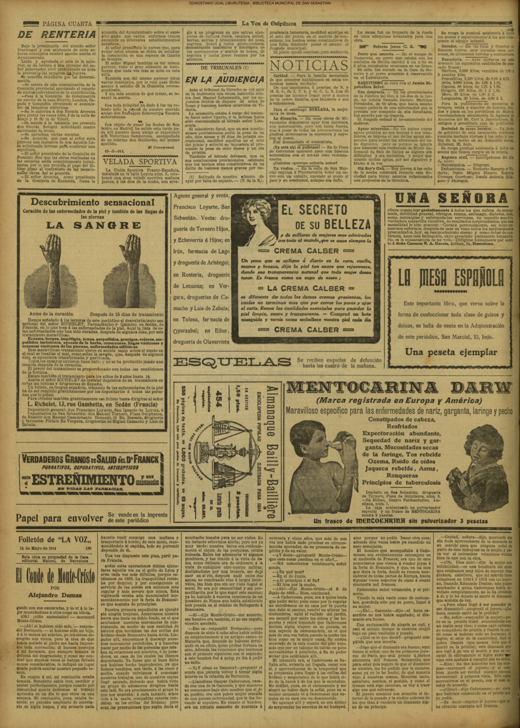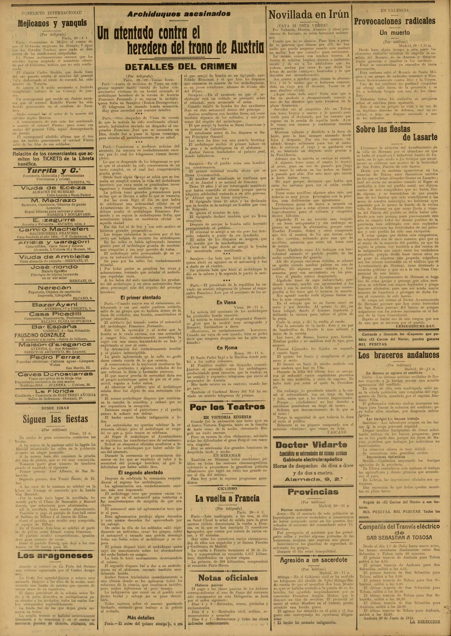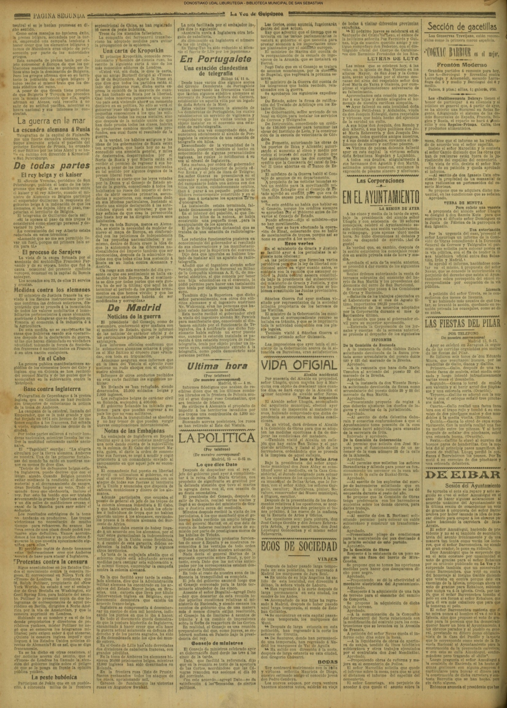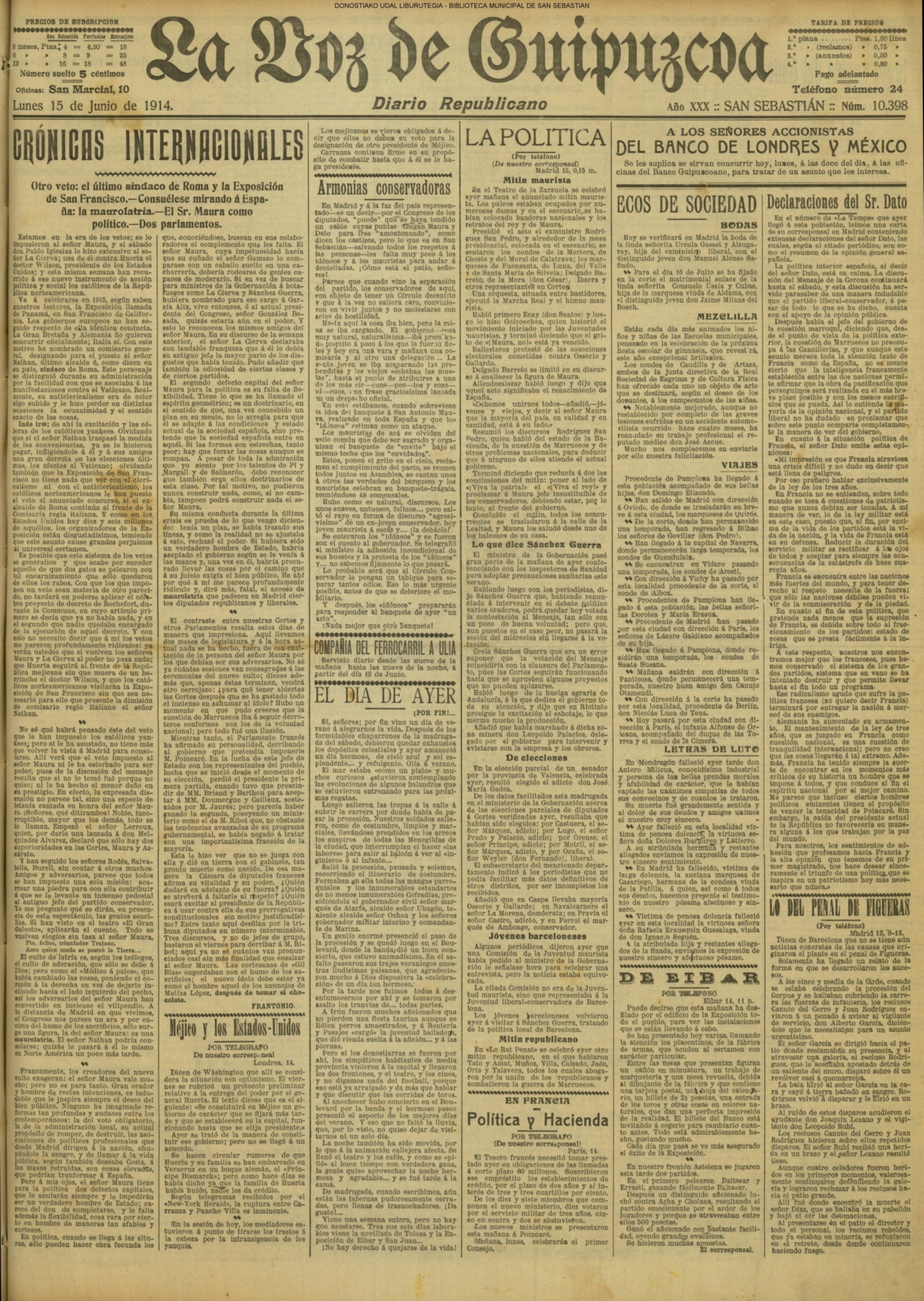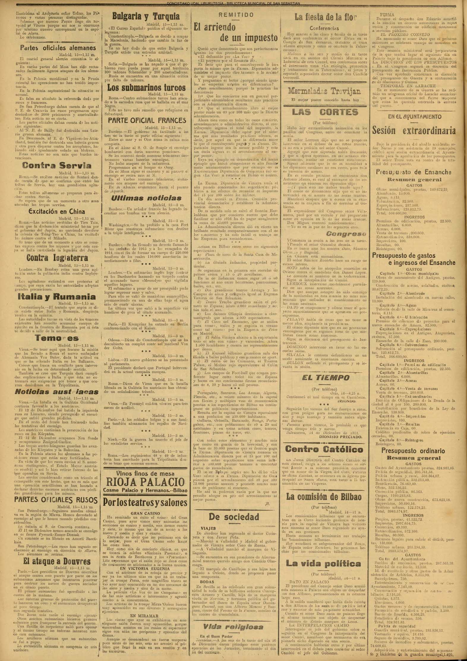 Con la venia del tiempo - que no está, ciertamente, para otorgar muchos favores - el pueblo donostiarra se entregará hoy a las alegrias propias de la fiesta de su patrón y de su nombre : ¡San Sebastián! Un motivo de duelo suprime este año la clásica tamborrada; pero no por eso faltarán festejos que puedan divertir a los vecinos..... que tengan humor para ello. A las diez de la mañana, la banda municipal recorrerá las calles de la ciudad, tocando diana. Se lanzarán también cohetes en la abundancia que se pueda. A las diez y media, el Ayuntamiento en corporación y con maceros, se dirigira a la iglesia de Santa María para asistir a la misa mayor. A las once se verificará el acto de descubrir la lápida colocada en la casa donde vivió el maestro donostiarra Sarriegui. La comitiva saldrá de la Plaza de la Constitución, forméndola representaciones de todas las sociedades de recreo y elementos populares. Irá también la Comisión de Fomento y marcharán a la cabeza el Orfeón Donostiarra y la Banda Municipal, ejecutando ésta durante el trayecto la gran marcha de Gounod. Al descubrirse la lápida cantará el Orfeón la célebre composición vasca del malogrado maestro, titulada "Illunabarra", y la banda ejecutará la marcha de San Sebastián. La Comisión de Fomento estará representada por los señores Nerecán, Pena, Kutz, Saralegui y Delaunet. El señor Nerecán hará uso de la palabra y pronunciará un discurso alusivo al acto. La Sociedad recreativa "Euskal-billera" que se halla situada frente a la casa donde se coloca la lápida, como homenaje al finado maestro, pone a disposición de la comisión municipal su sala, y estará debidamente engalanada, con colgaduras con fleco negro y bandera a media asta con crespón de luto. En el salón de esta popular sociedad se hallarán todos los miembros de la Junta de Festejos, ostentando las nuevas insignias de la asociación. Luego se verificará el regreso en el mismo orden. A las nueve de la noche, se verificará el gran banquete tradicional en la veterana Sociedad donostiarra "Unión Artesana" siendo presidido por el alcalde señor Uhagón. De nueve a once la banda "Iru-chulo" amenizará la plazuela de Lasala, y a las mismas horas lo hará la denominada "La Armonía", en la Plaza de la Constitución. Habrá, claro está, iluminaciones y baile, y cuanto se pida dentro de lo que se pueda dar. Se dará rancho extraordinario a los presos de la cárcel.