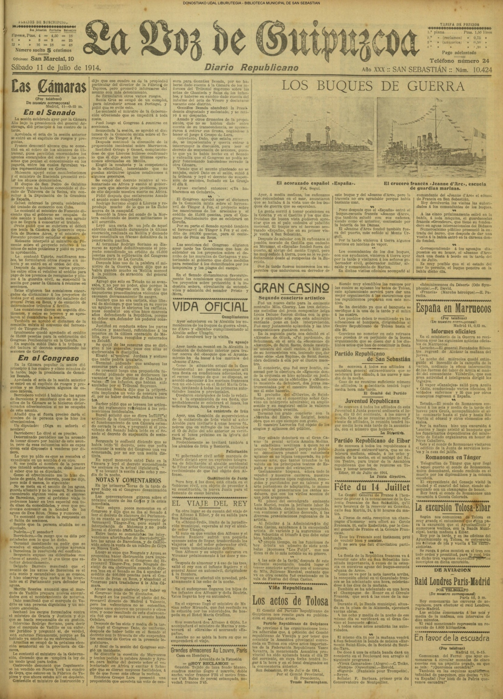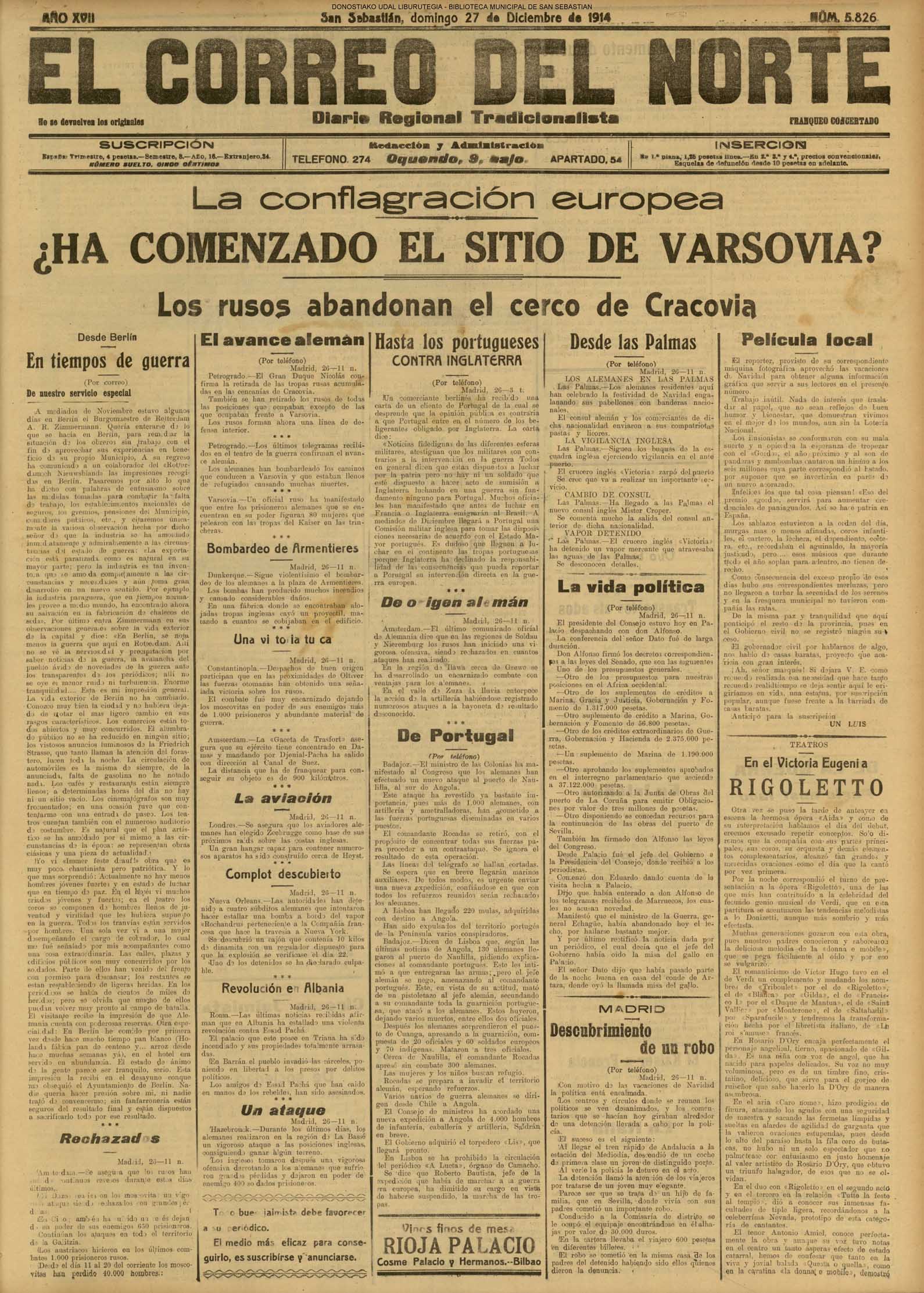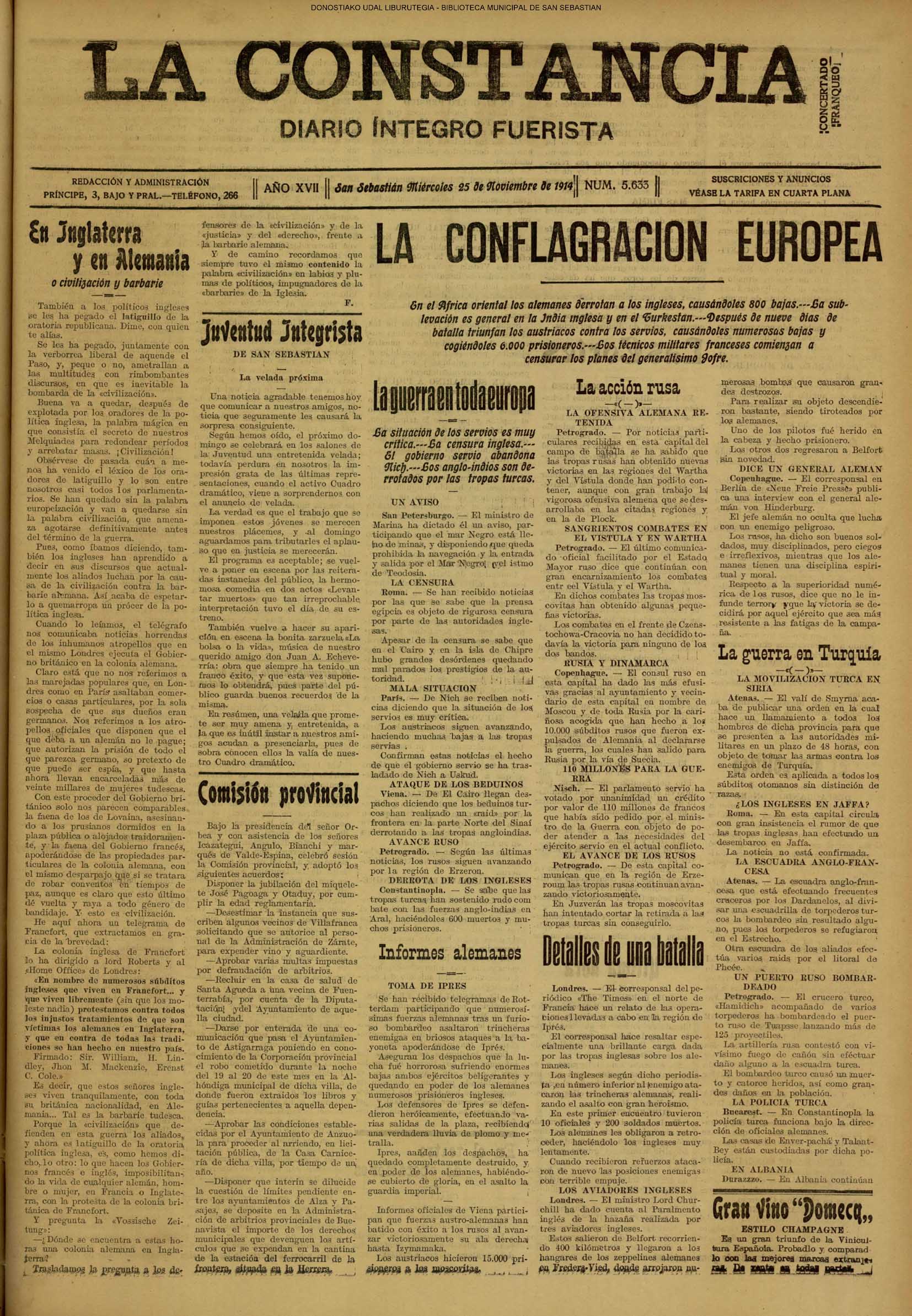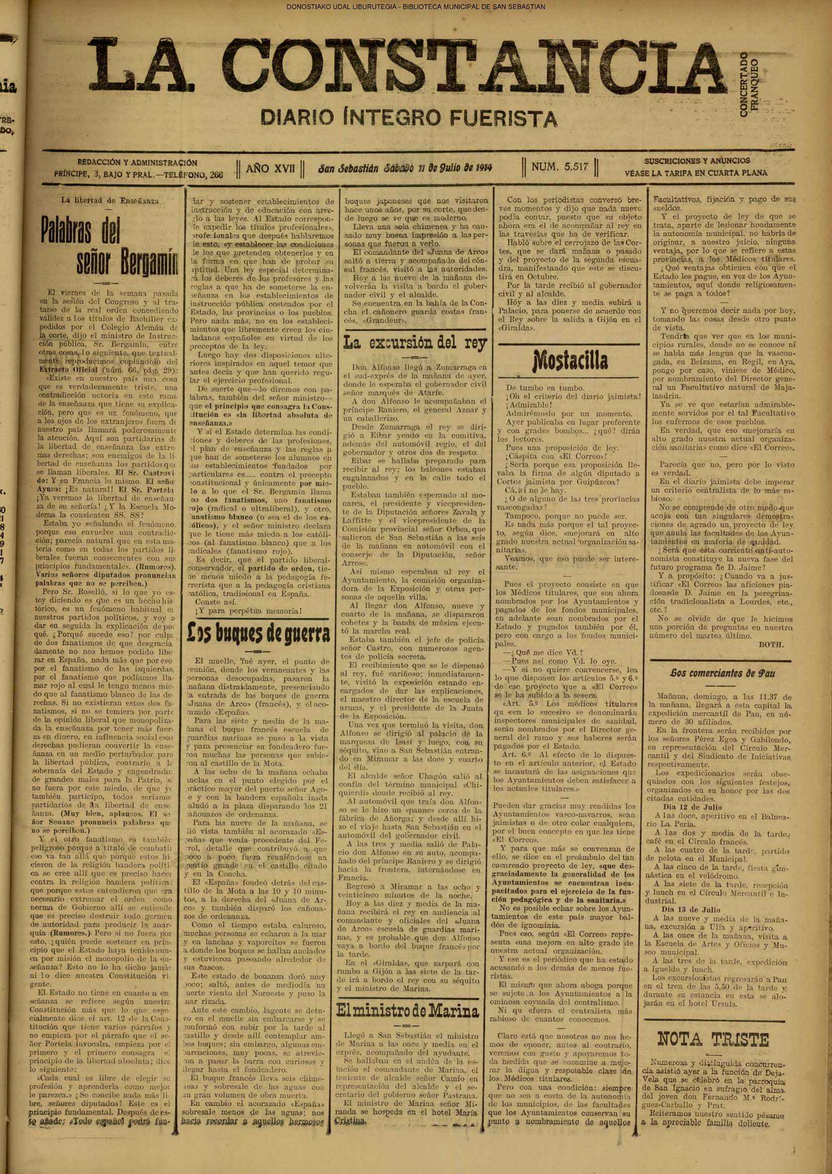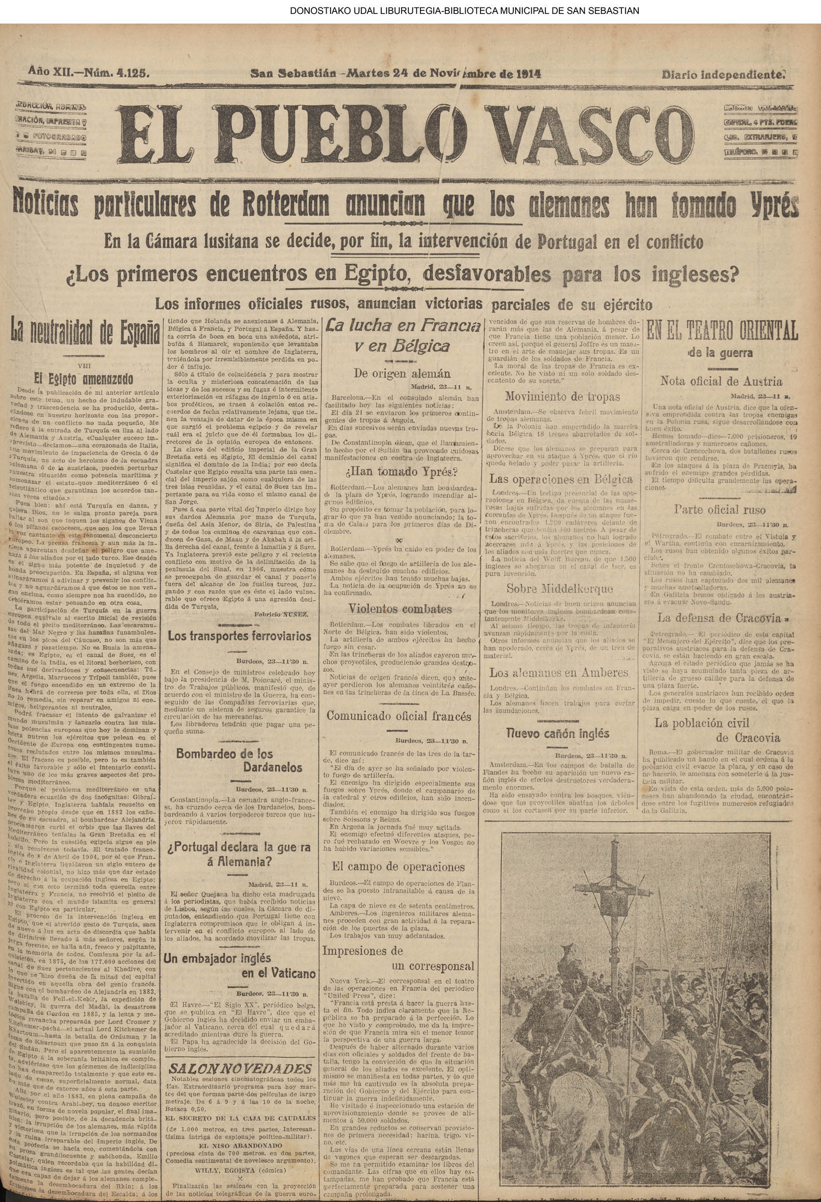 Con la venia del tiempo - que no está, ciertamente, para otorgar muchos favores - el pueblo donostiarra se entregará hoy a las alegrias propias de la fiesta de su patrón y de su nombre : ¡San Sebastián! Un motivo de duelo suprime este año la clásica tamborrada; pero no por eso faltarán festejos que puedan divertir a los vecinos..... que tengan humor para ello. A las diez de la mañana, la banda municipal recorrerá las calles de la ciudad, tocando diana. Se lanzarán también cohetes en la abundancia que se pueda. A las diez y media, el Ayuntamiento en corporación y con maceros, se dirigira a la iglesia de Santa María para asistir a la misa mayor. A las once se verificará el acto de descubrir la lápida colocada en la casa donde vivió el maestro donostiarra Sarriegui. La comitiva saldrá de la Plaza de la Constitución, forméndola representaciones de todas las sociedades de recreo y elementos populares. Irá también la Comisión de Fomento y marcharán a la cabeza el Orfeón Donostiarra y la Banda Municipal, ejecutando ésta durante el trayecto la gran marcha de Gounod. Al descubrirse la lápida cantará el Orfeón la célebre composición vasca del malogrado maestro, titulada "Illunabarra", y la banda ejecutará la marcha de San Sebastián. La Comisión de Fomento estará representada por los señores Nerecán, Pena, Kutz, Saralegui y Delaunet. El señor Nerecán hará uso de la palabra y pronunciará un discurso alusivo al acto. La Sociedad recreativa "Euskal-billera" que se halla situada frente a la casa donde se coloca la lápida, como homenaje al finado maestro, pone a disposición de la comisión municipal su sala, y estará debidamente engalanada, con colgaduras con fleco negro y bandera a media asta con crespón de luto. En el salón de esta popular sociedad se hallarán todos los miembros de la Junta de Festejos, ostentando las nuevas insignias de la asociación. Luego se verificará el regreso en el mismo orden. A las nueve de la noche, se verificará el gran banquete tradicional en la veterana Sociedad donostiarra "Unión Artesana" siendo presidido por el alcalde señor Uhagón. De nueve a once la banda "Iru-chulo" amenizará la plazuela de Lasala, y a las mismas horas lo hará la denominada "La Armonía", en la Plaza de la Constitución. Habrá, claro está, iluminaciones y baile, y cuanto se pida dentro de lo que se pueda dar. Se dará rancho extraordinario a los presos de la cárcel.