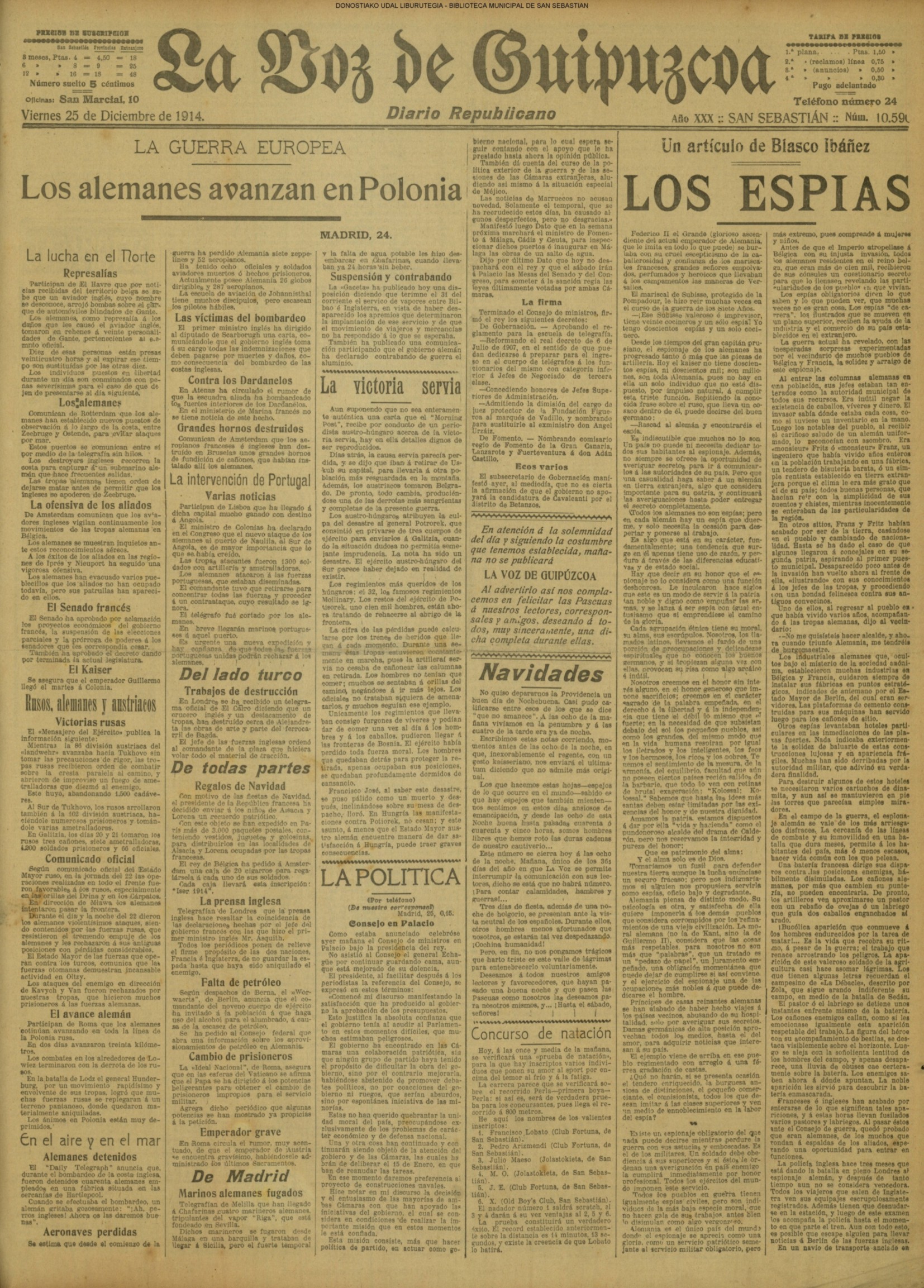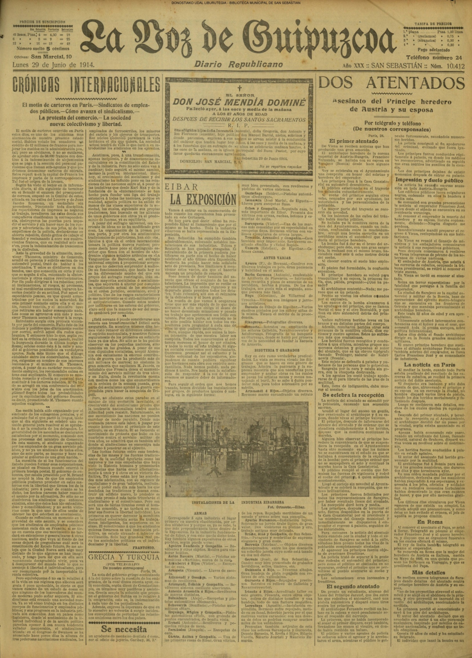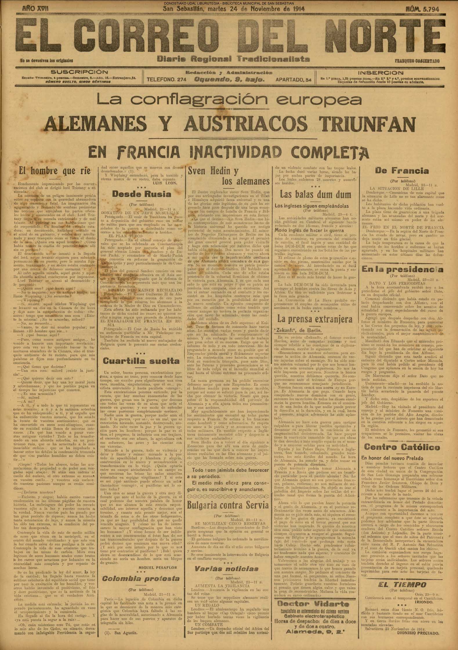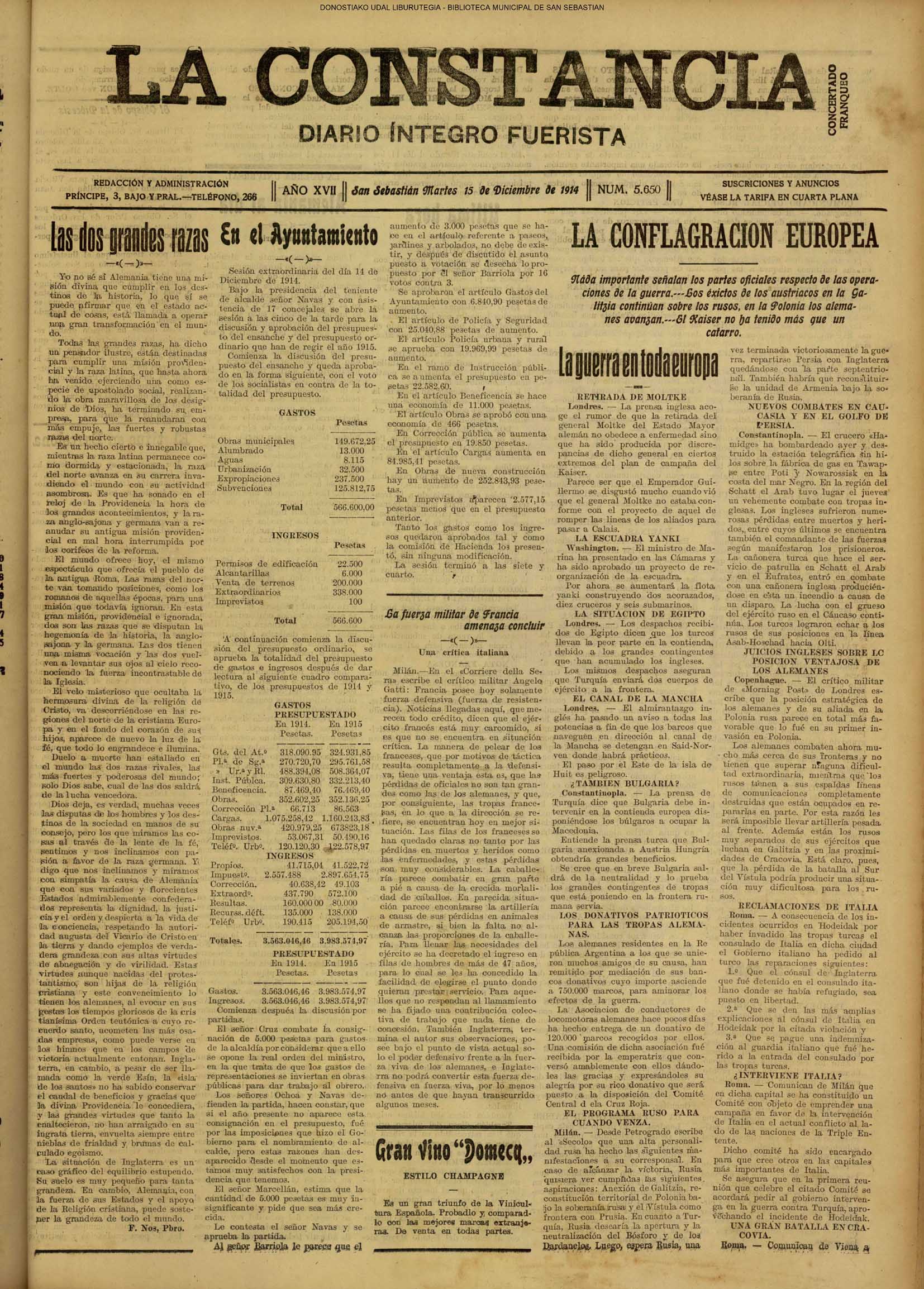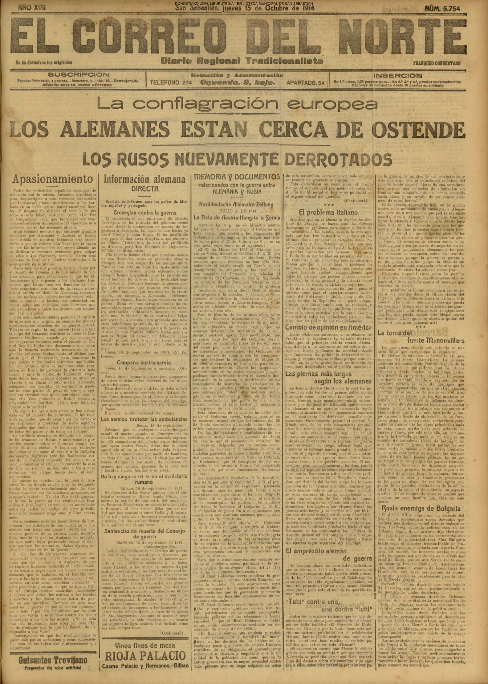 Con la venia del tiempo - que no está, ciertamente, para otorgar muchos favores - el pueblo donostiarra se entregará hoy a las alegrias propias de la fiesta de su patrón y de su nombre : ¡San Sebastián! Un motivo de duelo suprime este año la clásica tamborrada; pero no por eso faltarán festejos que puedan divertir a los vecinos..... que tengan humor para ello. A las diez de la mañana, la banda municipal recorrerá las calles de la ciudad, tocando diana. Se lanzarán también cohetes en la abundancia que se pueda. A las diez y media, el Ayuntamiento en corporación y con maceros, se dirigira a la iglesia de Santa María para asistir a la misa mayor. A las once se verificará el acto de descubrir la lápida colocada en la casa donde vivió el maestro donostiarra Sarriegui. La comitiva saldrá de la Plaza de la Constitución, forméndola representaciones de todas las sociedades de recreo y elementos populares. Irá también la Comisión de Fomento y marcharán a la cabeza el Orfeón Donostiarra y la Banda Municipal, ejecutando ésta durante el trayecto la gran marcha de Gounod. Al descubrirse la lápida cantará el Orfeón la célebre composición vasca del malogrado maestro, titulada "Illunabarra", y la banda ejecutará la marcha de San Sebastián. La Comisión de Fomento estará representada por los señores Nerecán, Pena, Kutz, Saralegui y Delaunet. El señor Nerecán hará uso de la palabra y pronunciará un discurso alusivo al acto. La Sociedad recreativa "Euskal-billera" que se halla situada frente a la casa donde se coloca la lápida, como homenaje al finado maestro, pone a disposición de la comisión municipal su sala, y estará debidamente engalanada, con colgaduras con fleco negro y bandera a media asta con crespón de luto. En el salón de esta popular sociedad se hallarán todos los miembros de la Junta de Festejos, ostentando las nuevas insignias de la asociación. Luego se verificará el regreso en el mismo orden. A las nueve de la noche, se verificará el gran banquete tradicional en la veterana Sociedad donostiarra "Unión Artesana" siendo presidido por el alcalde señor Uhagón. De nueve a once la banda "Iru-chulo" amenizará la plazuela de Lasala, y a las mismas horas lo hará la denominada "La Armonía", en la Plaza de la Constitución. Habrá, claro está, iluminaciones y baile, y cuanto se pida dentro de lo que se pueda dar. Se dará rancho extraordinario a los presos de la cárcel.